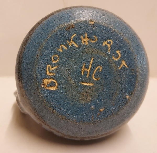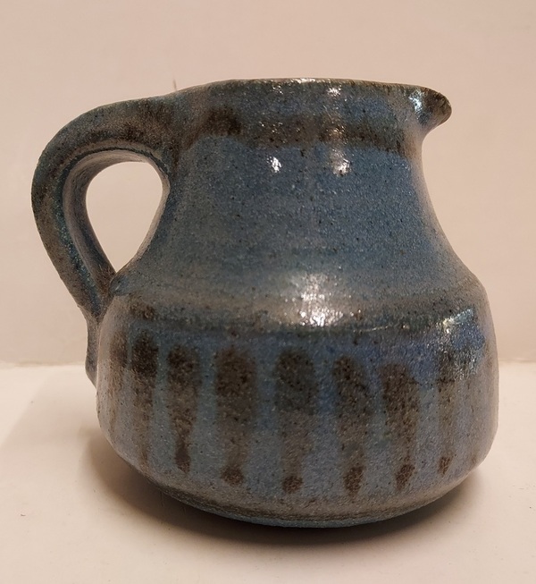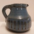 Schenkkannetje met blauwe glazuur en streep decoratie. Onderzijde gesigneerd