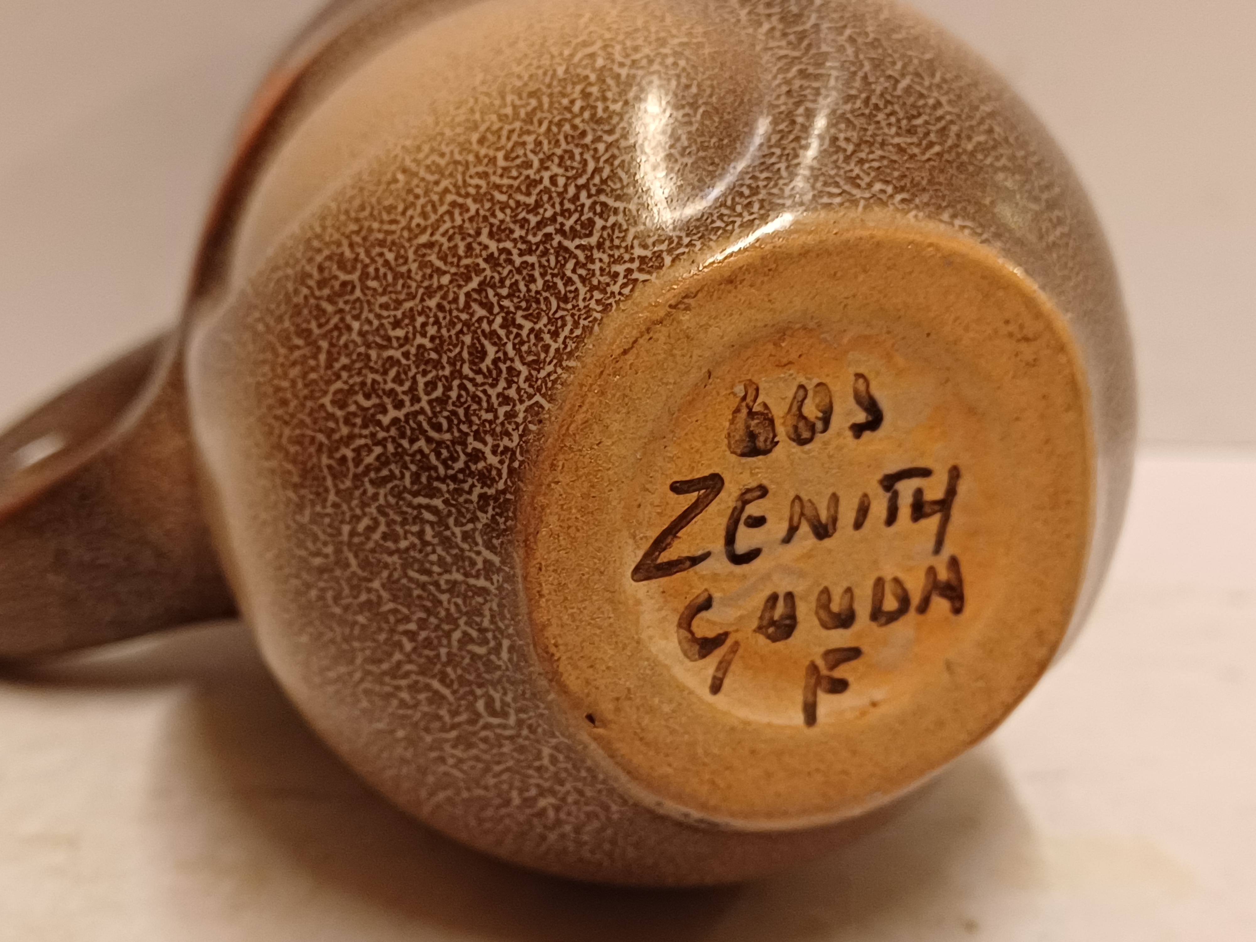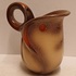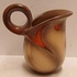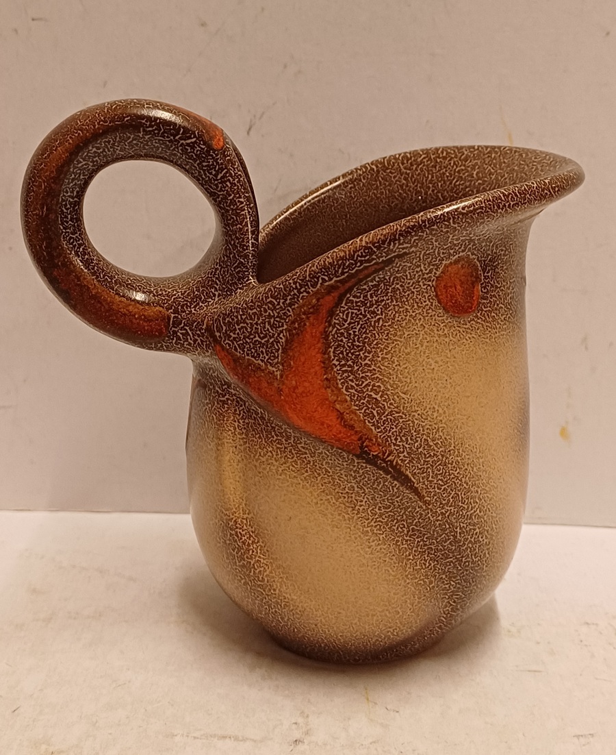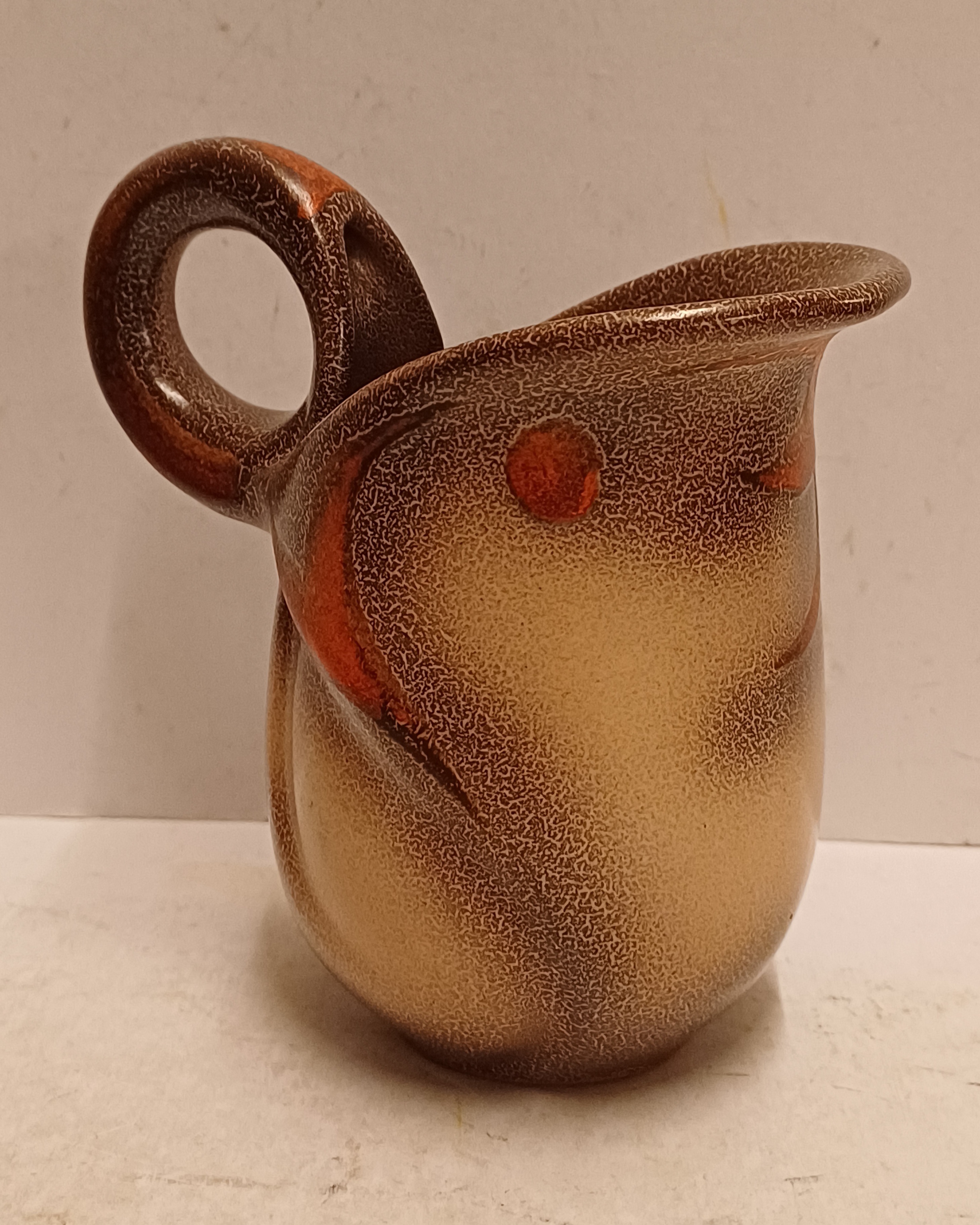 Gegoten aardewerken kannetje met hoog oor. Met gespoten decor in bruintinten met oranje zweem. Ontwerp Willem Stuurman, onderzijde gemerkt.