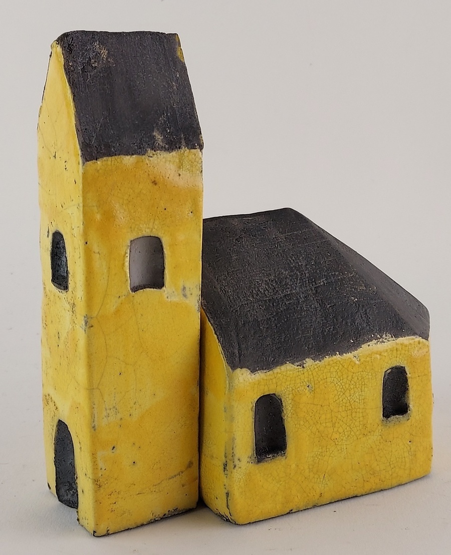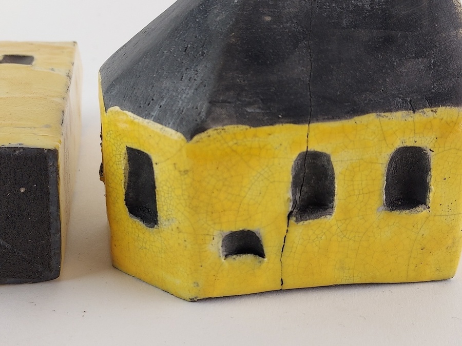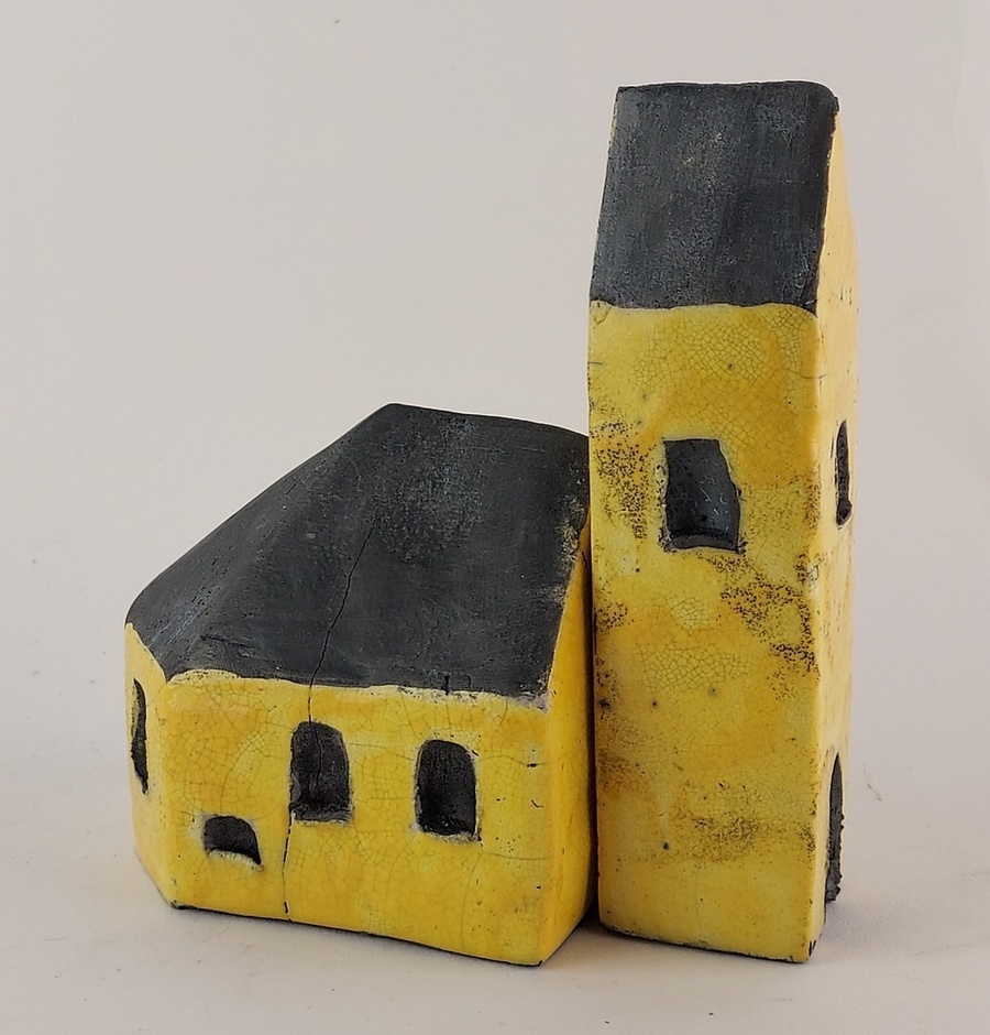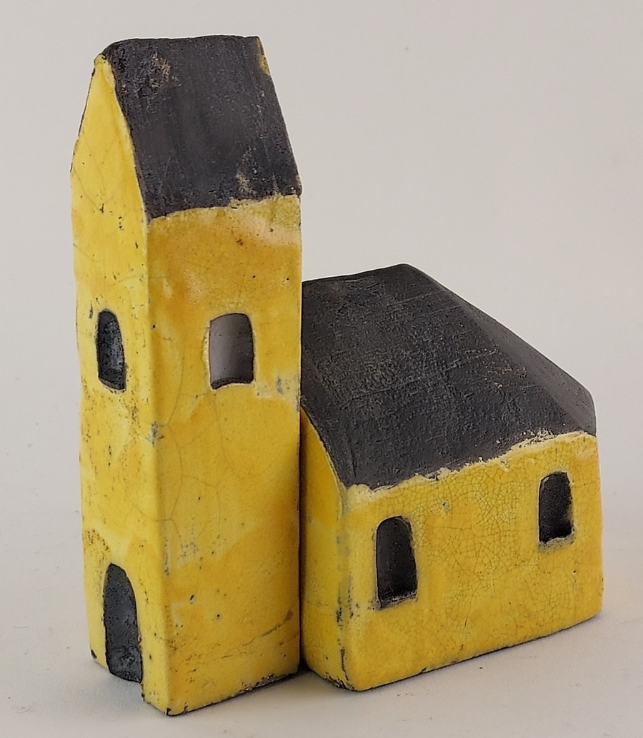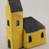 Keramische 2-delige sculptuur van het gele kerk in Westernieland. Onderzijde signatuur FvD