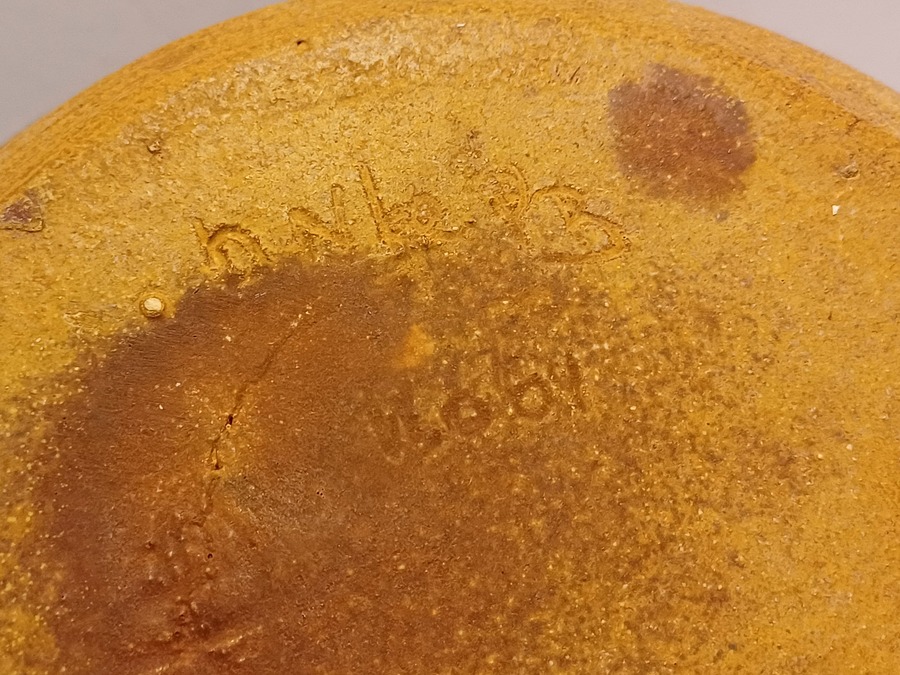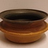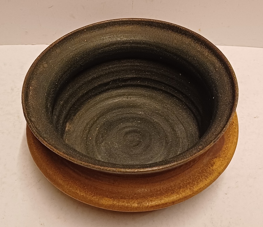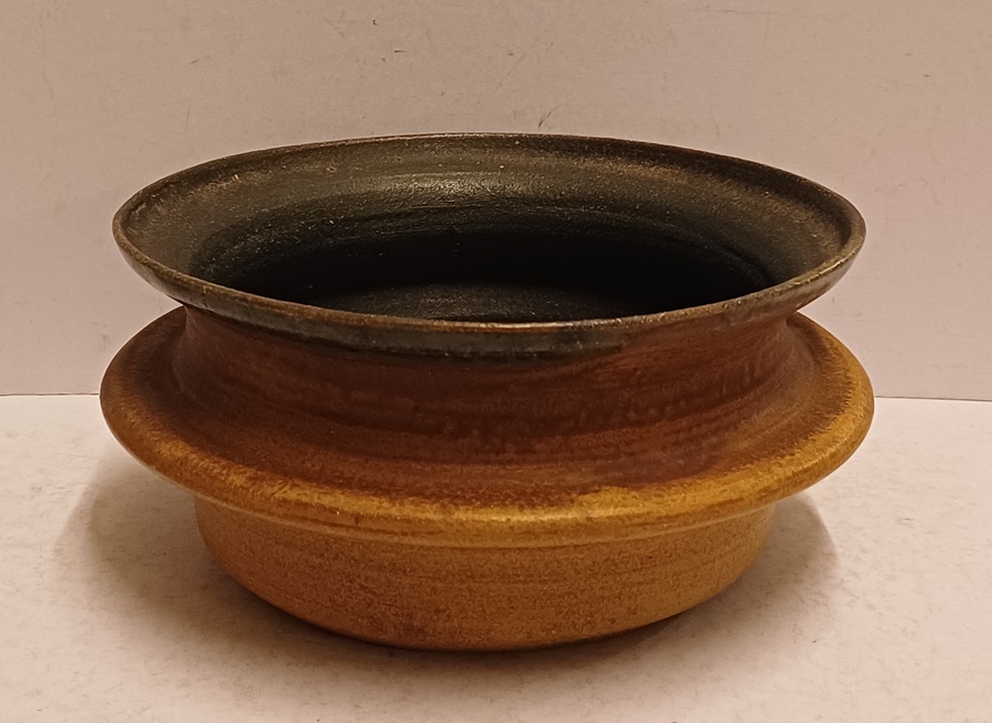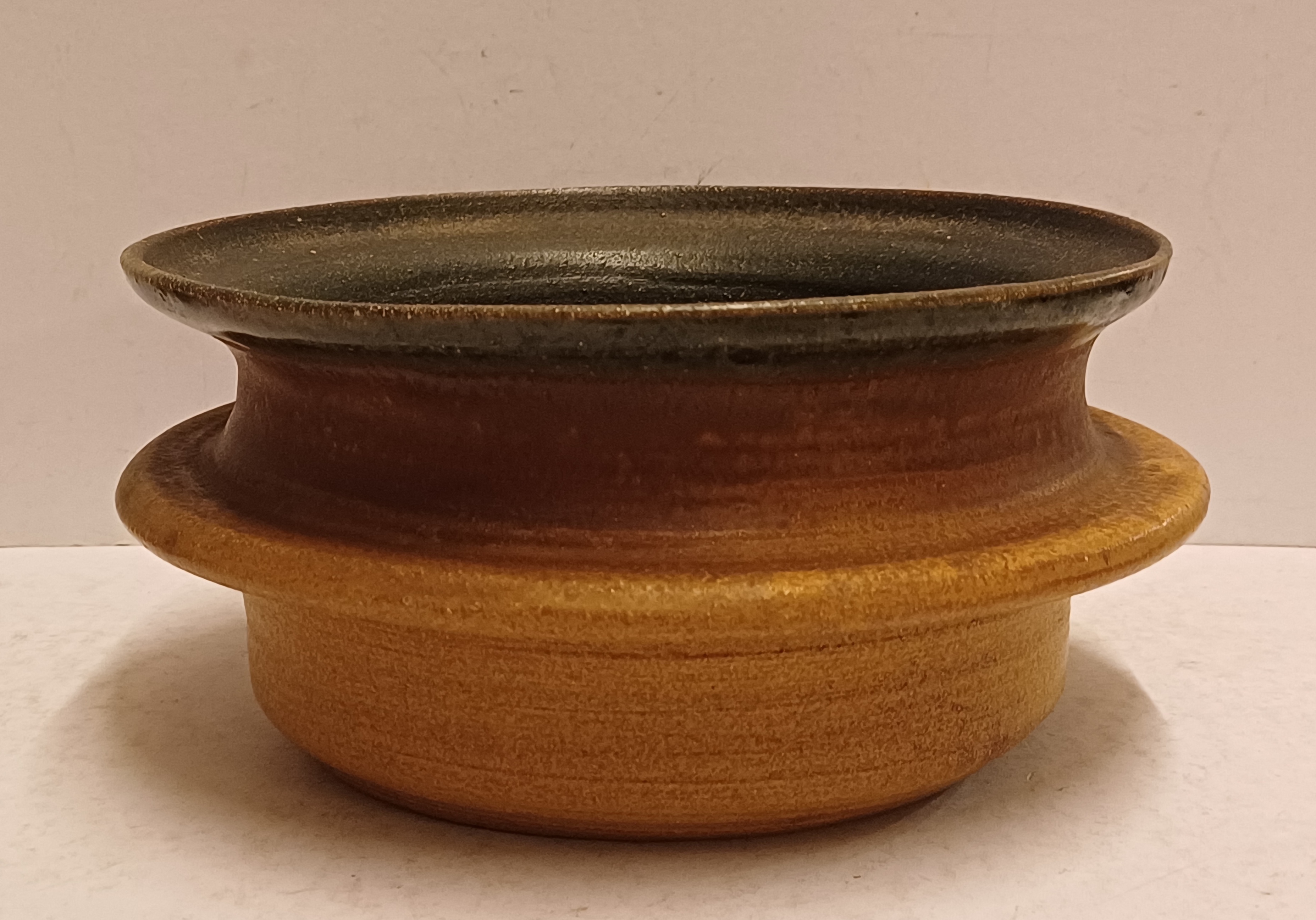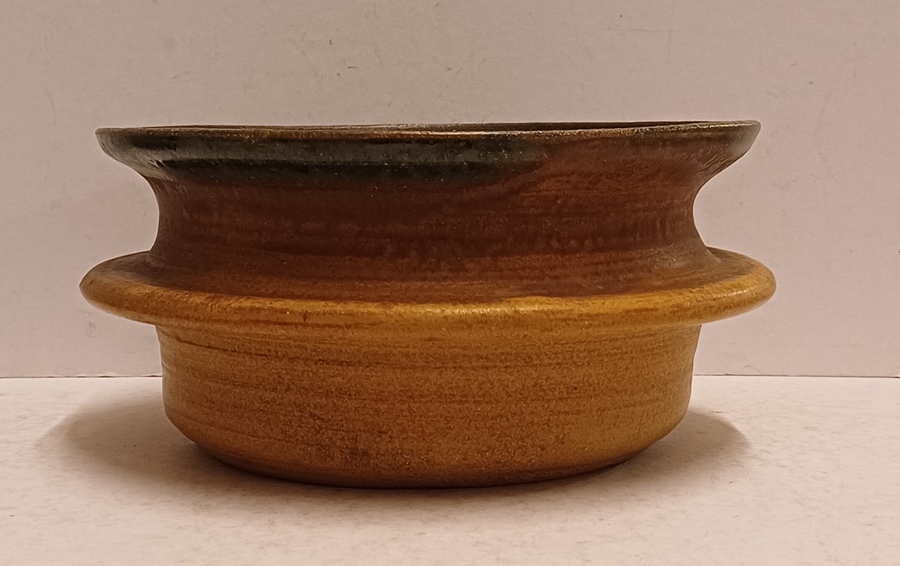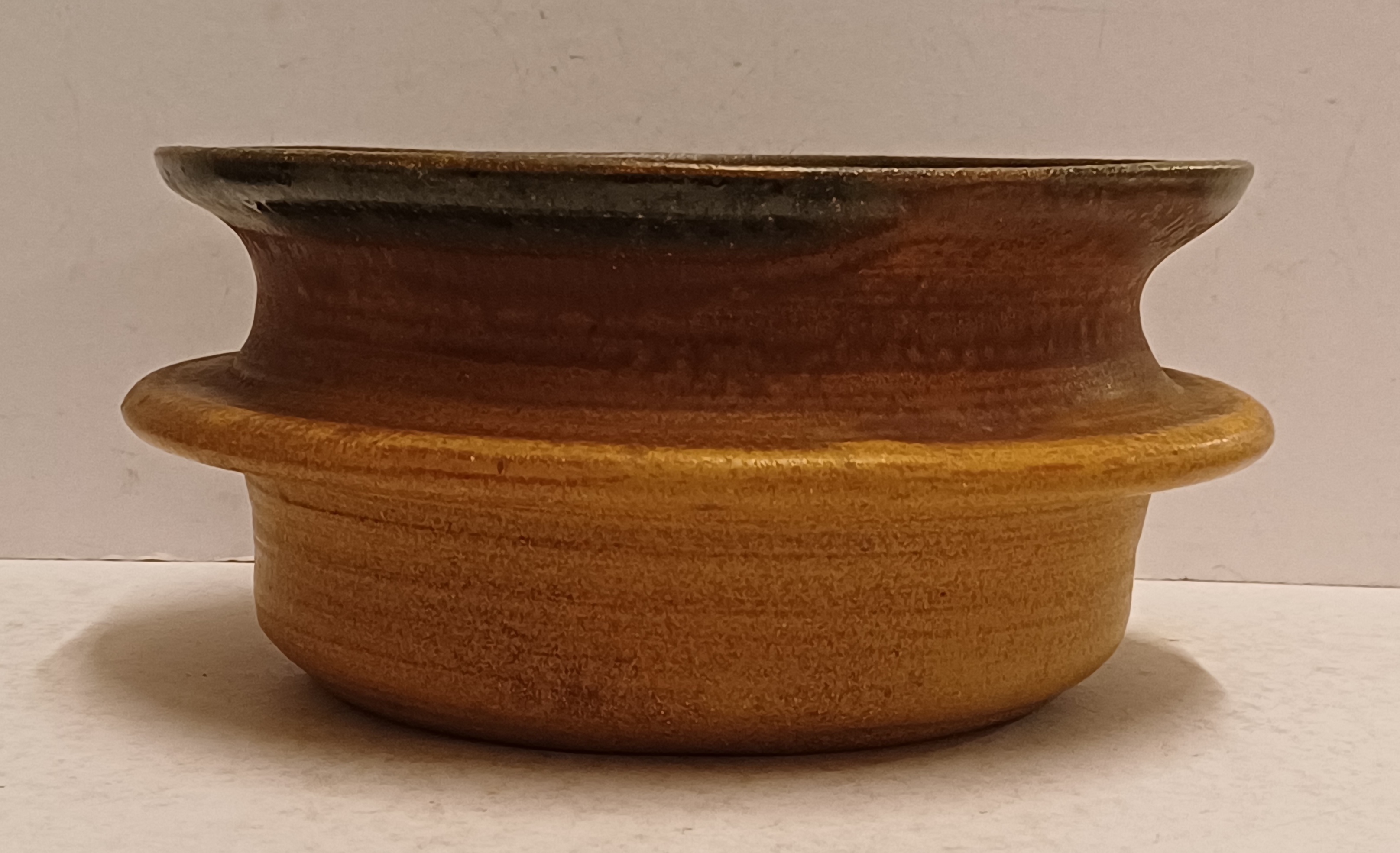 Vroege hand gedraaide gekraagde kom met licht uitlopende rand. Binnenzijde met donkere ruwe glazuur, de buitenkant met bruine matte glazuur. Onderzijde gesigneerd en gedateerd '66.