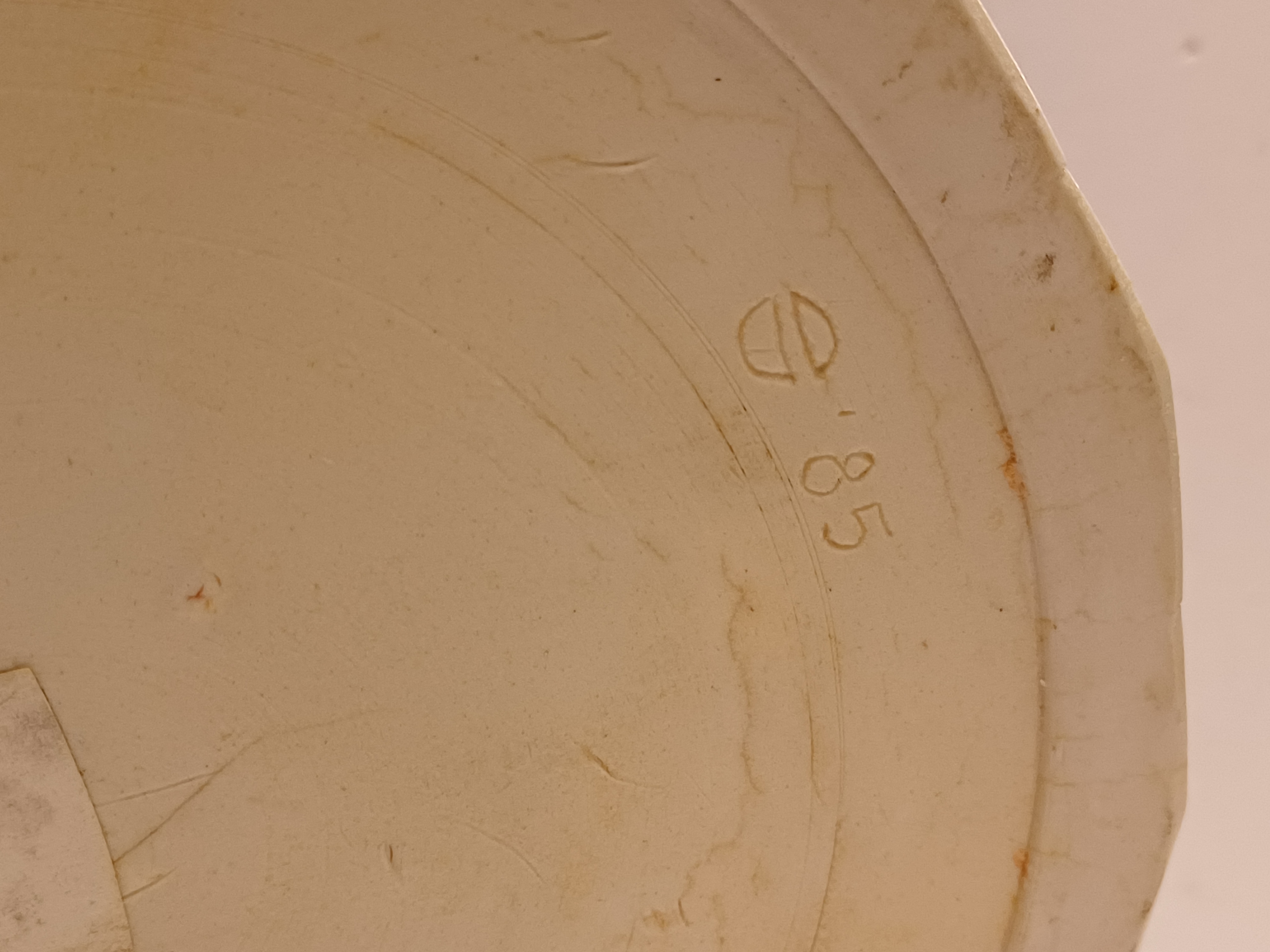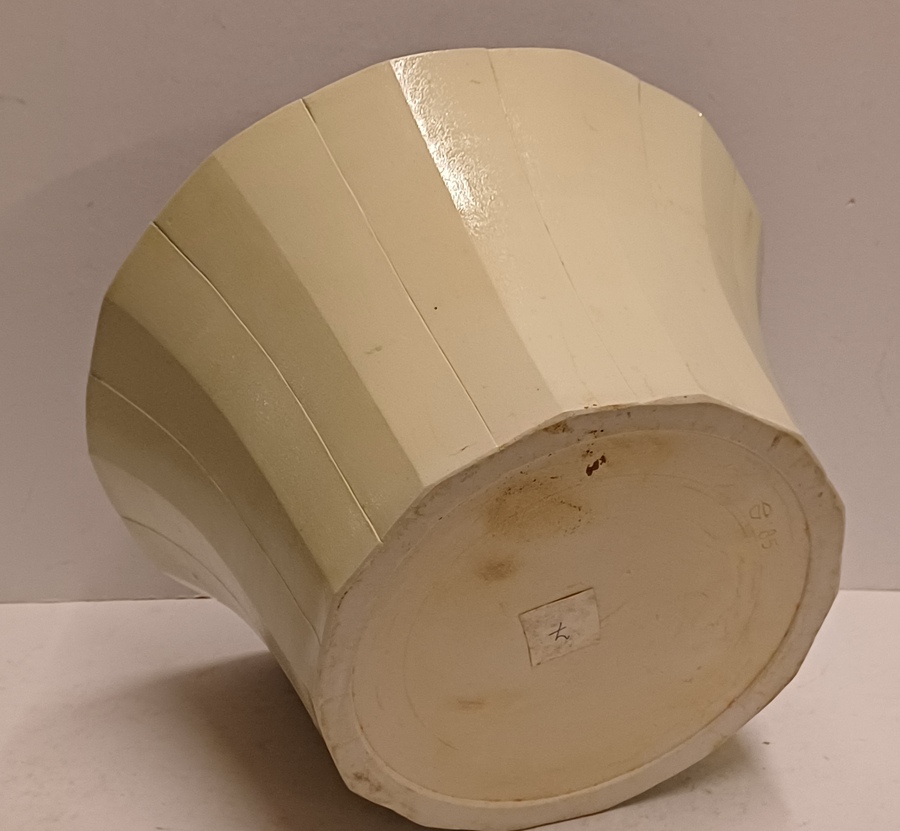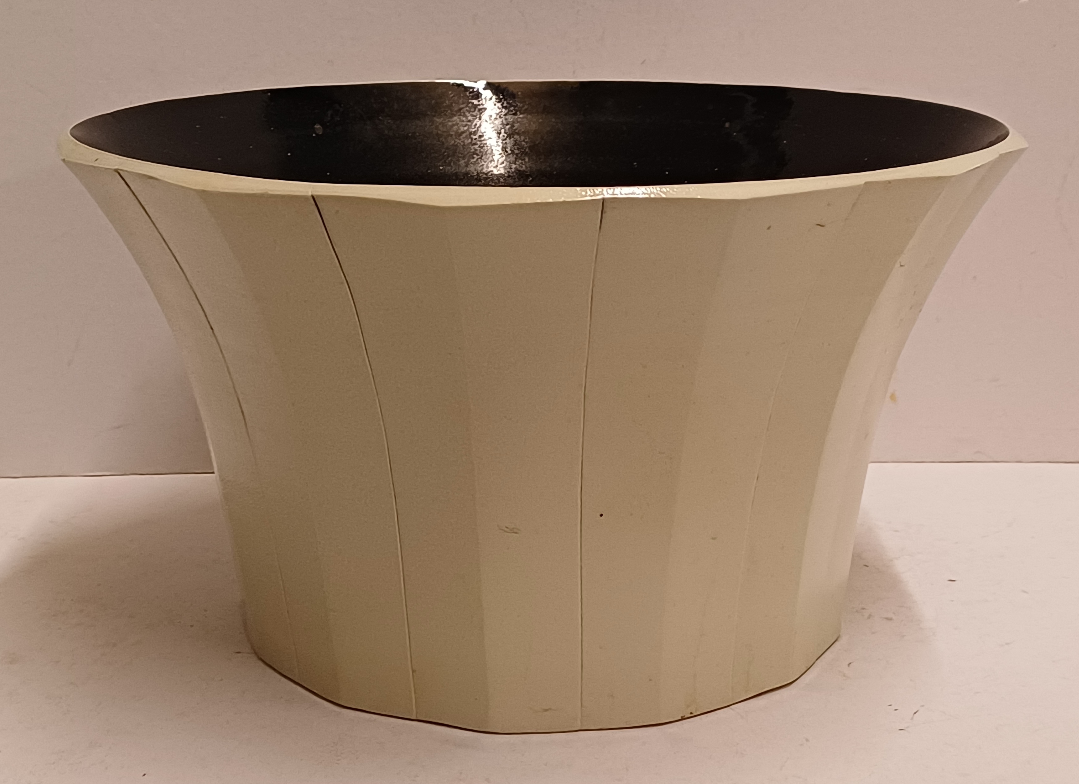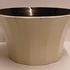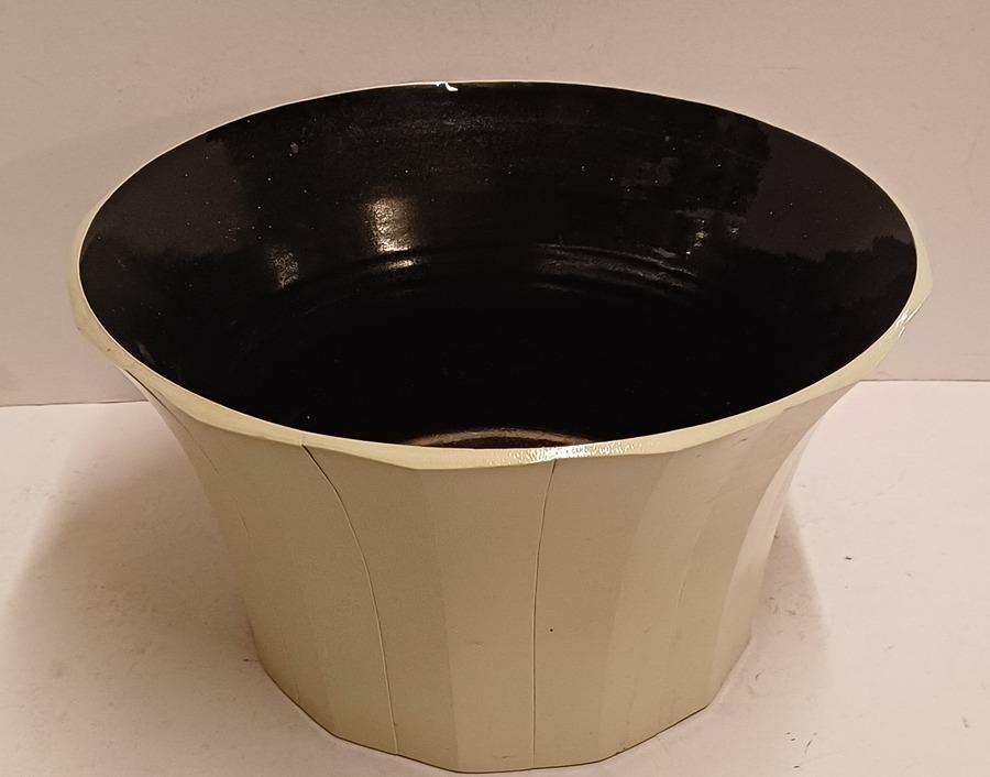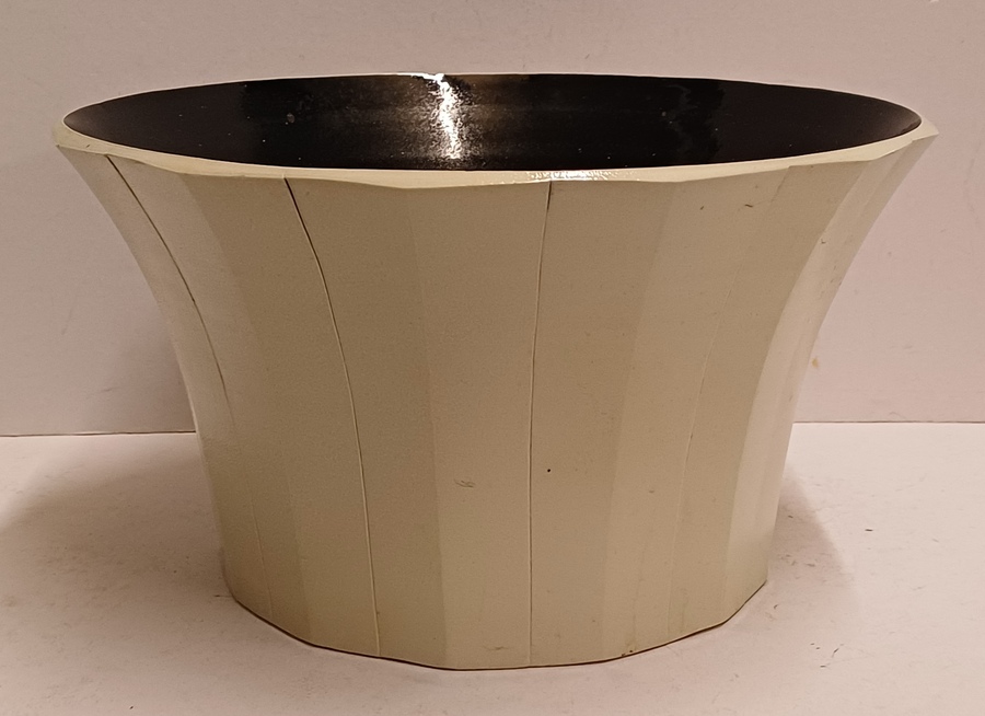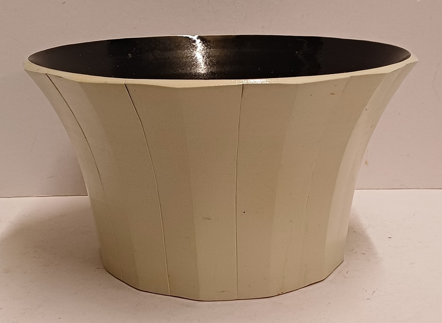 Forse steengoed kom met afgevlakte verticale banen, de binnenzijde met glanzende zwarte glazuur. Onderzijde met signatuur en datering '85.