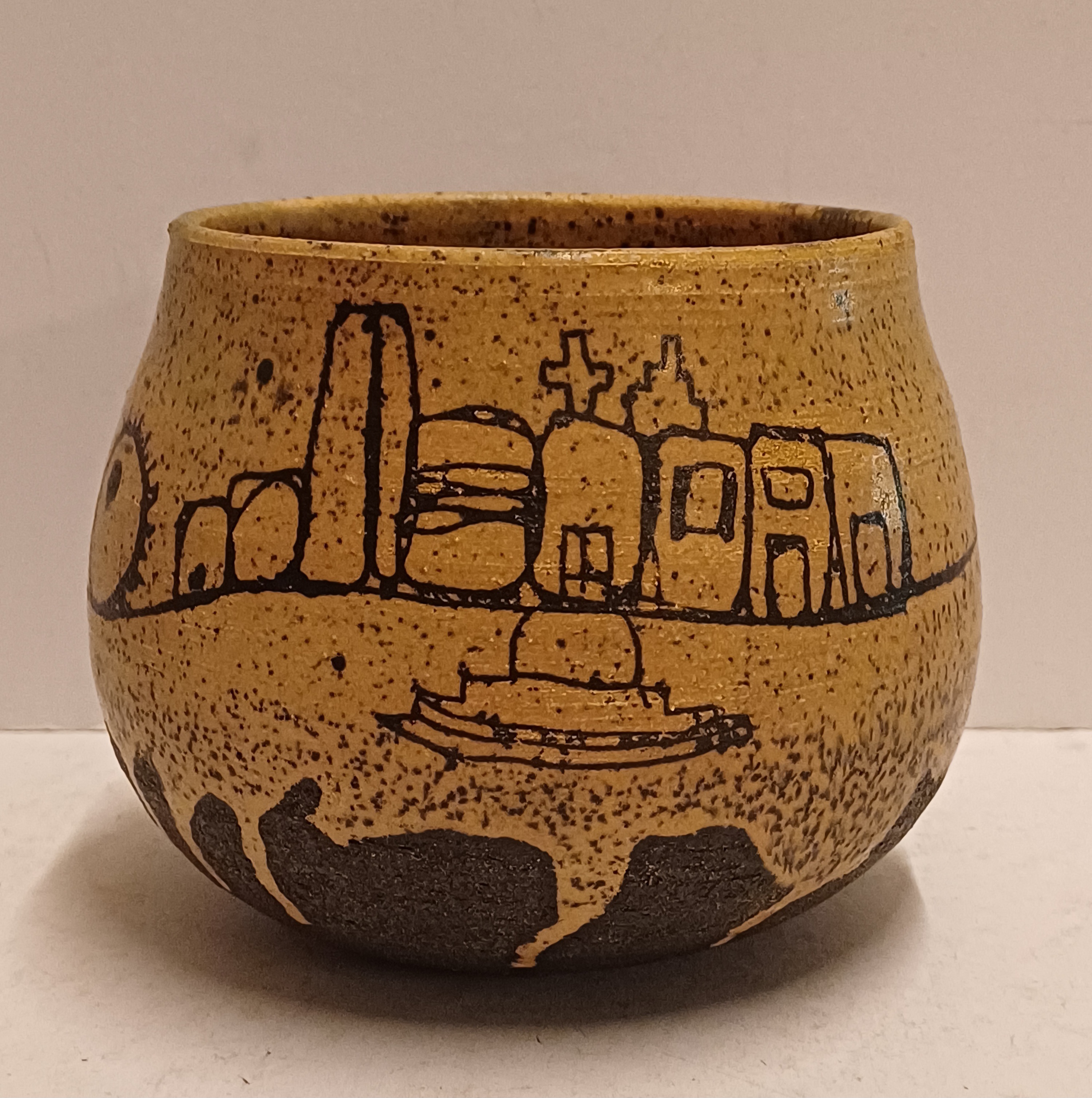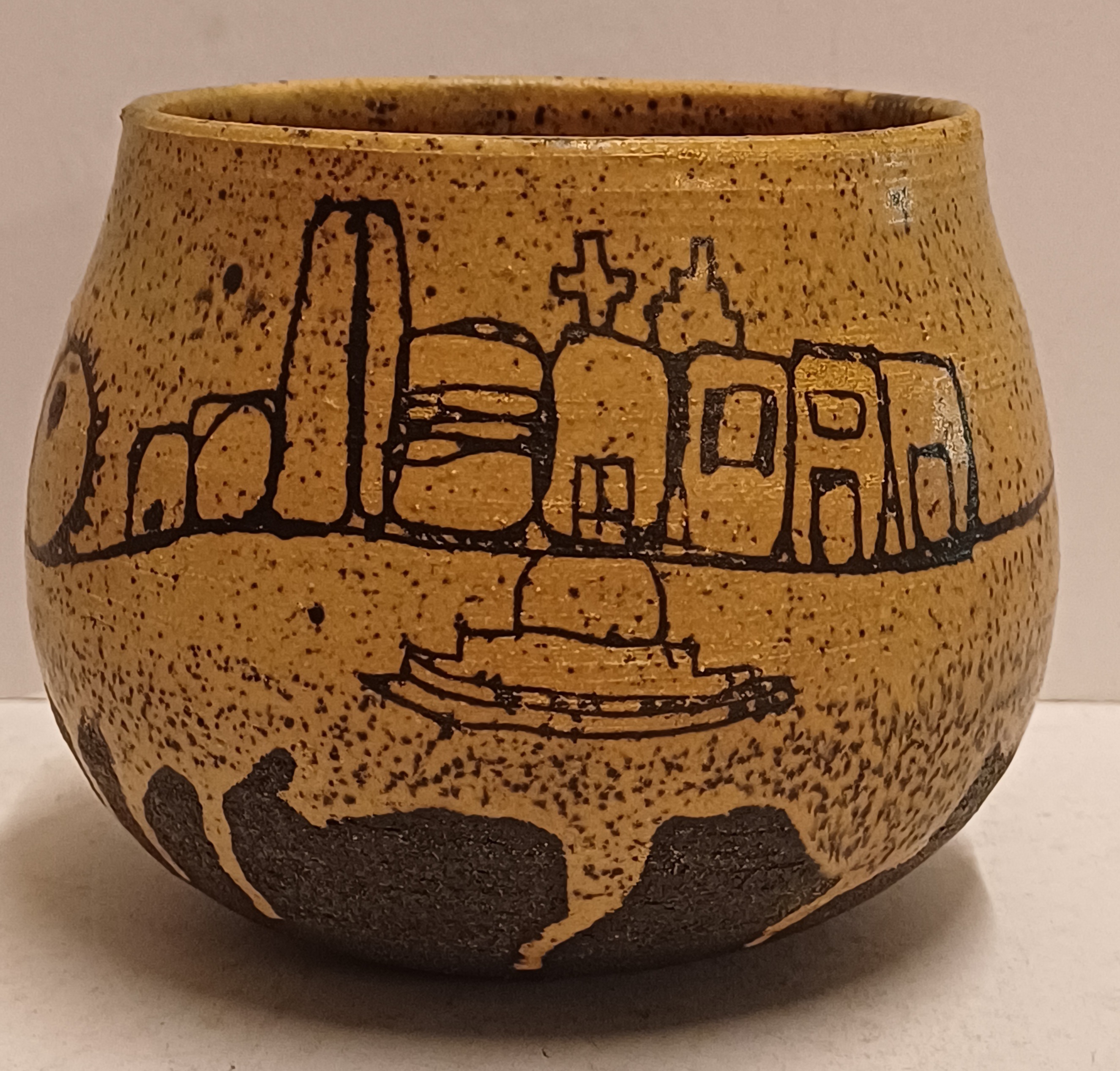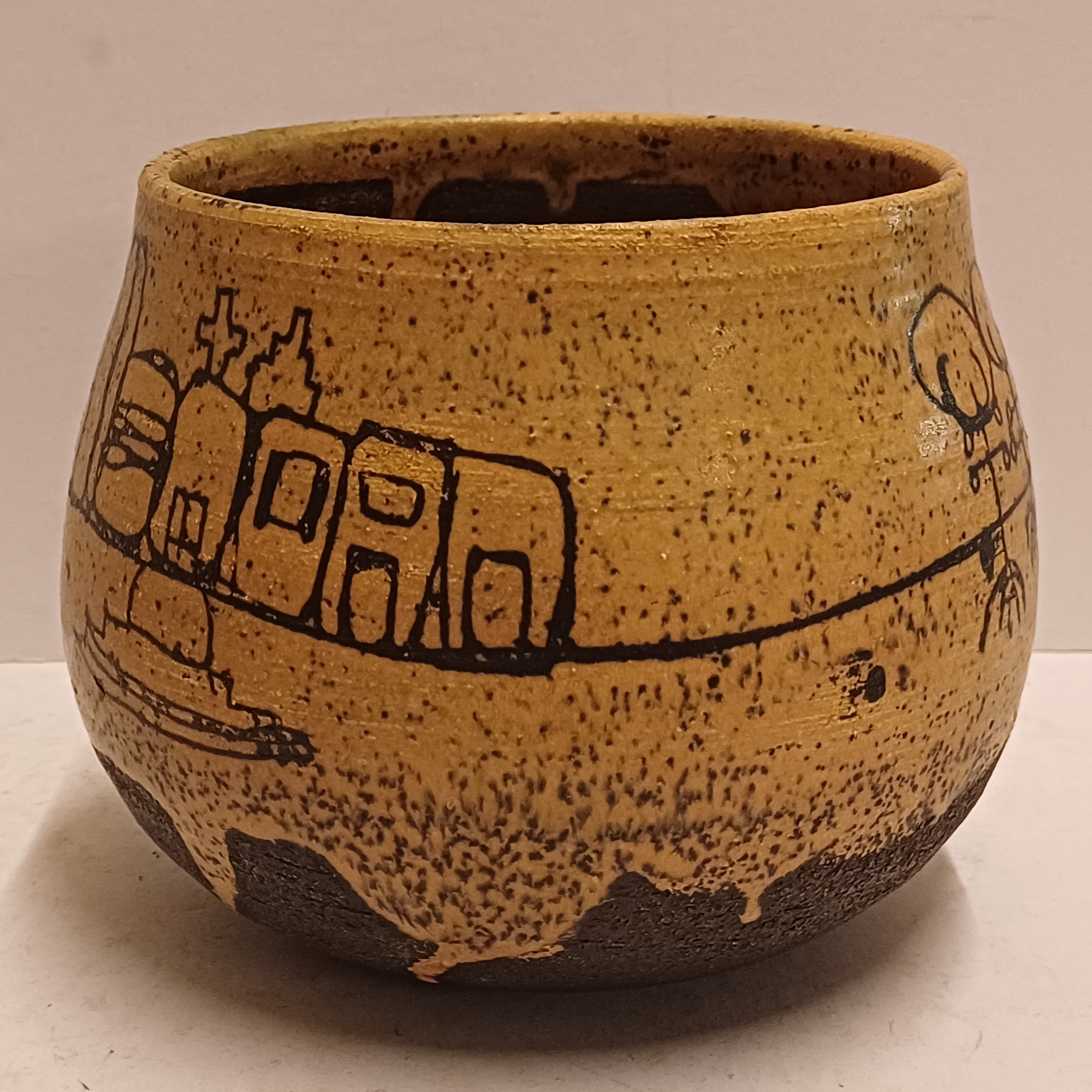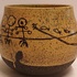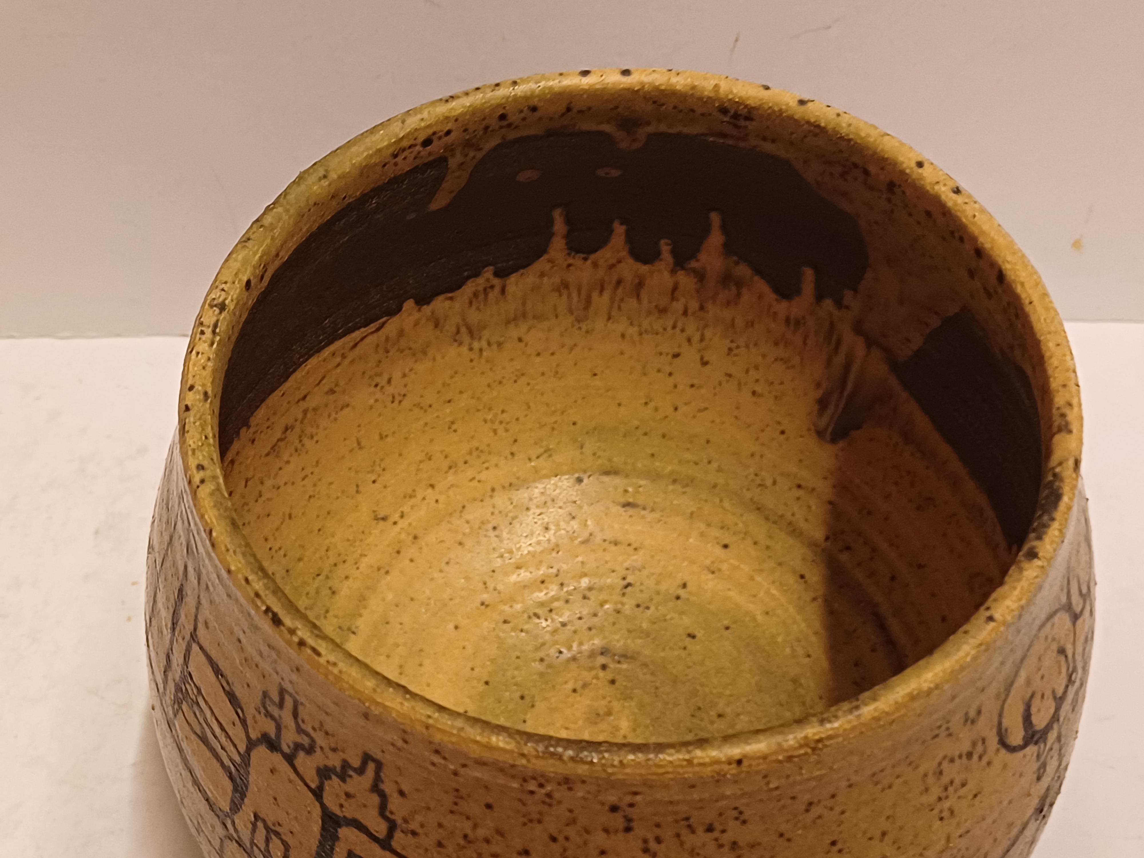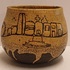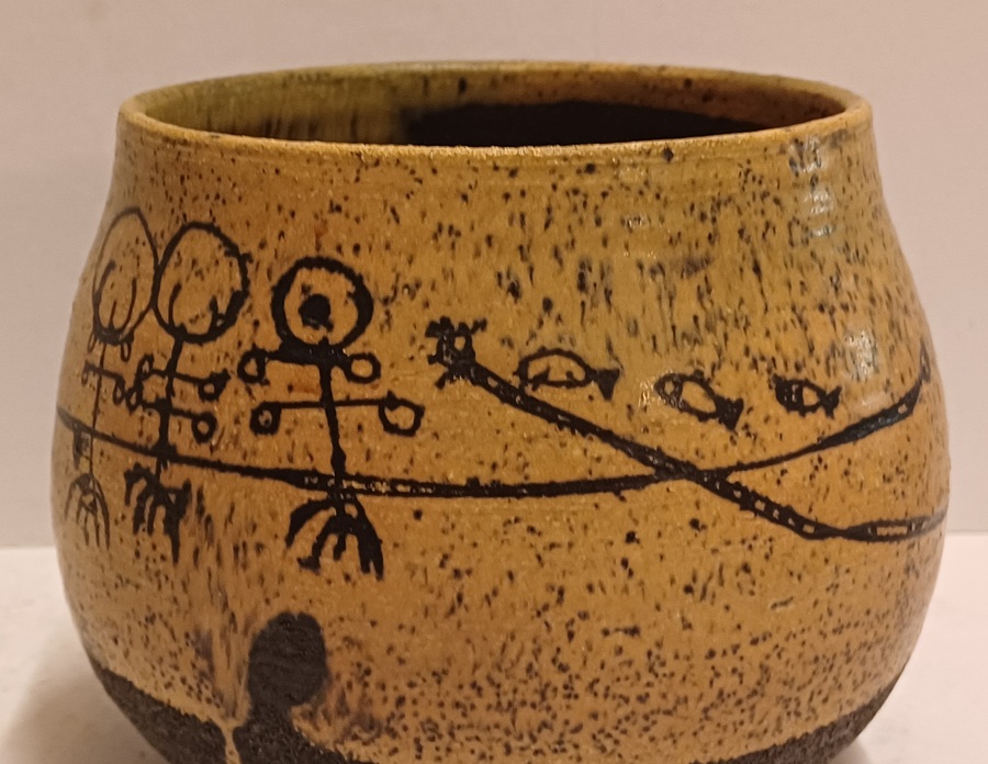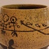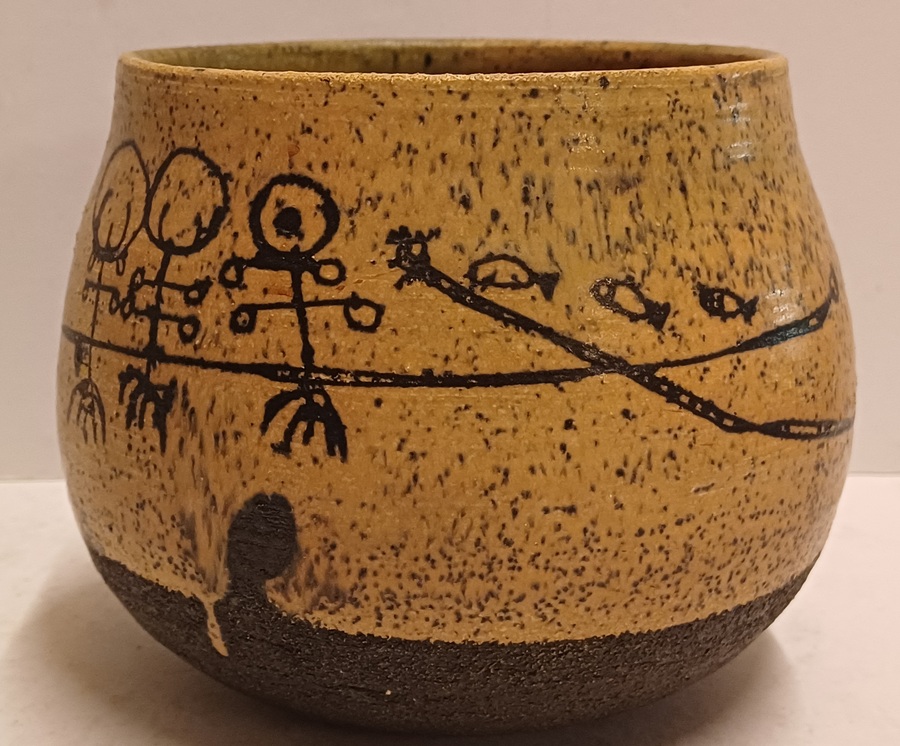 Aardewerken kom met decoratie van fantasie landschap met een stel vogelfiguren op een lijn. Ontwerp Coco Kemper uitvoering experimentele afdeling van de Porceleyne Fles te Delft . Onderzijde met kunstenaars monogram en fabrieksmerk.