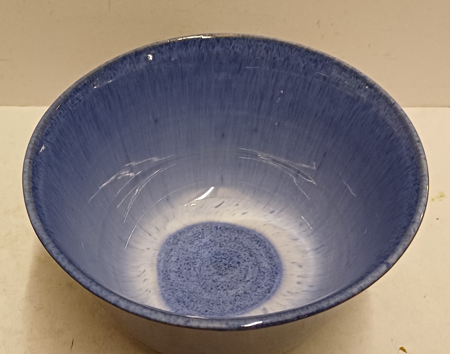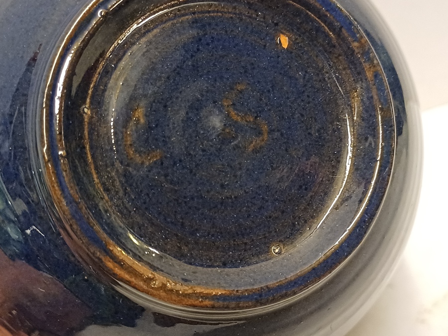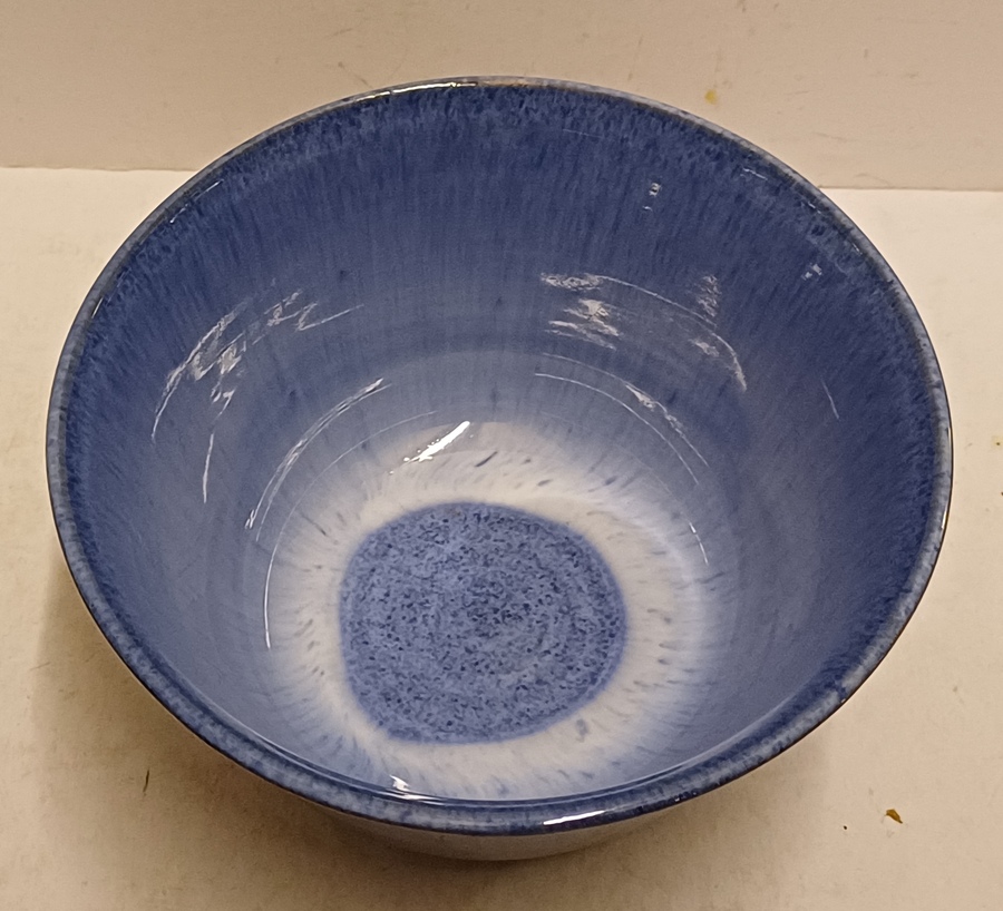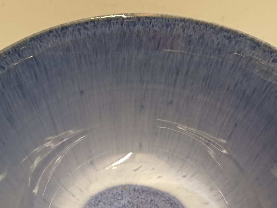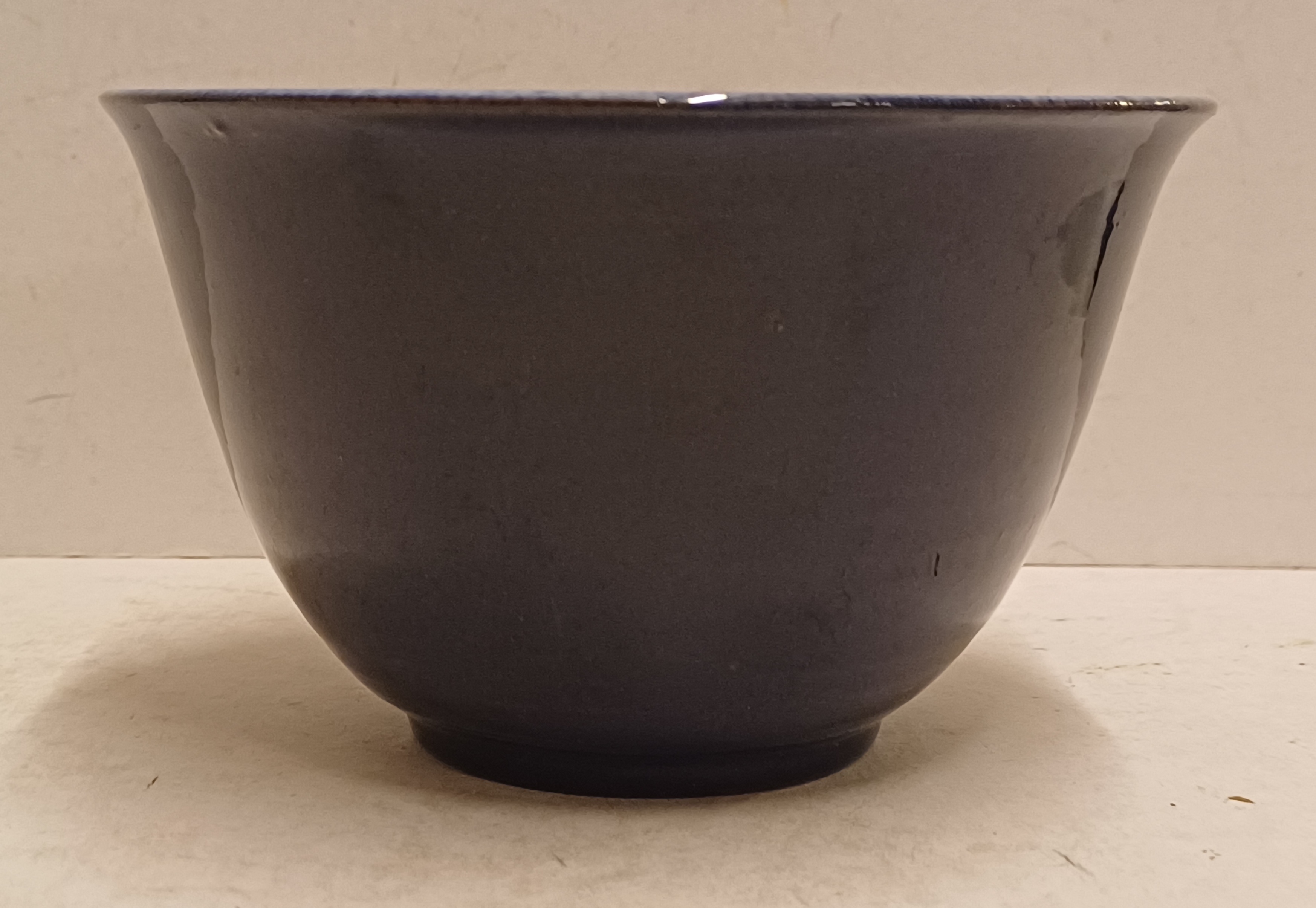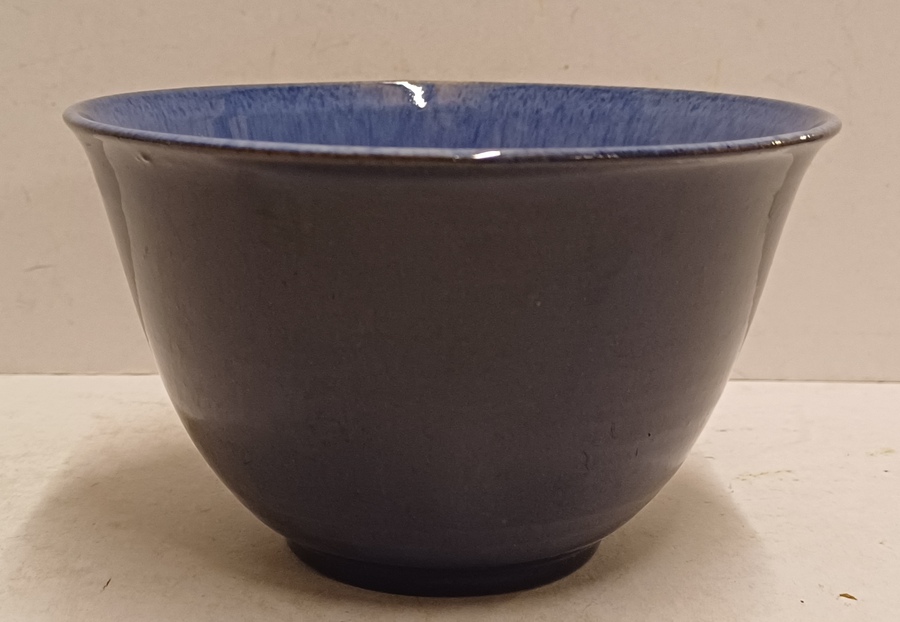 Dun gedraaide kom met aan de binnenzijde met blauwe stroomgazuur De buitenzijde in donkerblauw. Onderzijde met monogram.