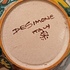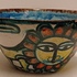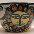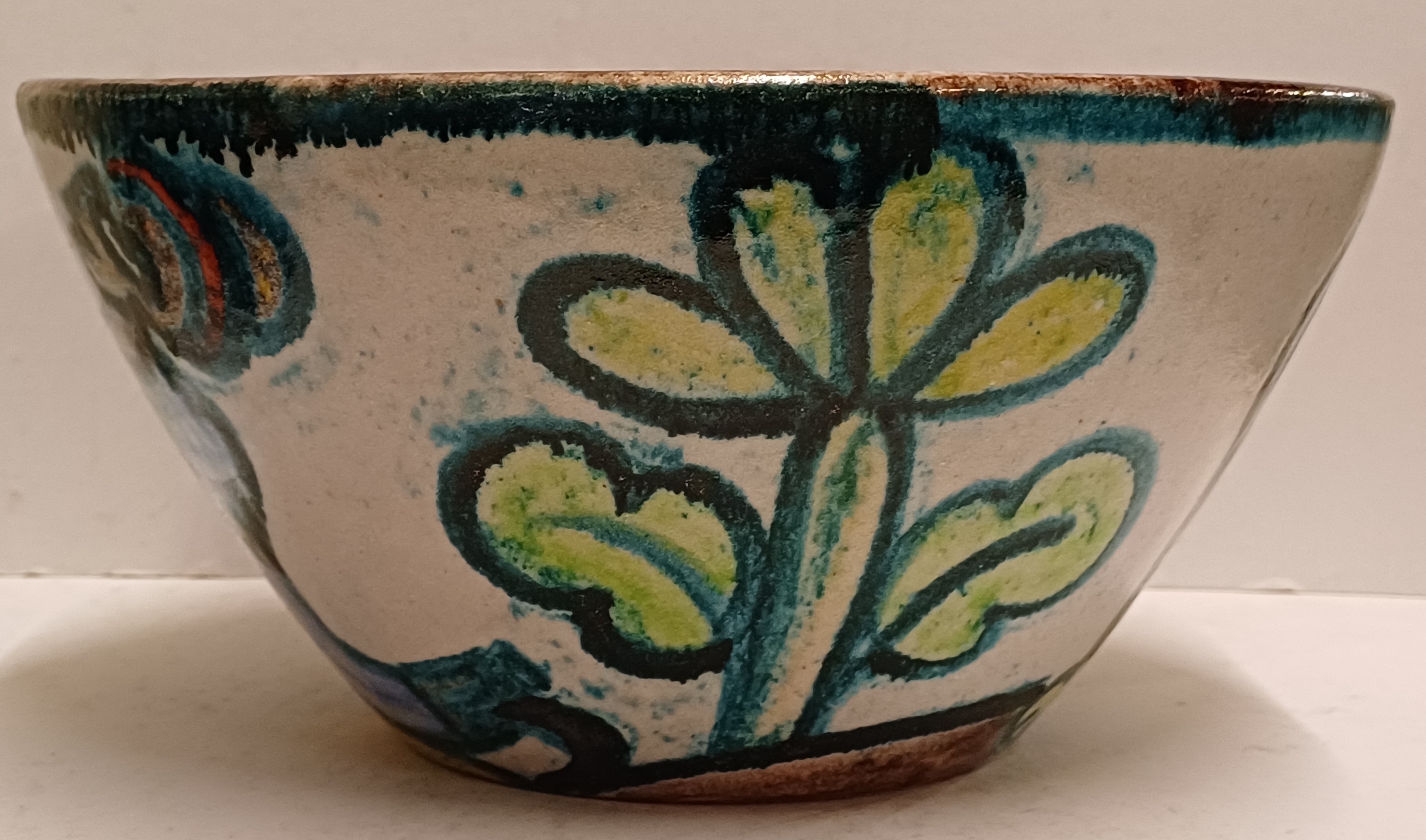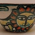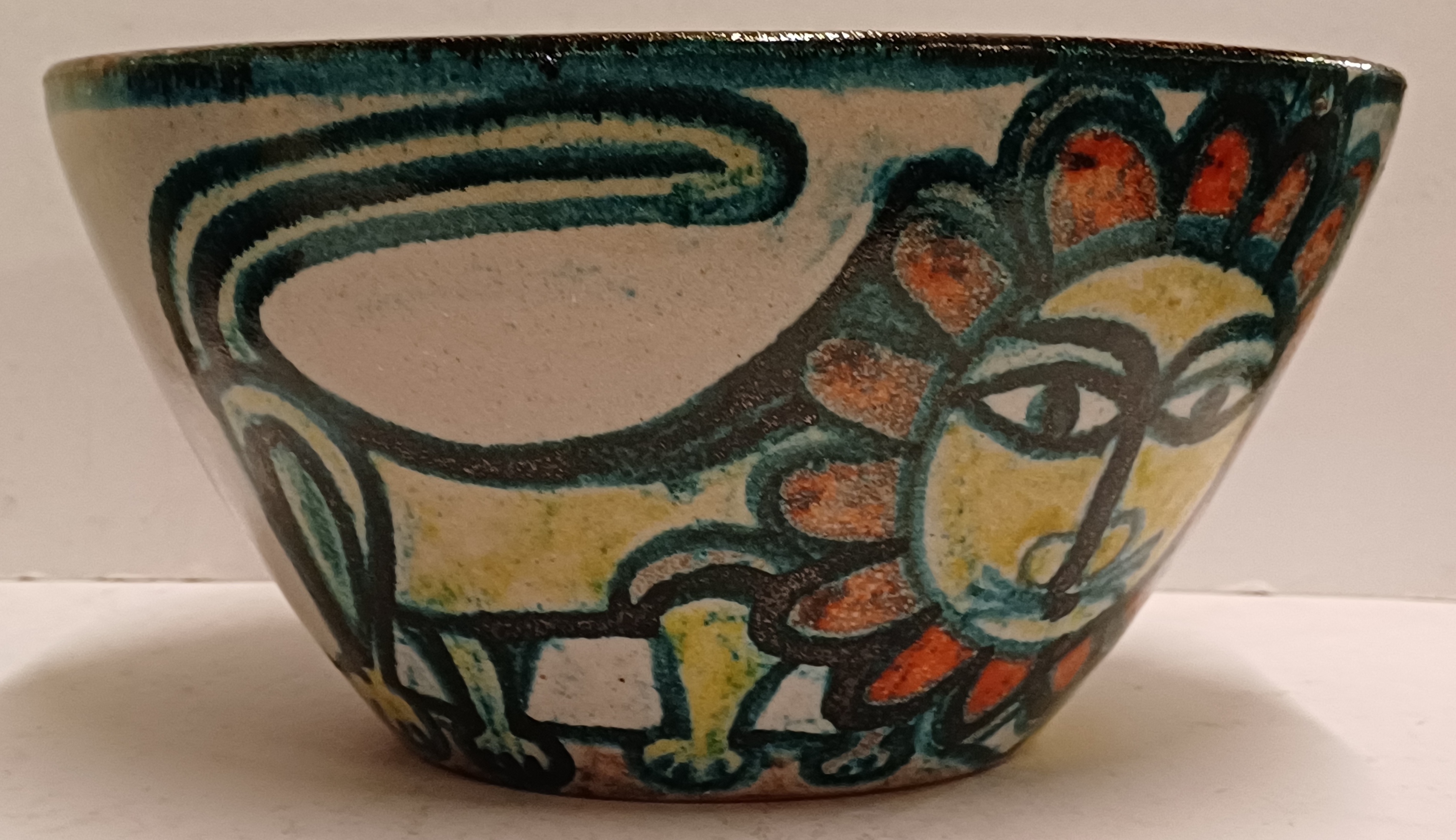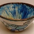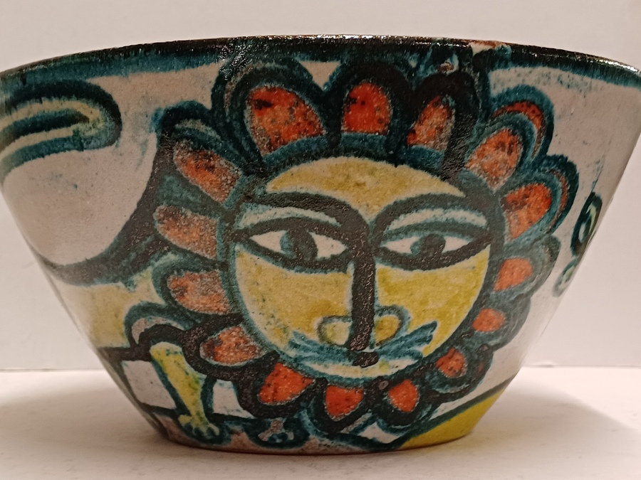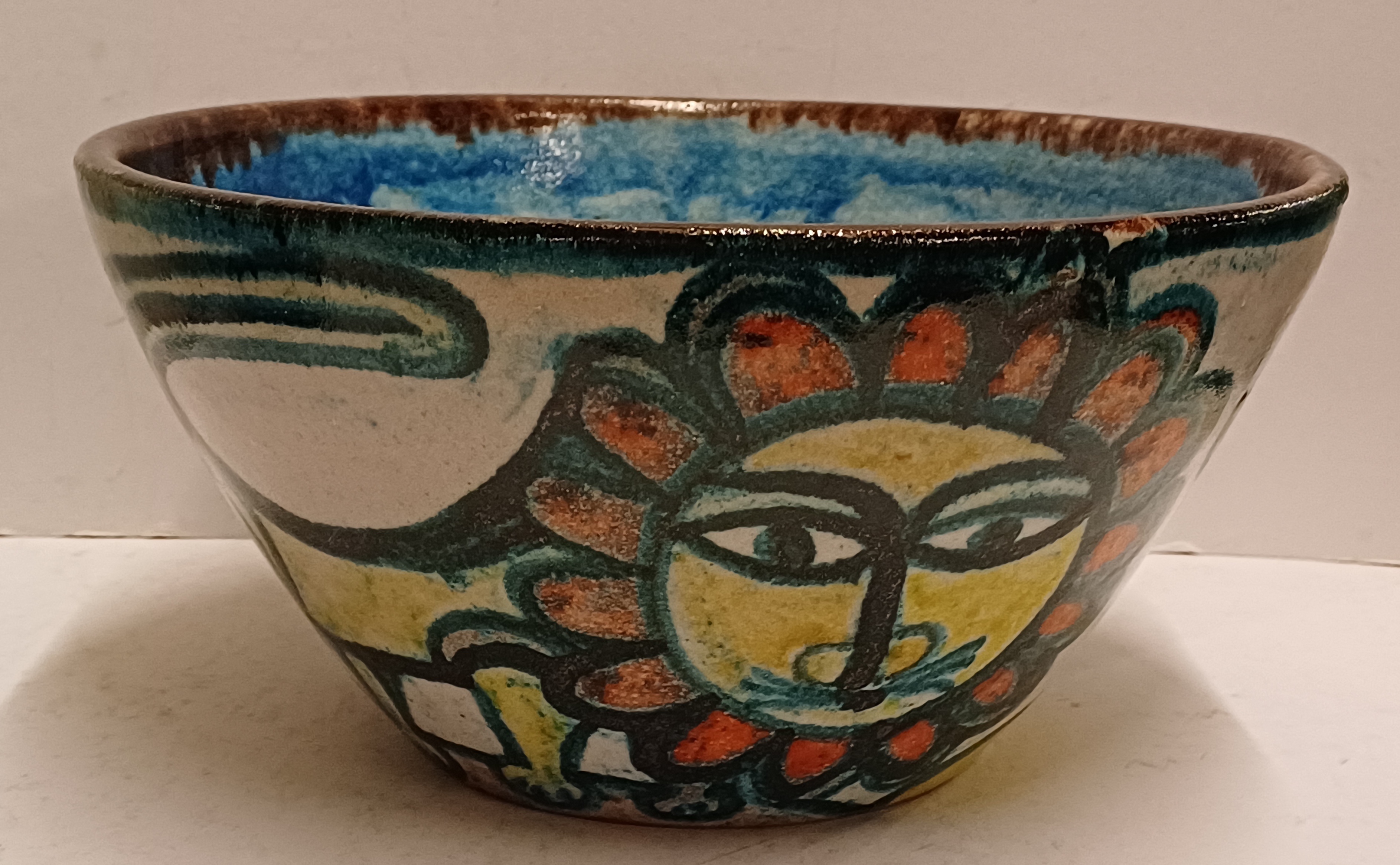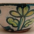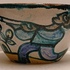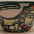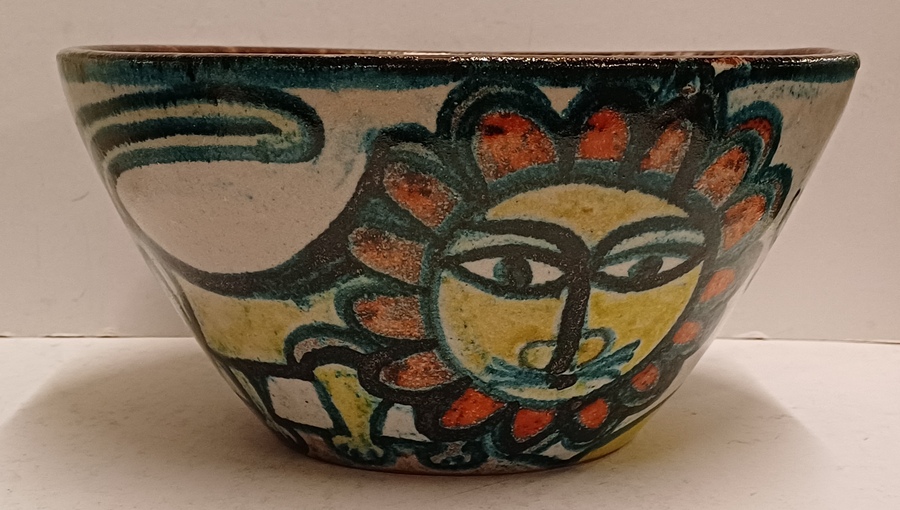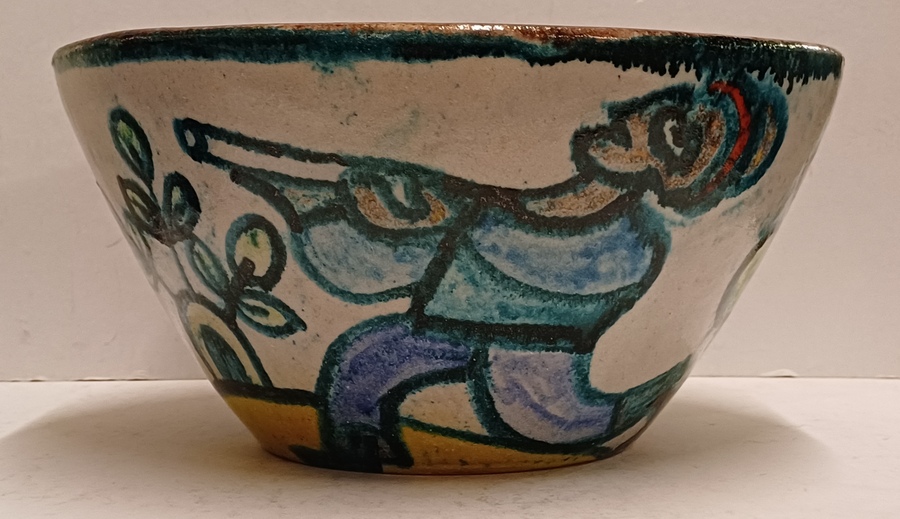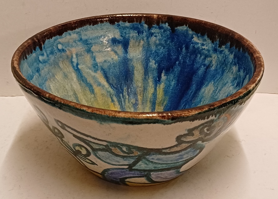 Aardewerken kom met voortstelling jager en een leeuw. Binnenzijde met blauw stroomglazuur. Onderzijde gesigneerd