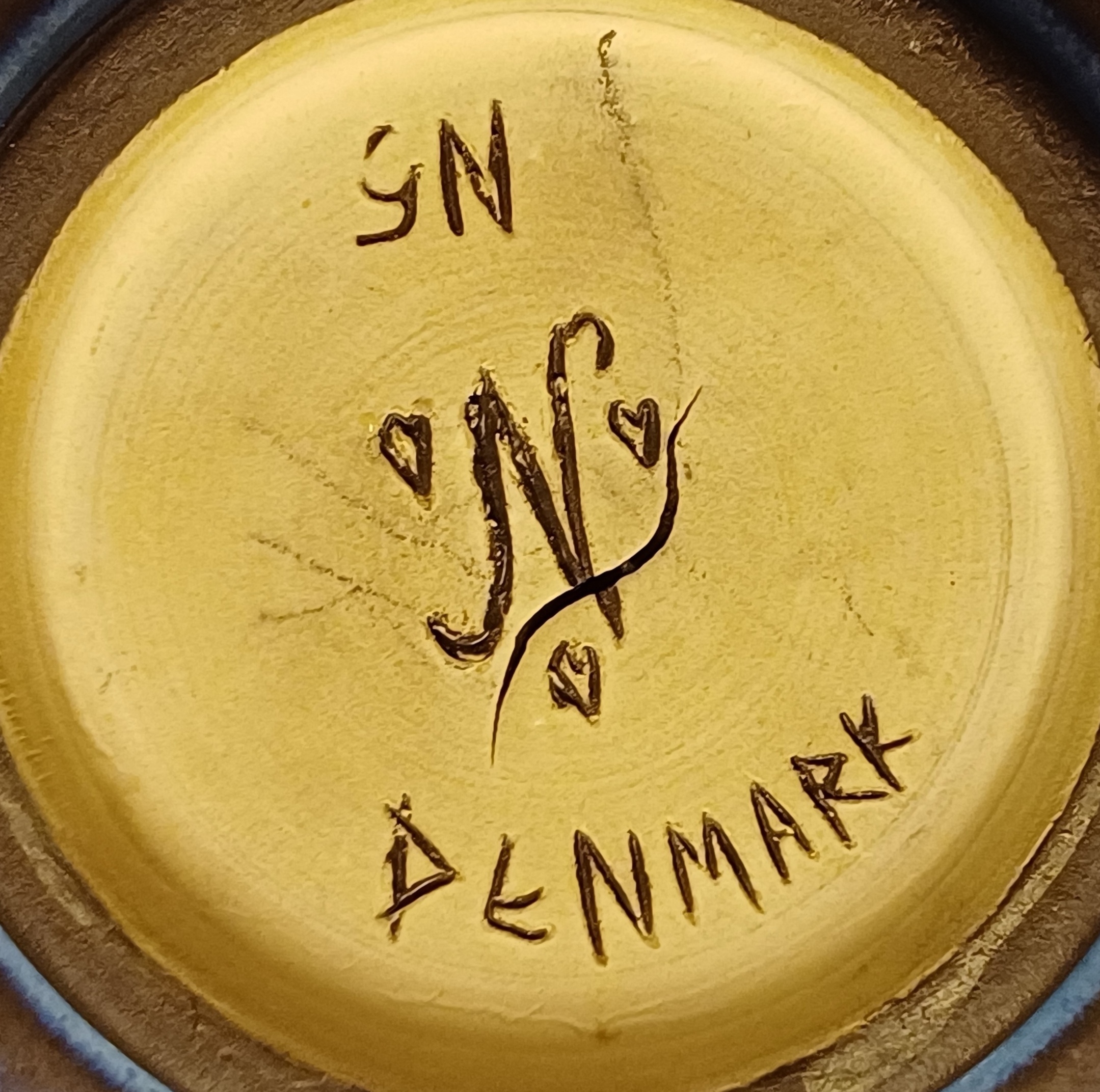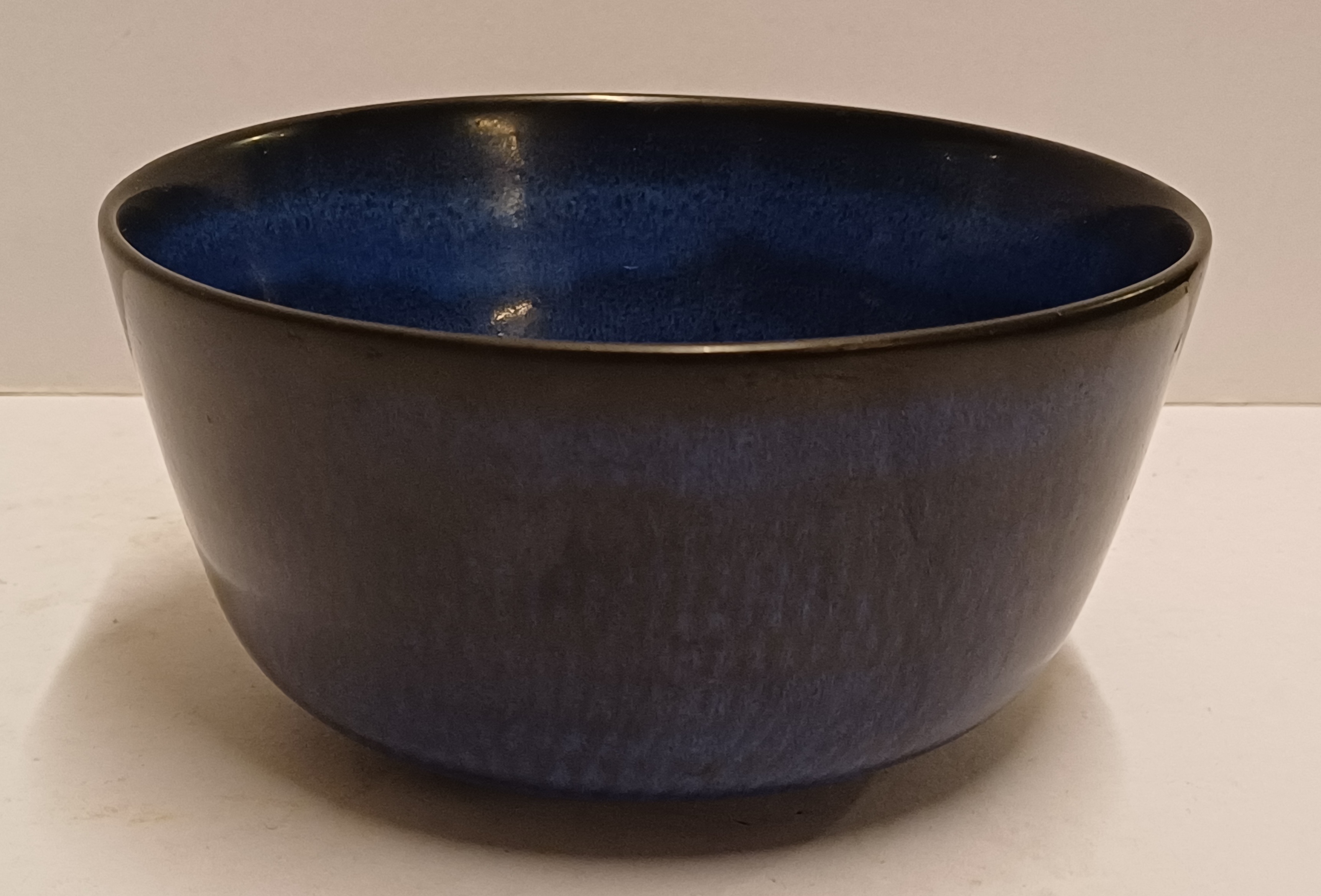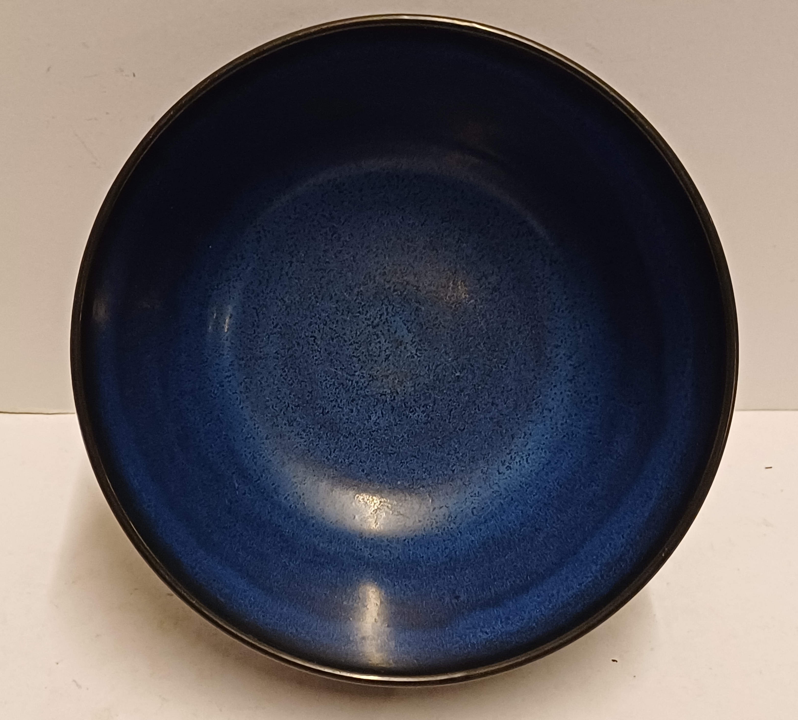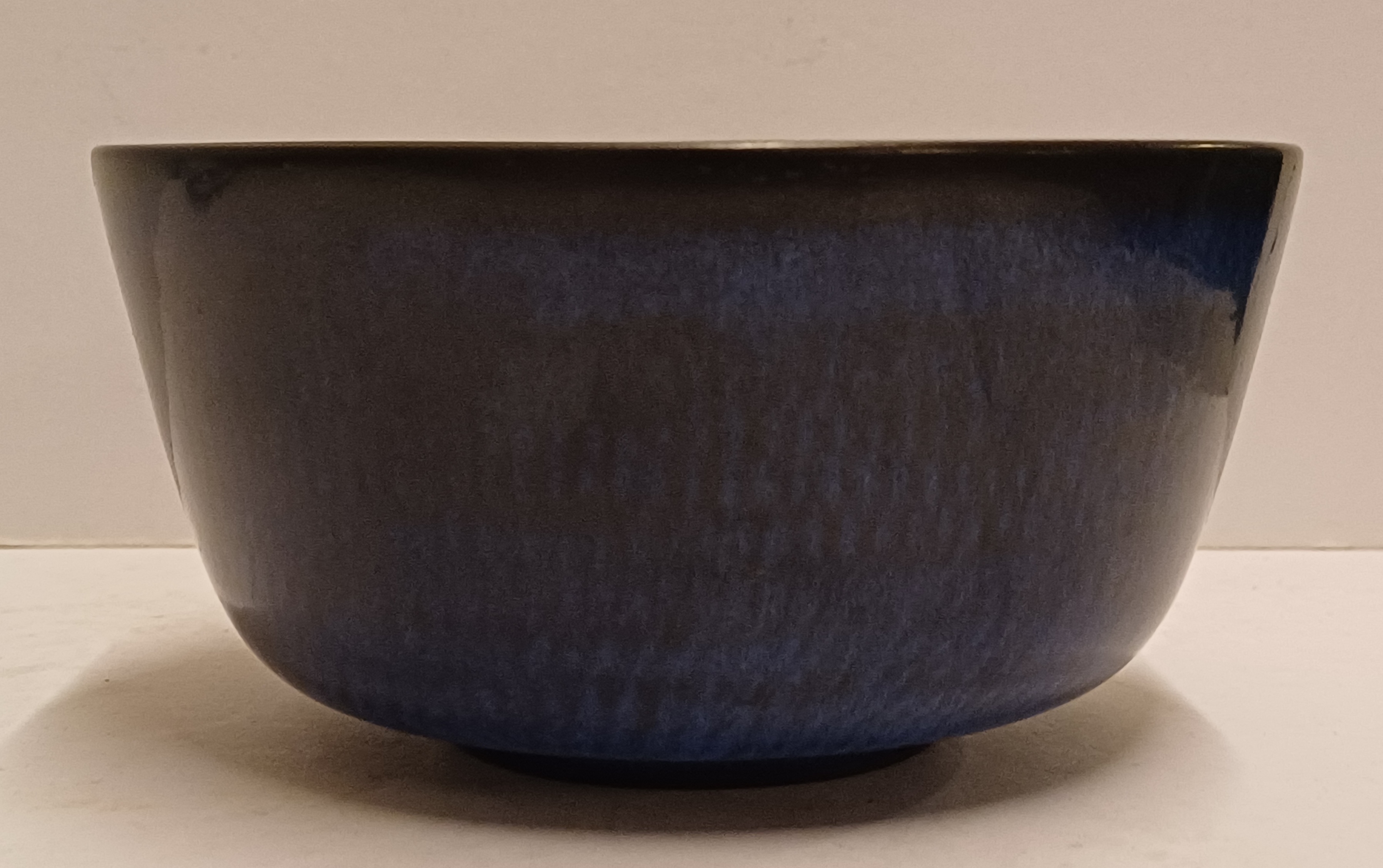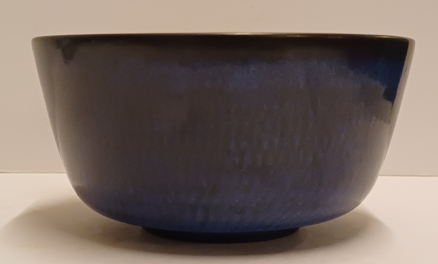 Aardewerken kom met licht gekamd decor met donkerblauwe glazuur. Onderzijde met fabrieksmerk Nymolle.