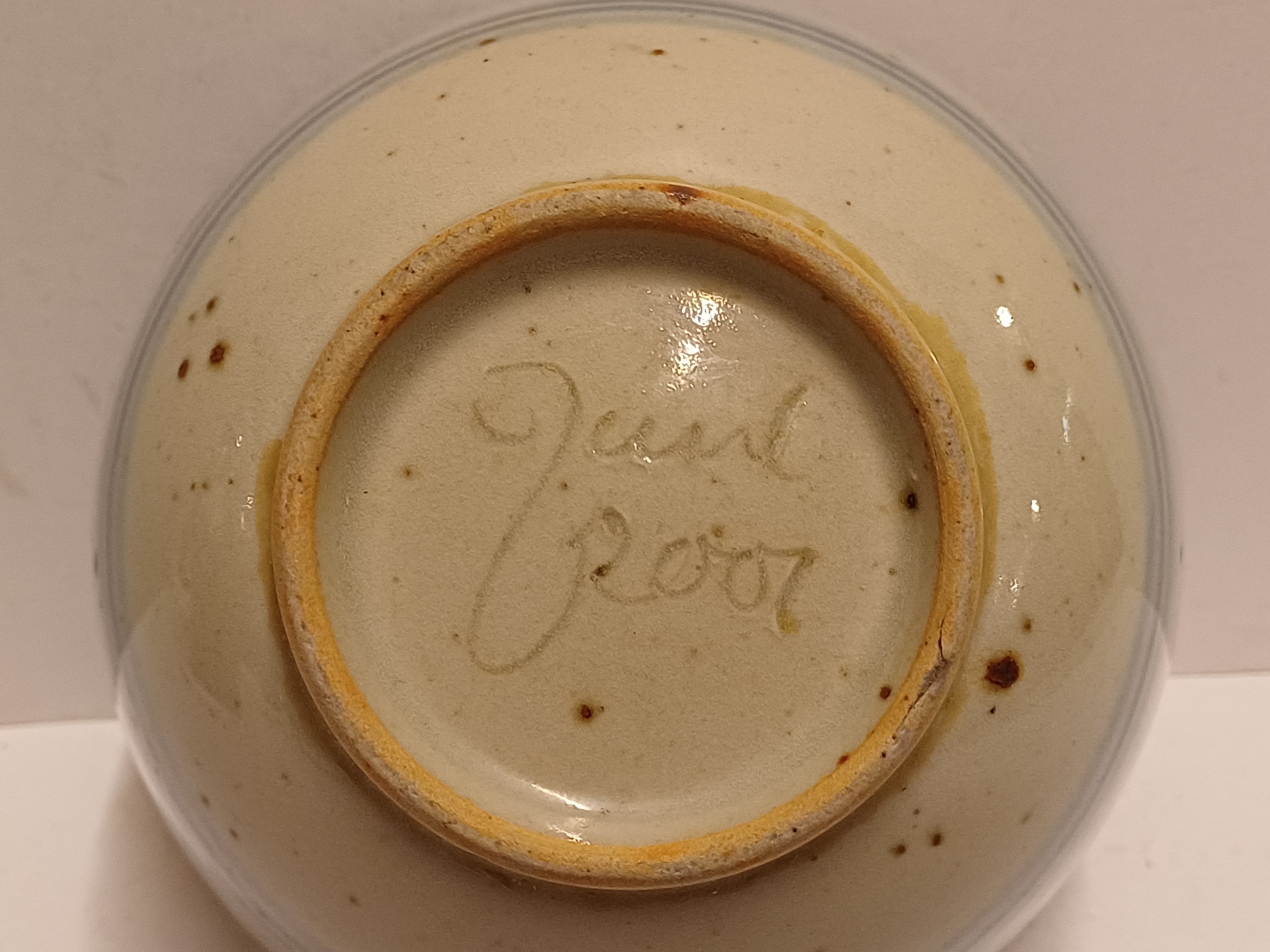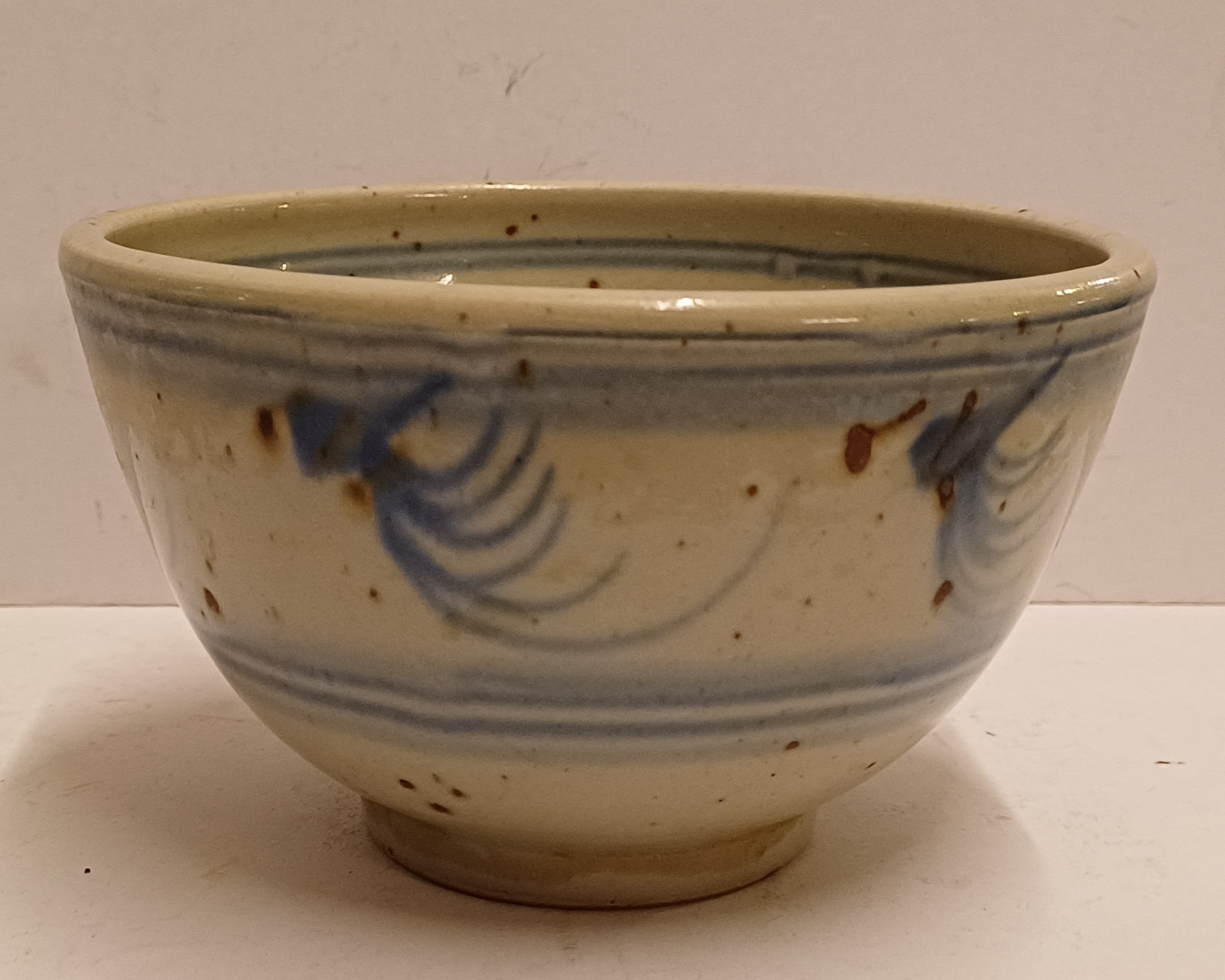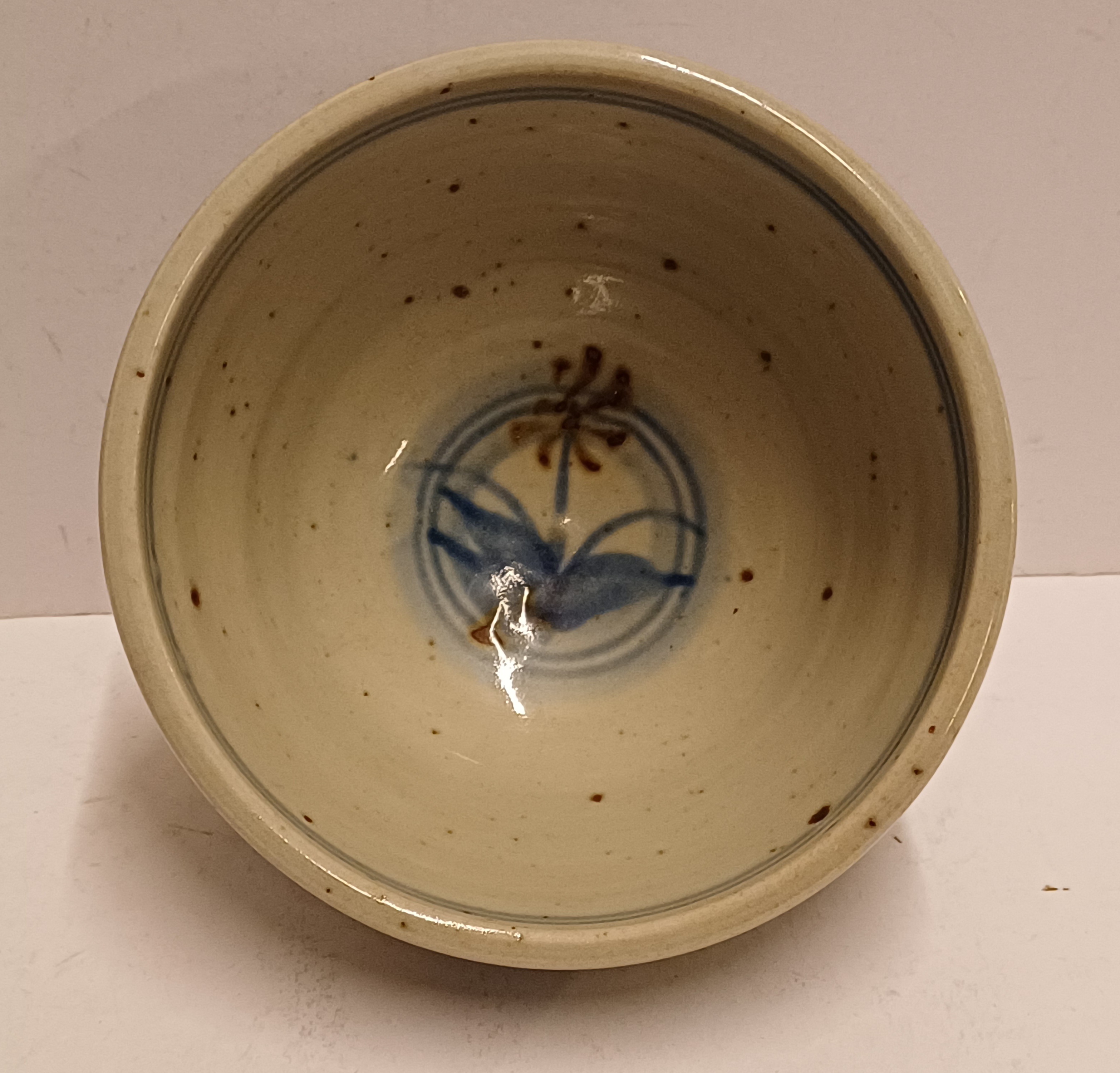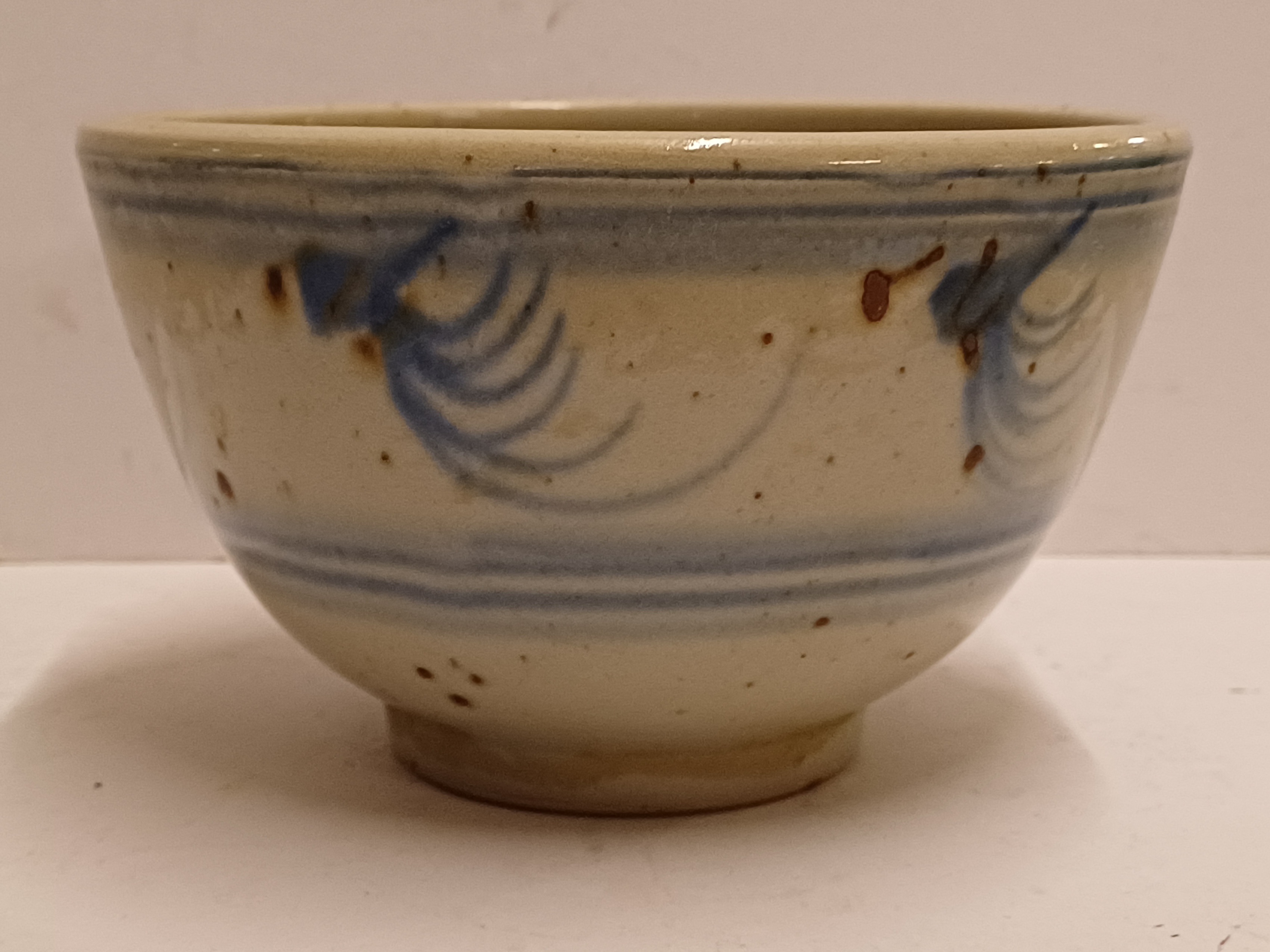 Steengoed kom met grijze glazuur en blauw decor. Onderzijde met signatuur.