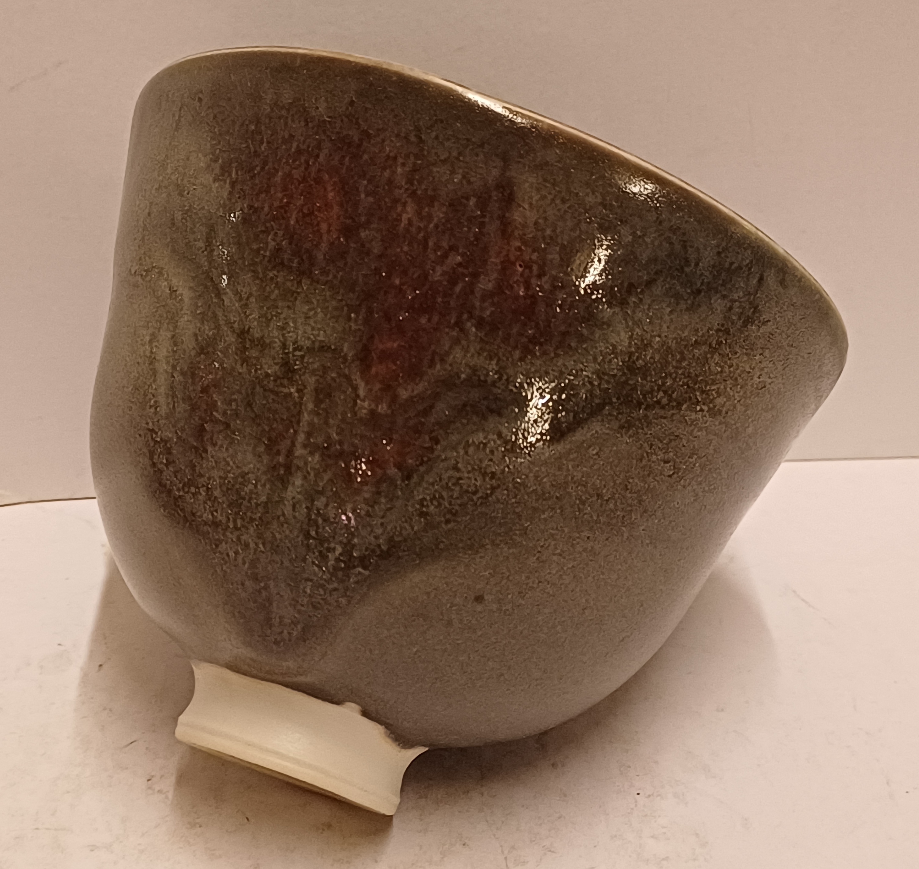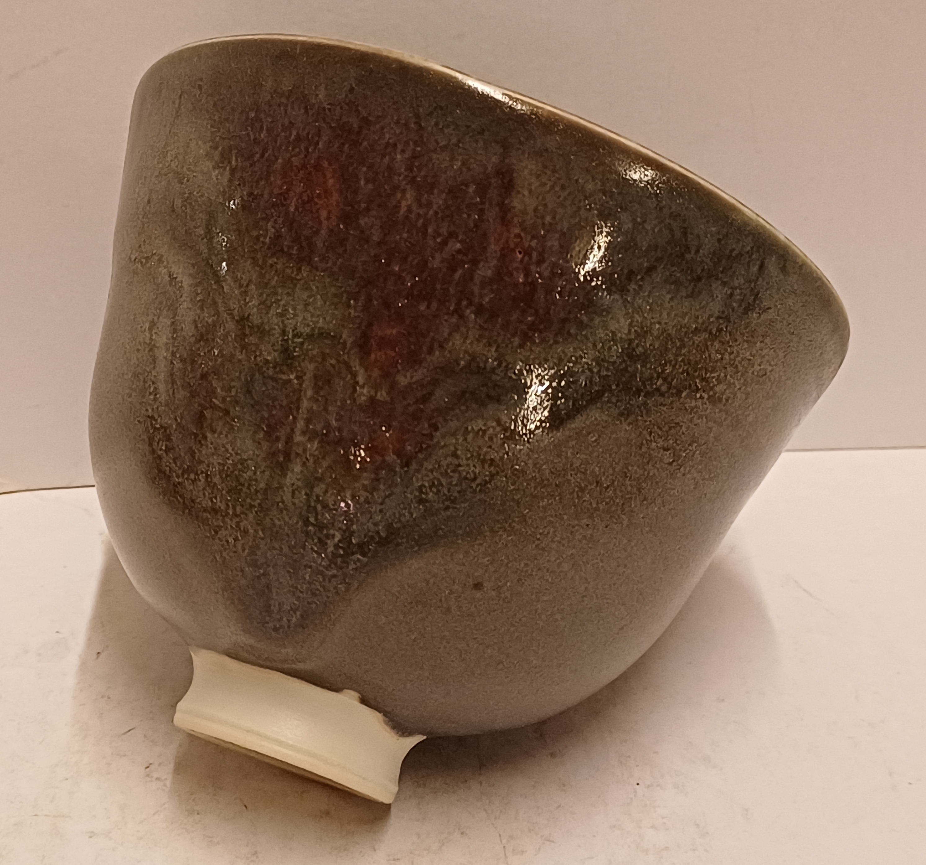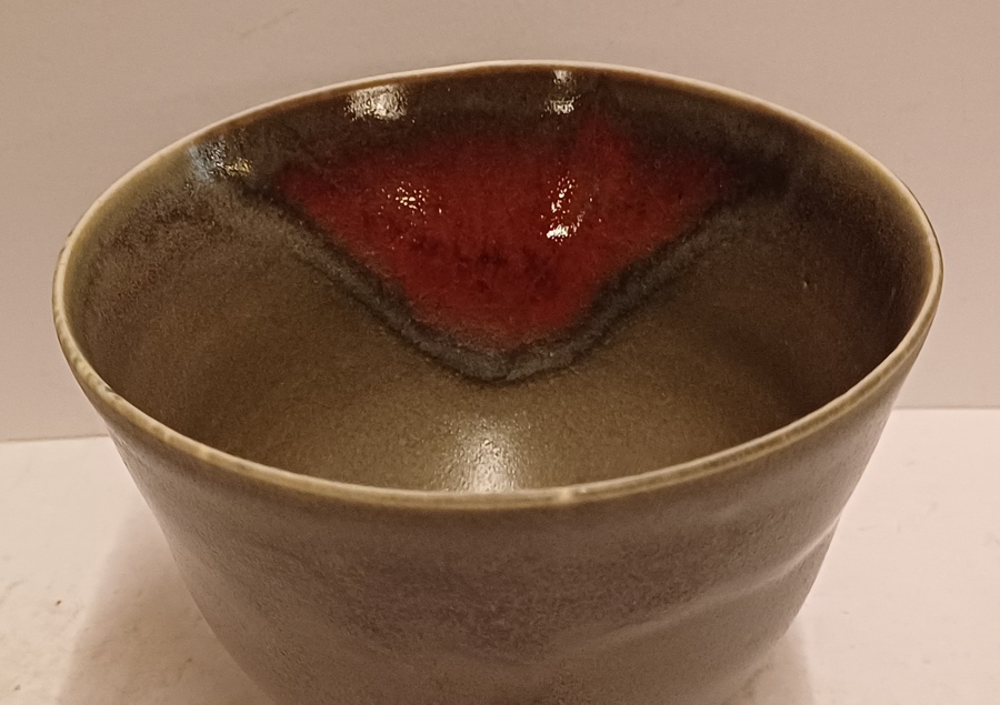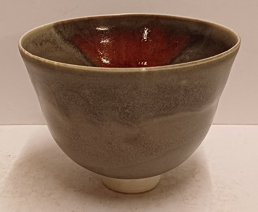 Porseleinen kom met grijze glazuur met rode sang de Bouef splash. Onderzijde met monogram
