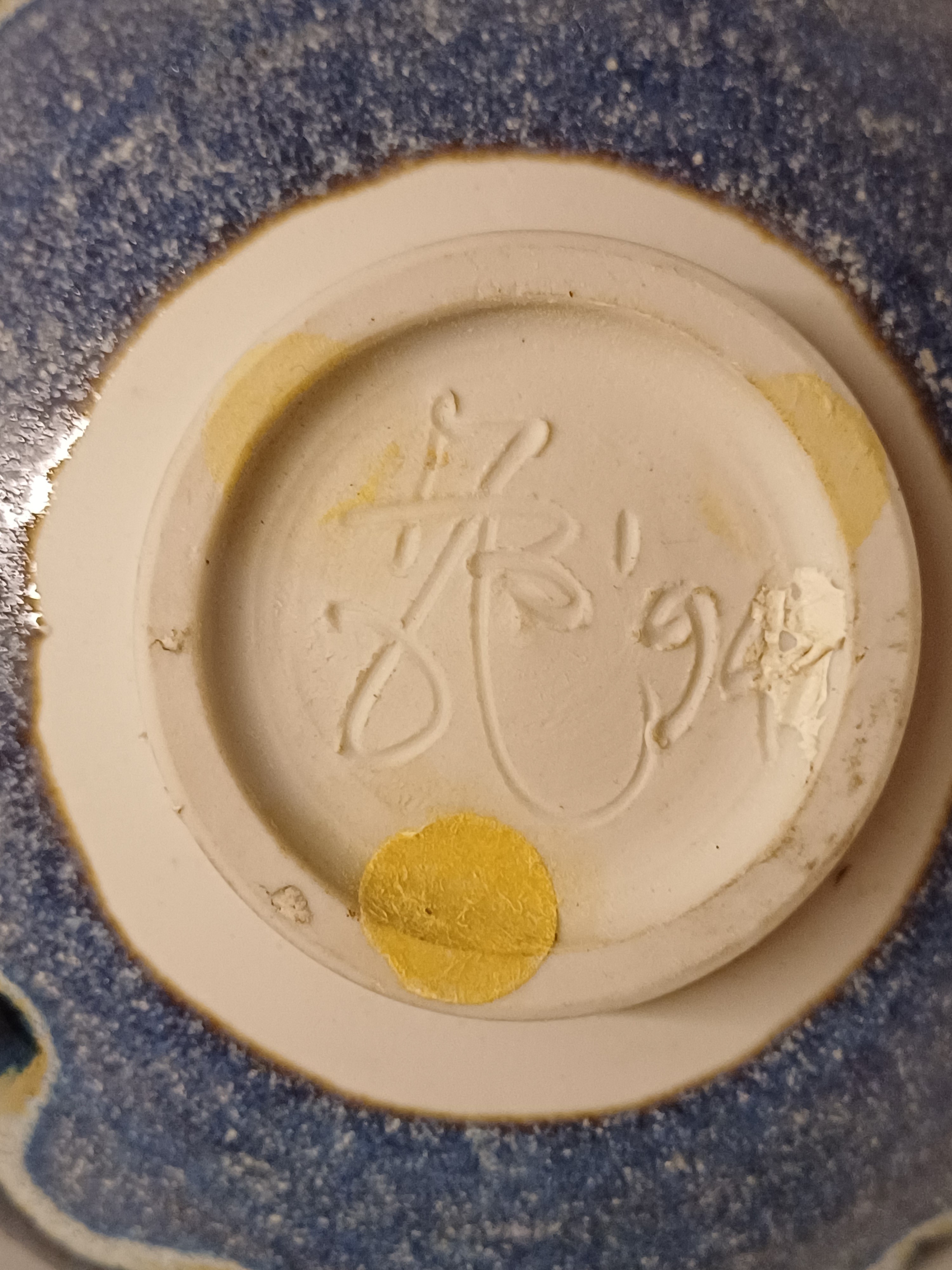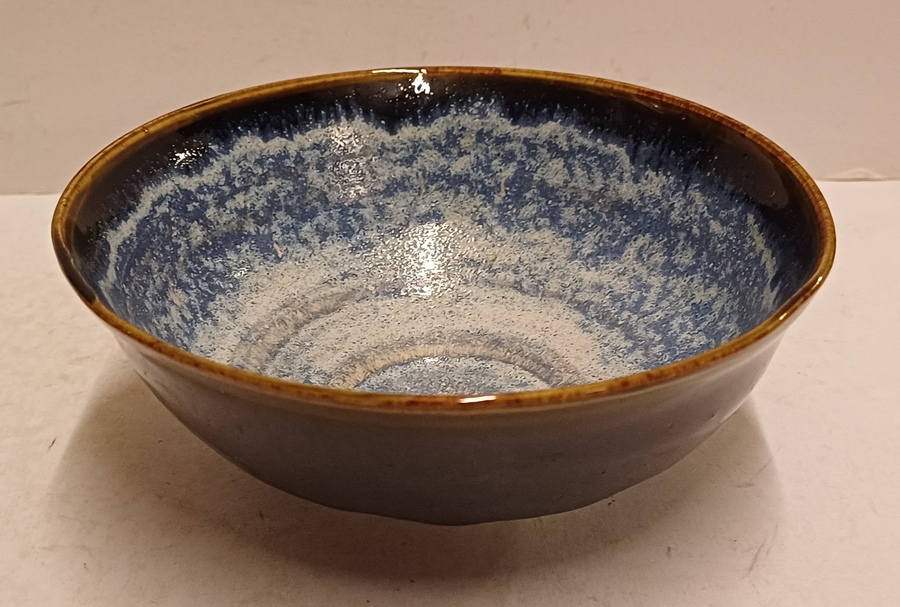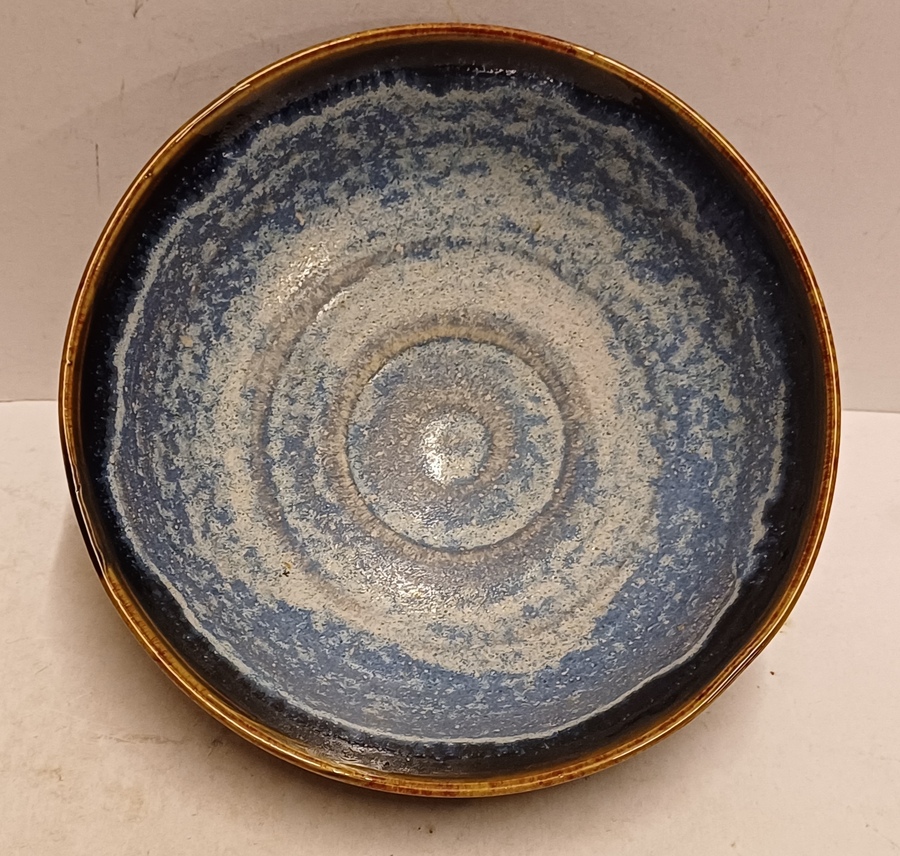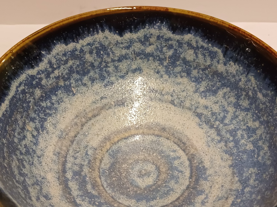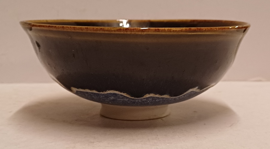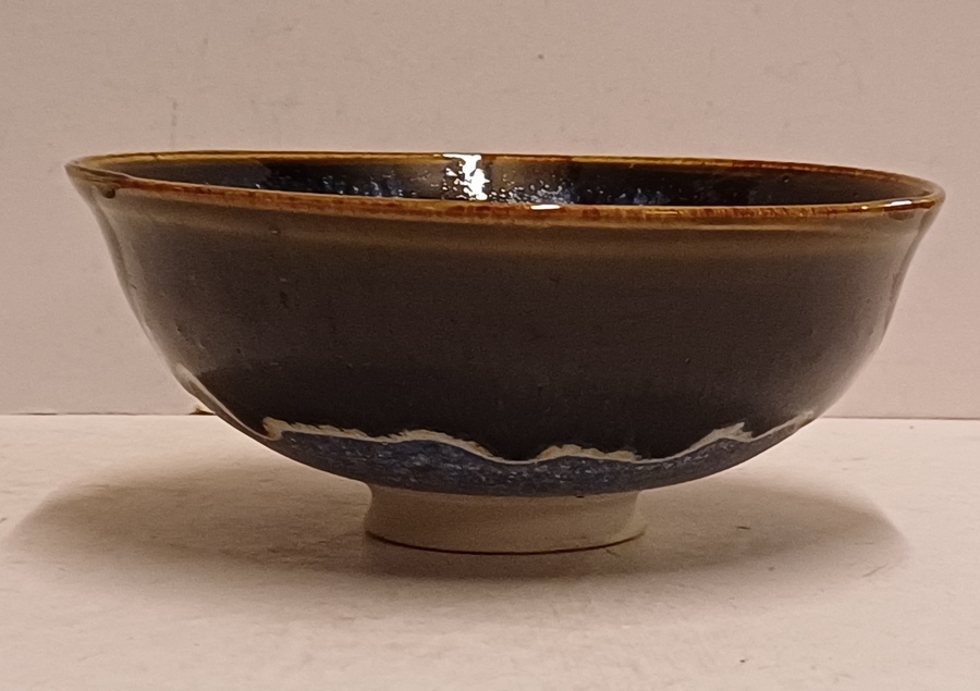 Aardewerken dun gedraaide kom met blauwe glazuur op zwarte ondergrond. Onderzijde gesigneerd en gedateerd '94.