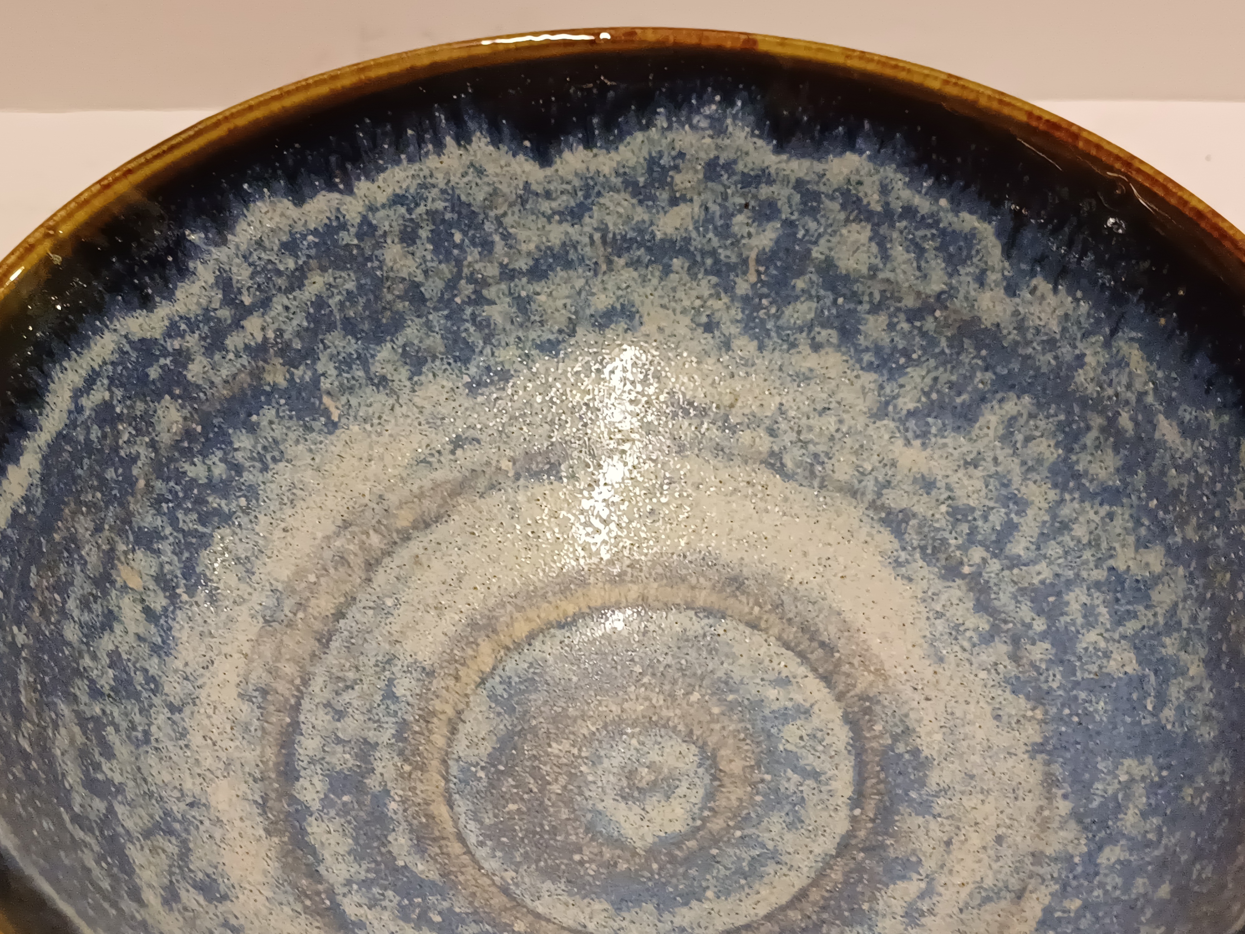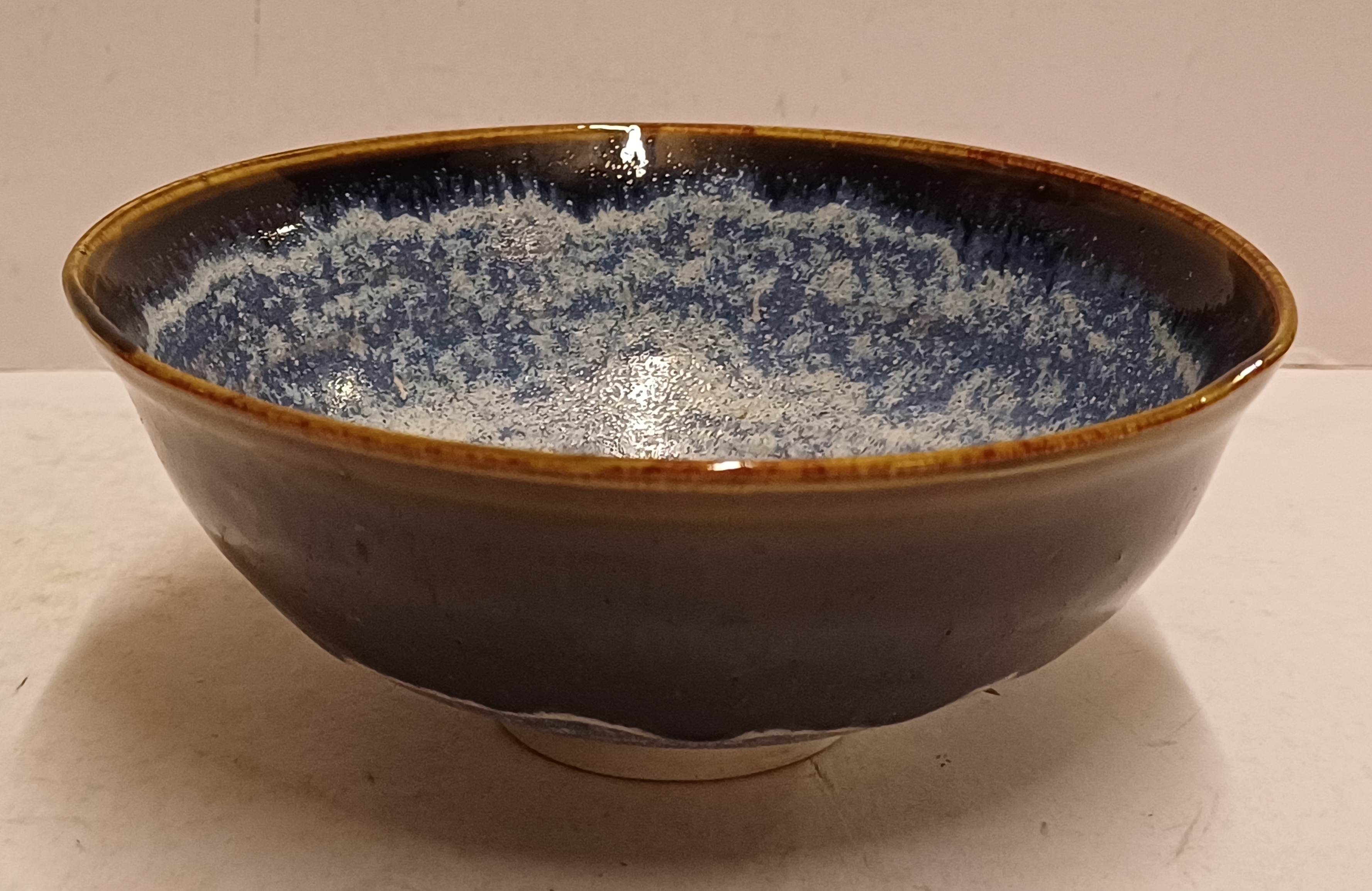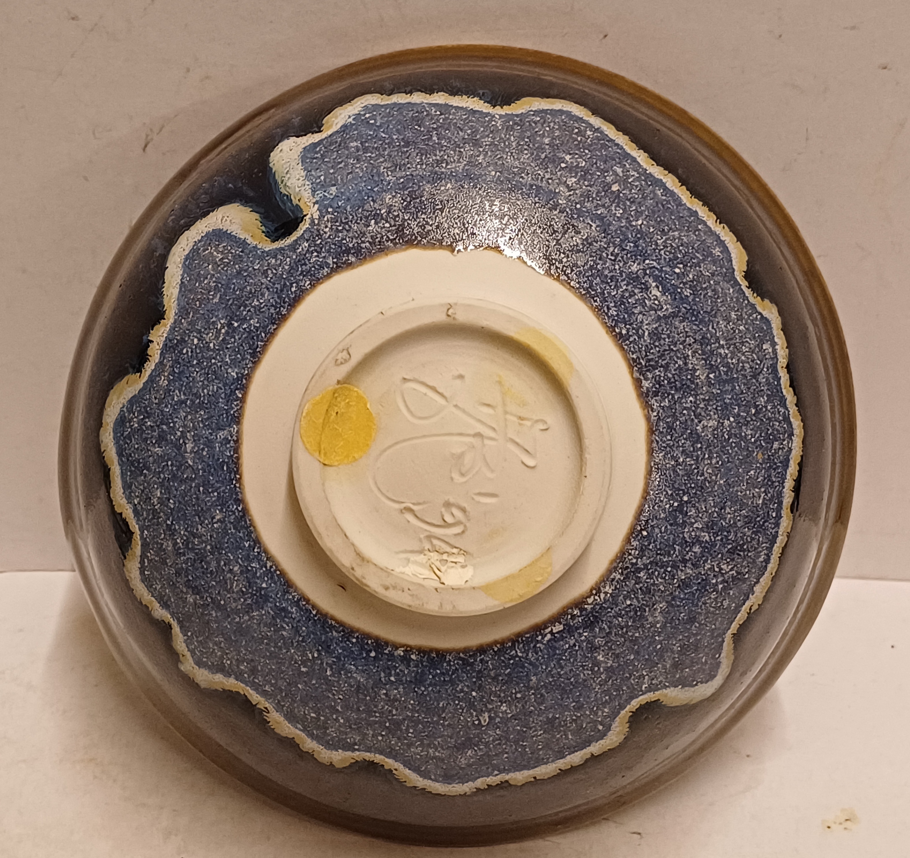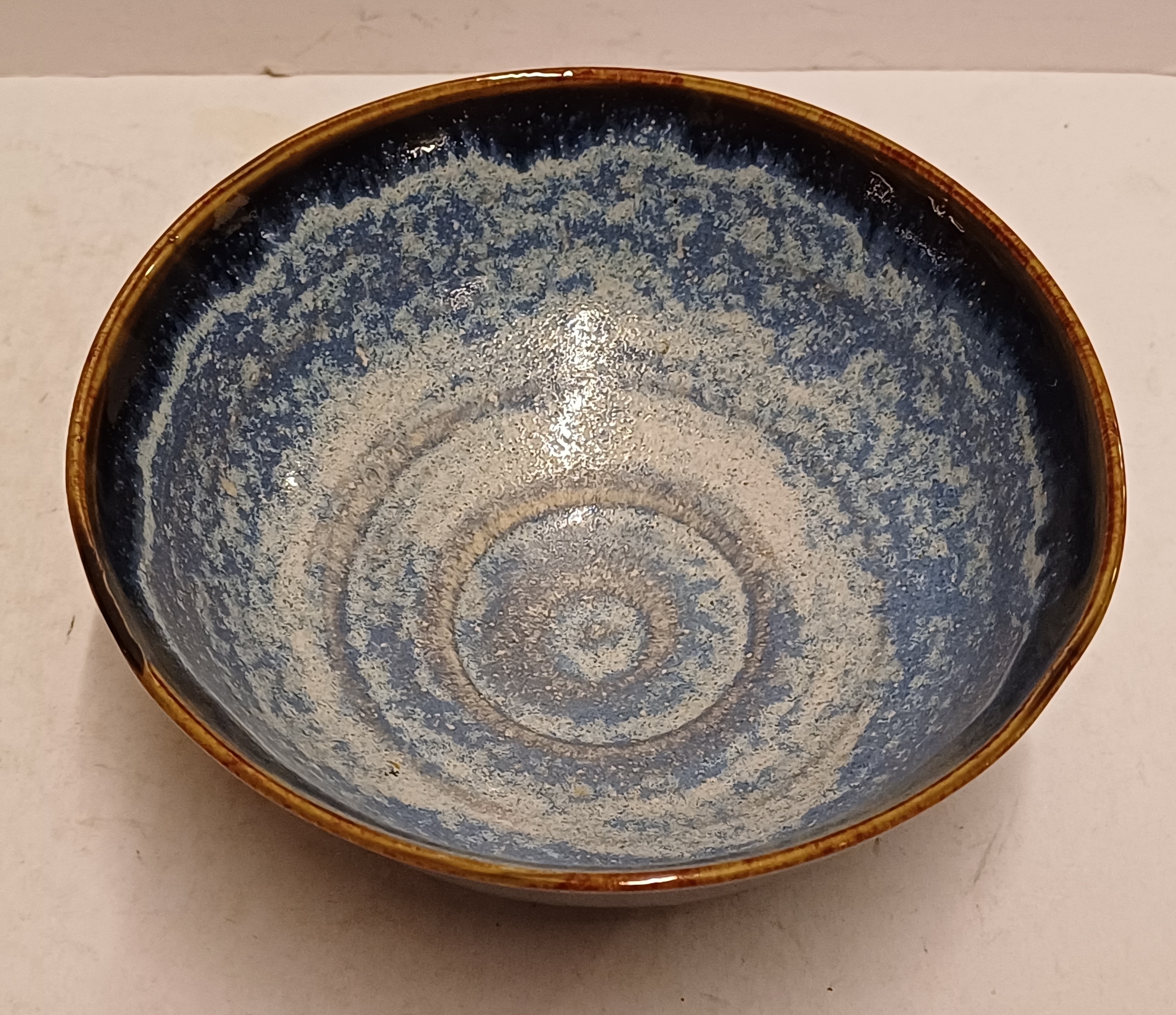 Aardewerken dun gedraaide kom met blauwe glazuur op zwarte ondergrond. Onderzijde gesigneerd en gedateerd '94.