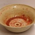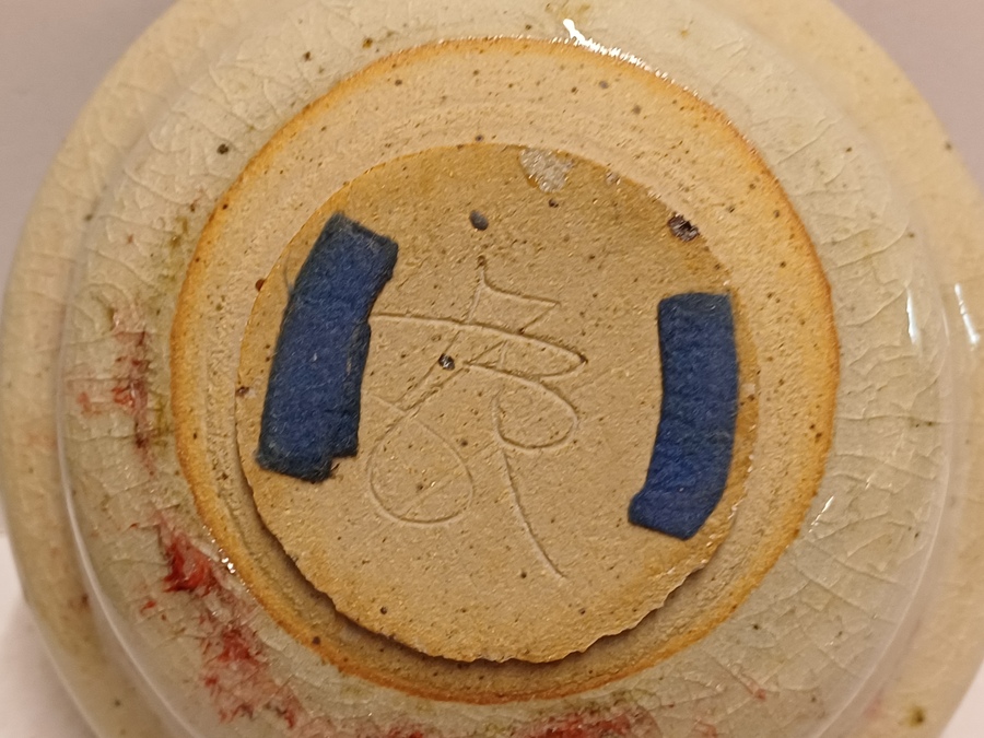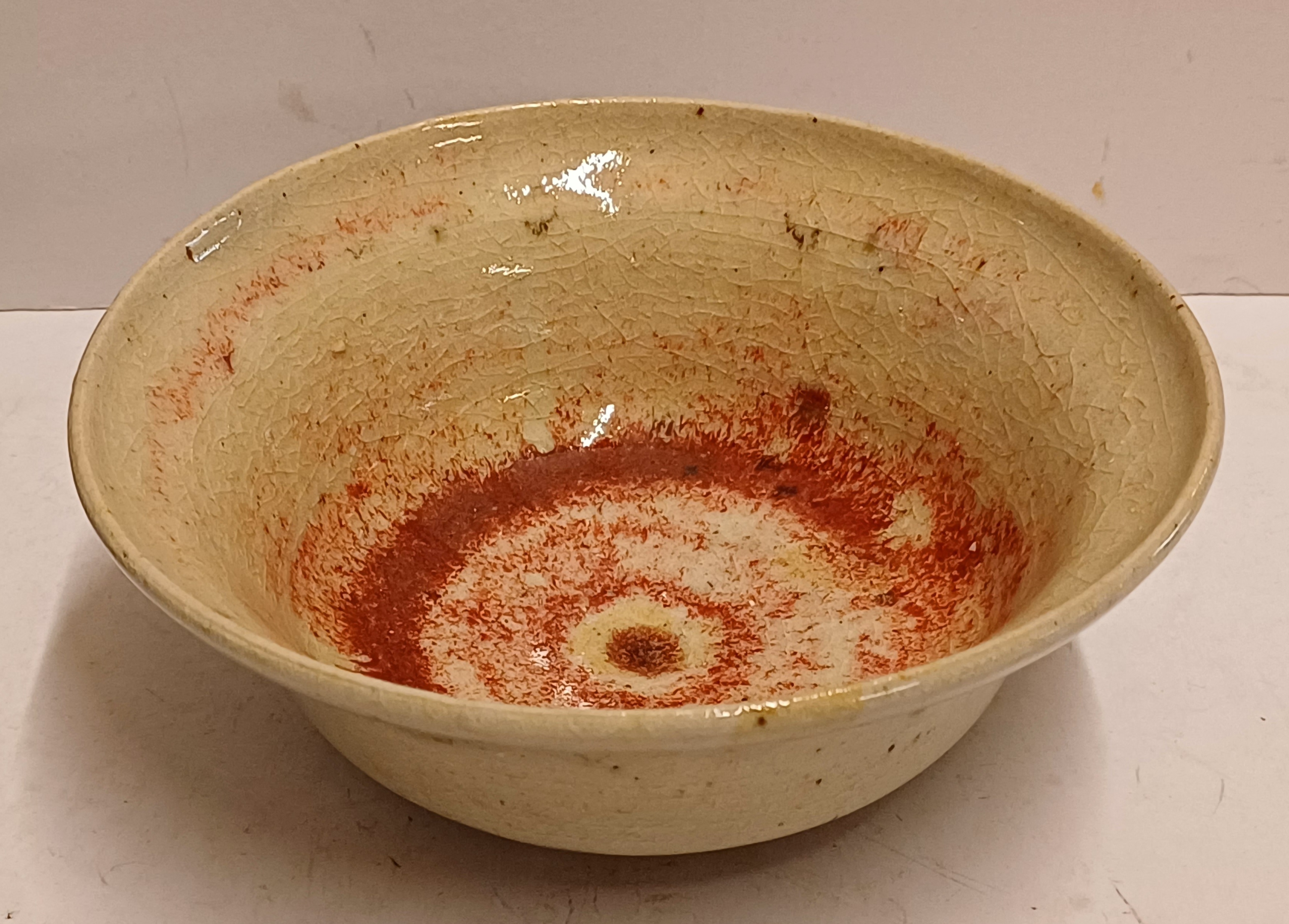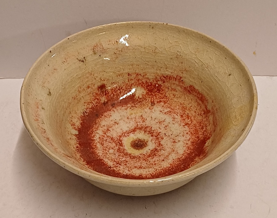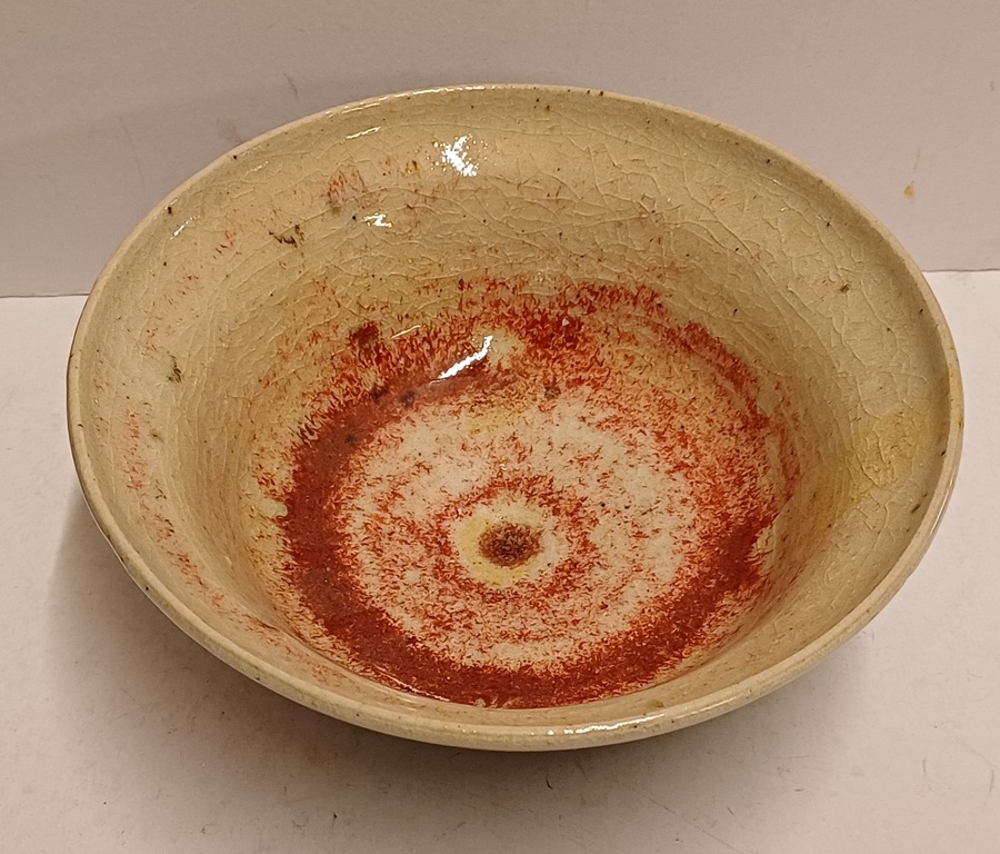 Steengoed kom met rood gevlamde glazuur op creme fond. Onderzijde met signatuur.
