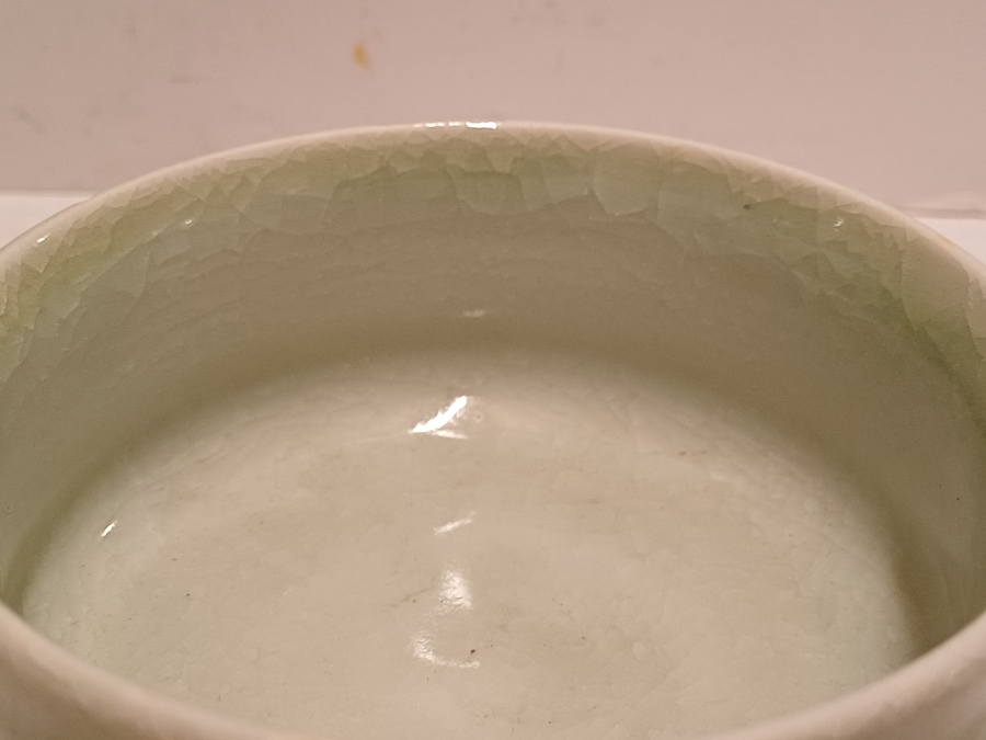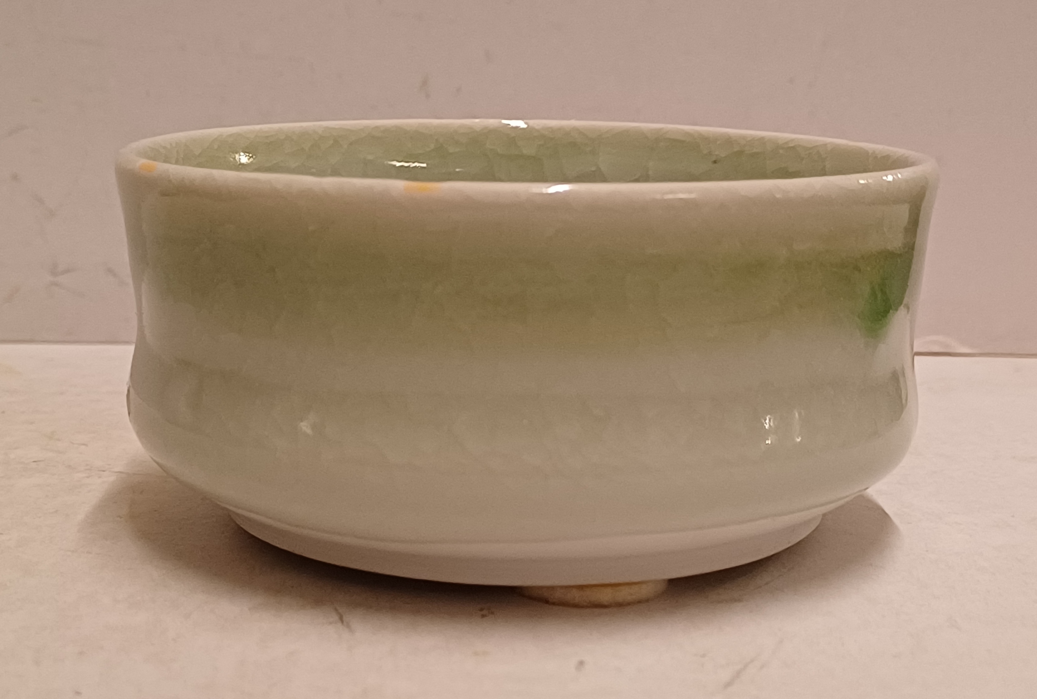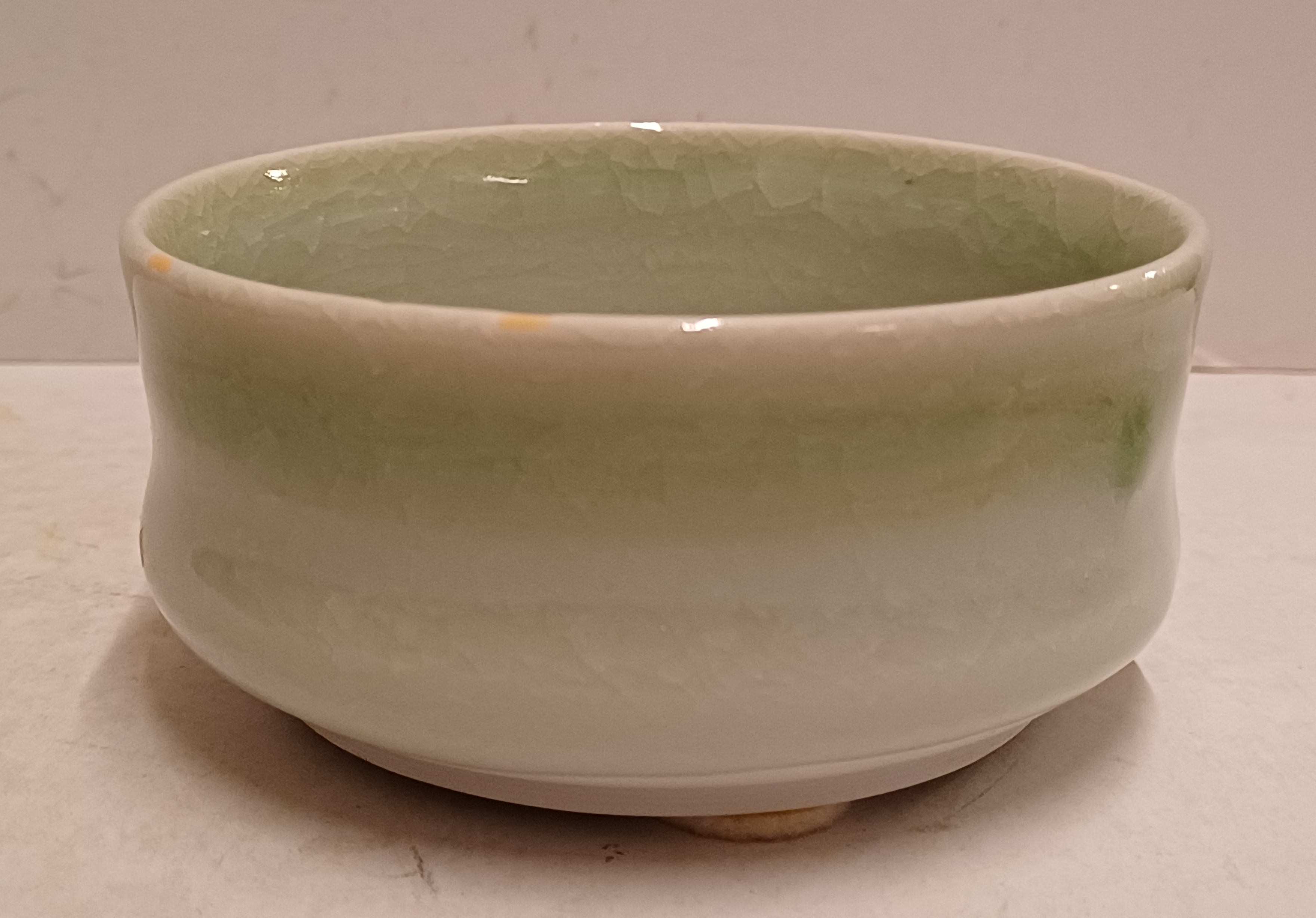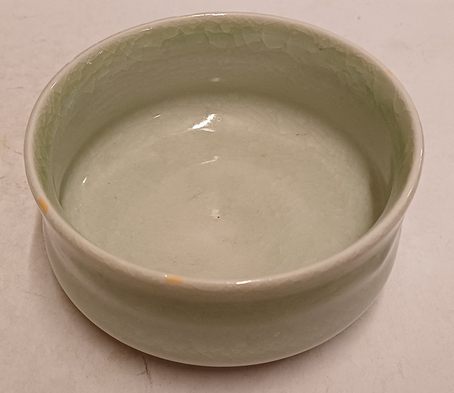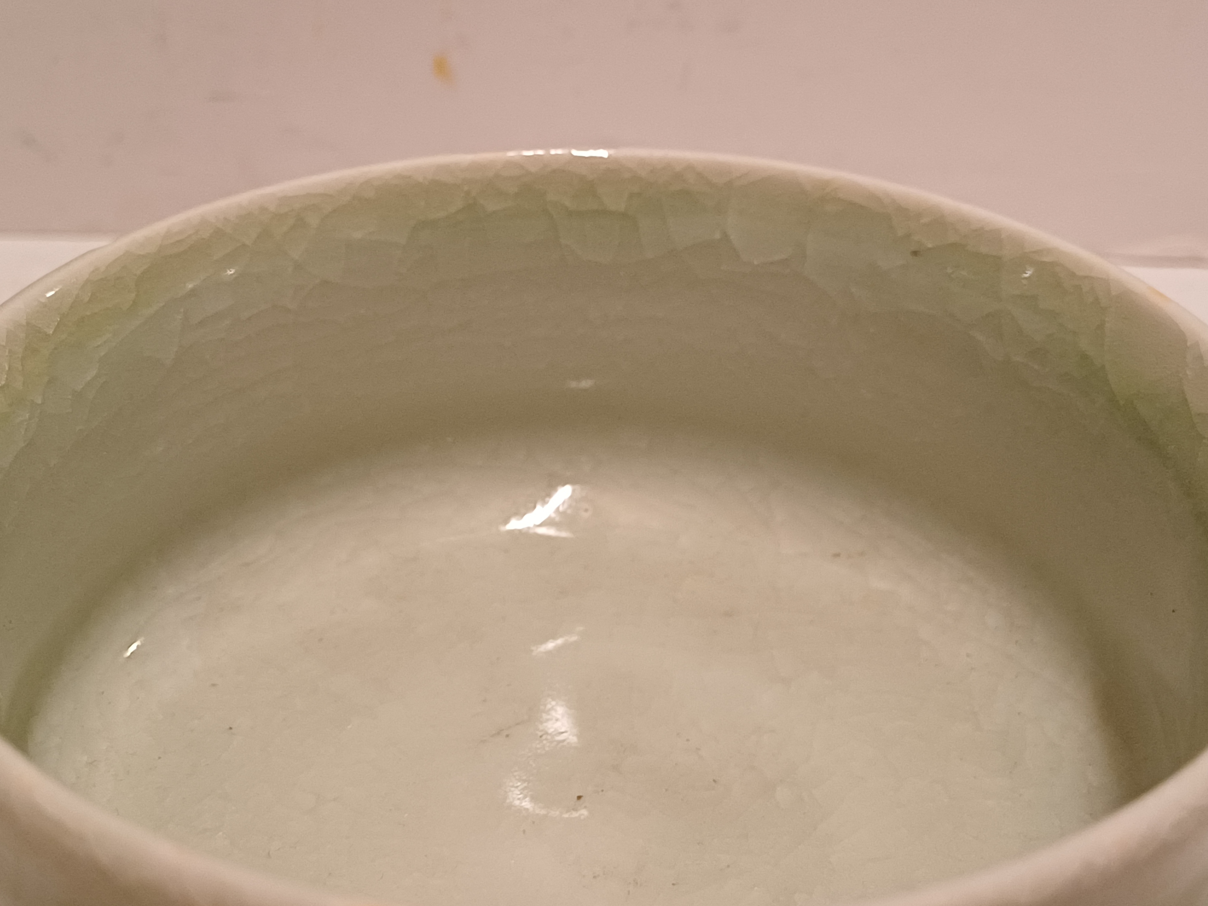 Kom met fijne licht groene celadon glazuur. Onderzijde gesigneerd en gedateerd 2008.