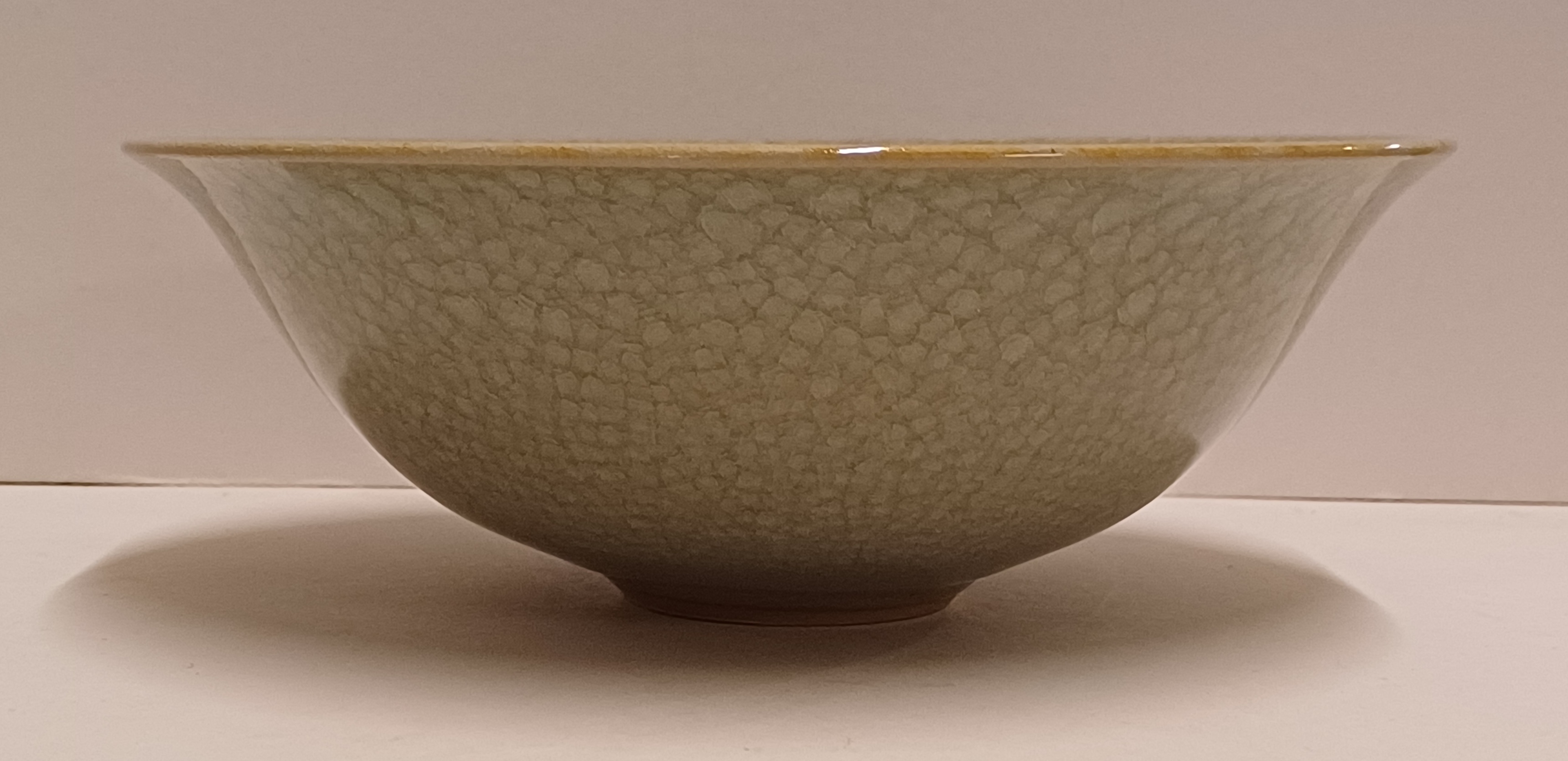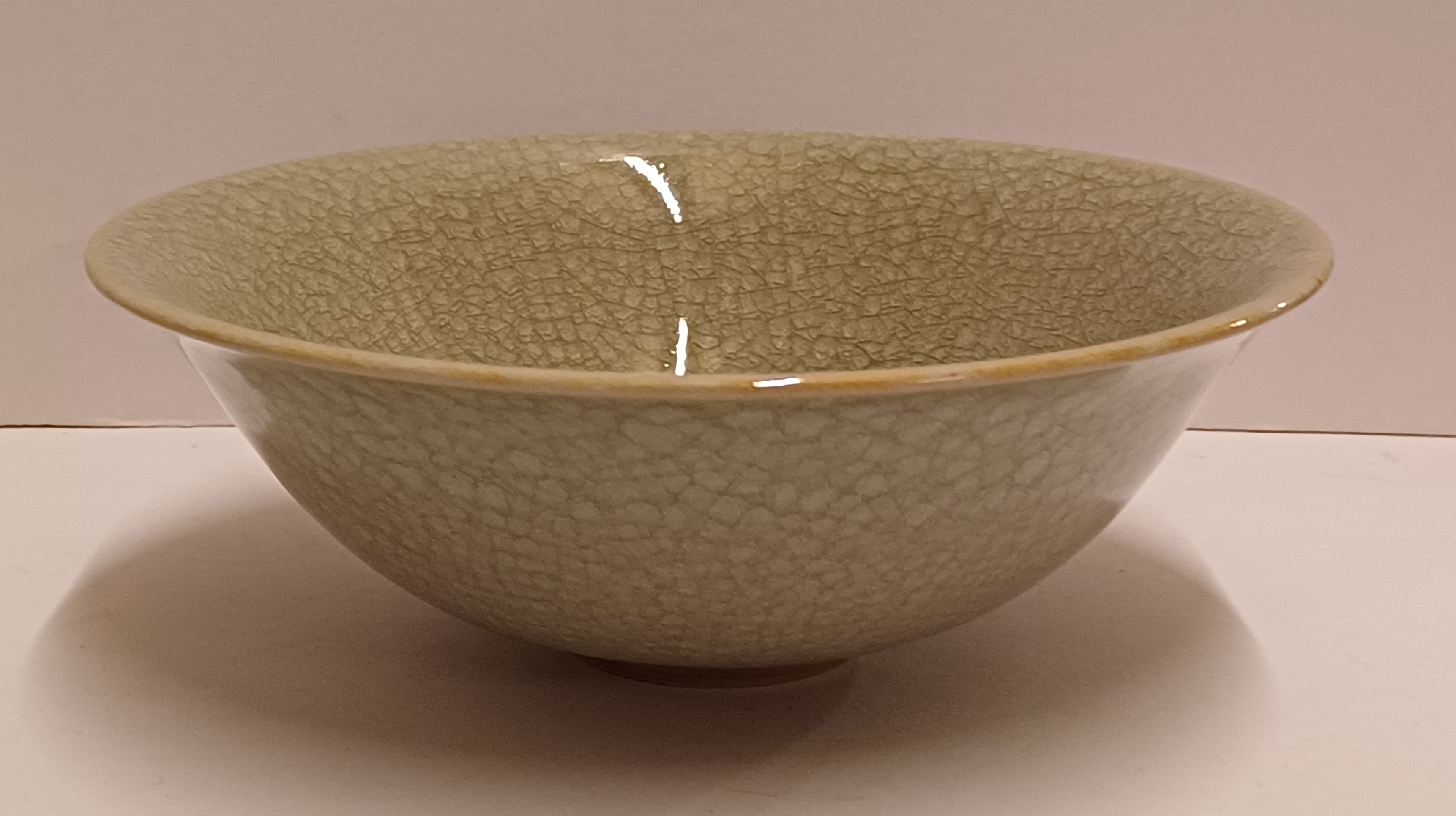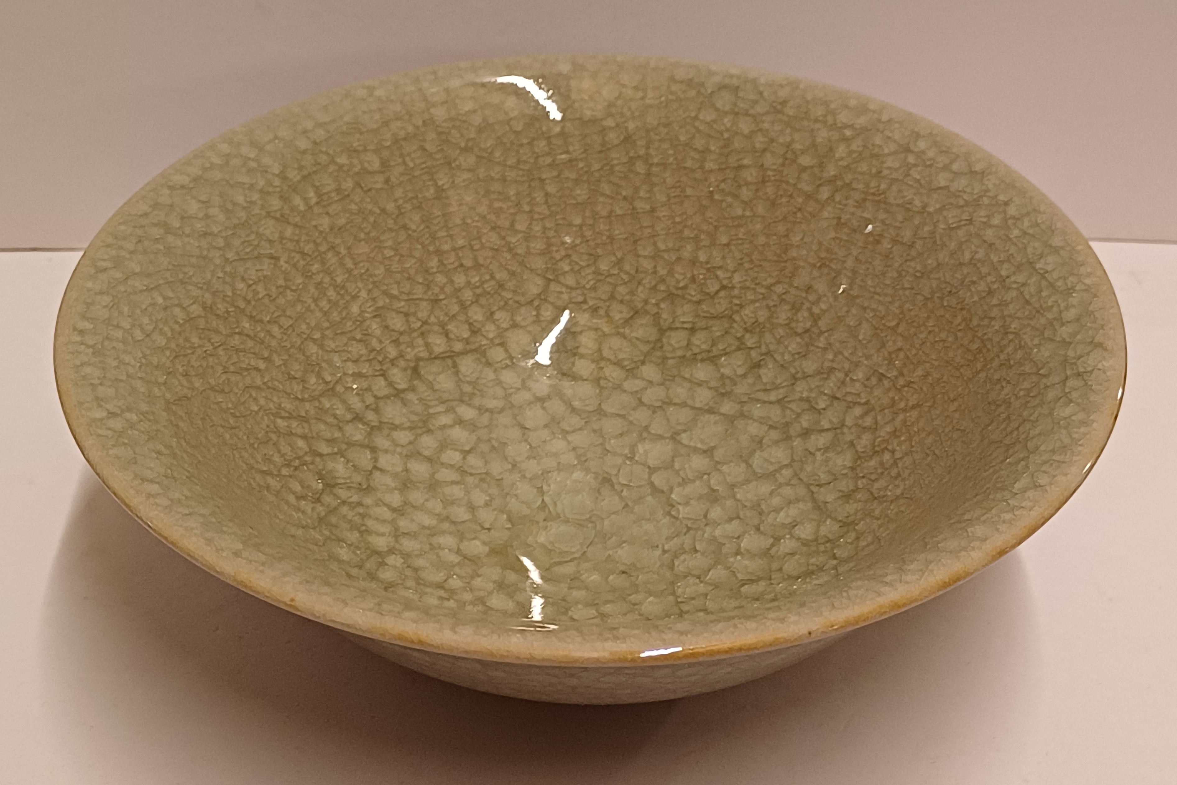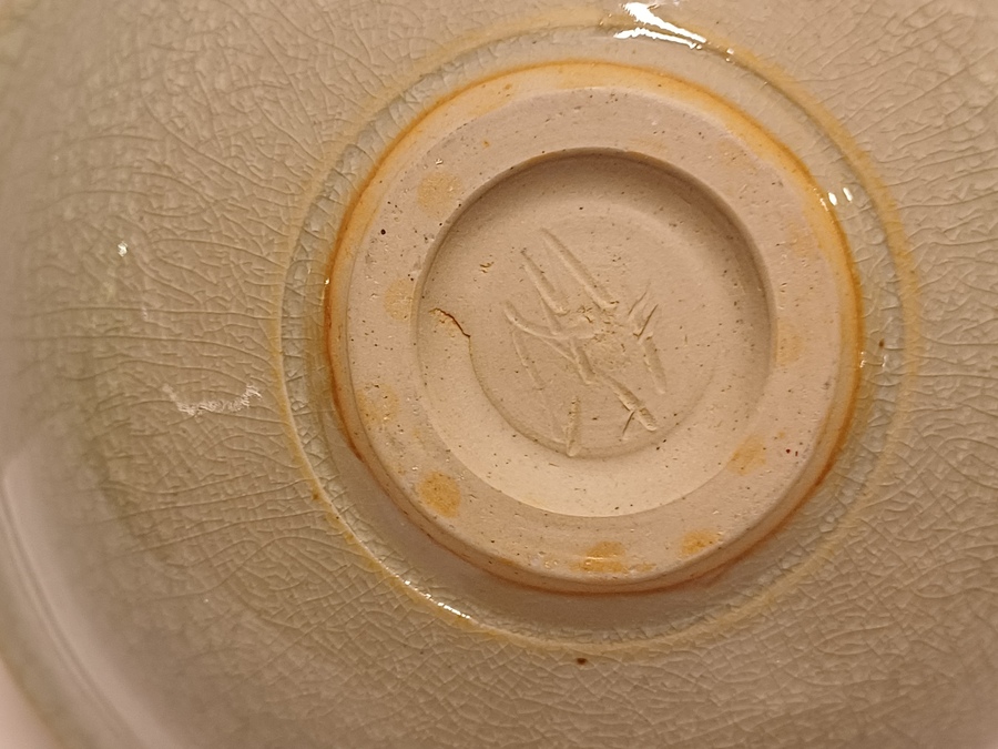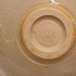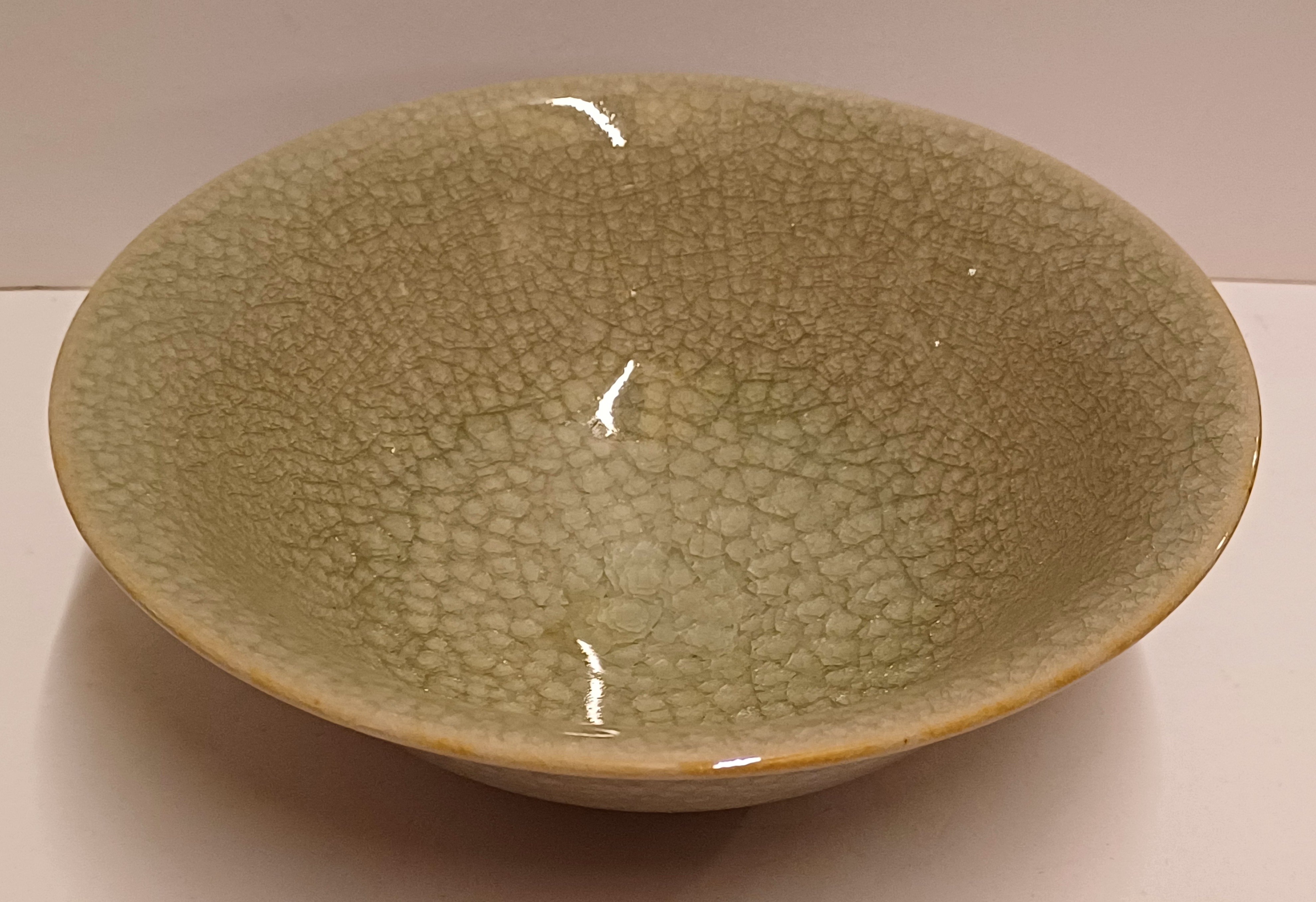 Steengoed schaal met fijne groene celadon glazuur. Onderzijde met monogram.