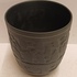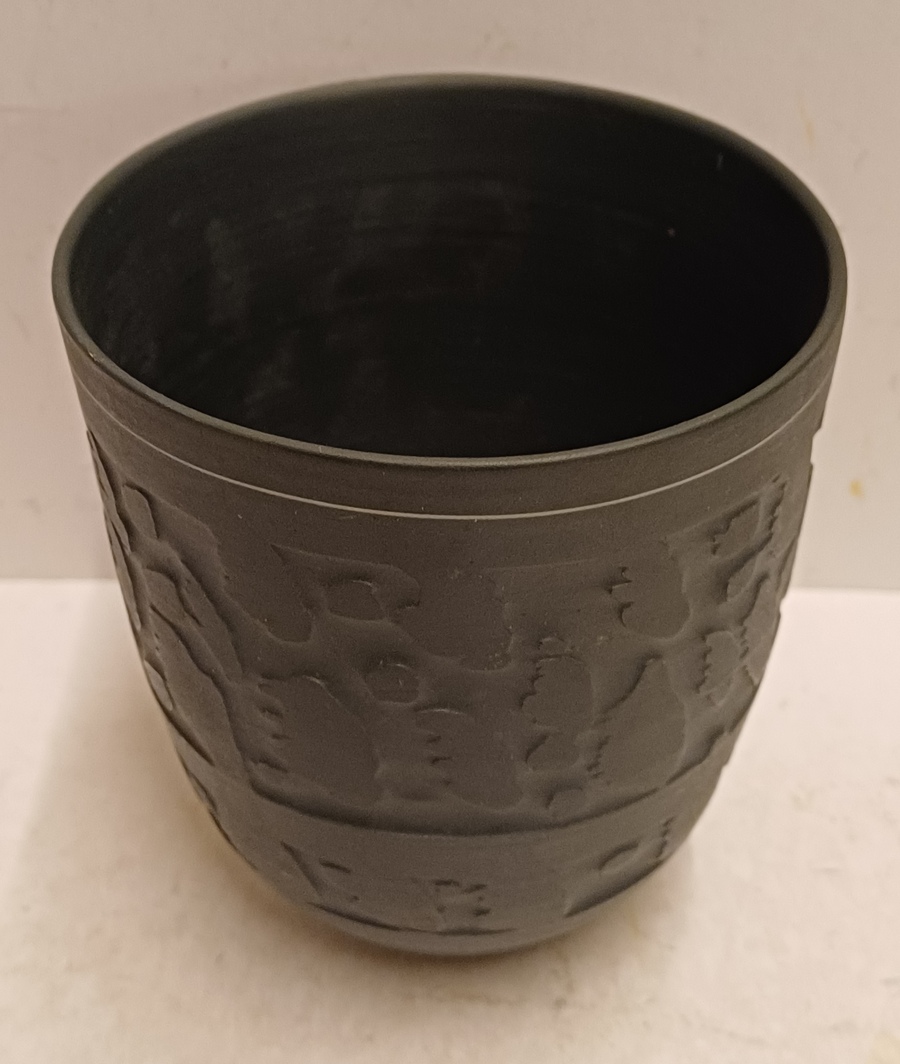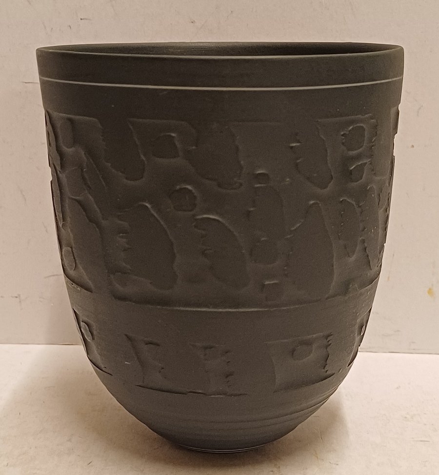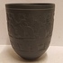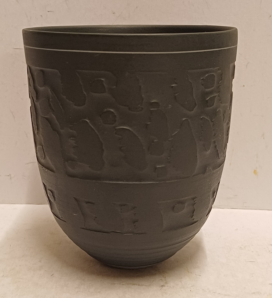 Zwarte steengoed kom met uitgespaard repeterend decor. Onderzijde met signatuur.