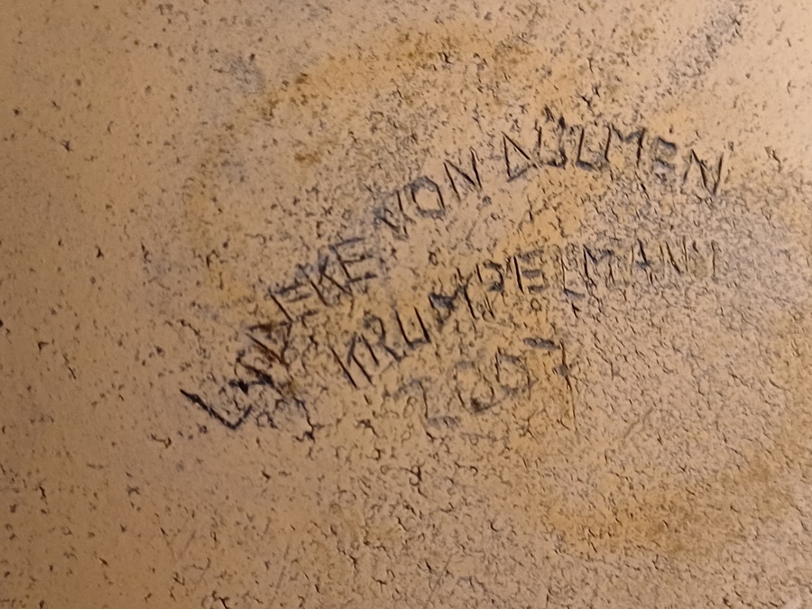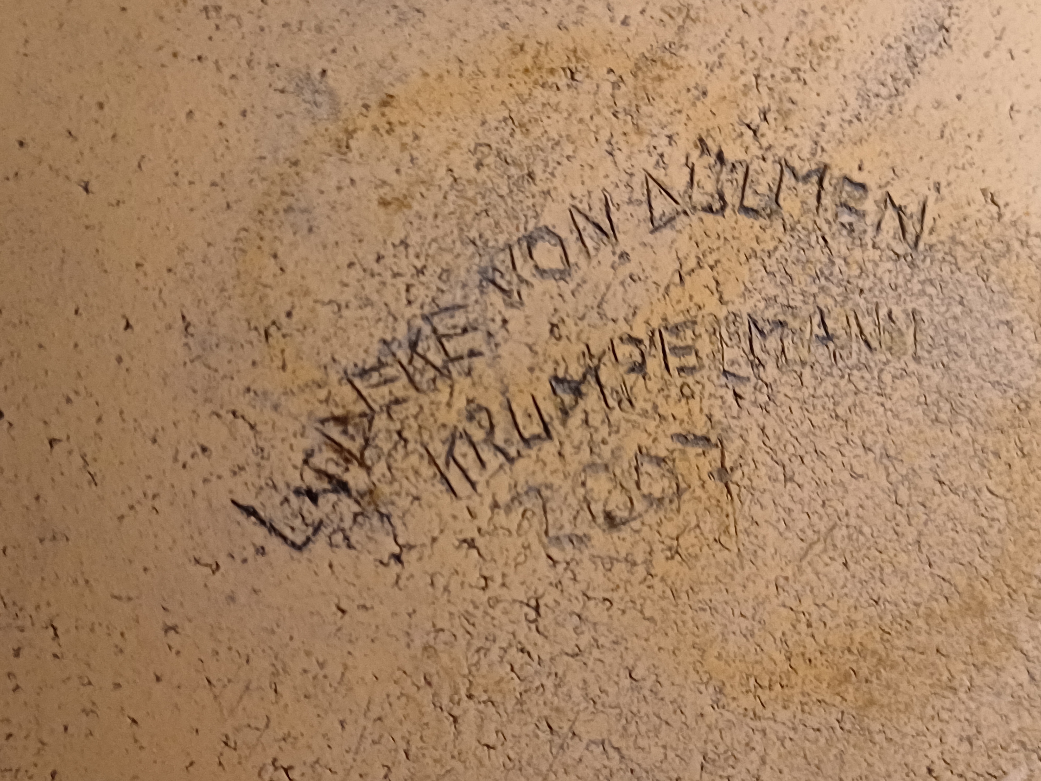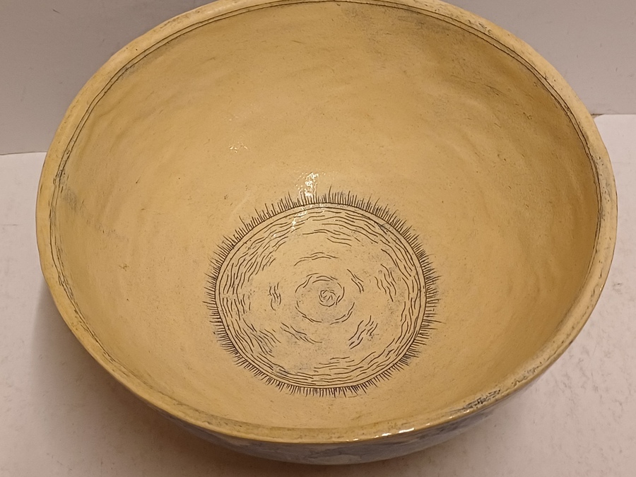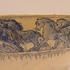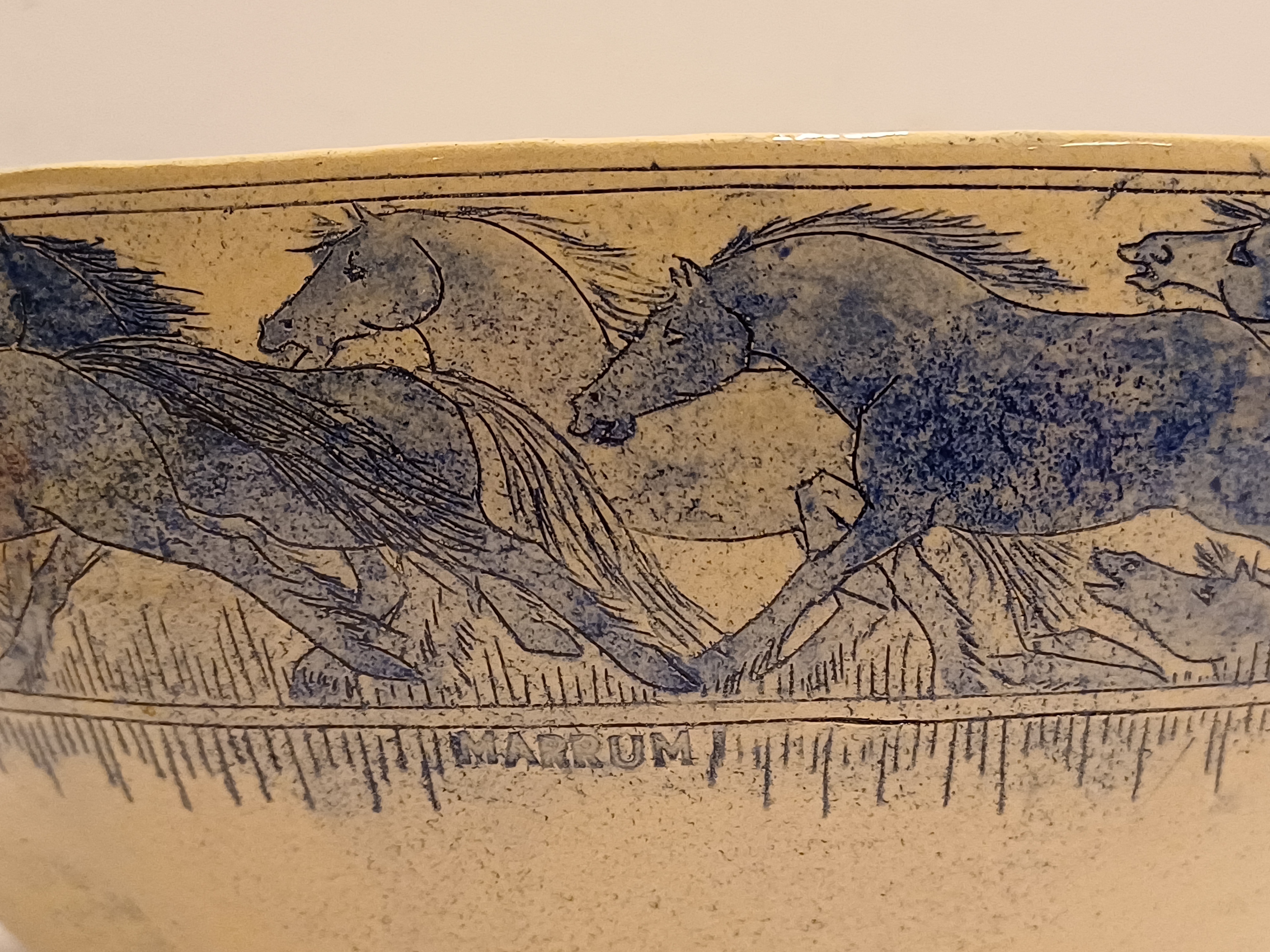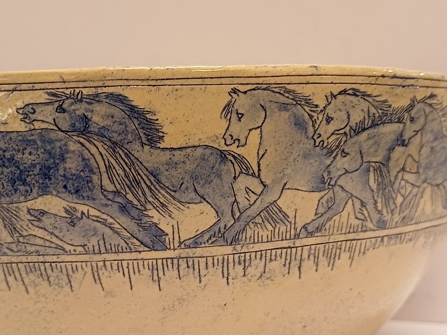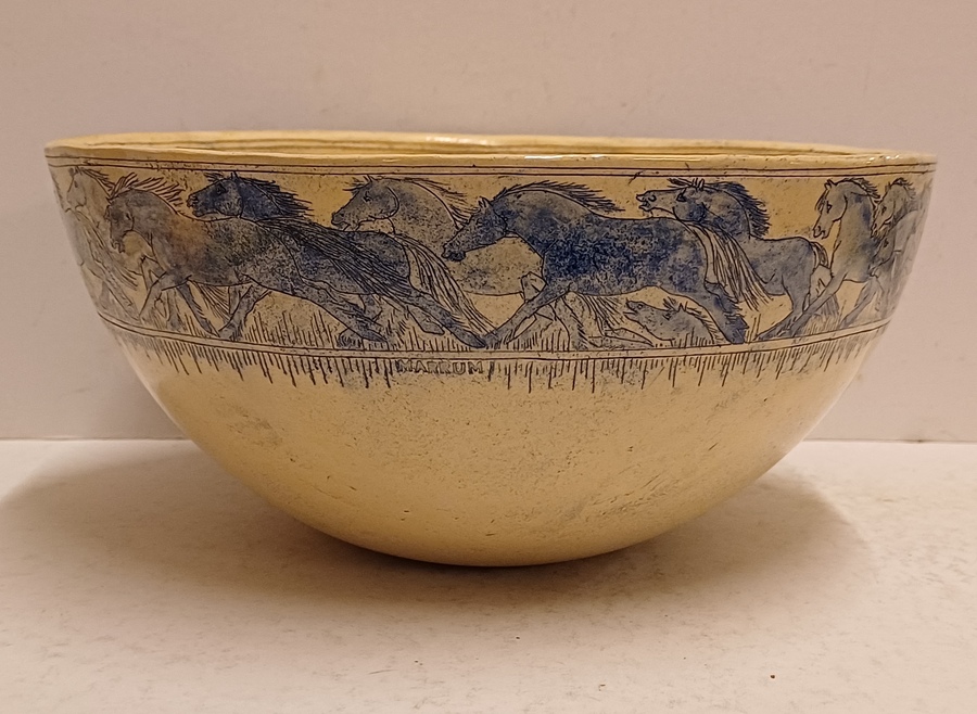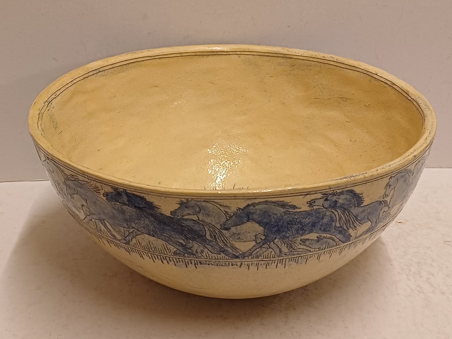 Aardwerken handgevormde kom, met decor van een horde paarden. Onderzijde gesigneerd.