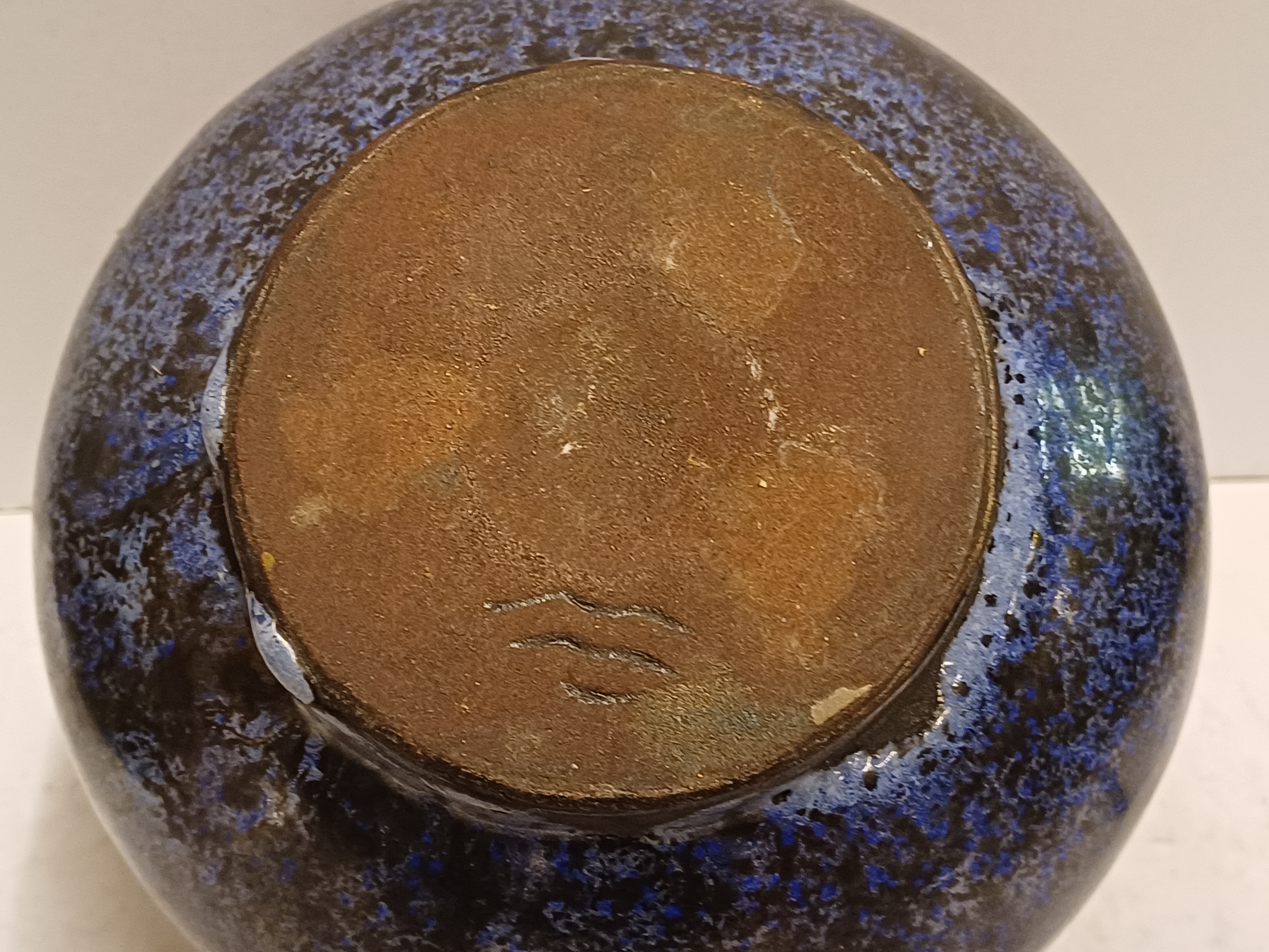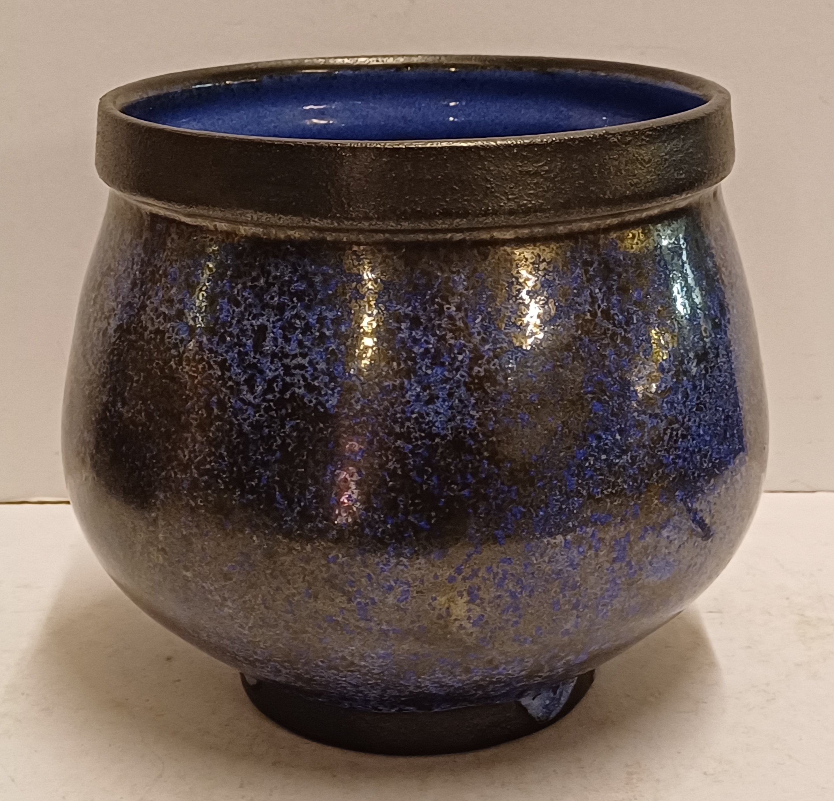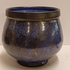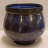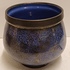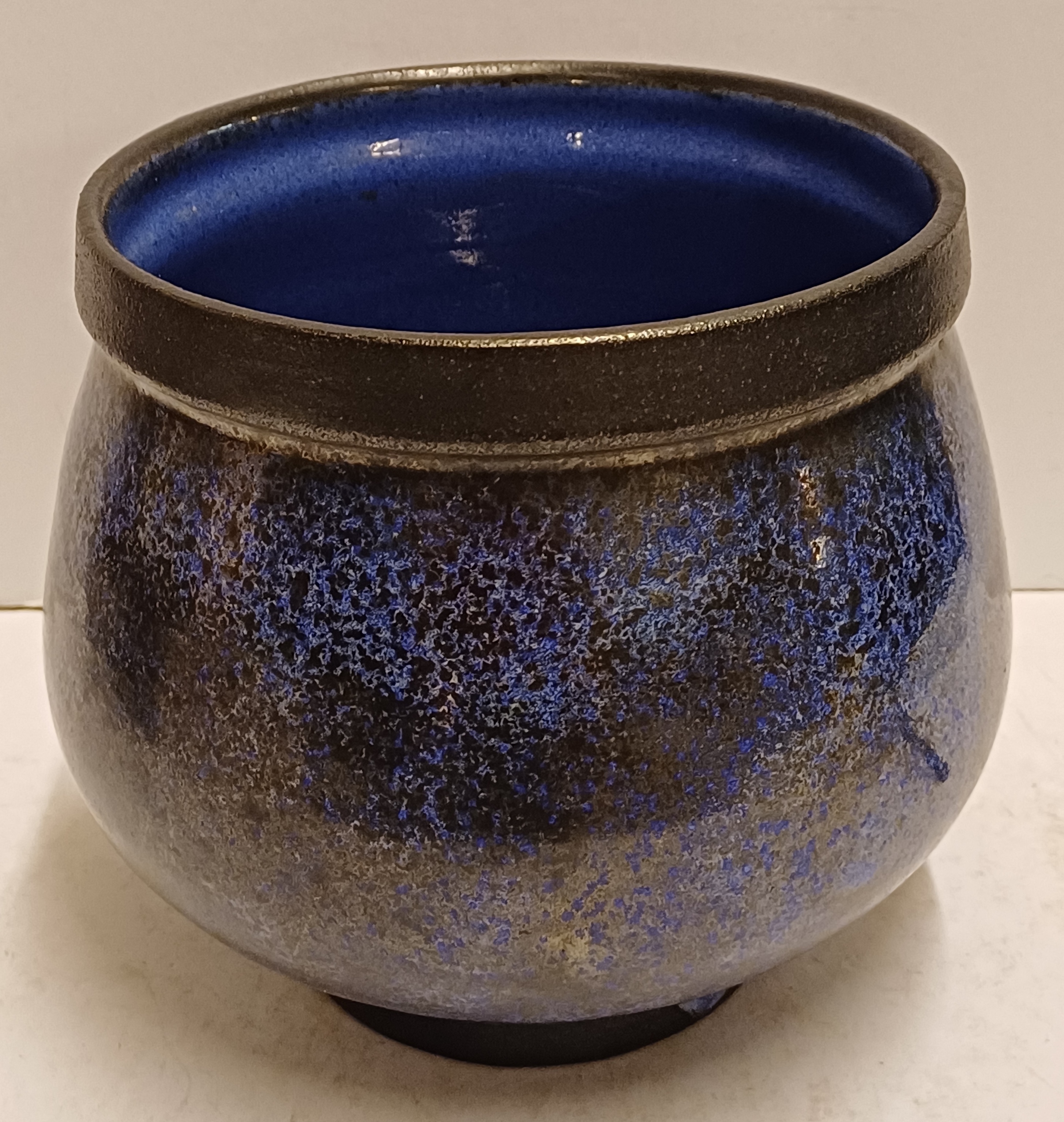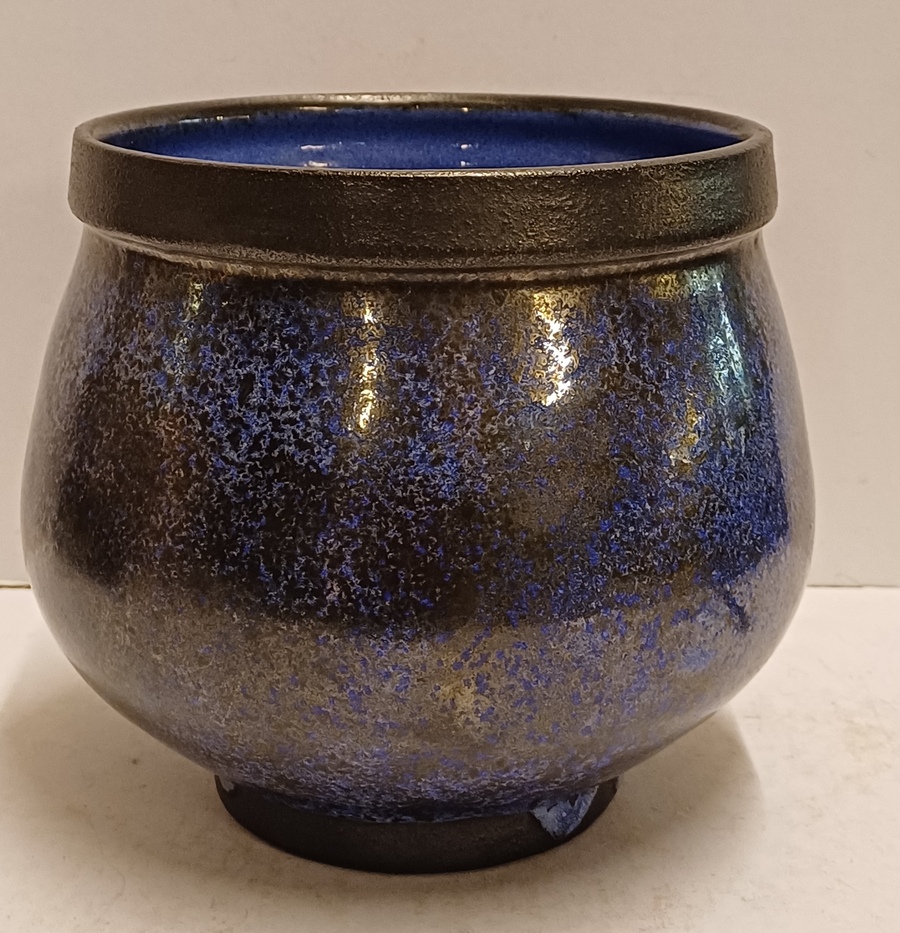 Aardewerken kom met blauwe glazuur met zwarte spikkels met zwarte bovenrand. Onderzijde met kunstenaars monogram.