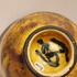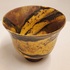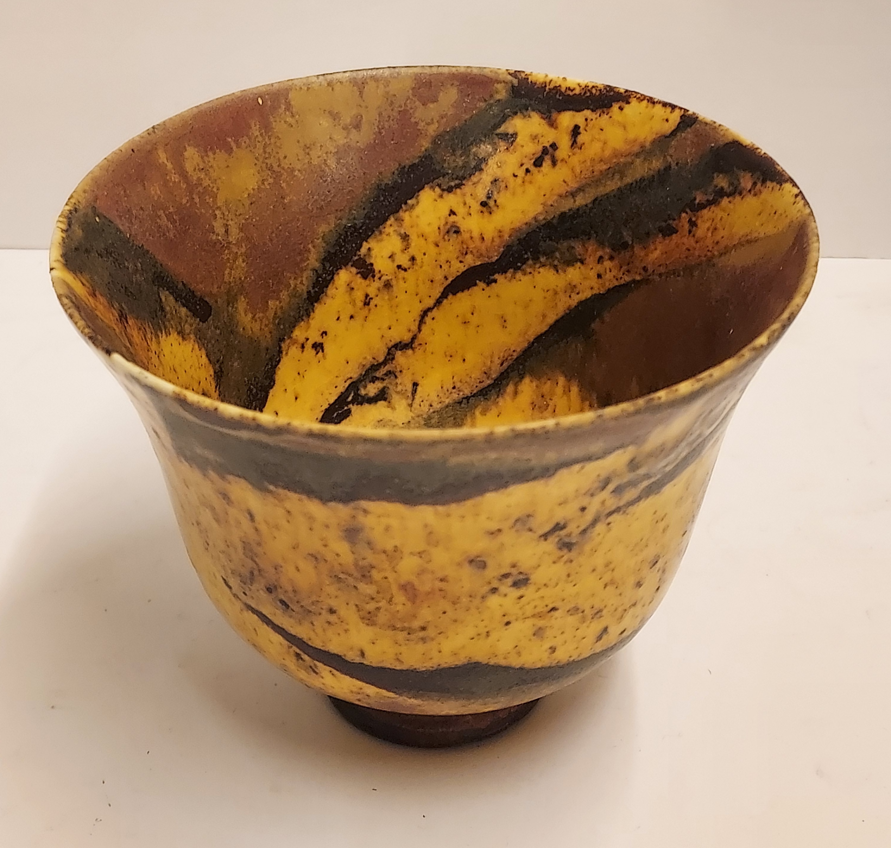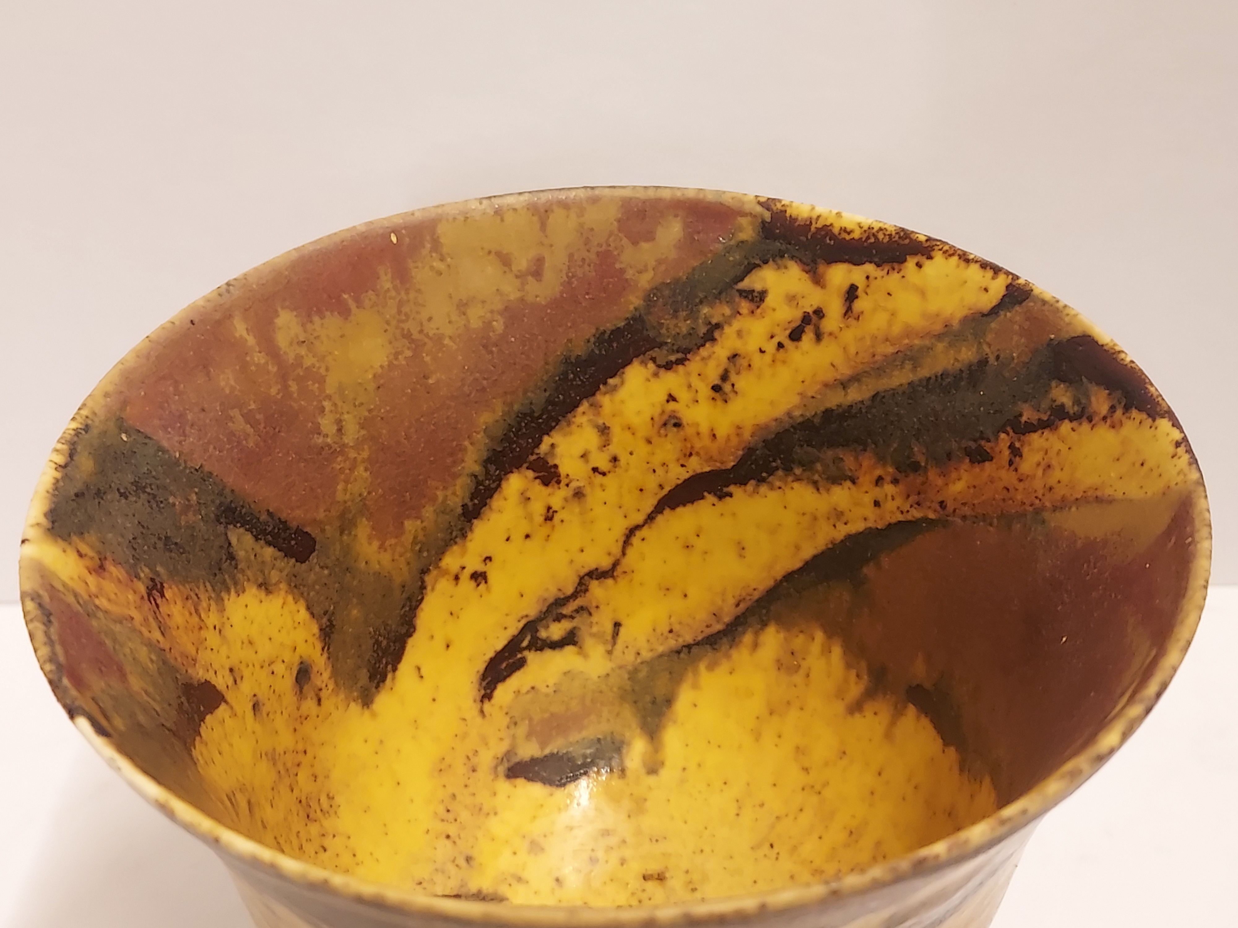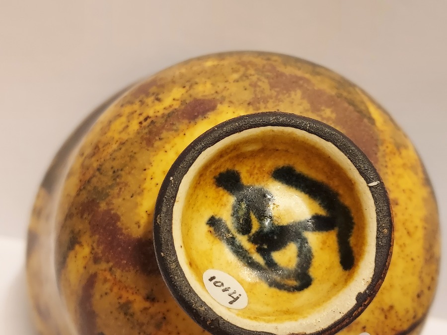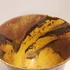 Aardewerken klokvormige kom met gebatikte decoratie. Onderzijde met signatuur.