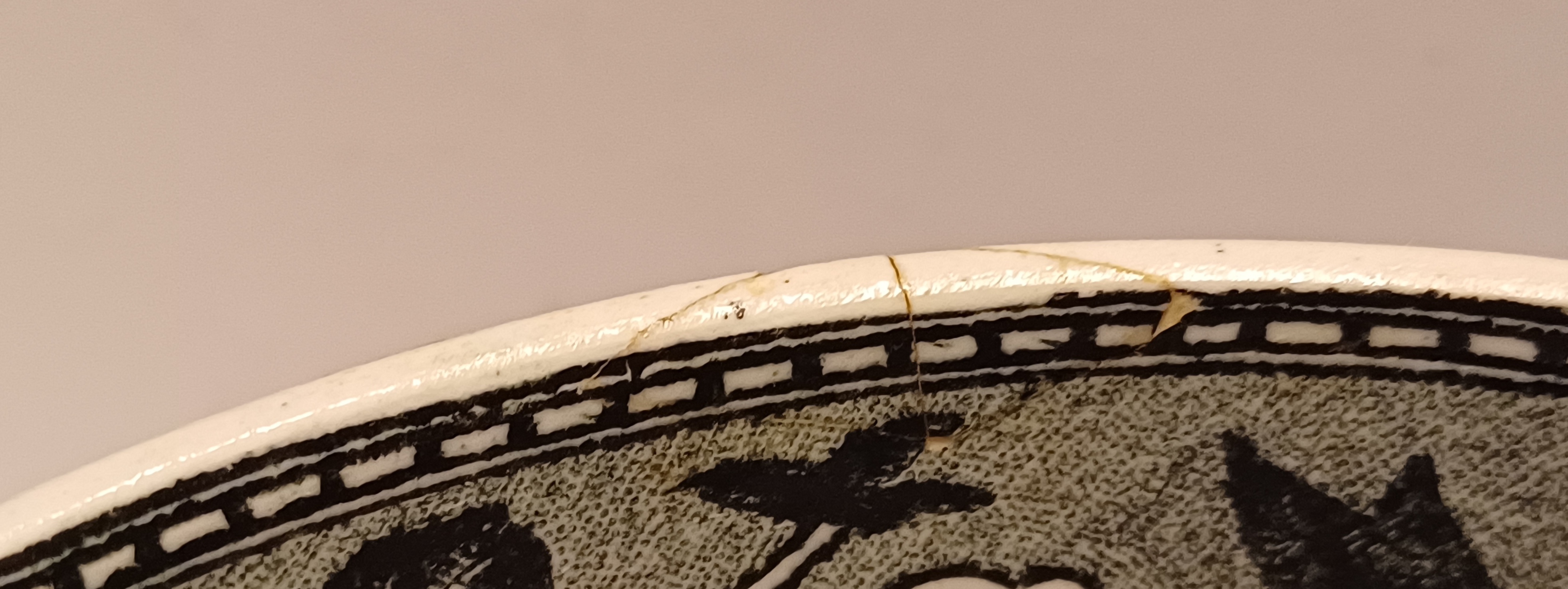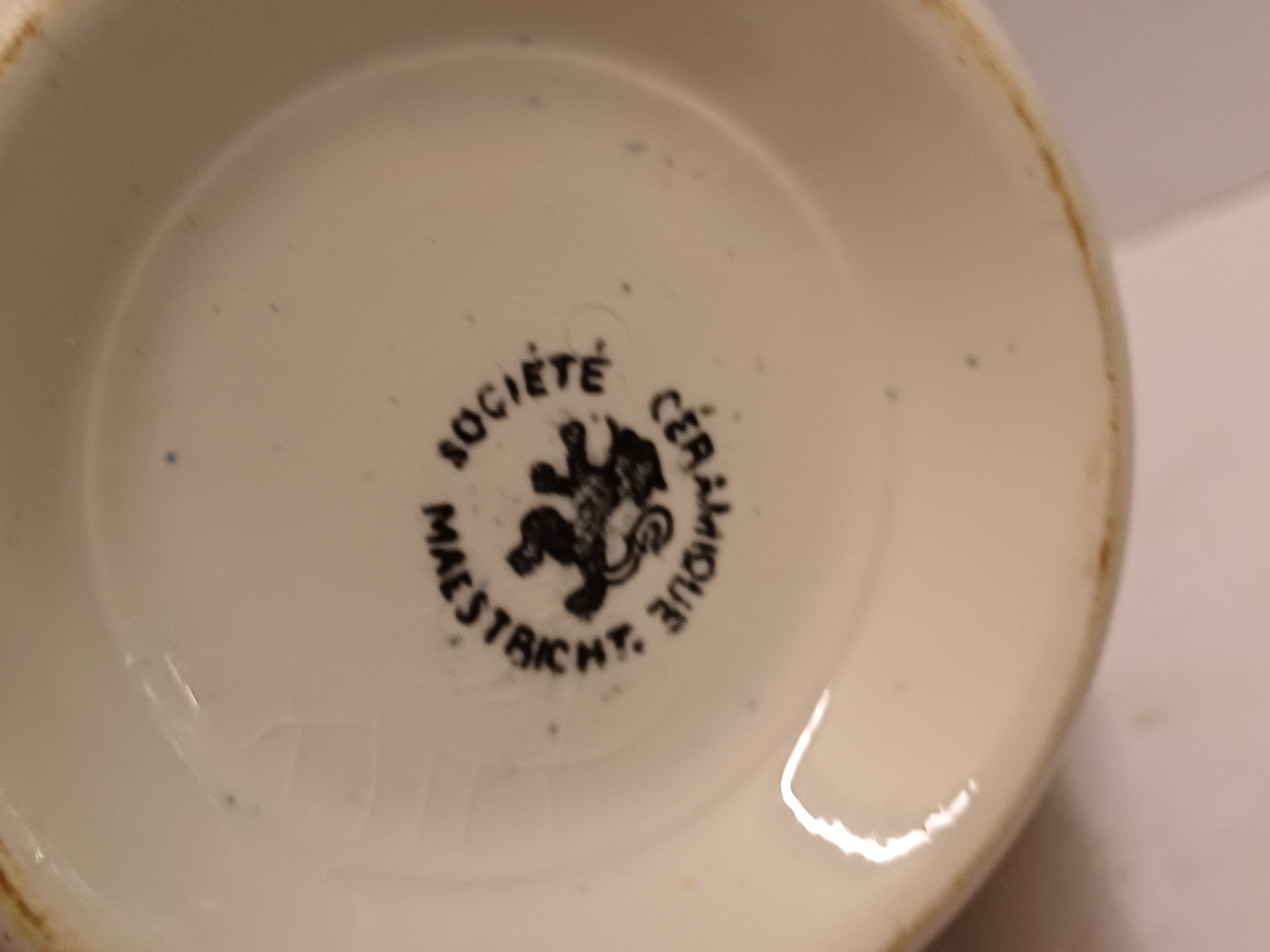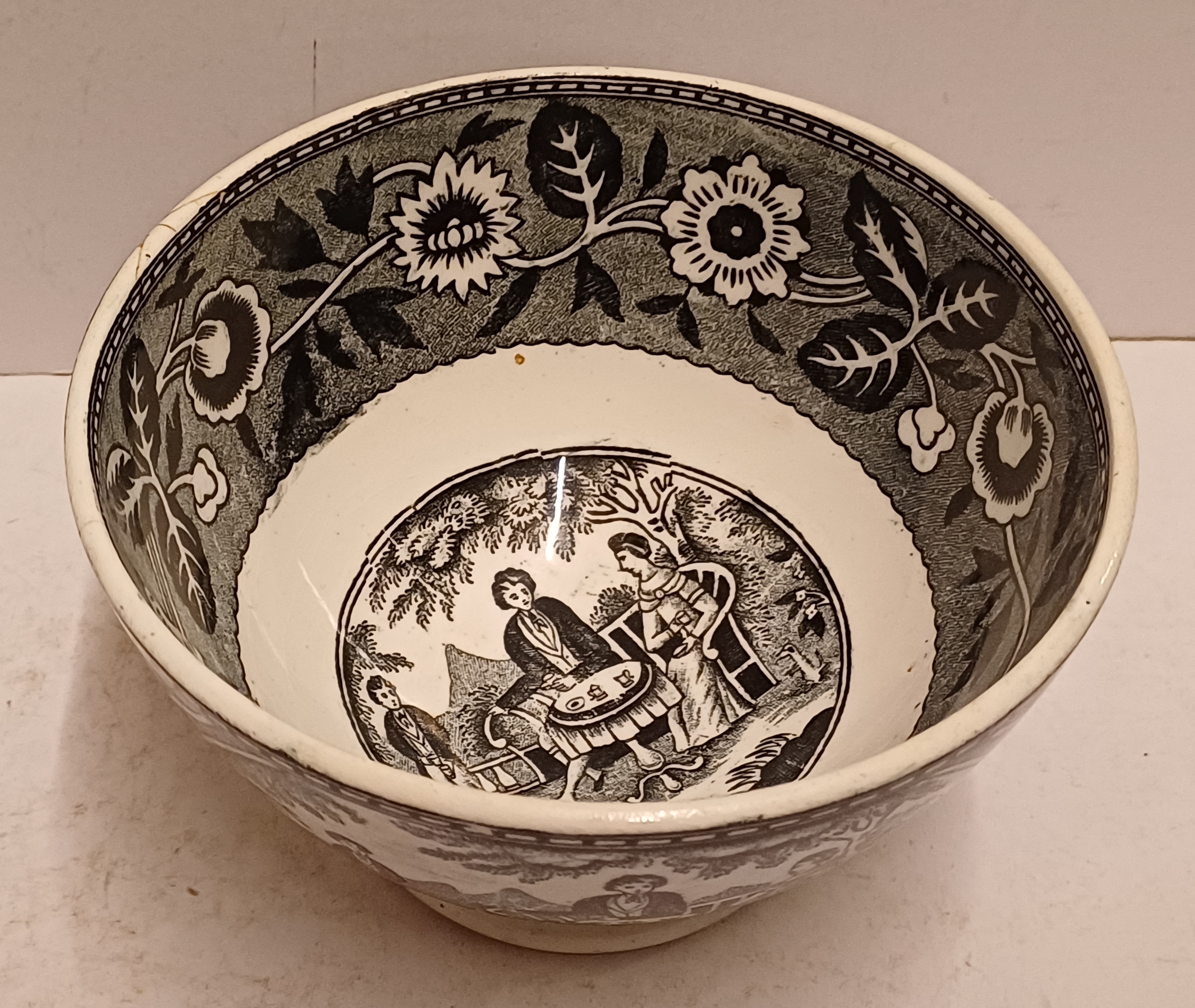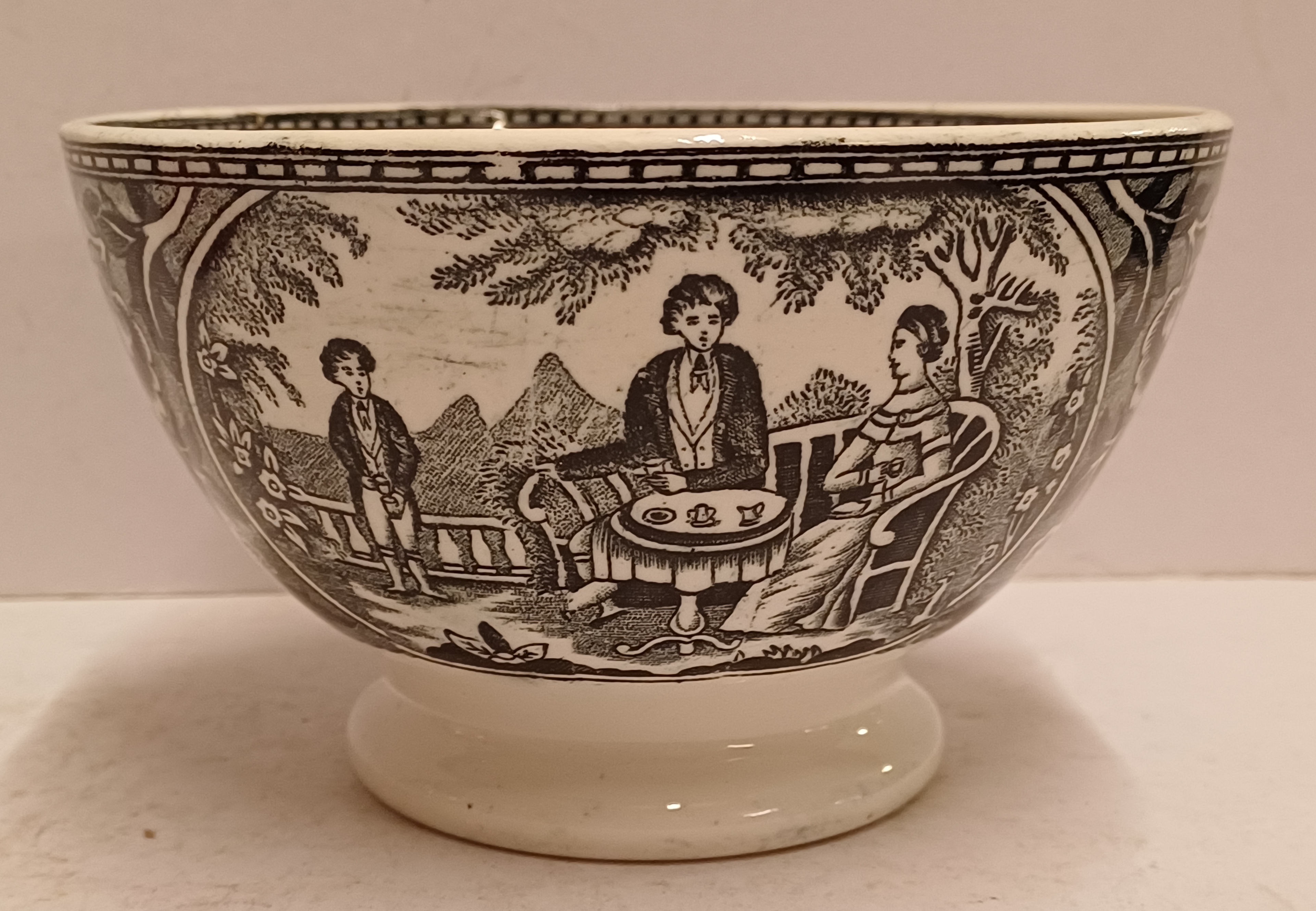 Aardewerken kom met zwarttransfer decor Tea Drinker. Uitvoering Societe Ceramique Maastricht.