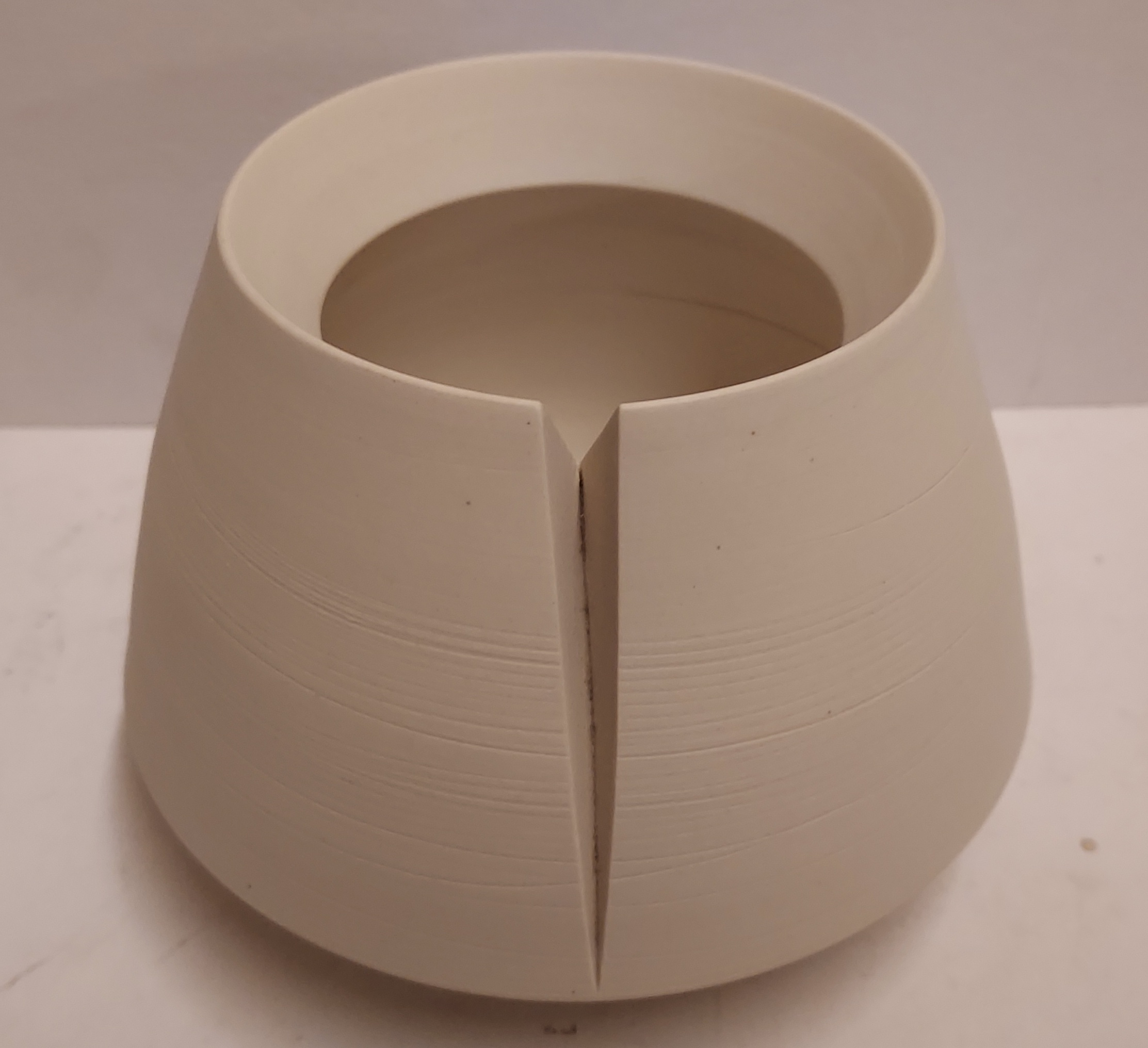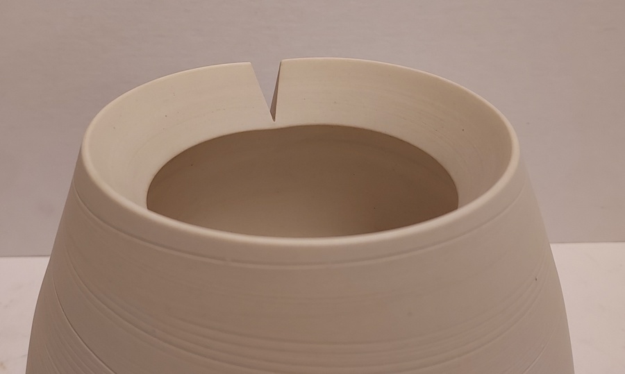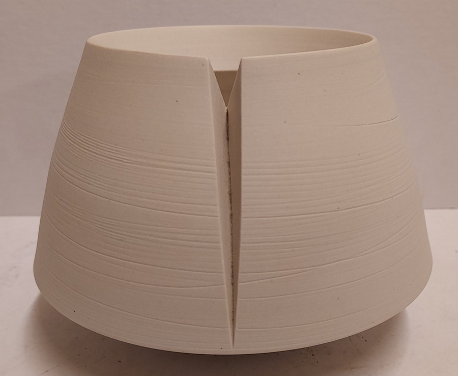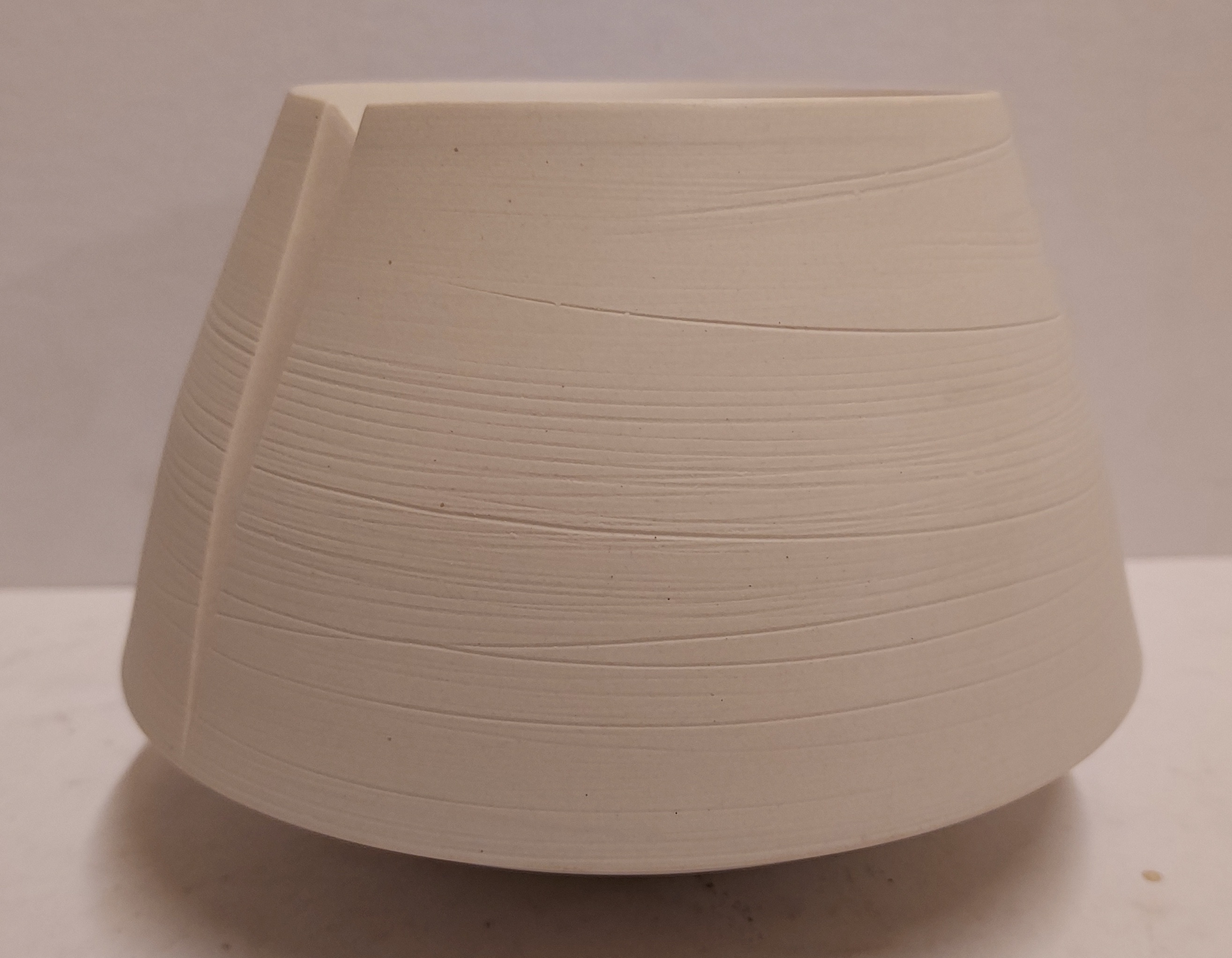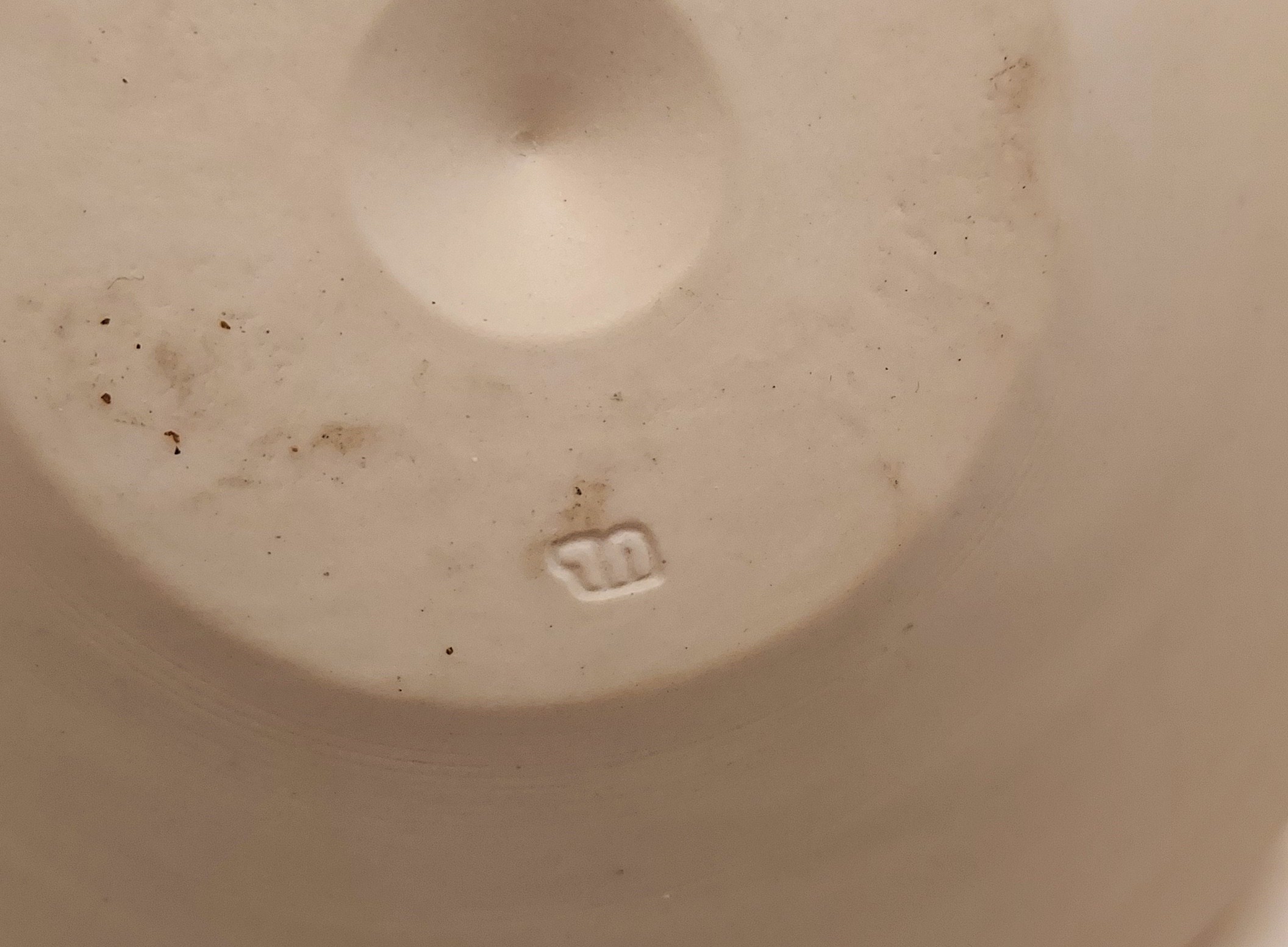 Wit ongeglazuurde aardewerken kom met insnijding aan de voorzijde. Onderzijde gesigneerd met monogram.
