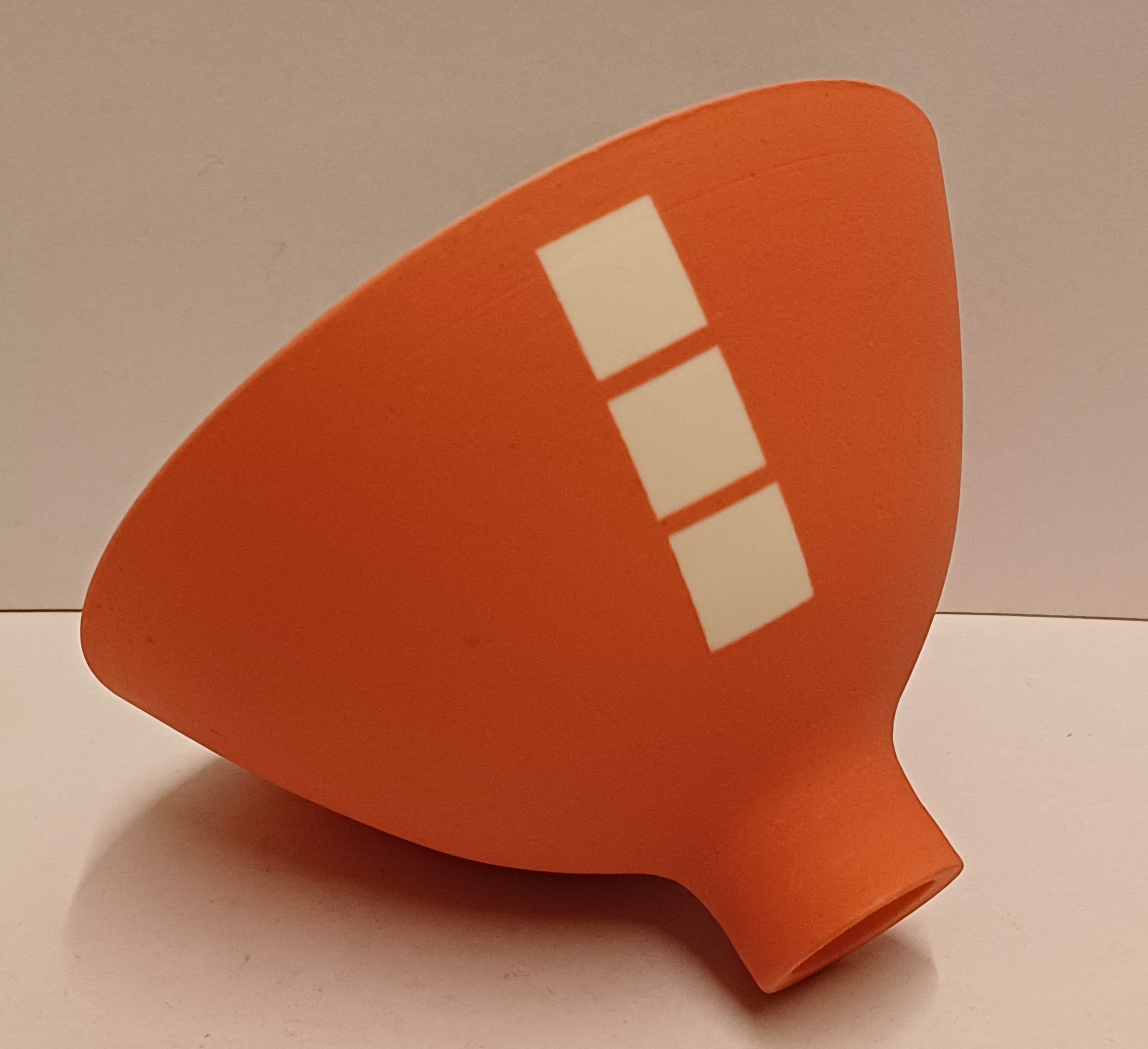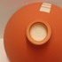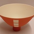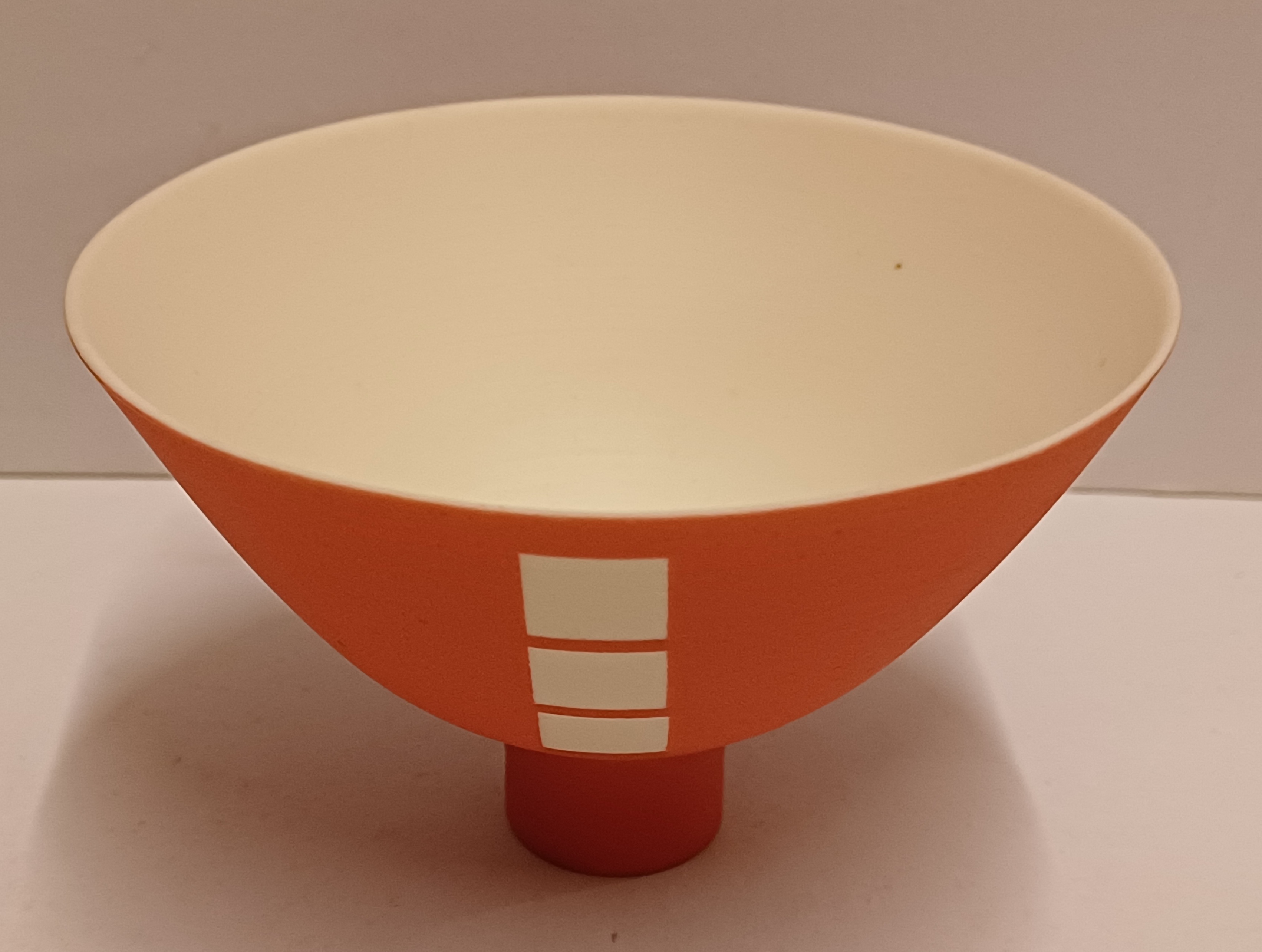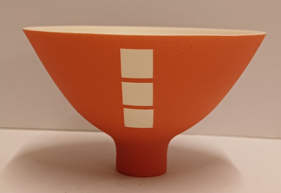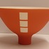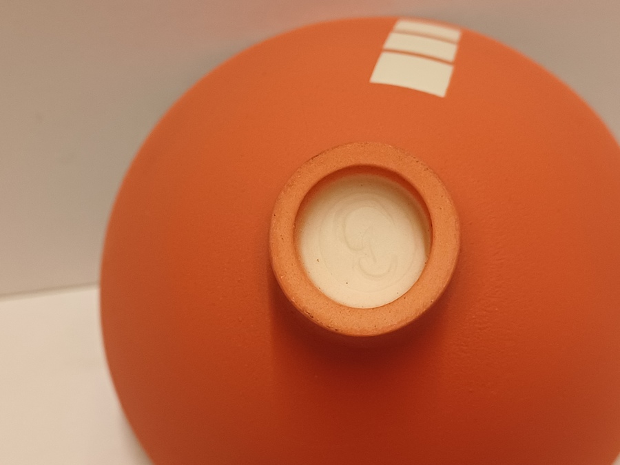 Porseleinen kom met matte oranje glazuur op wit fond. Onderzijde met kunstenaars monogram.