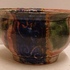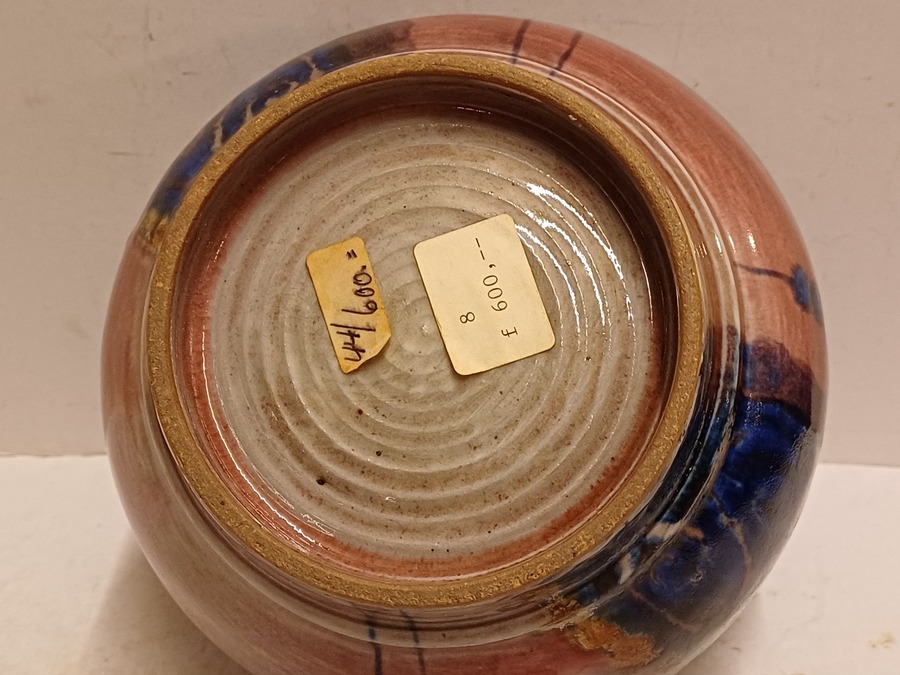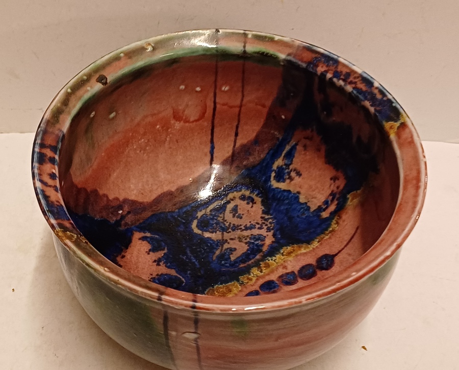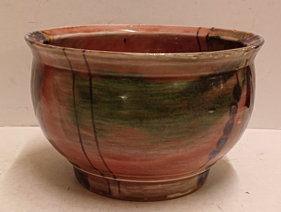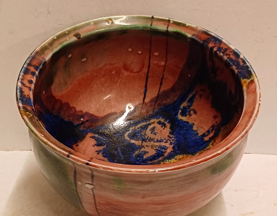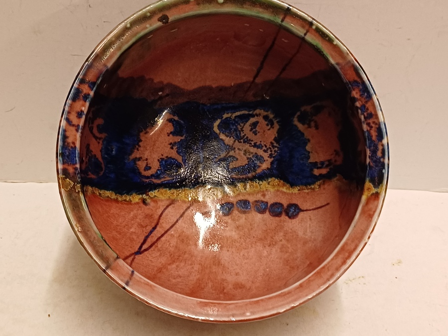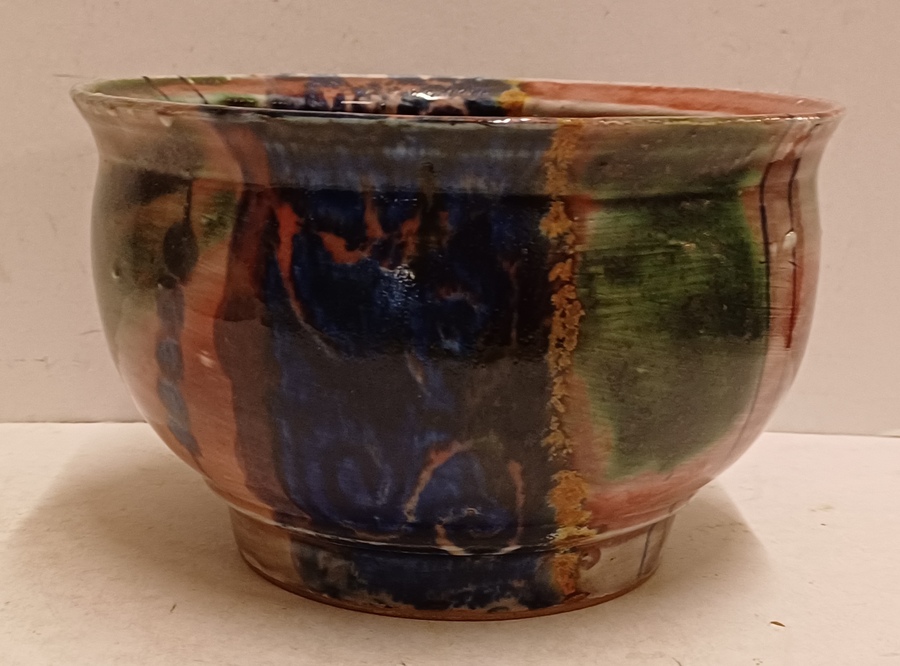 Aardewerken kom met rode glazuur, met daarover blauwe splash en groen vlakken. Ogenschijnlijk niet gesigneerd.