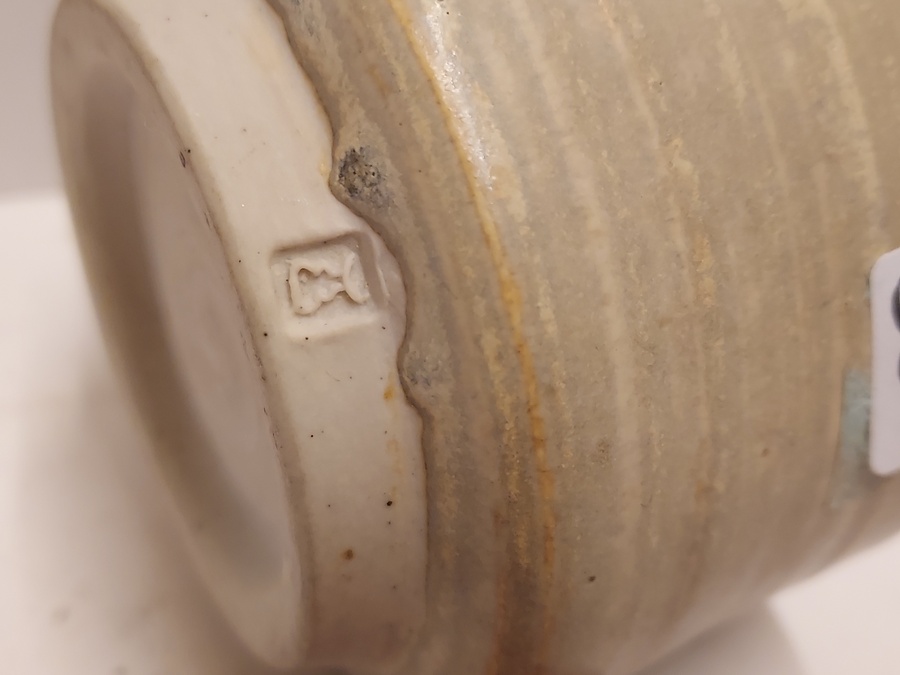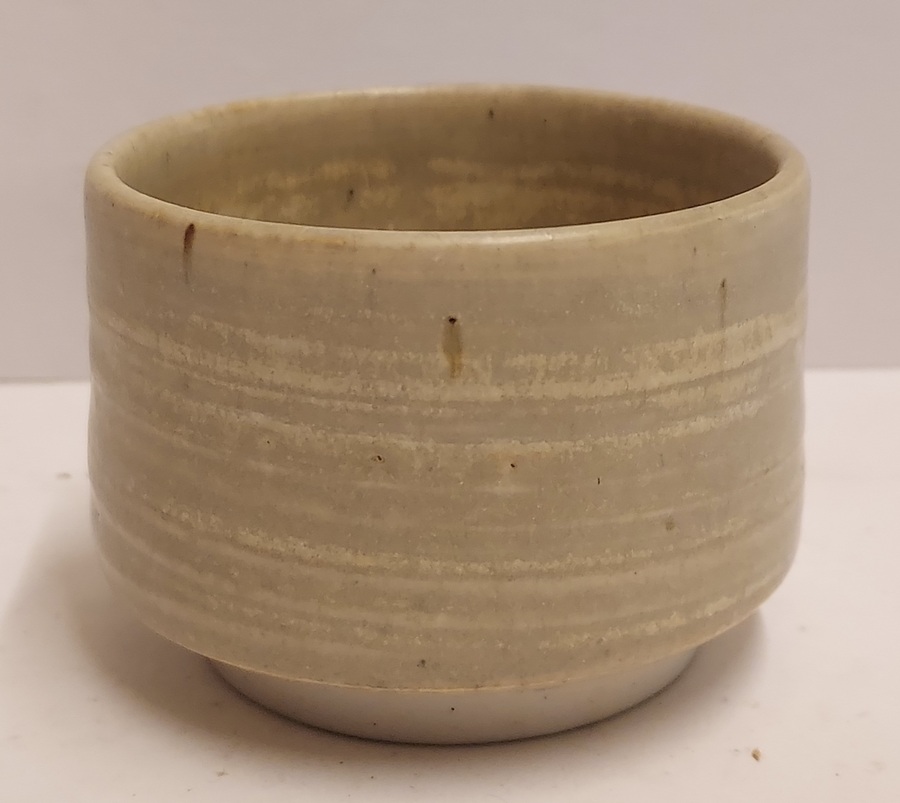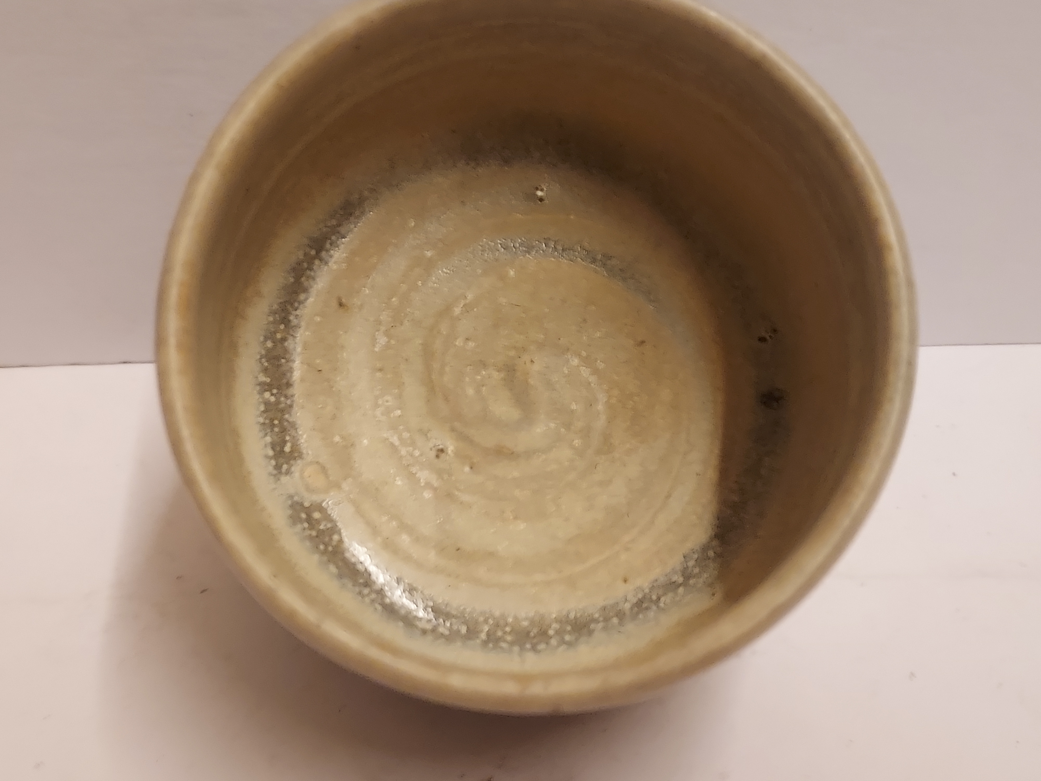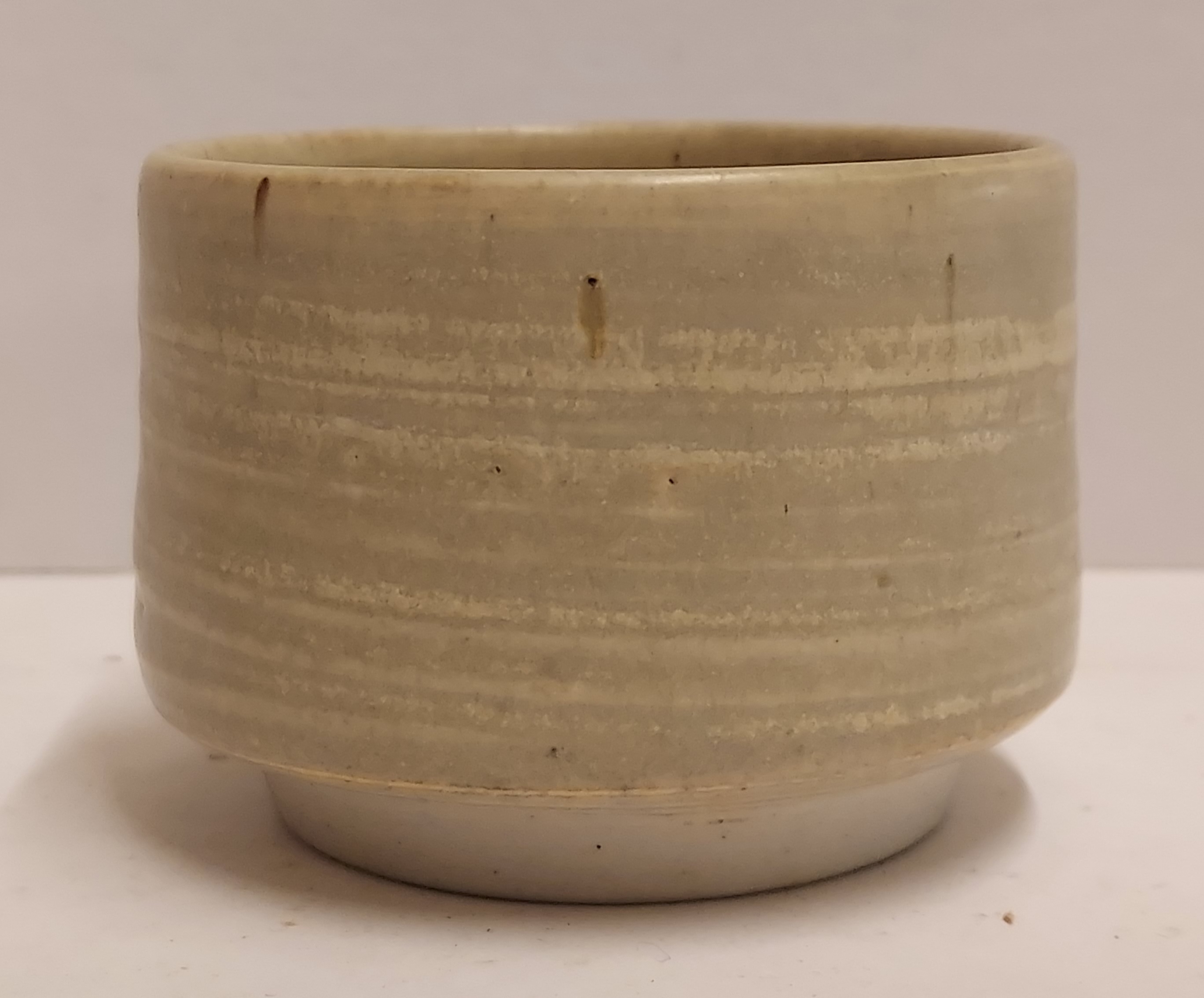 Aardewerken kom met grijze glazuur. Zijkant gemerkt met flesje.