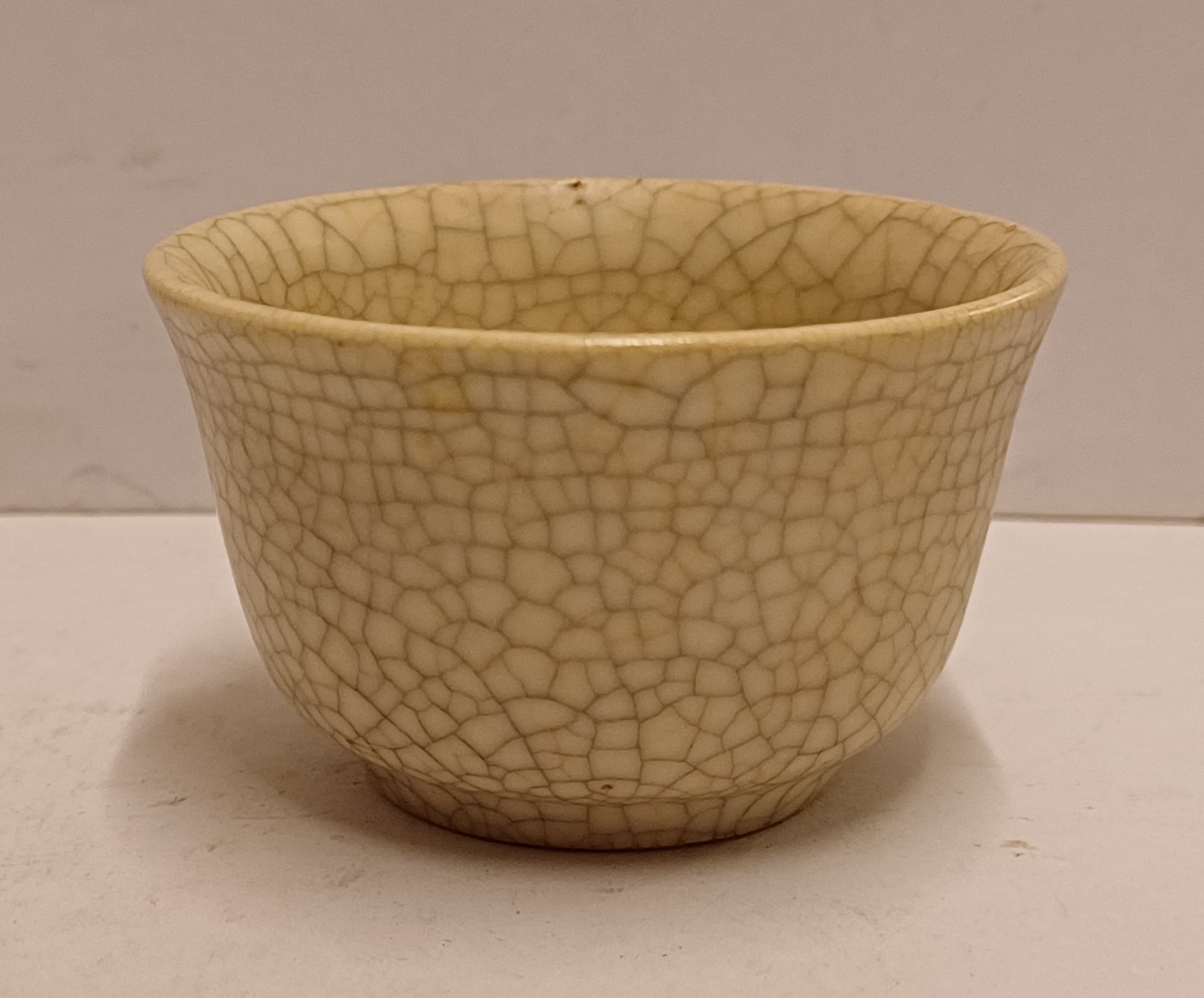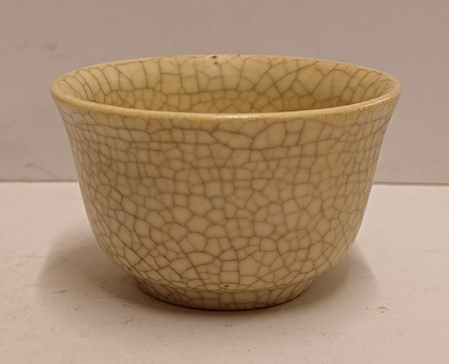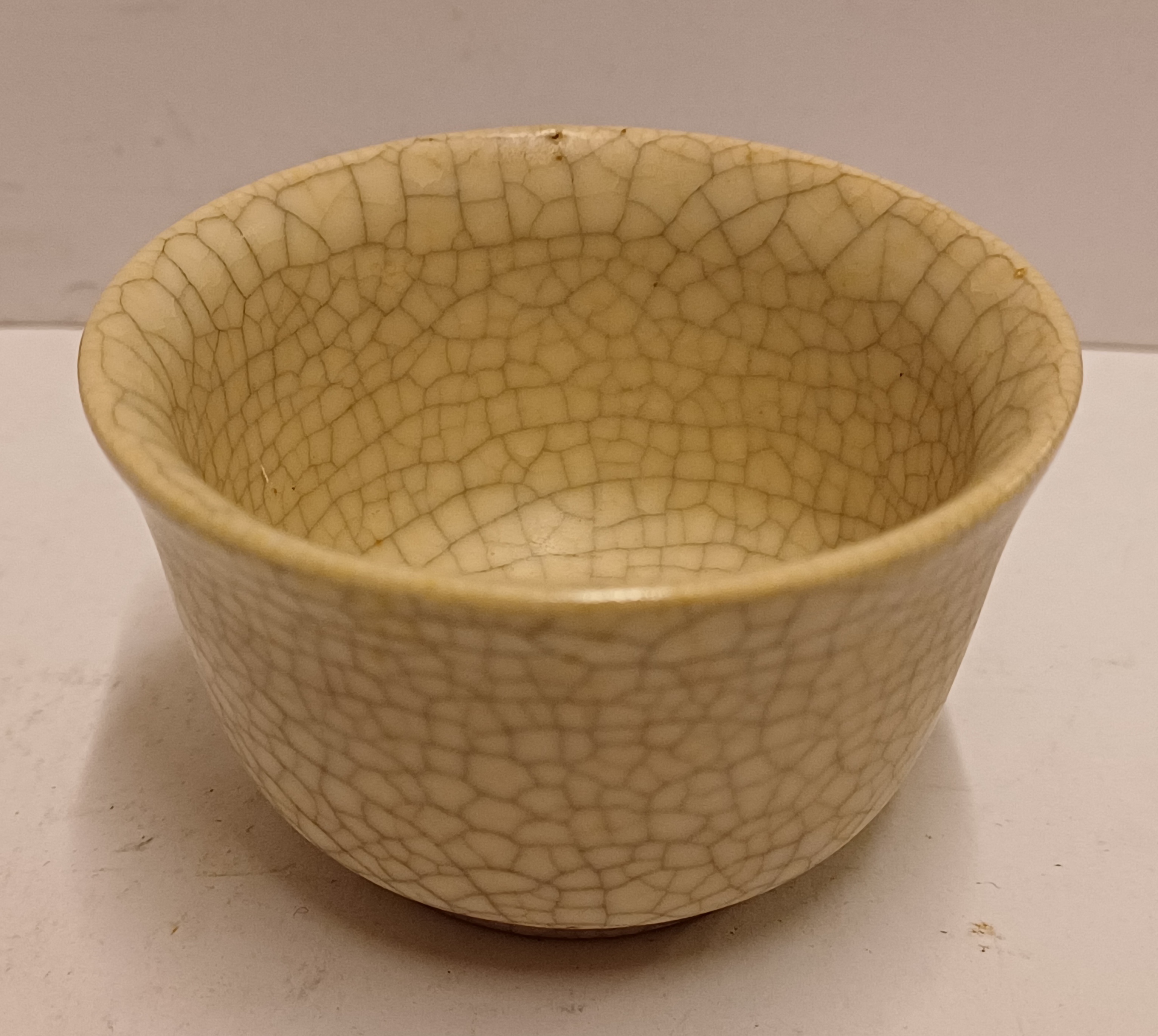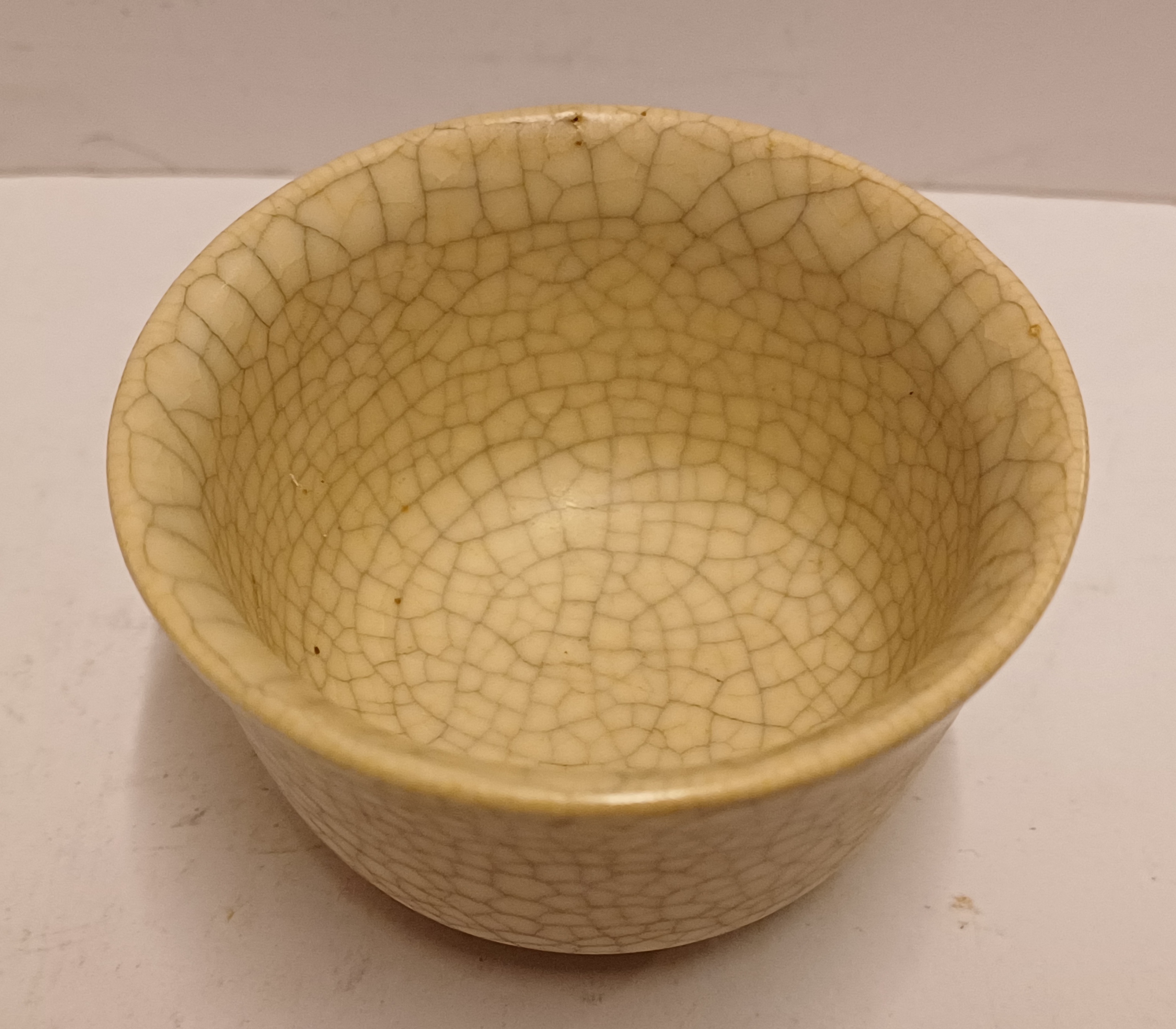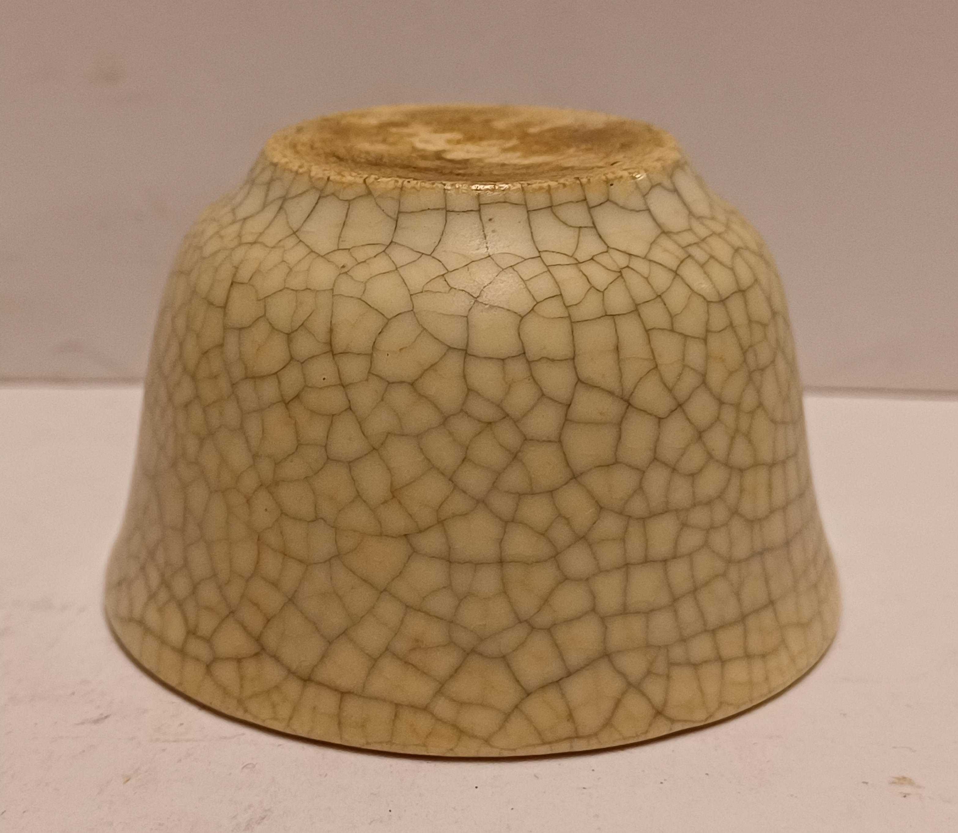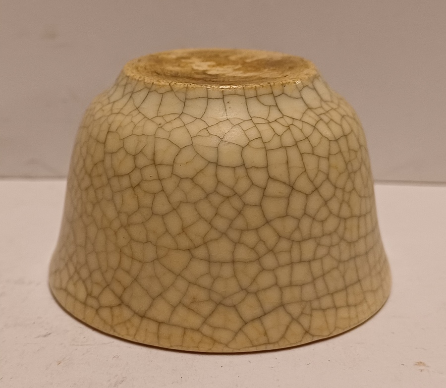 Aardewerken kommetje met ivoorkleurige glazuur en verfijnde craquele. Onderzijde gesigneerd en genummerd 777.