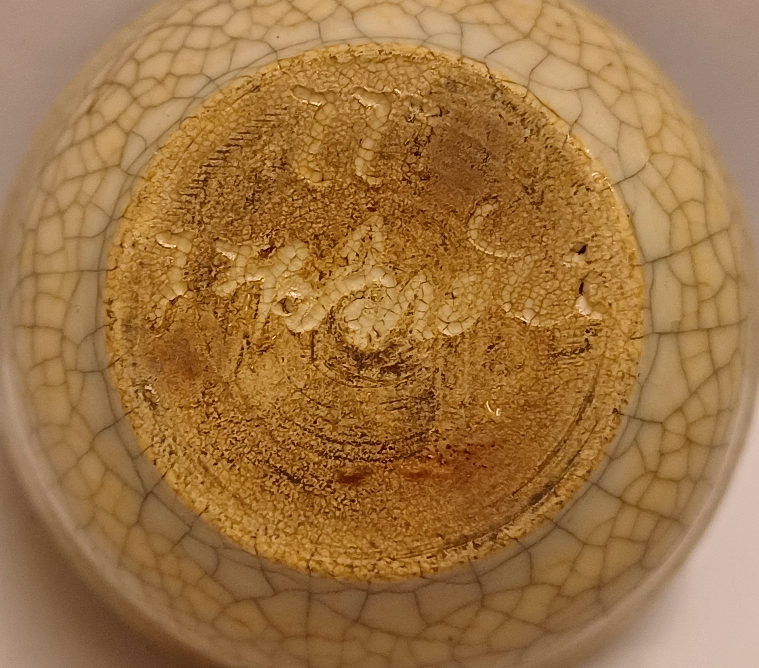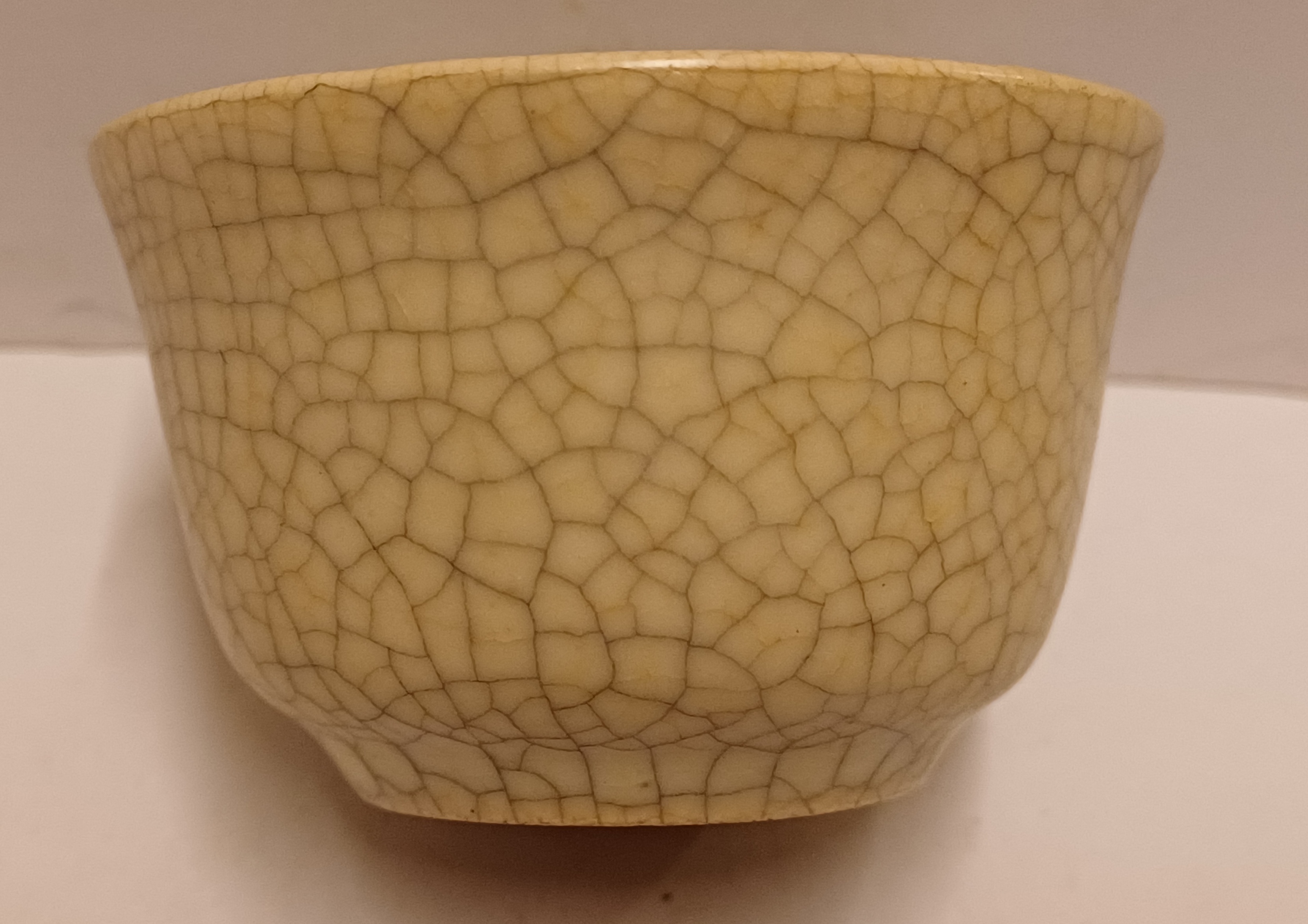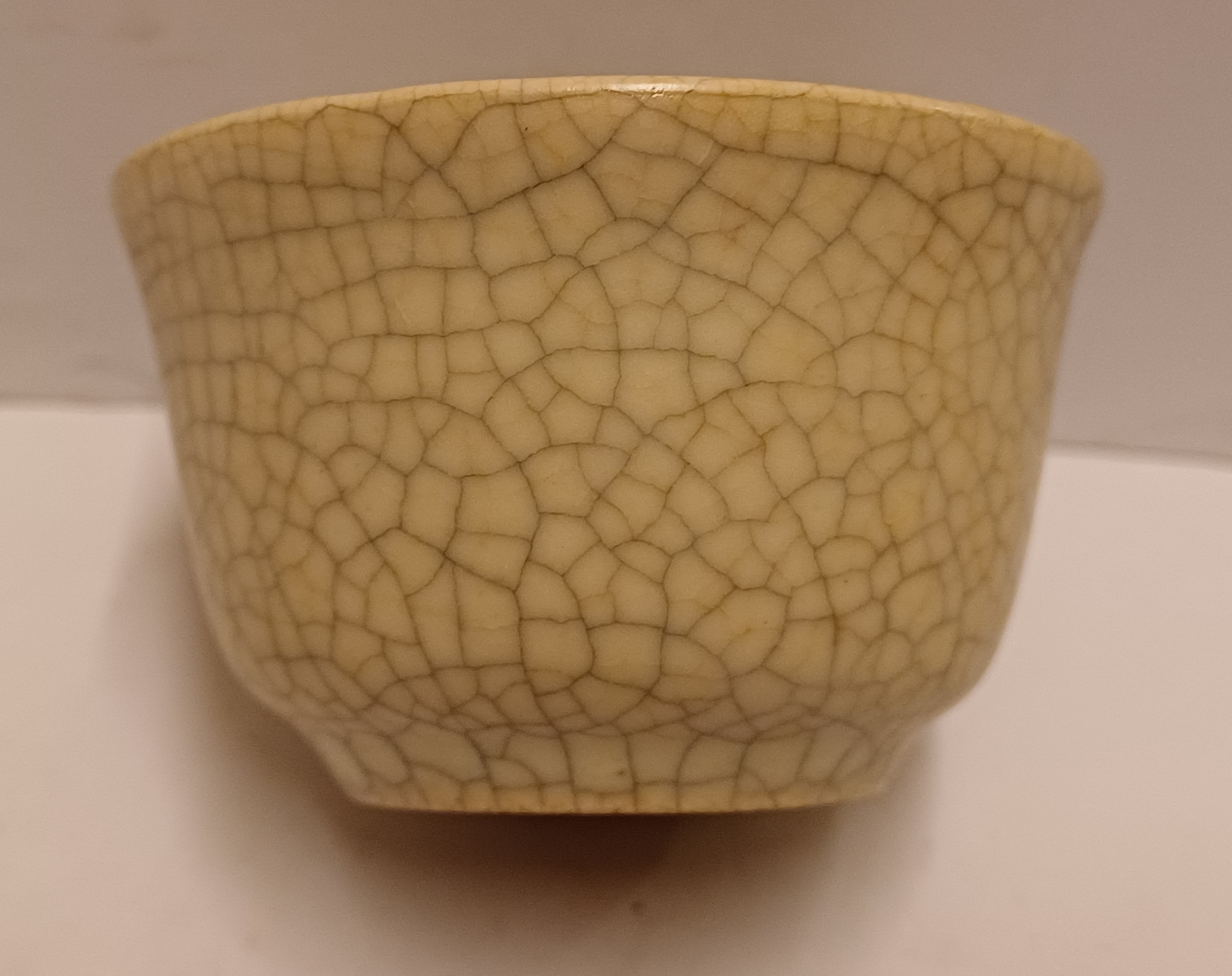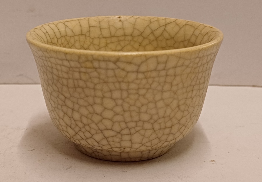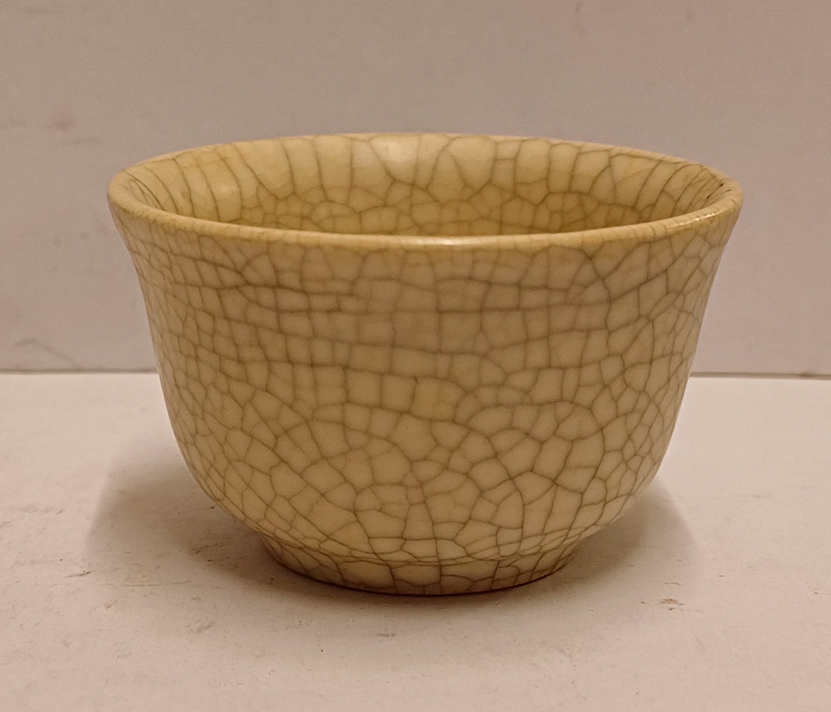Aardewerken kommetje met ivoorkleurige glazuur en verfijnde craquele. Onderzijde gesigneerd en genummerd 777.