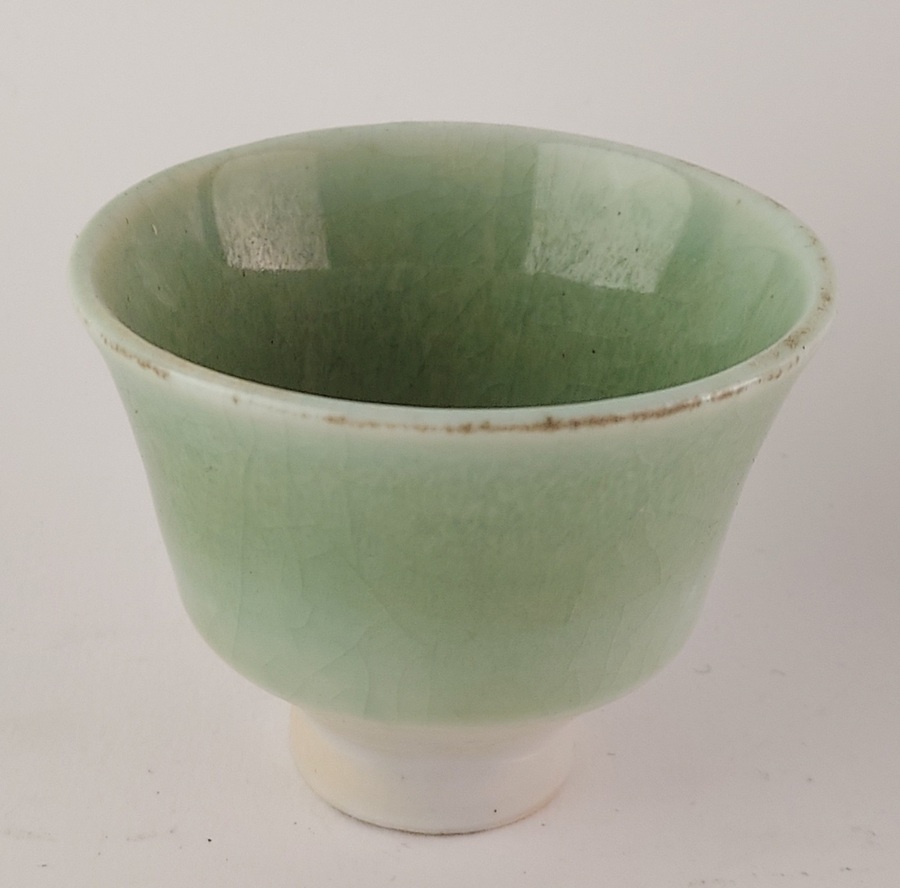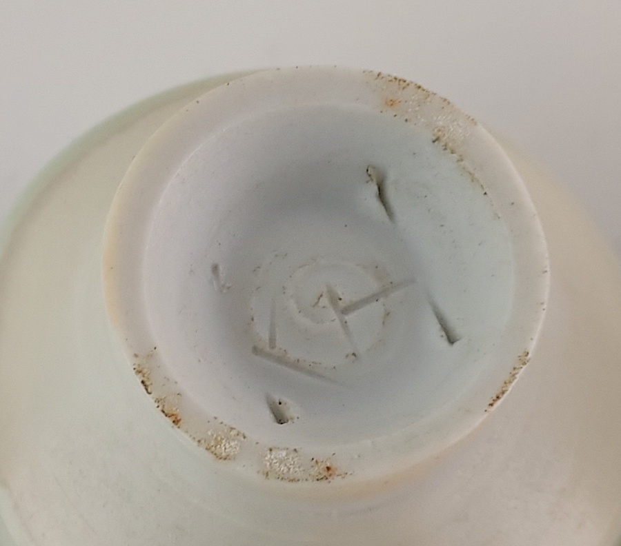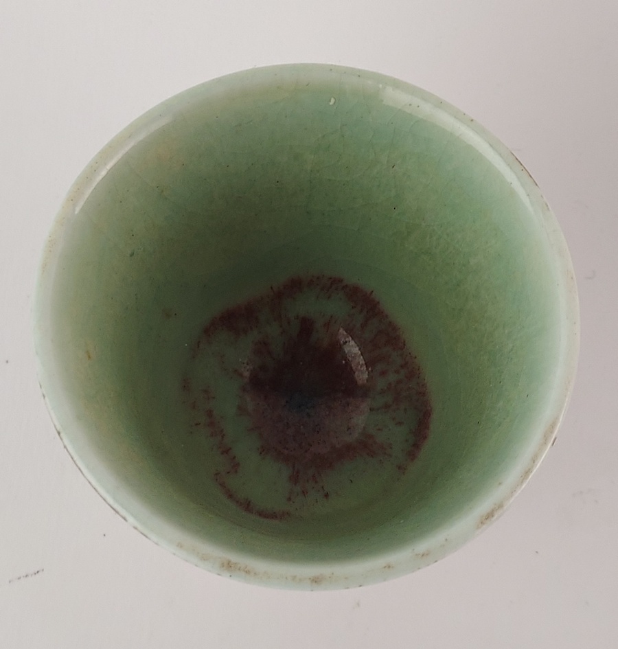 Met celadon galzuur en rode vlek aan binnenzijde. Onderzijde monogram.