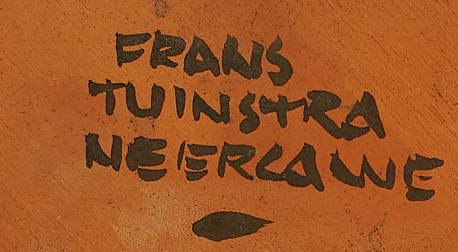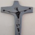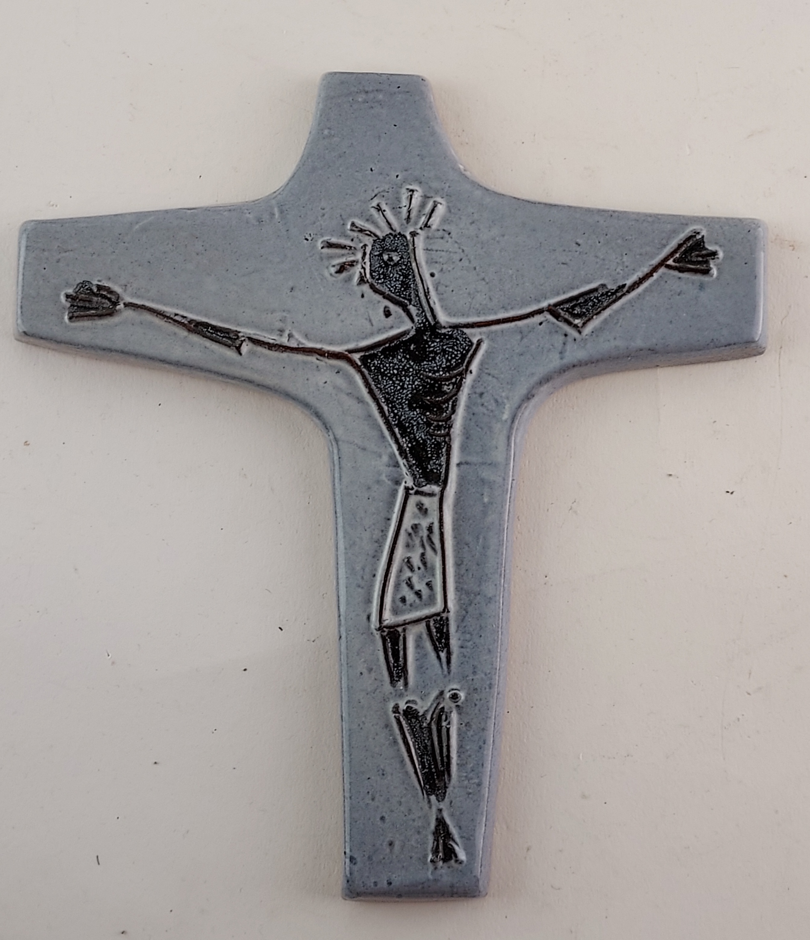 Keramisch kruis met blauw grijze glazuur. Achterzijde gesigneerd