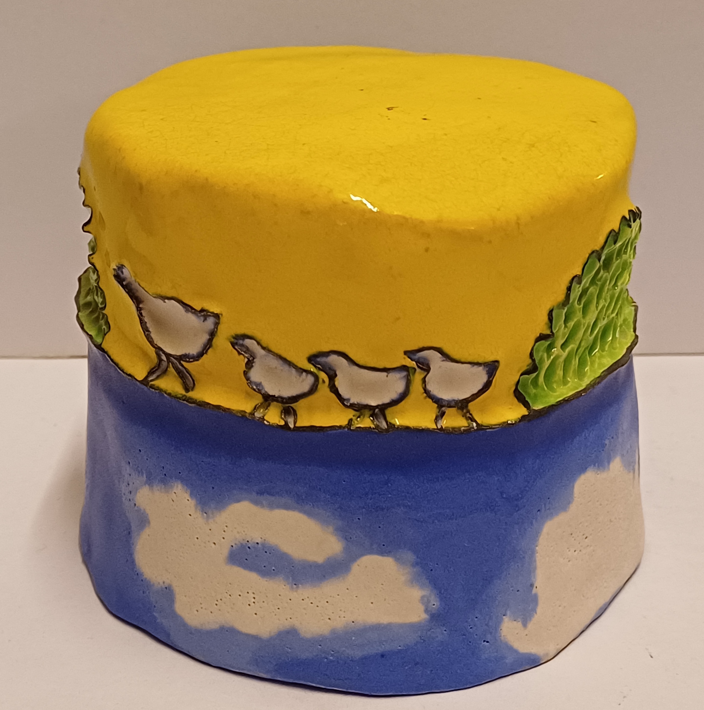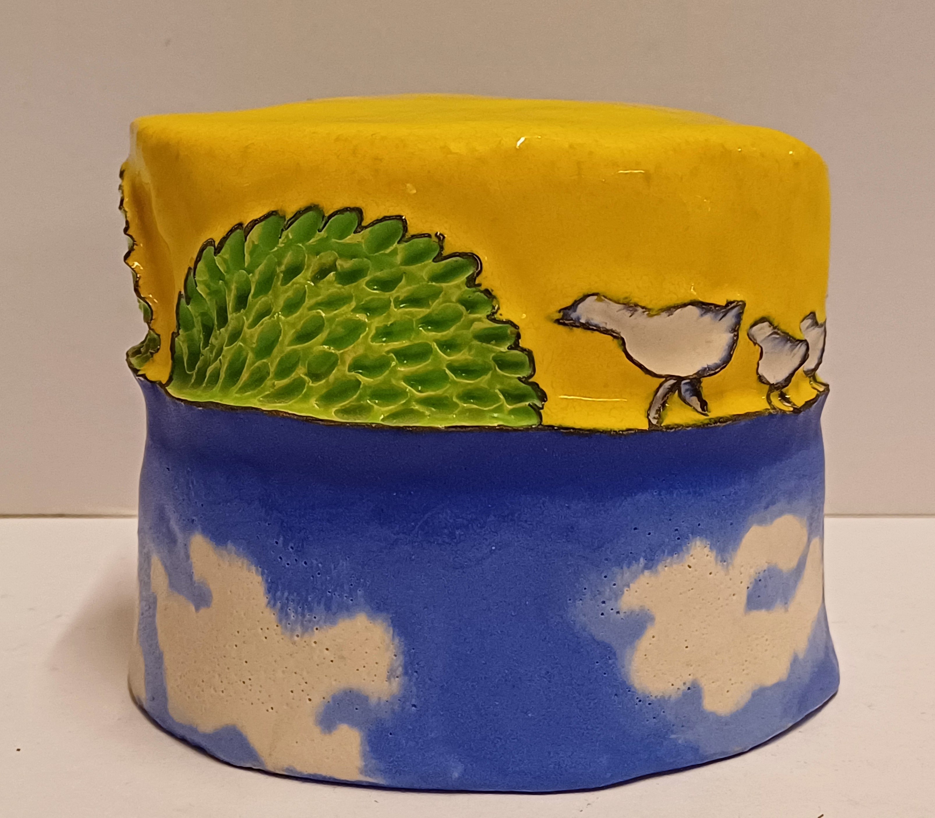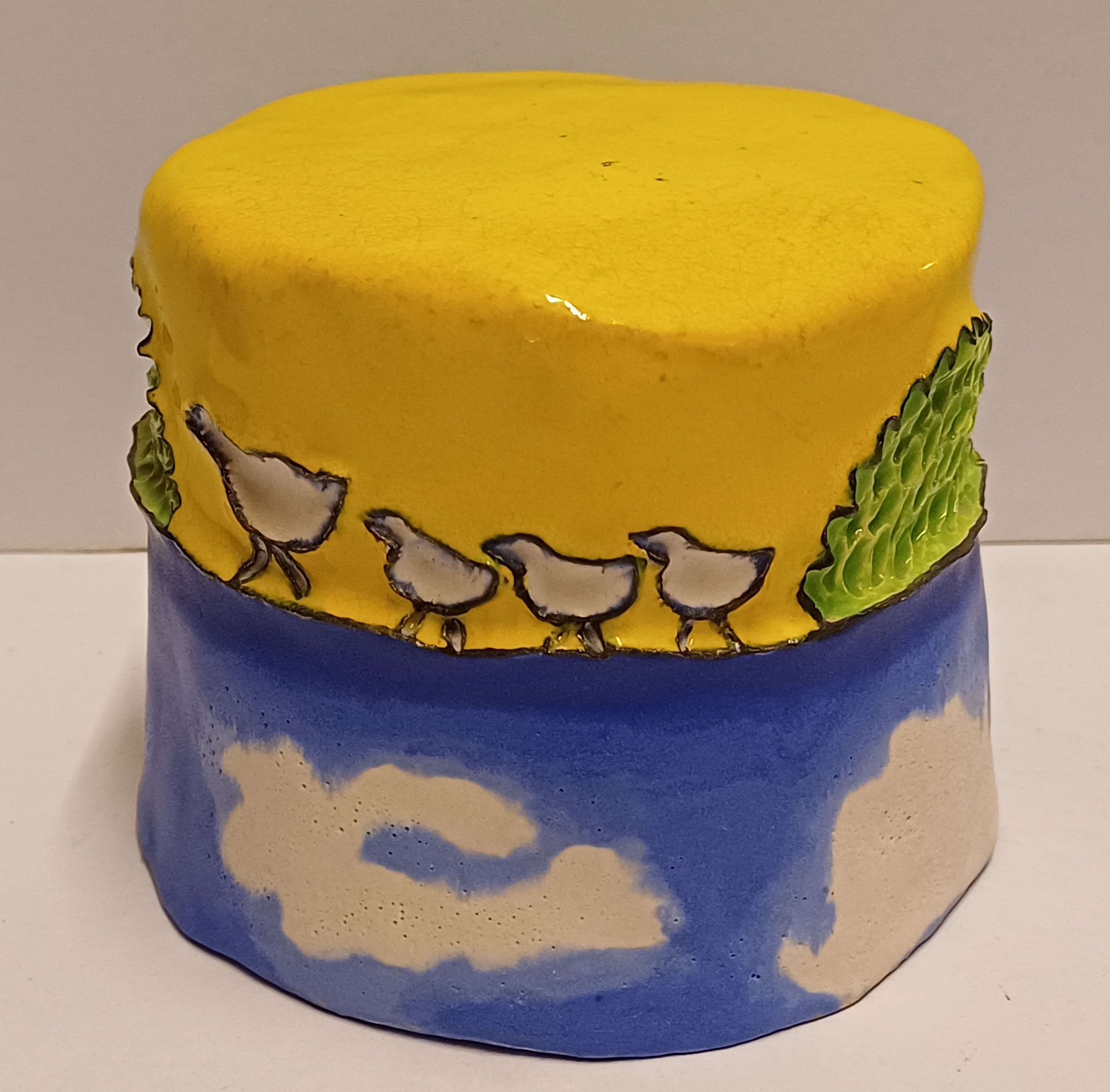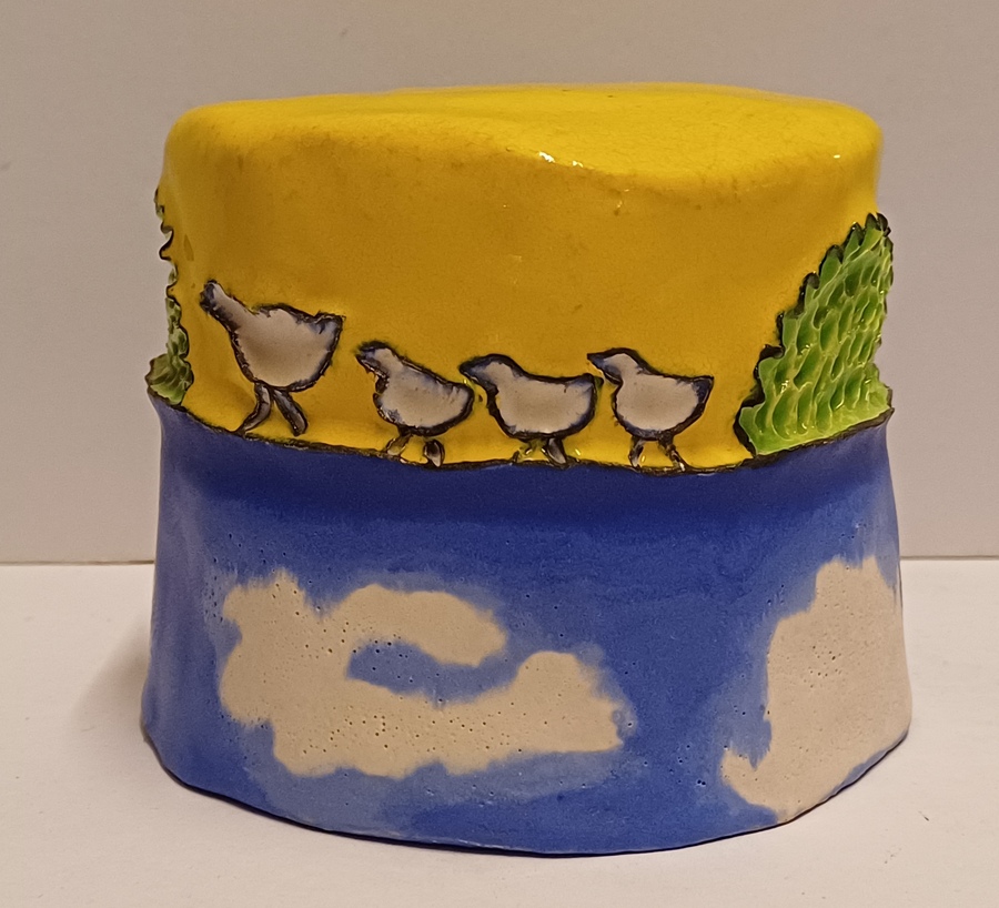 Klein landschapje van Maggi Giles met voorstelling kip met kuikens wandelend door een landschap. Onderzijde gesigneerd en gedateerd 1982.