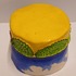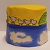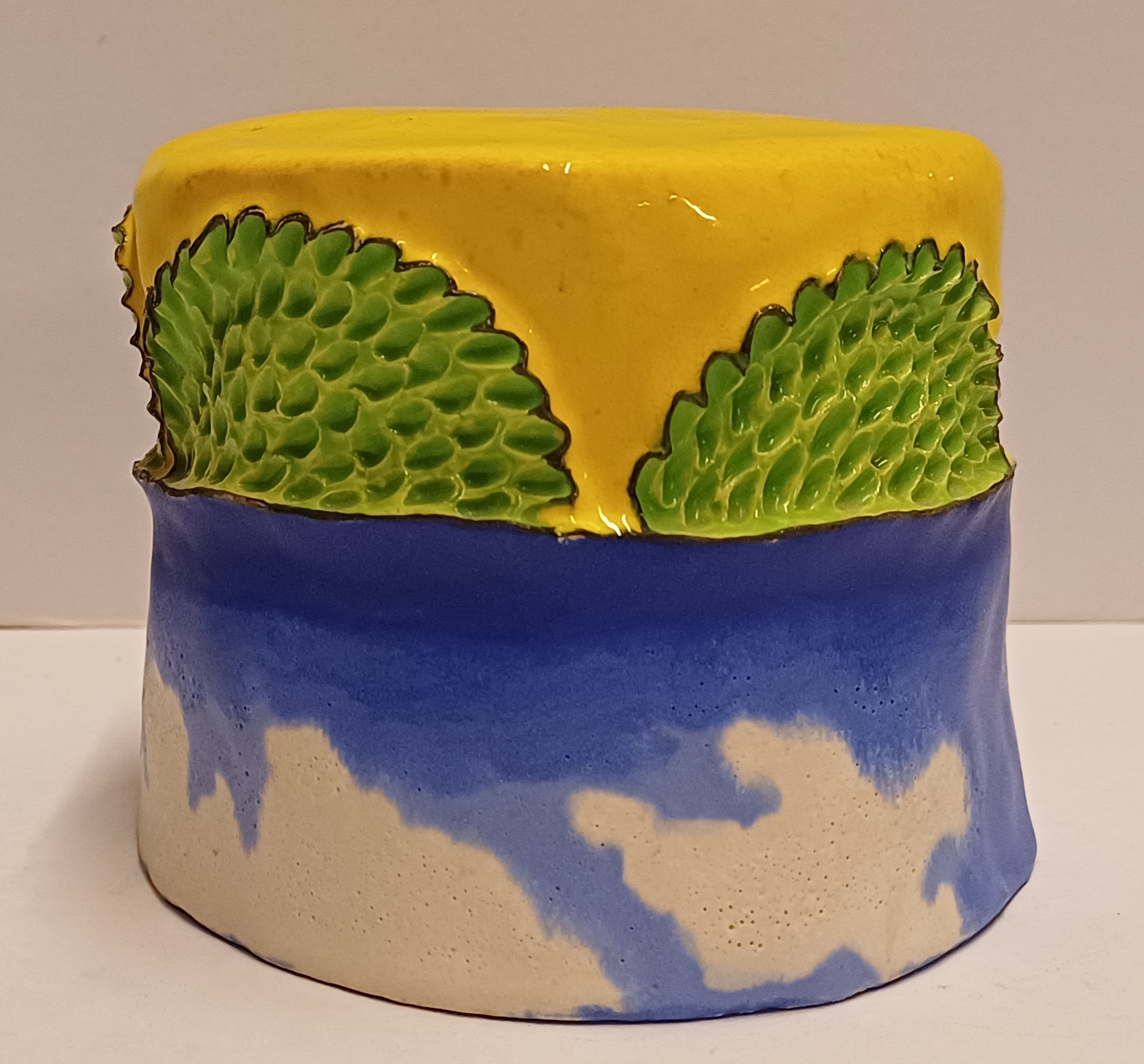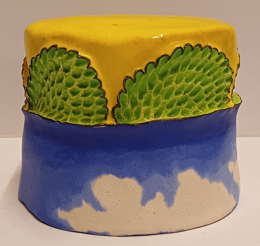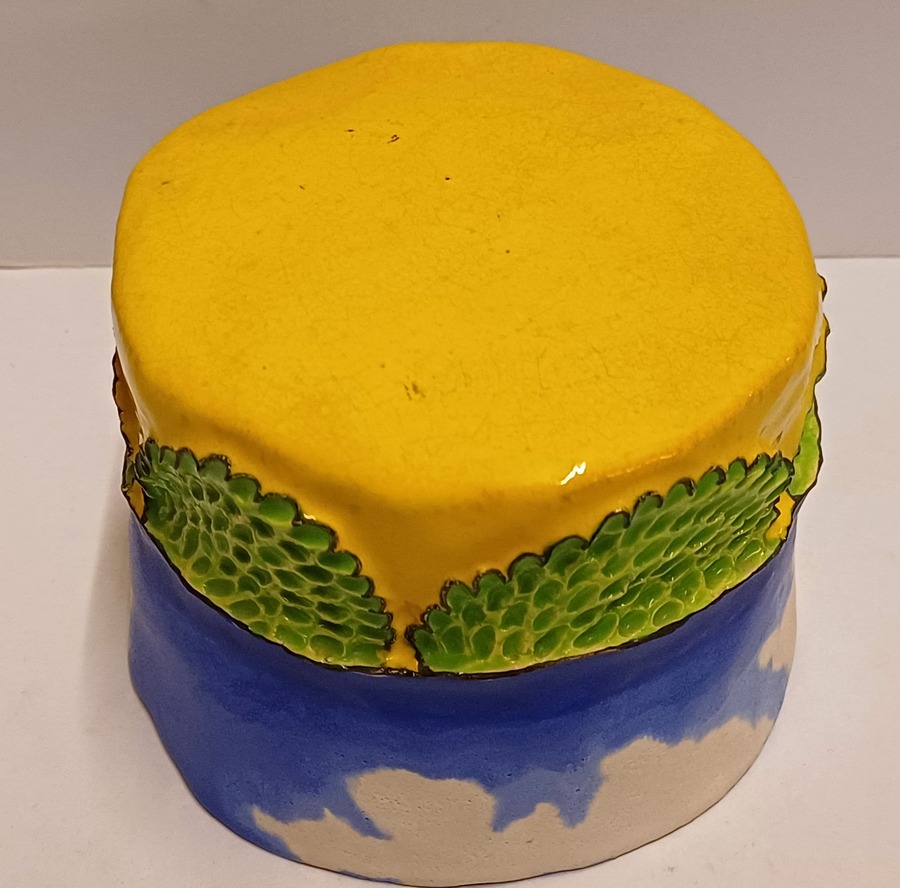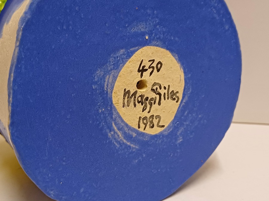 Klein landschapje van Maggi Giles met voorstelling kip met kuikens wandelend door een landschap. Onderzijde gesigneerd en gedateerd 1982.