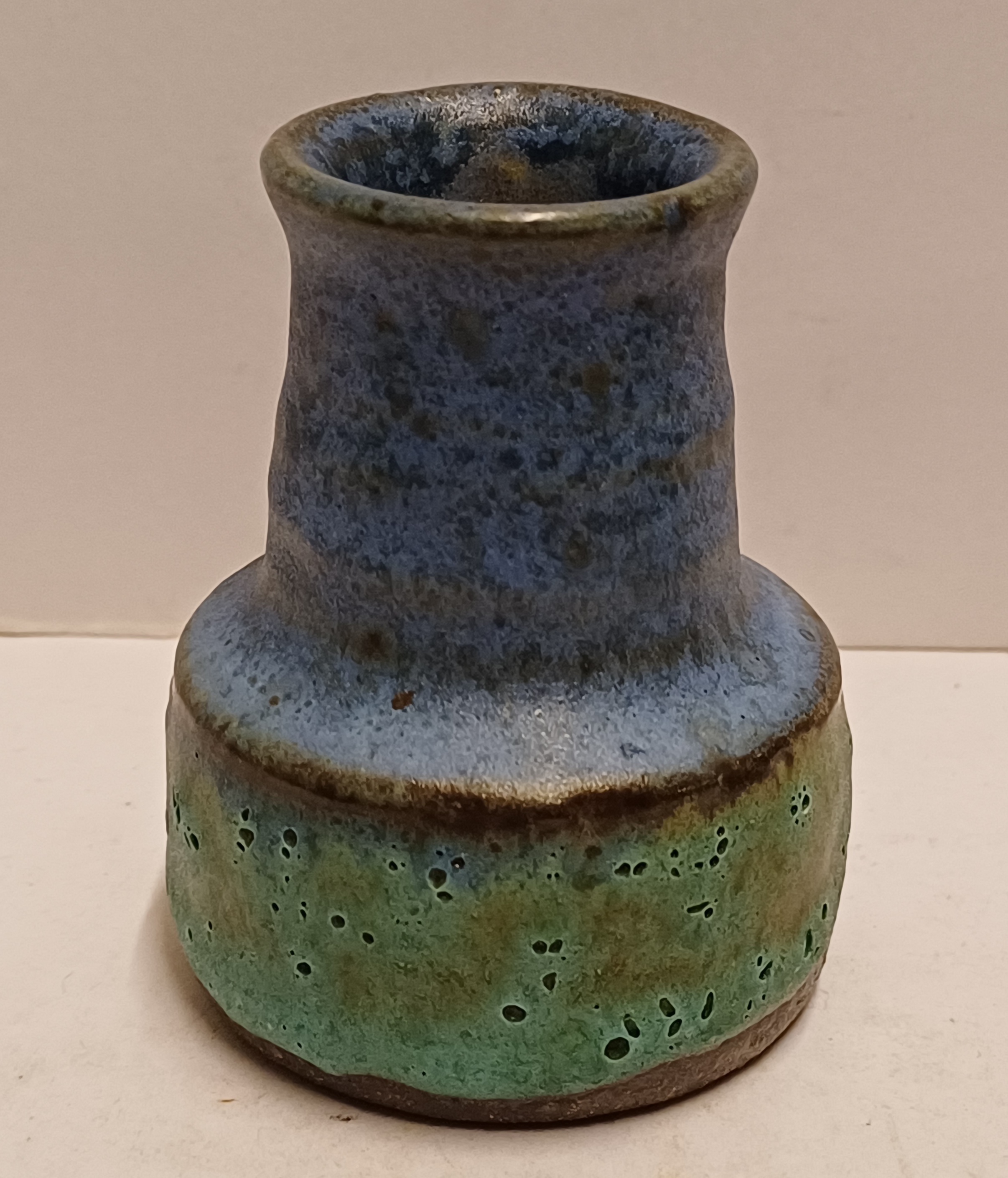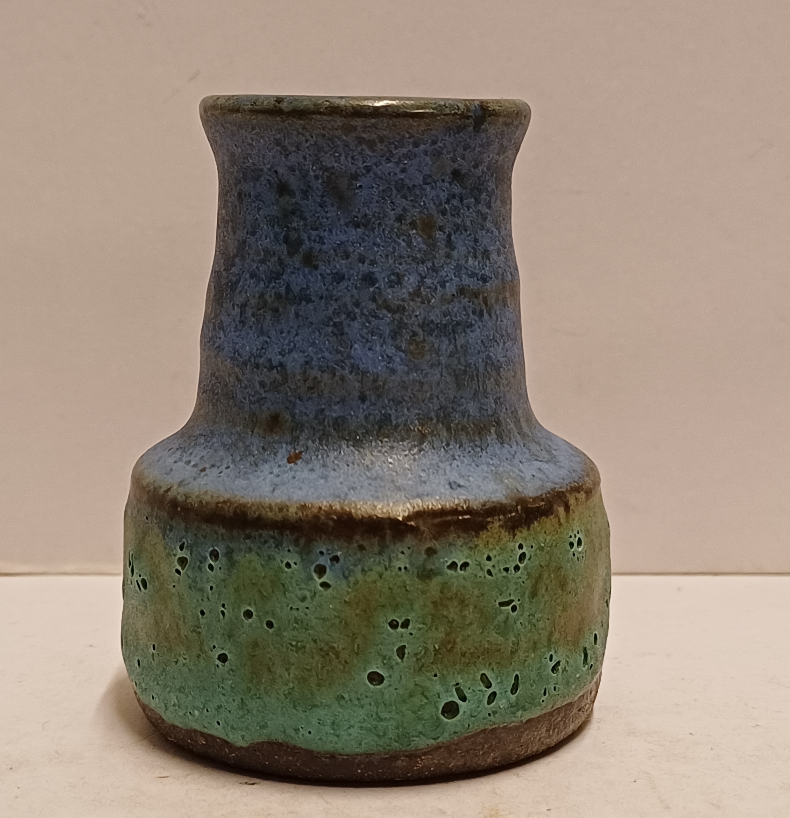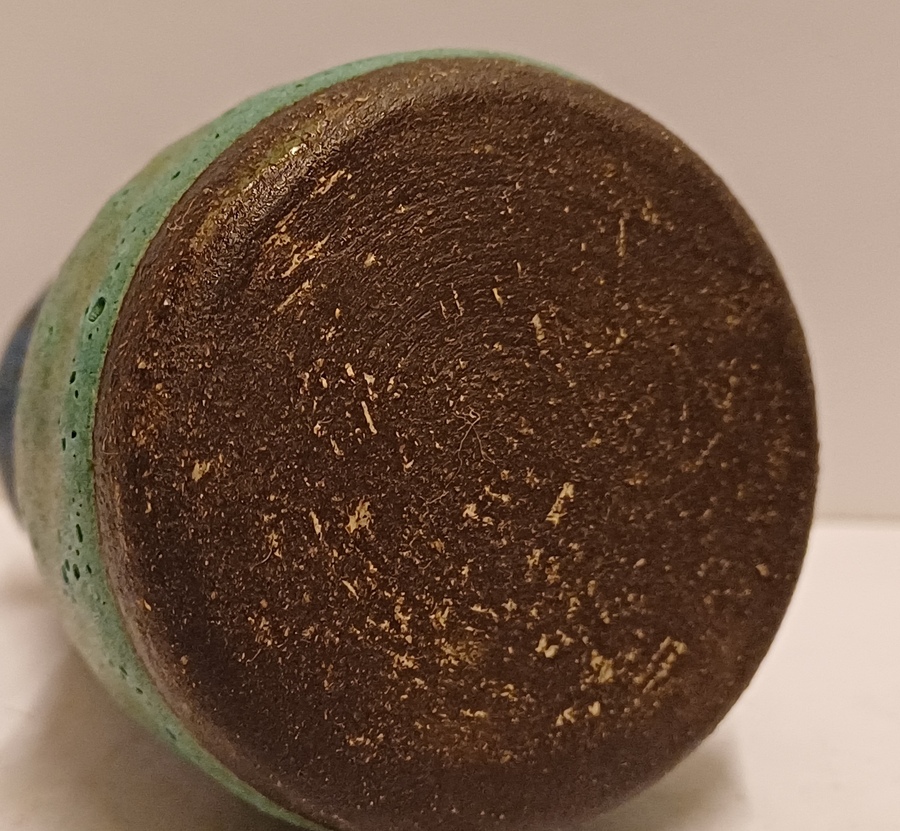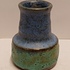 Klein vaasje met blauwe en groene glazuur. Niet gesigneerd