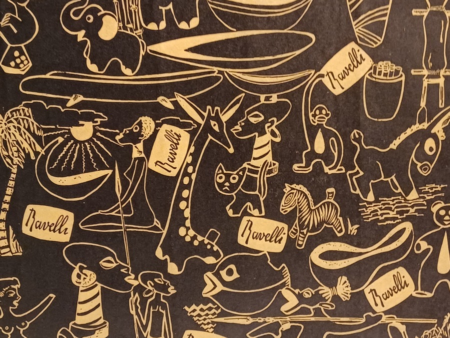 Ongebruikt stuk inpakpapier van Potterie Ravelli. Met decoratie van een variatie aan dierfiguren en ander werk van zijn hand.