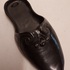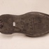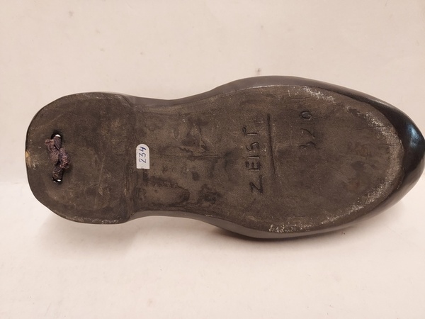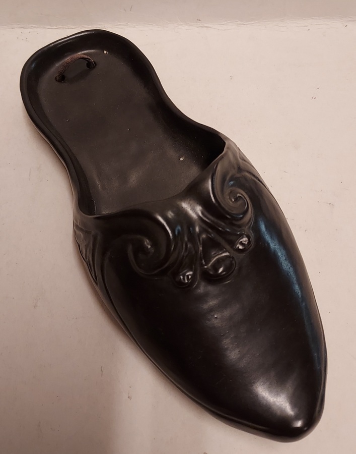 Zwart geglazuurd aardewerken wandhanger in de vorm van een slof.