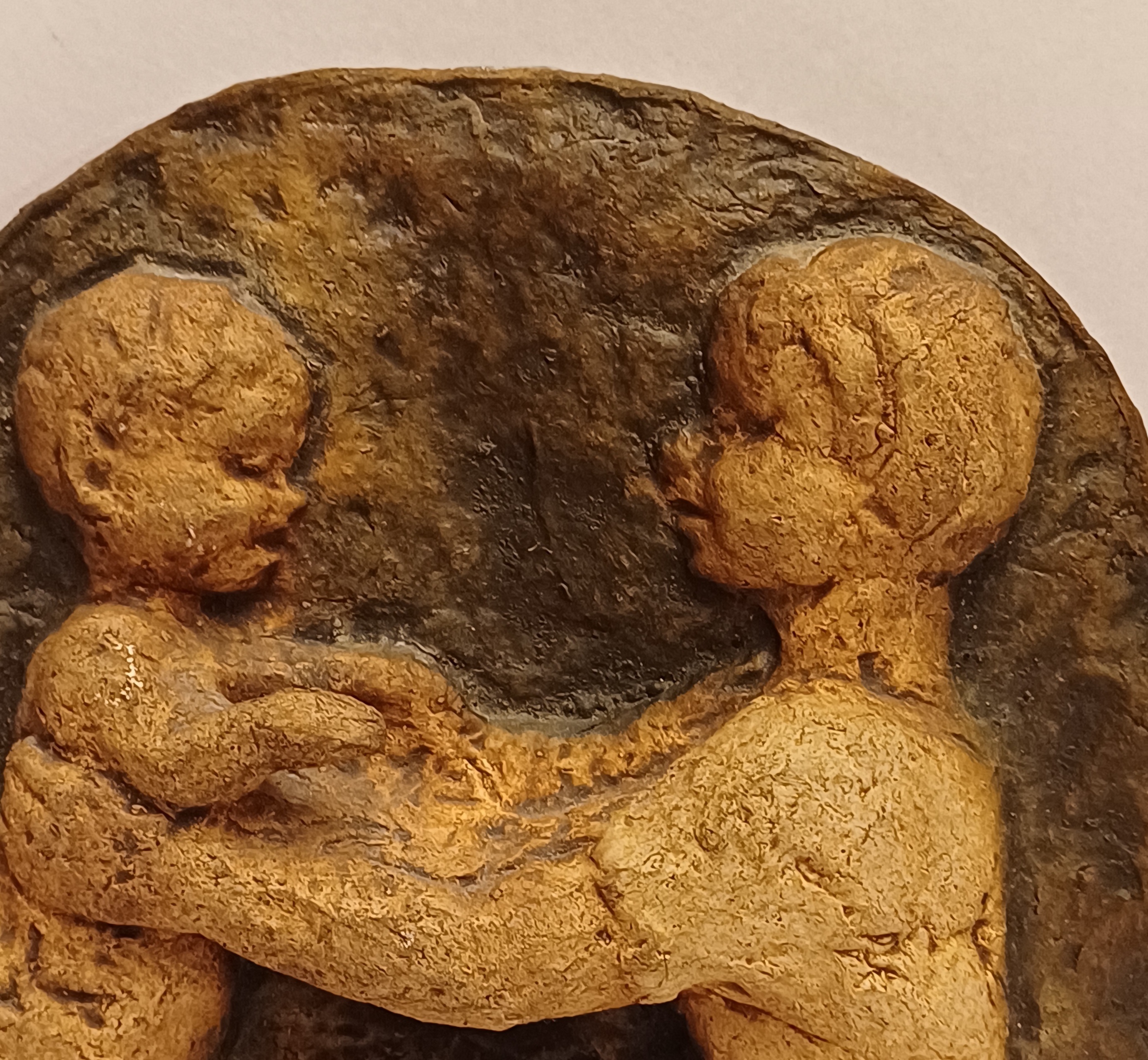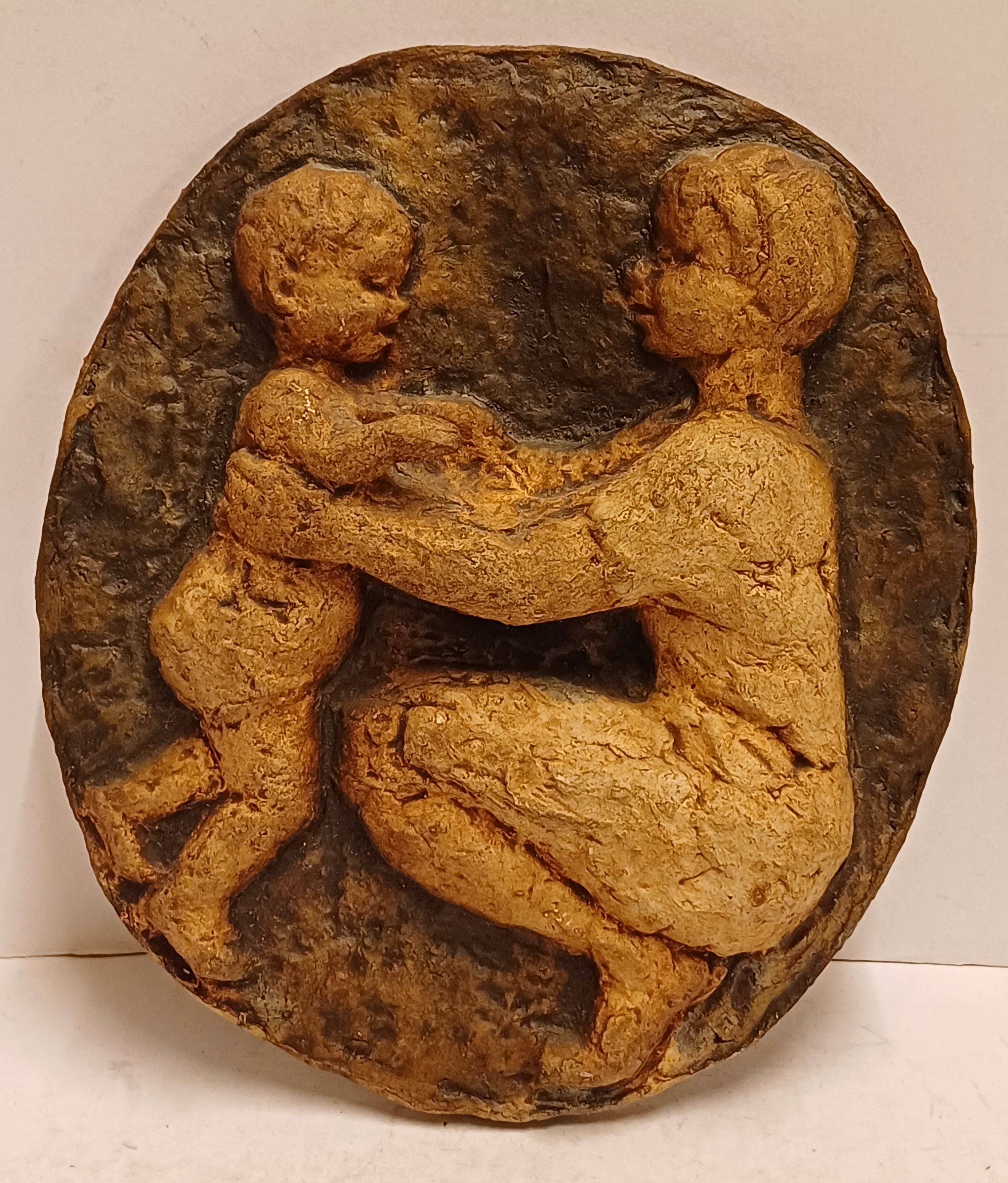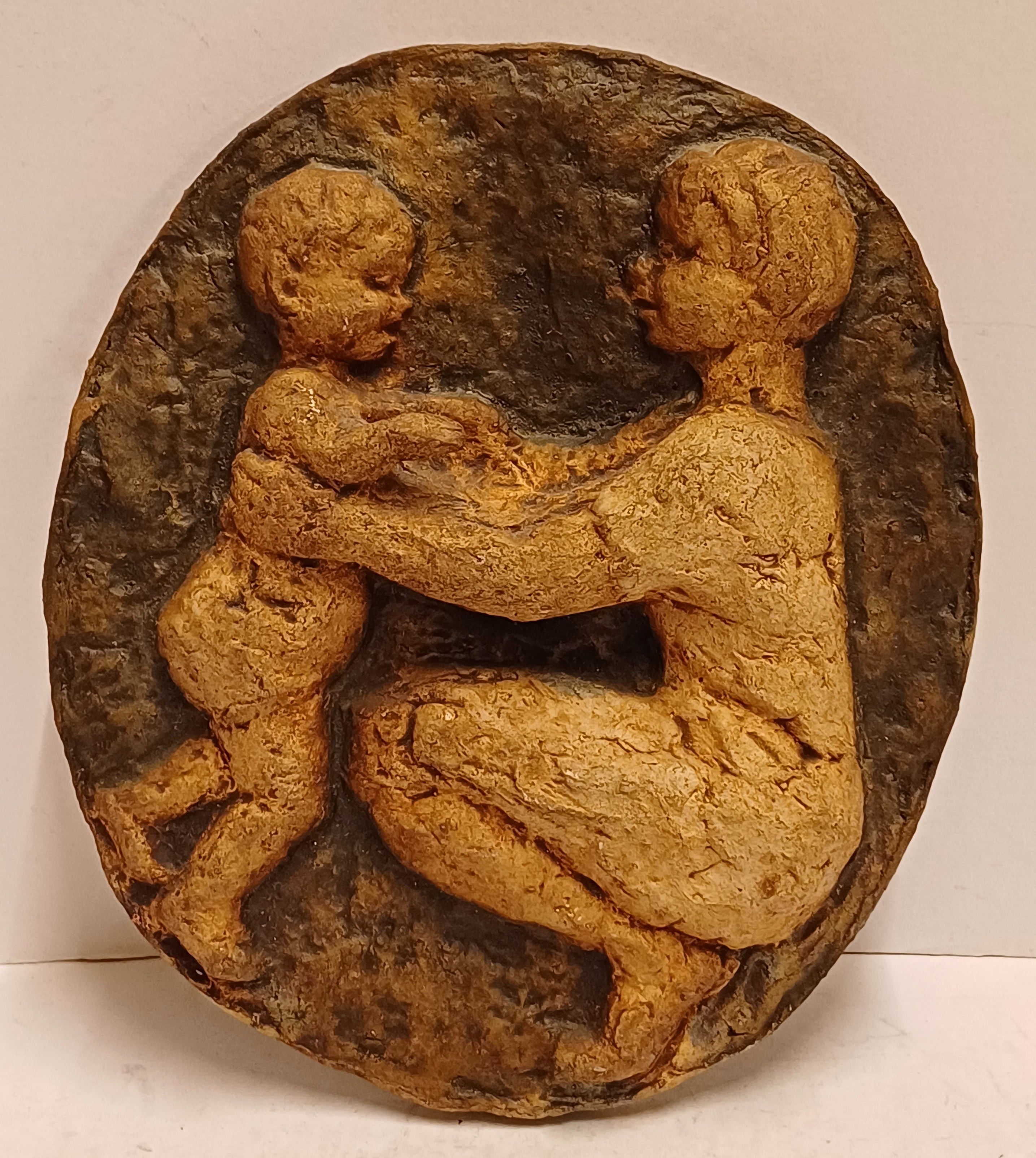 Ovale aardewreken plaquette met voorstelling van moeder en kind. Achterzijde met gestempeld merk.