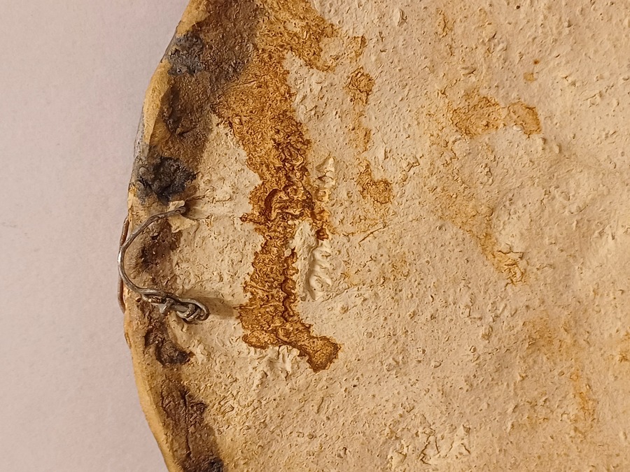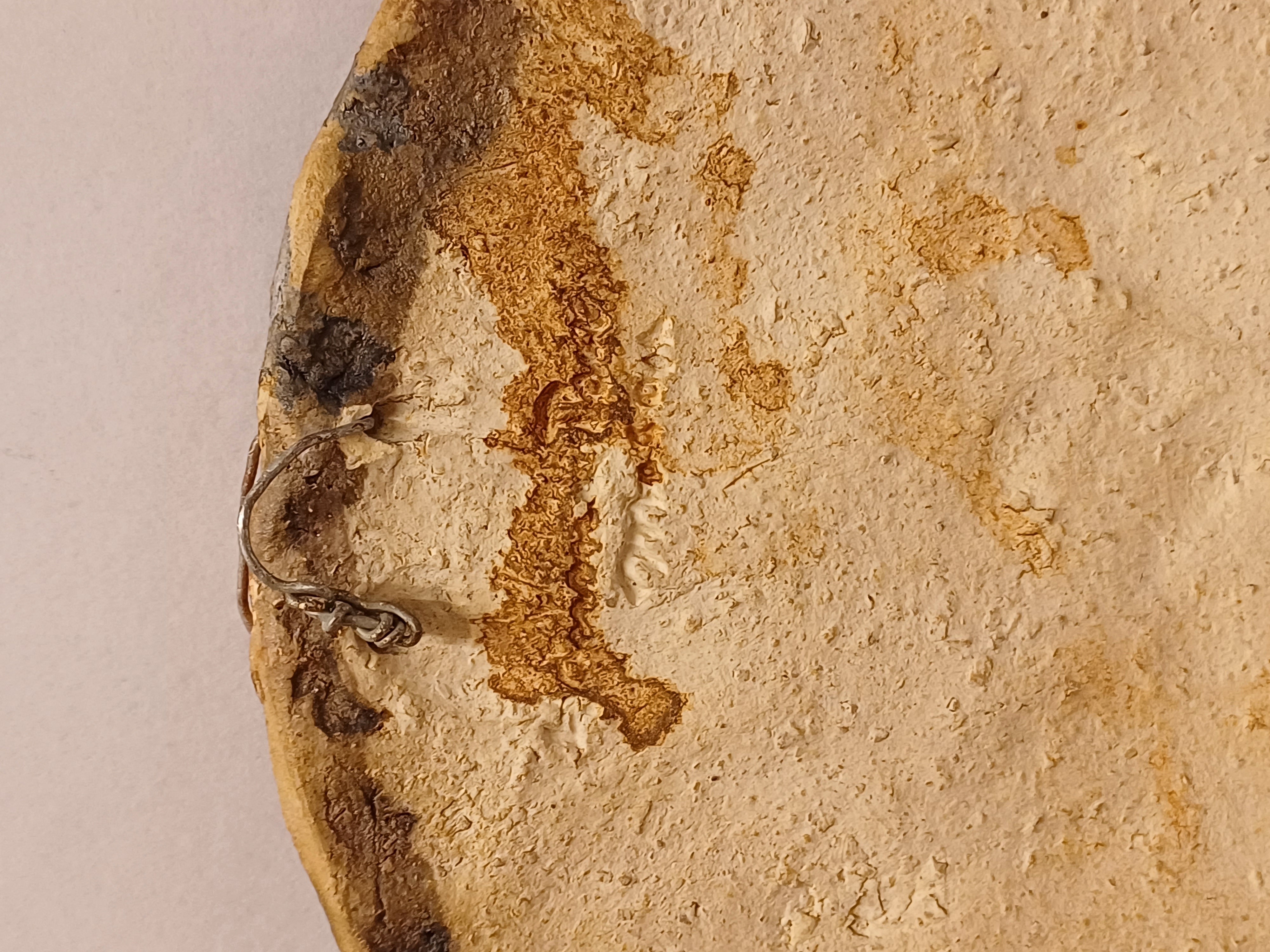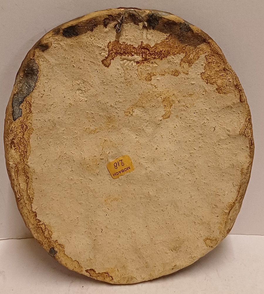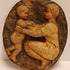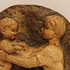 Ovale aardewreken plaquette met voorstelling van moeder en kind. Achterzijde met gestempeld merk.