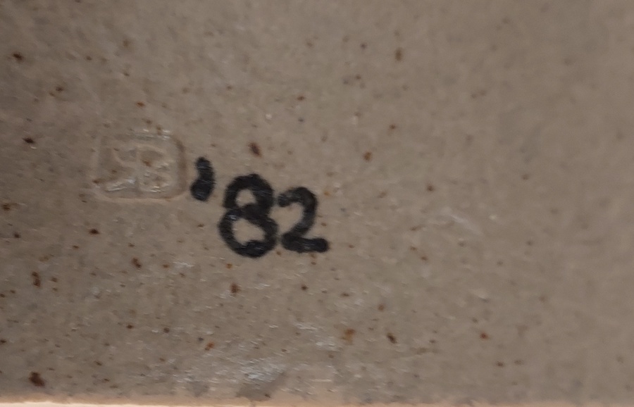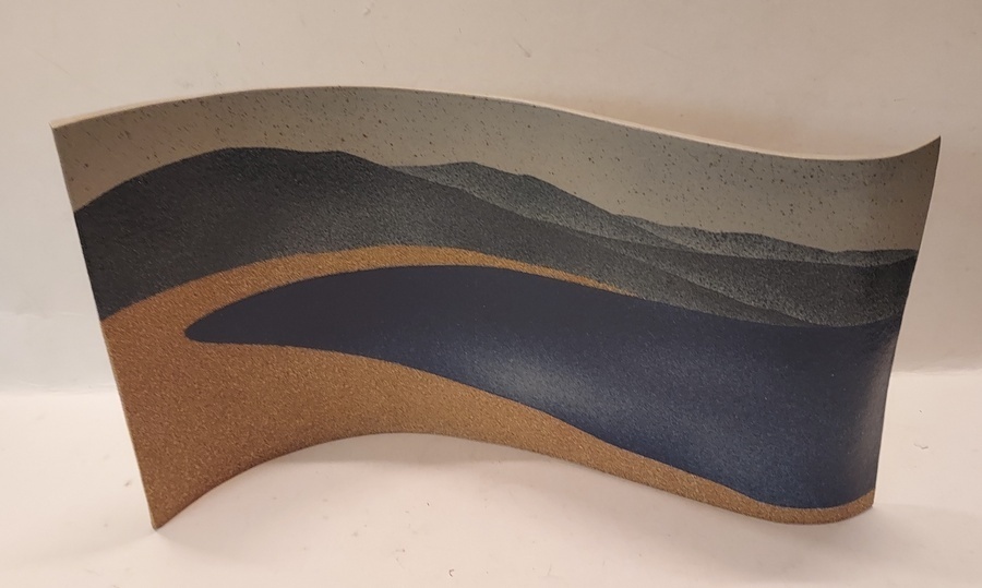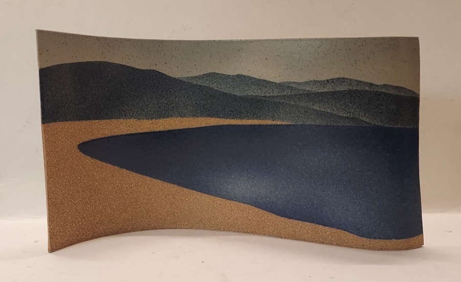 Steengoed gebogen plaat met een landschap. Gesigneerd met kunstenaars stempel en datering '82.