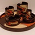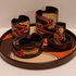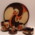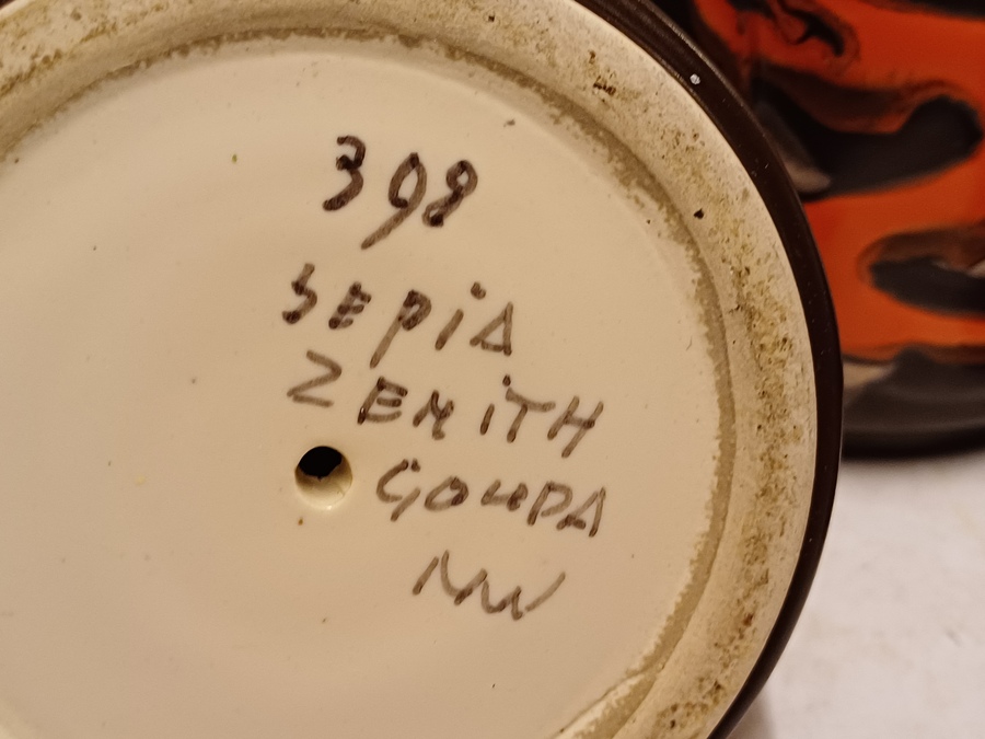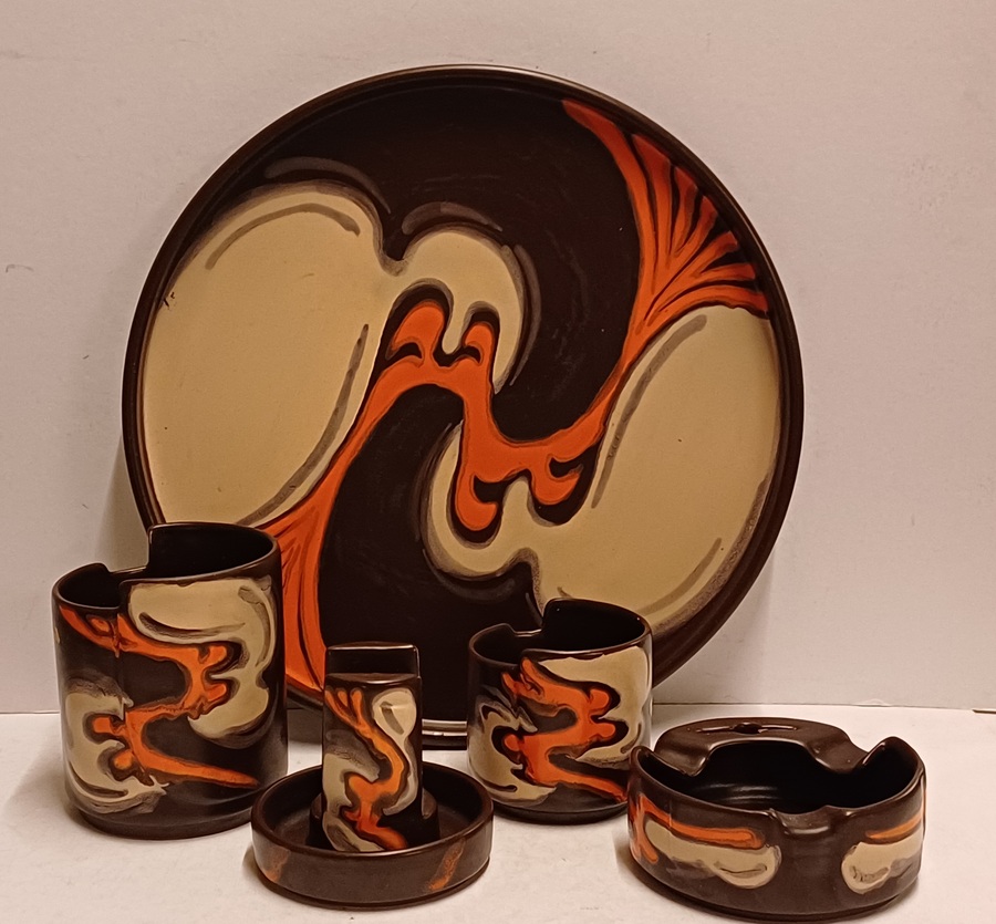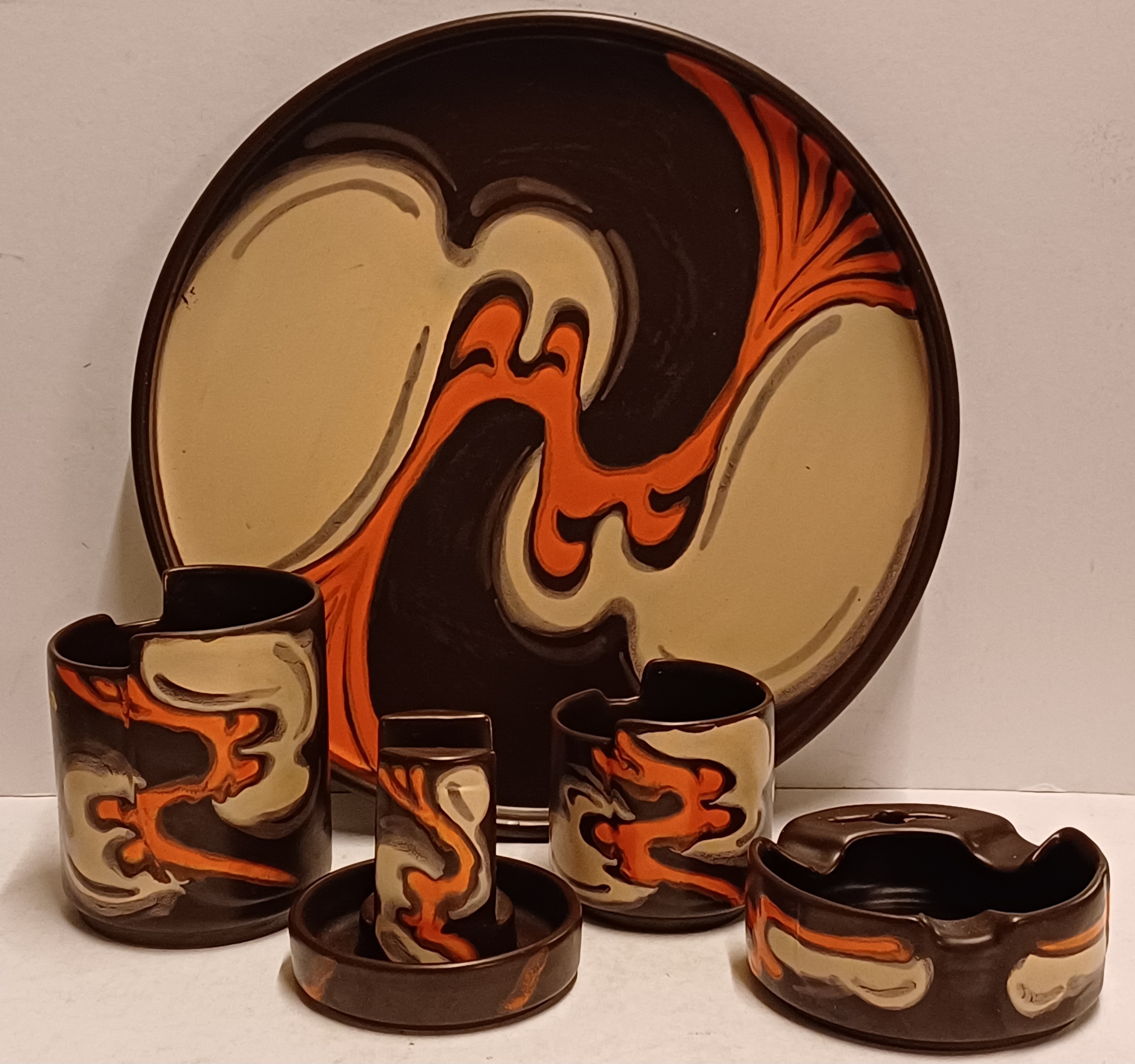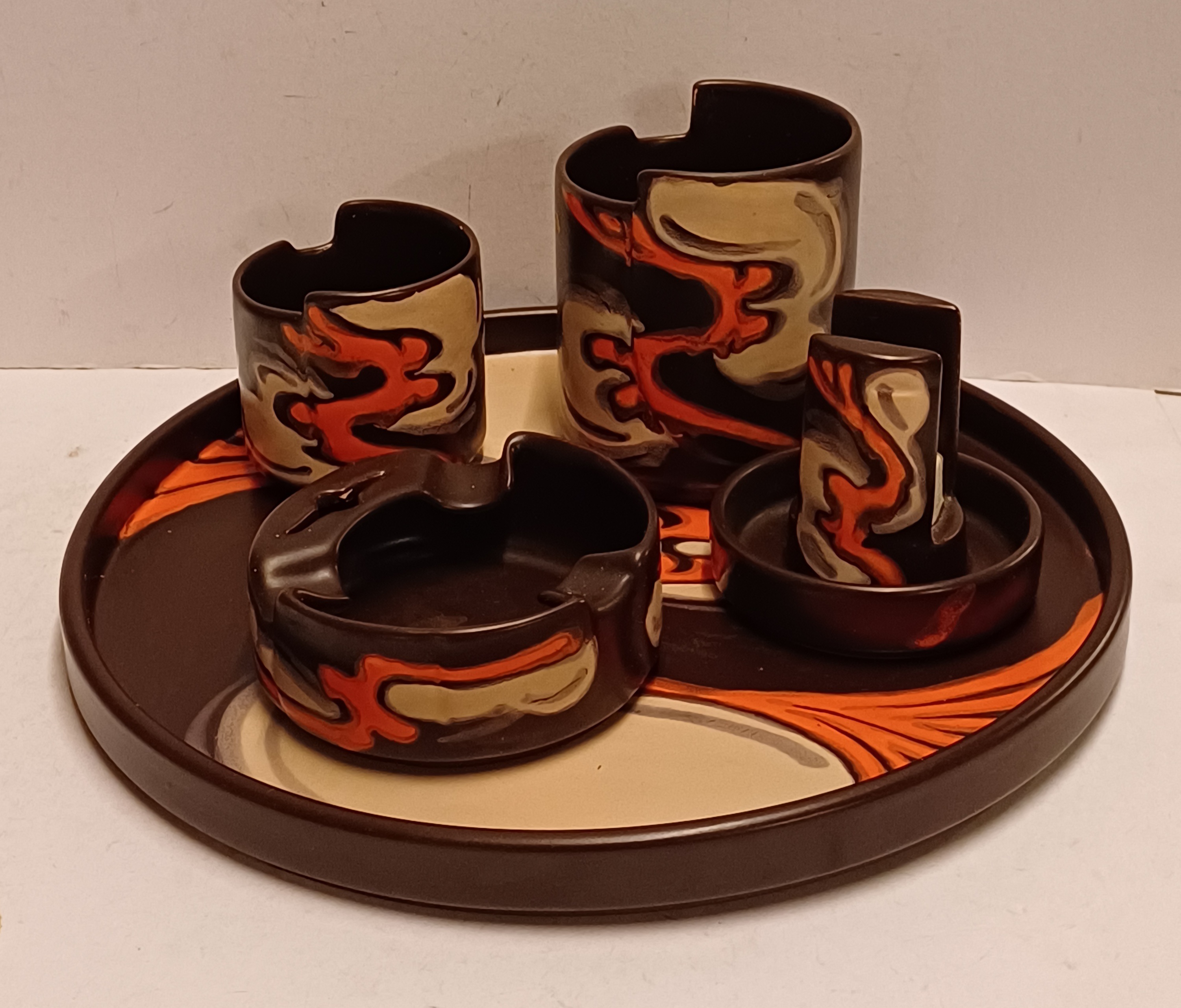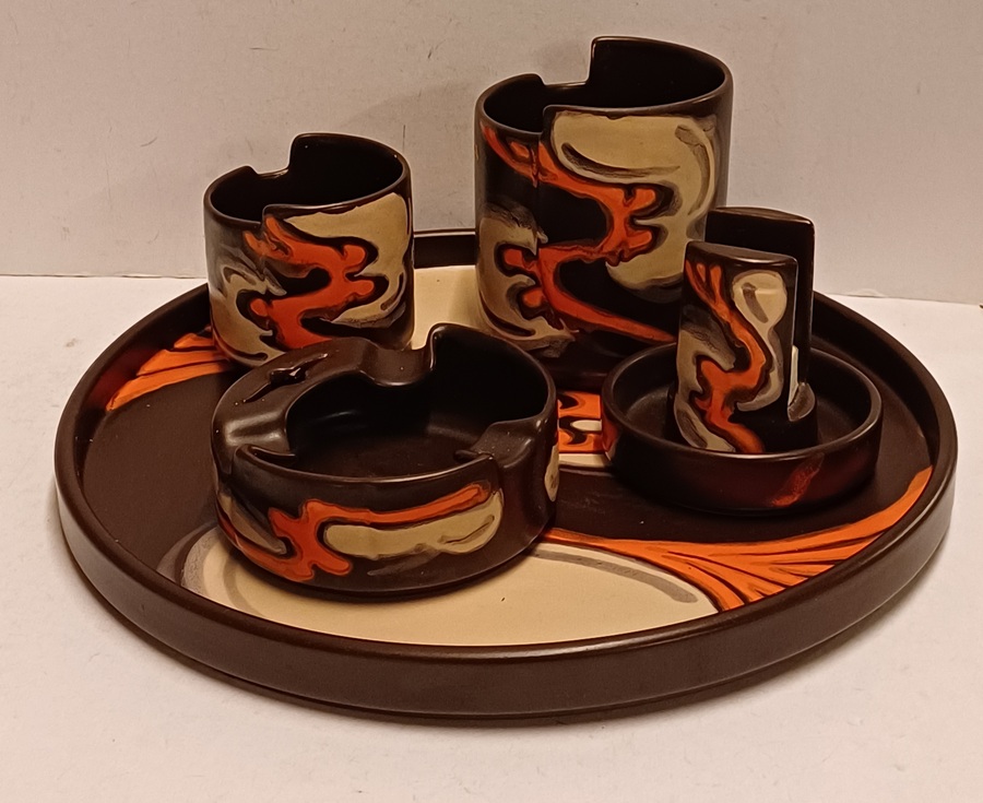 Aardewerken gegoten rookstel op dienblad, allen gedecoreerd met Sepia decoratie. Ontwerp Willem Stuurman oor Zenith. Onderzijdes gemerkt.