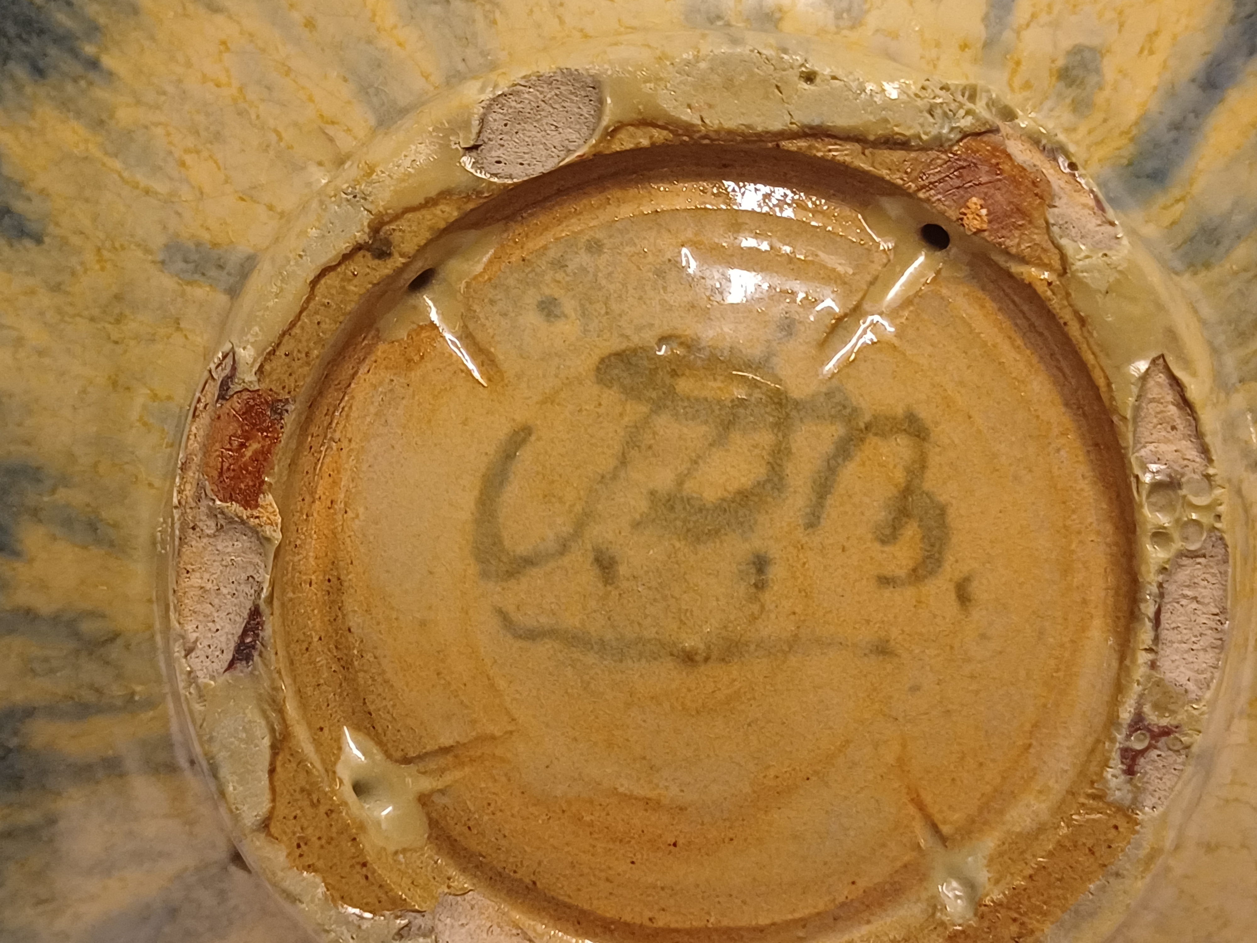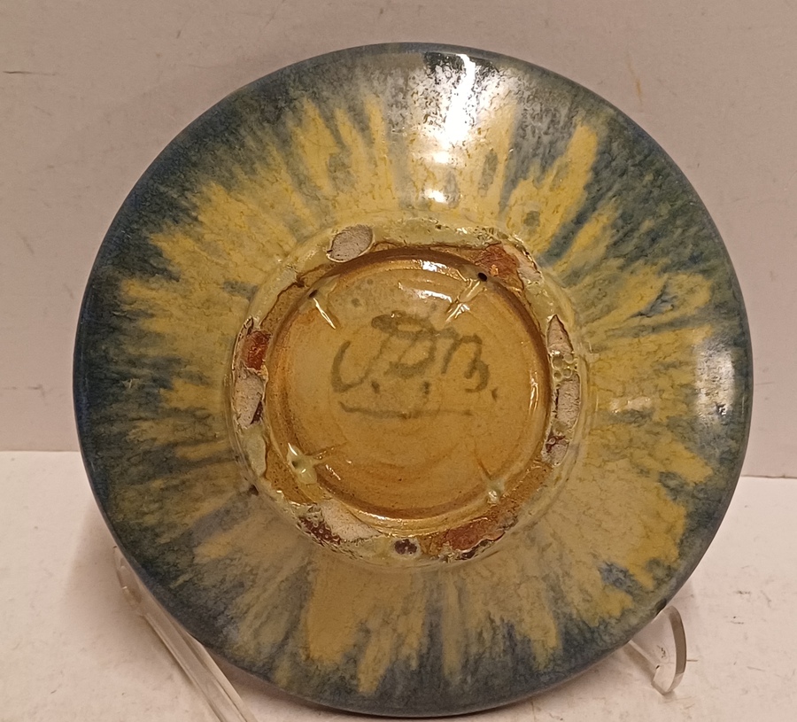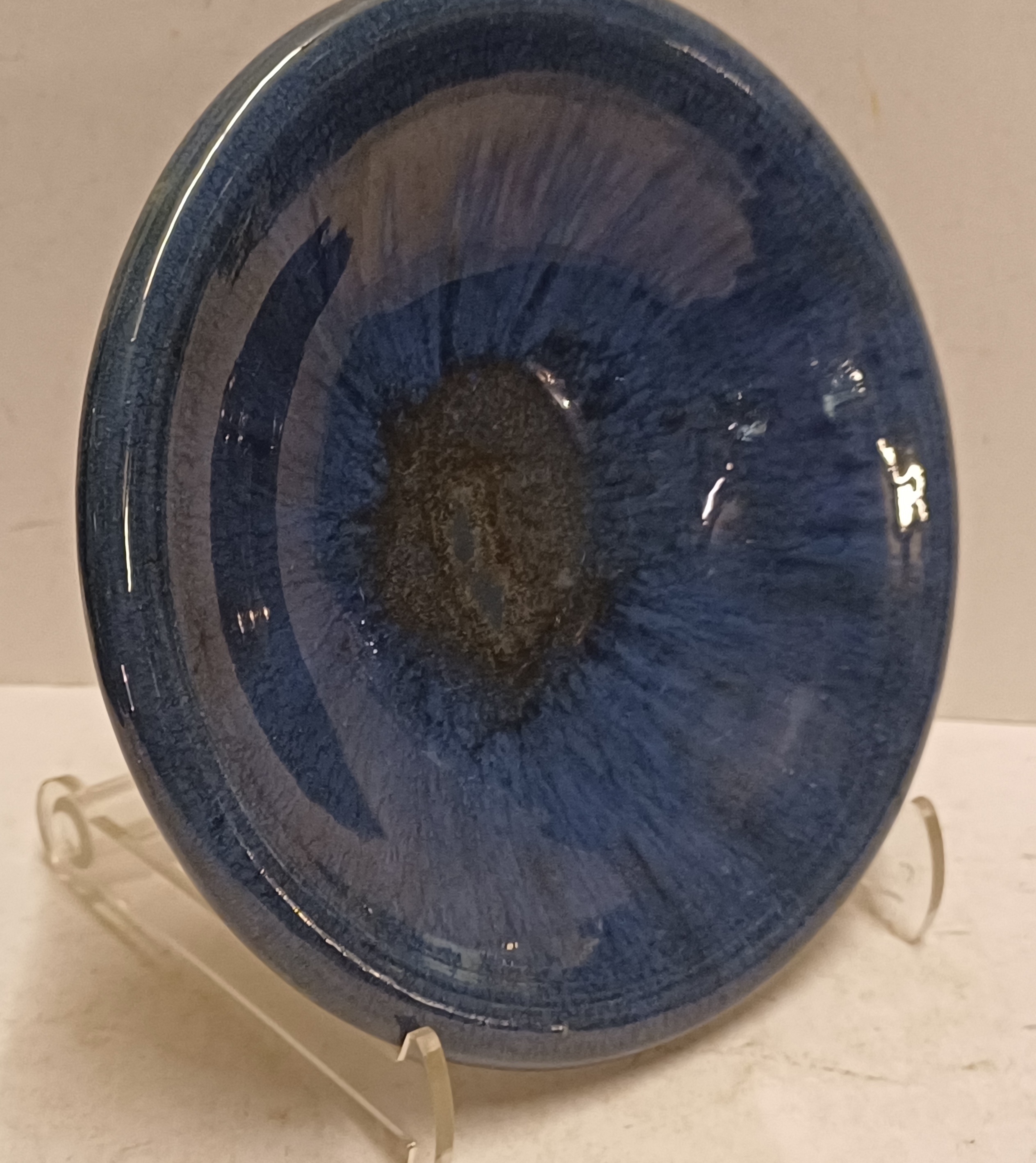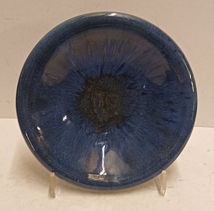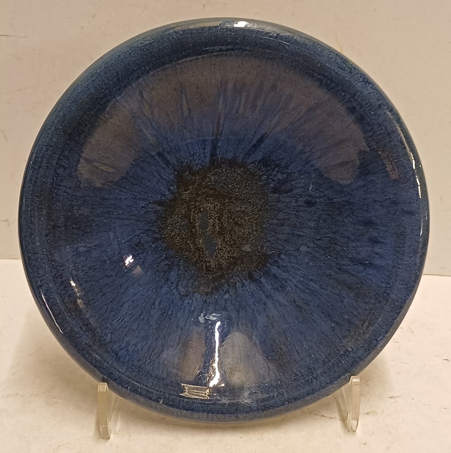 Aardewerken schaaltje met blauwe stroom glazuur. Achterzijde met kunstenaars signatuur. Uitvoering eigen studio Apeldoorn ca 1920.