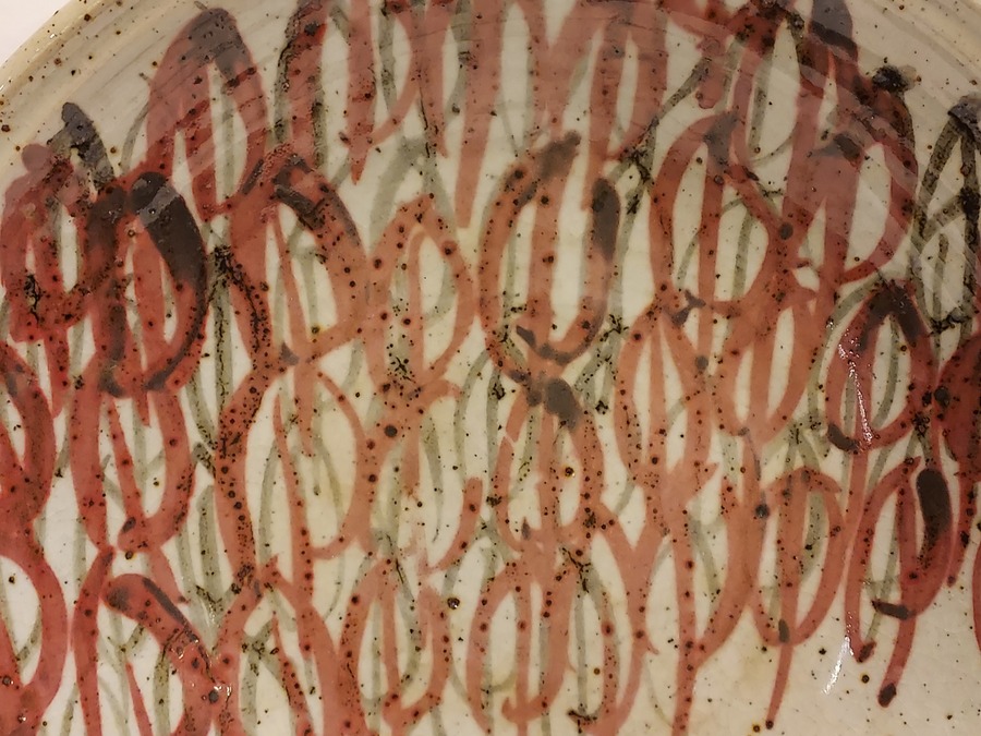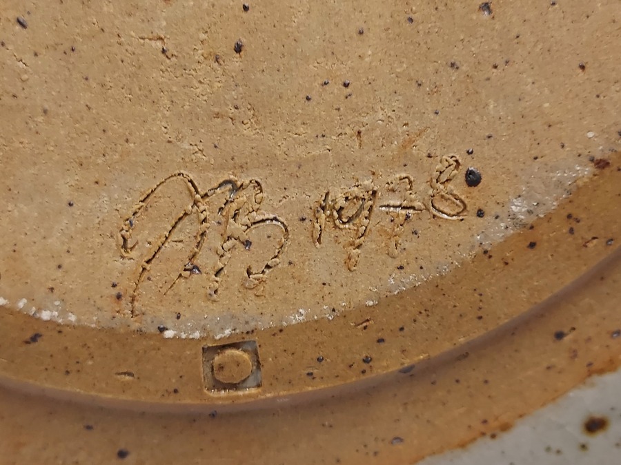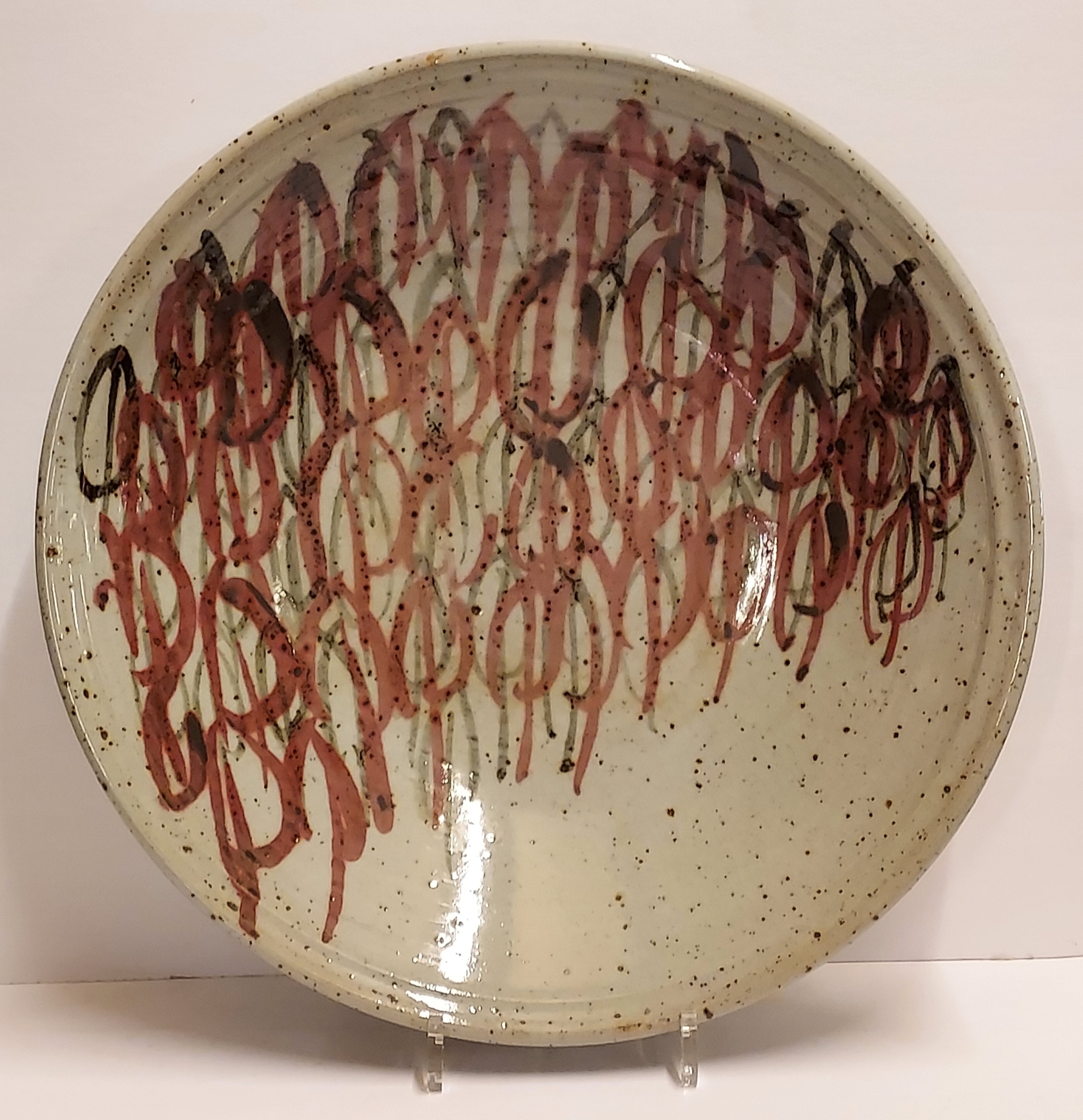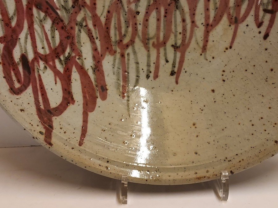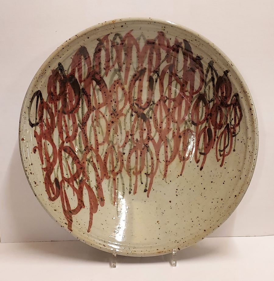 Grote schaal met grijze glazuur en rode decoratie. Achterzijde gemerkt en gedateerd 78.