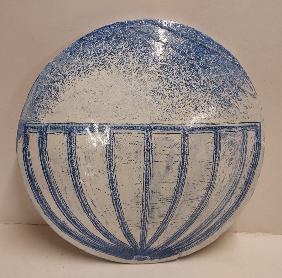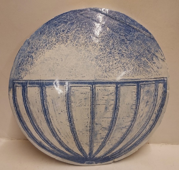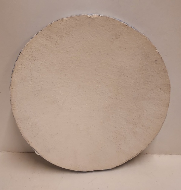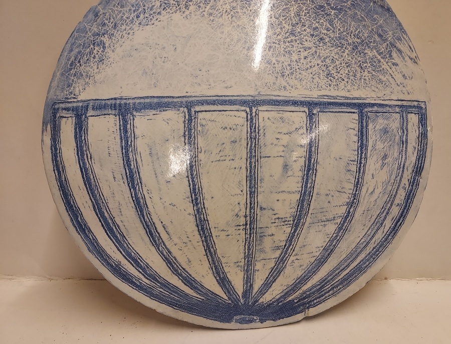 Keramische plaat met decoratie in blauw van een voederbak voor paarden. Niet gesigneerd. Provenance ex collectie Marjan & Gerard Unger Bussum.