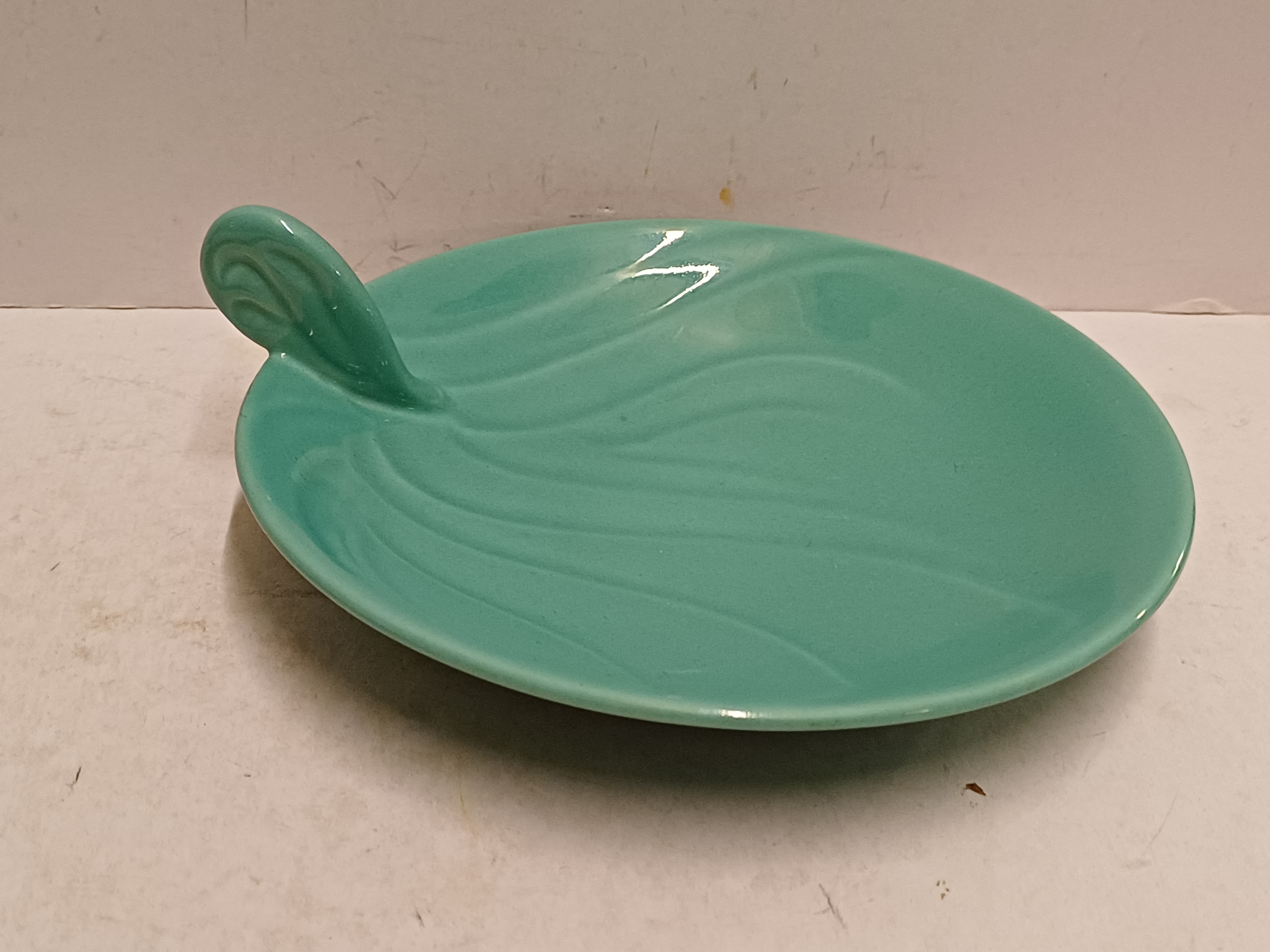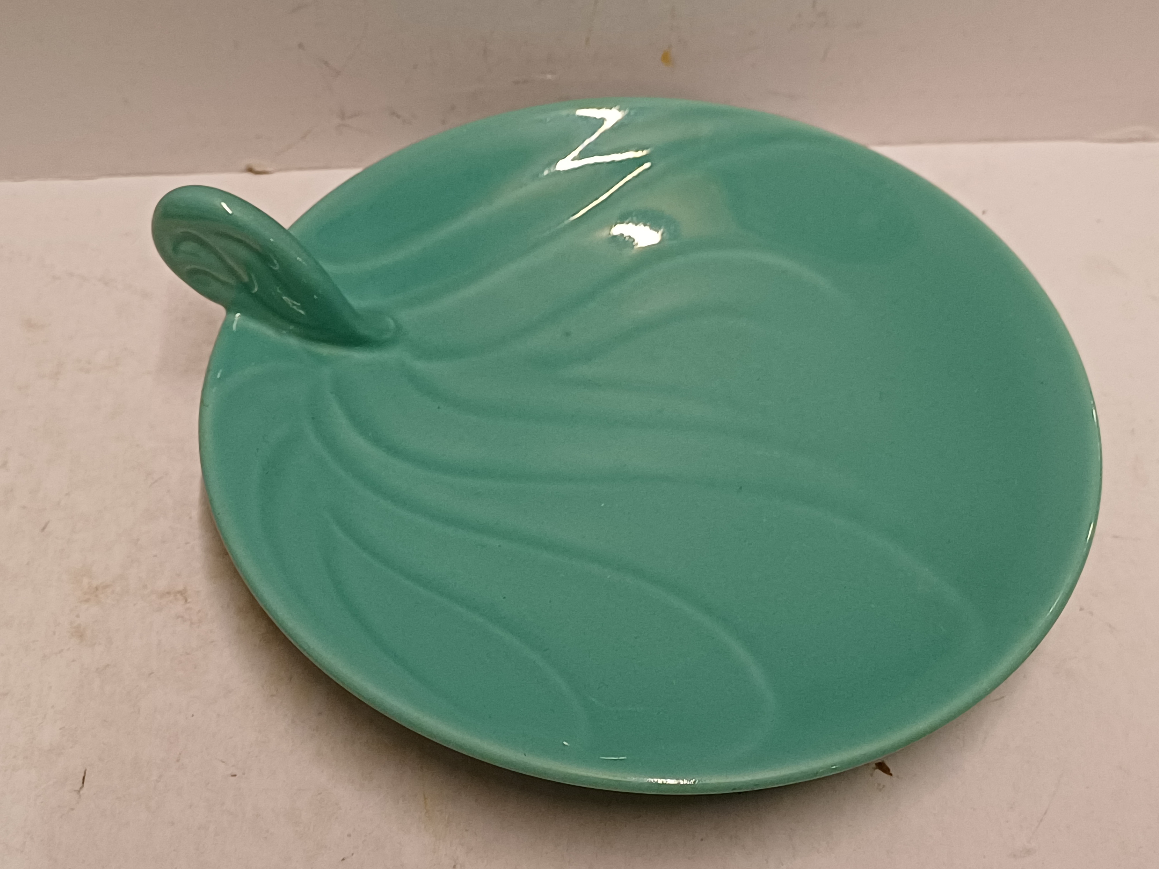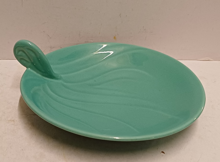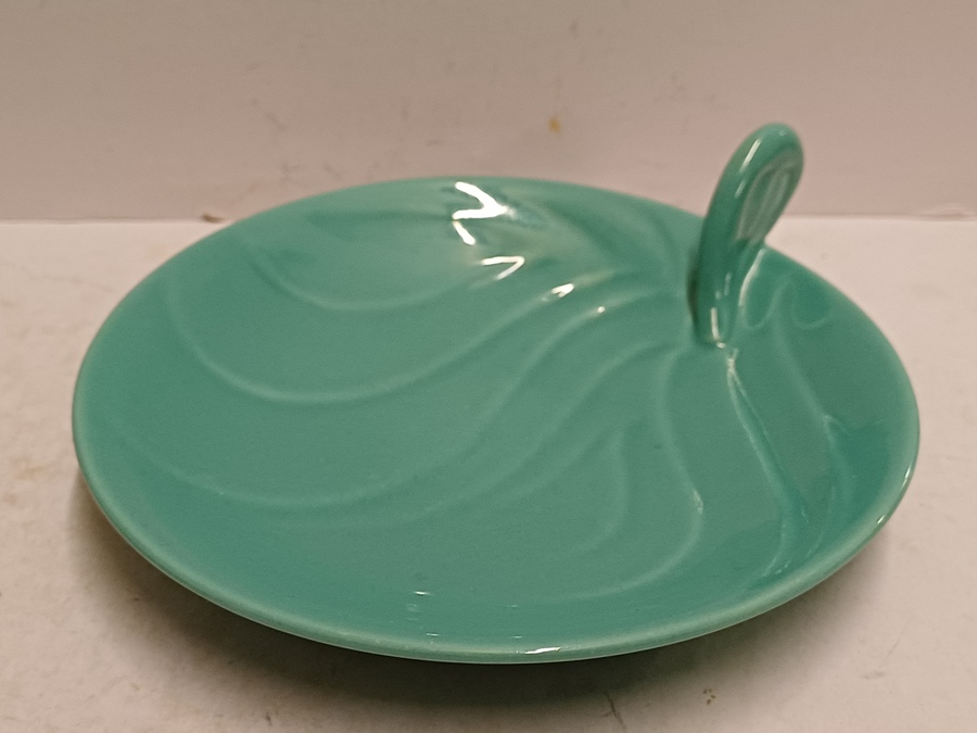 Gegoten aardewerken schaaltje met kleine greep en grillig lijndecor. Onderzijde gemerkt.