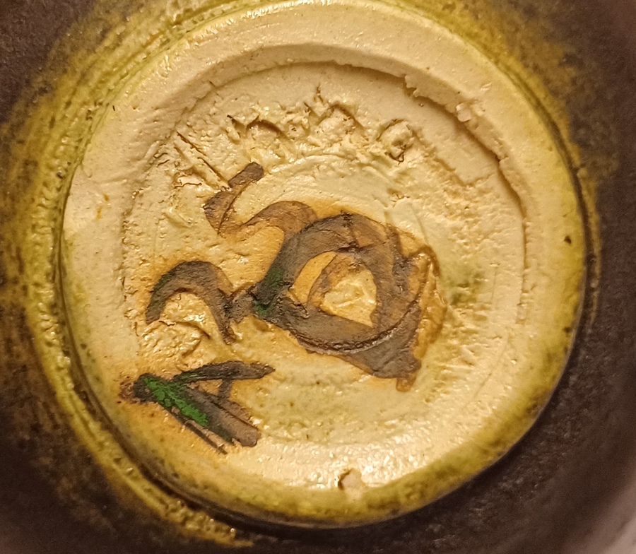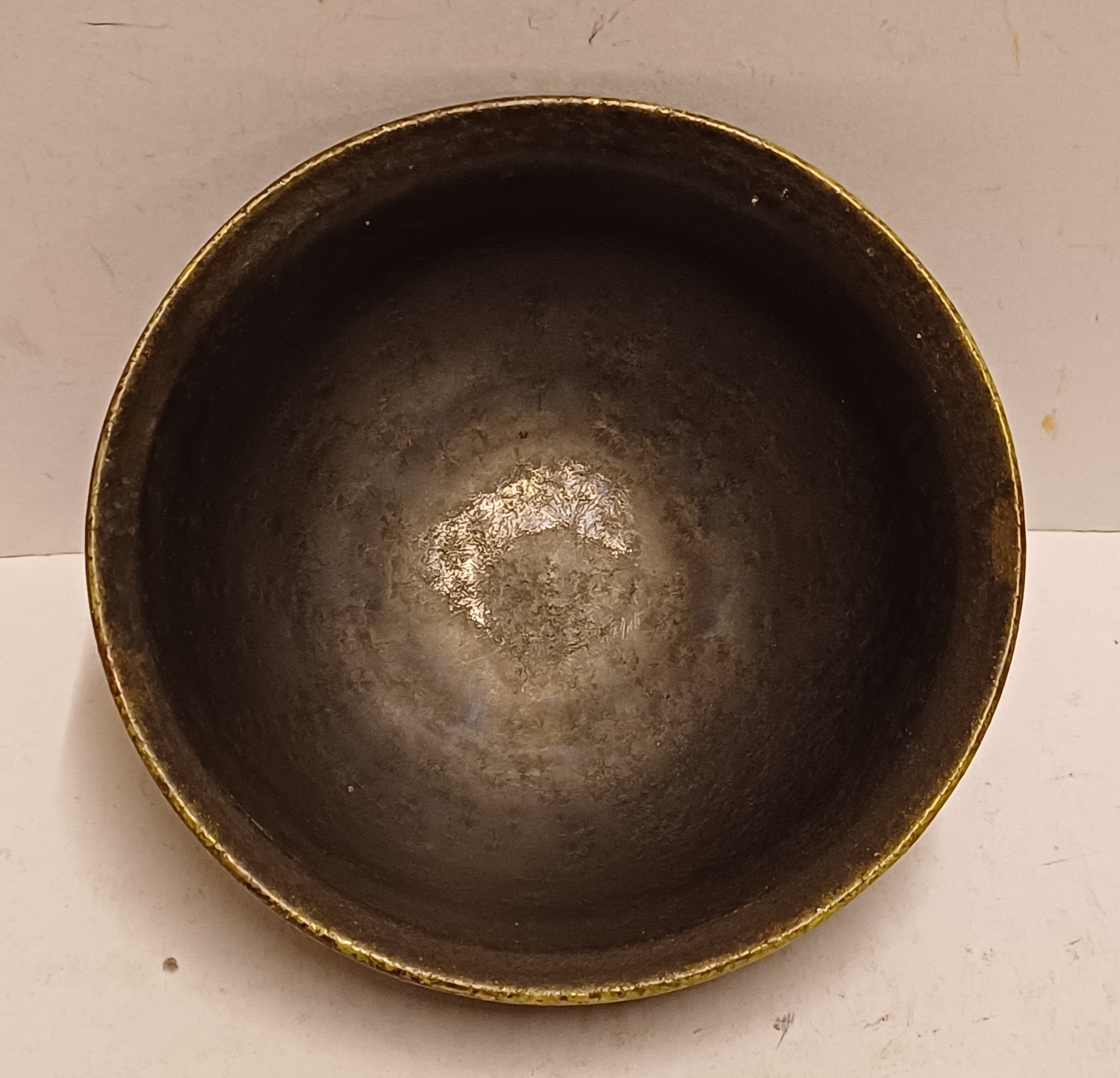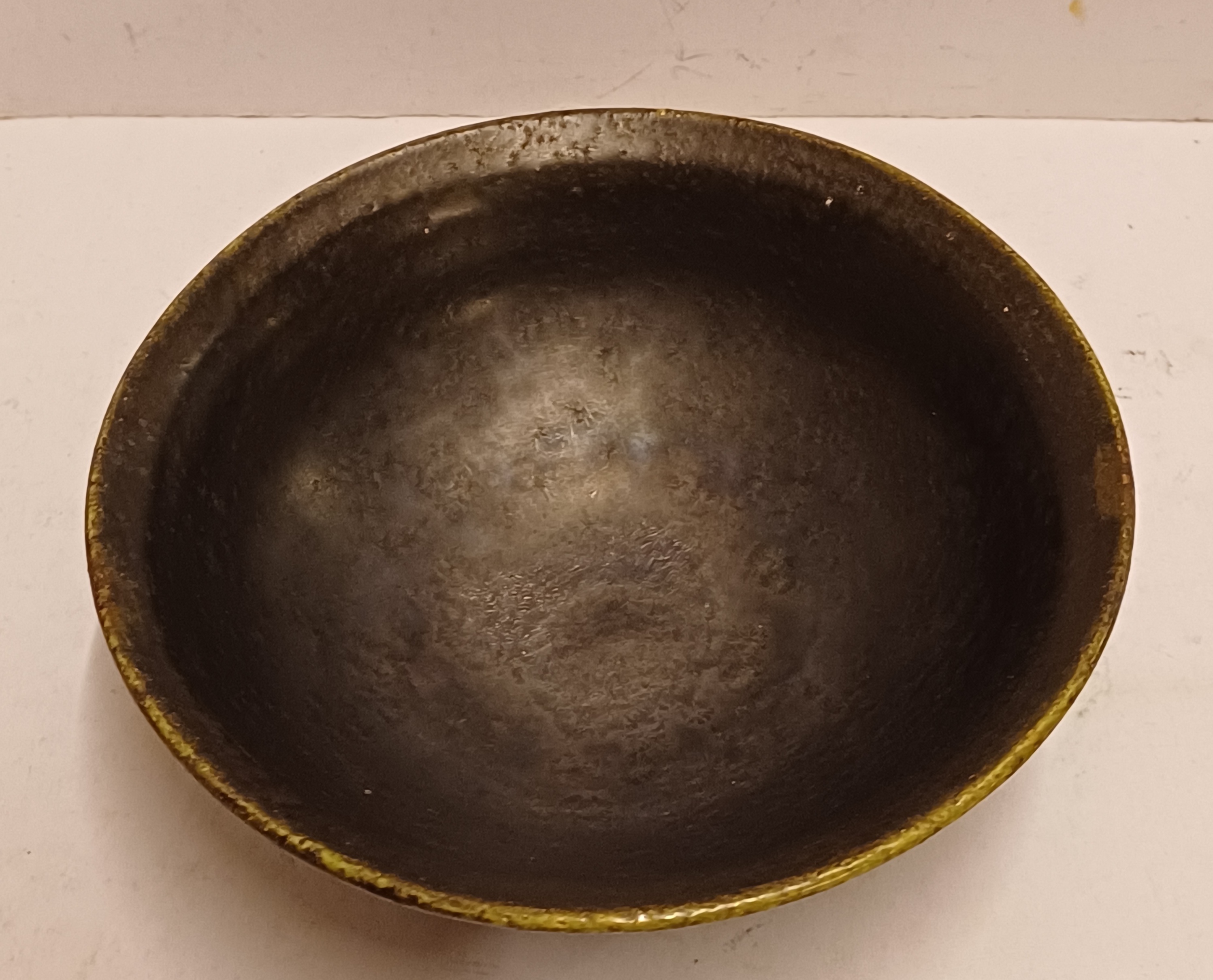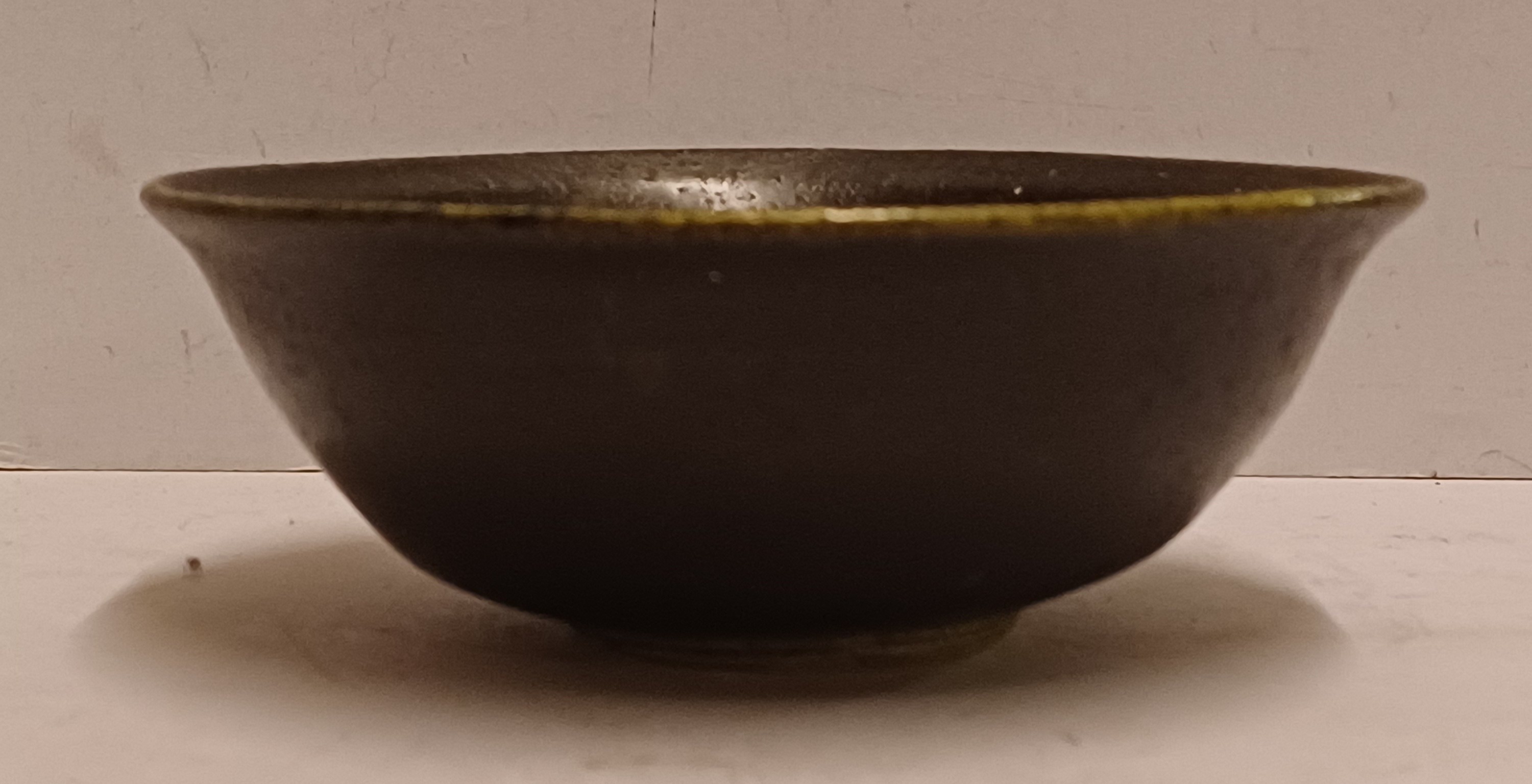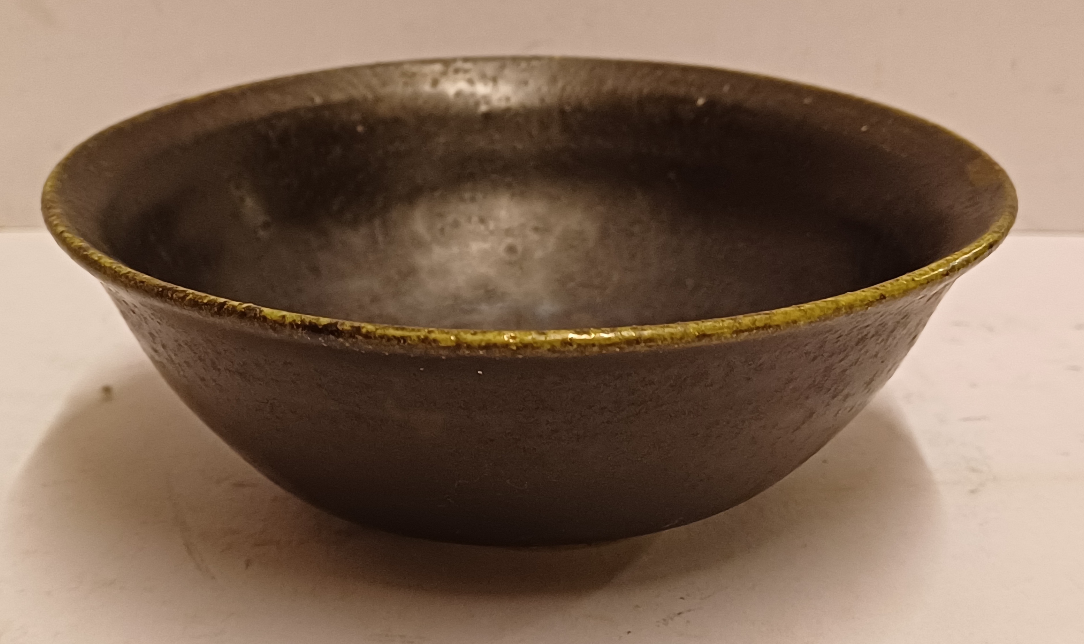 Hand gedraaid schaaltje met zeer donker groene glazuur. Onderzijde met ingekrast merk.
