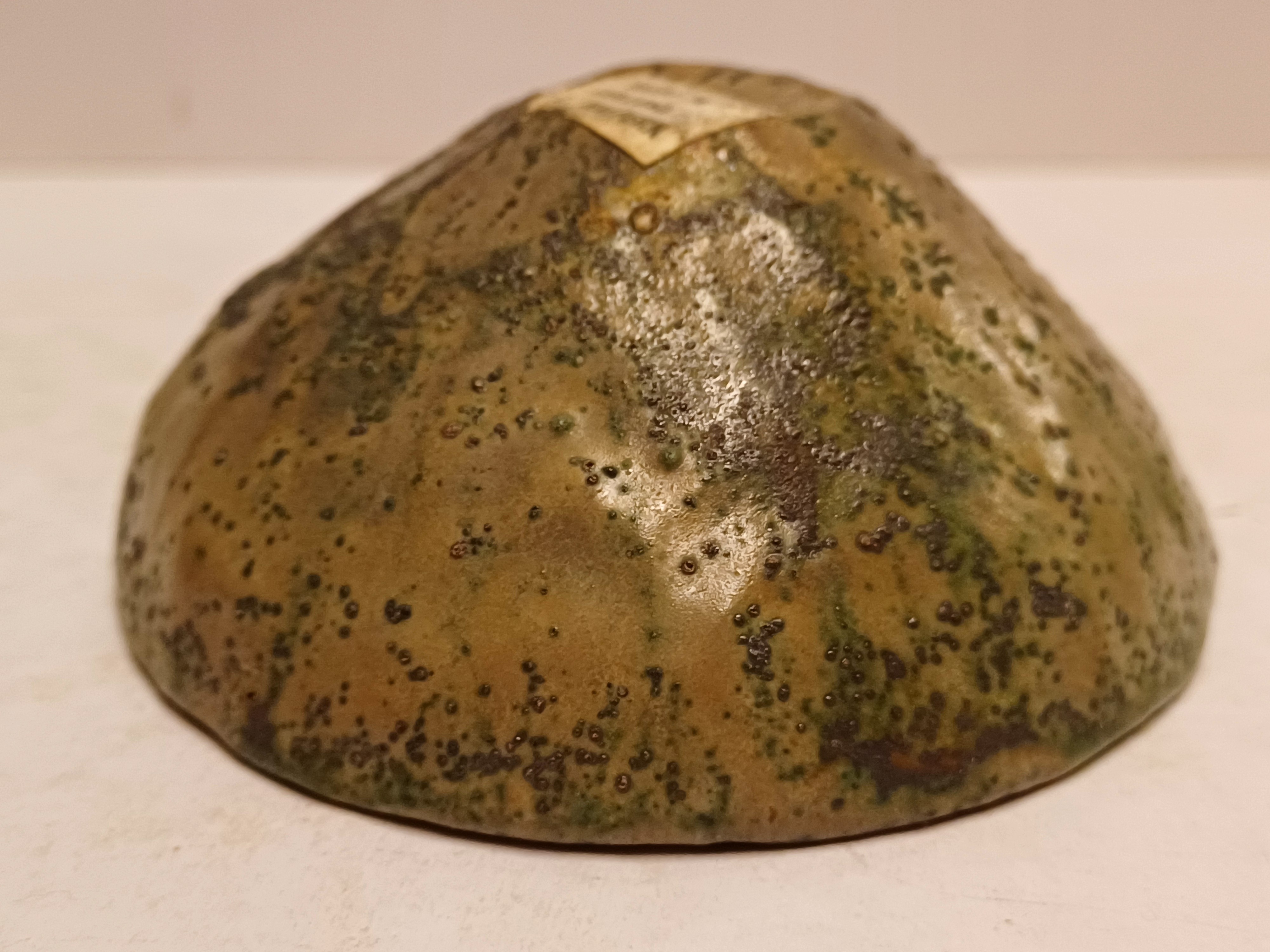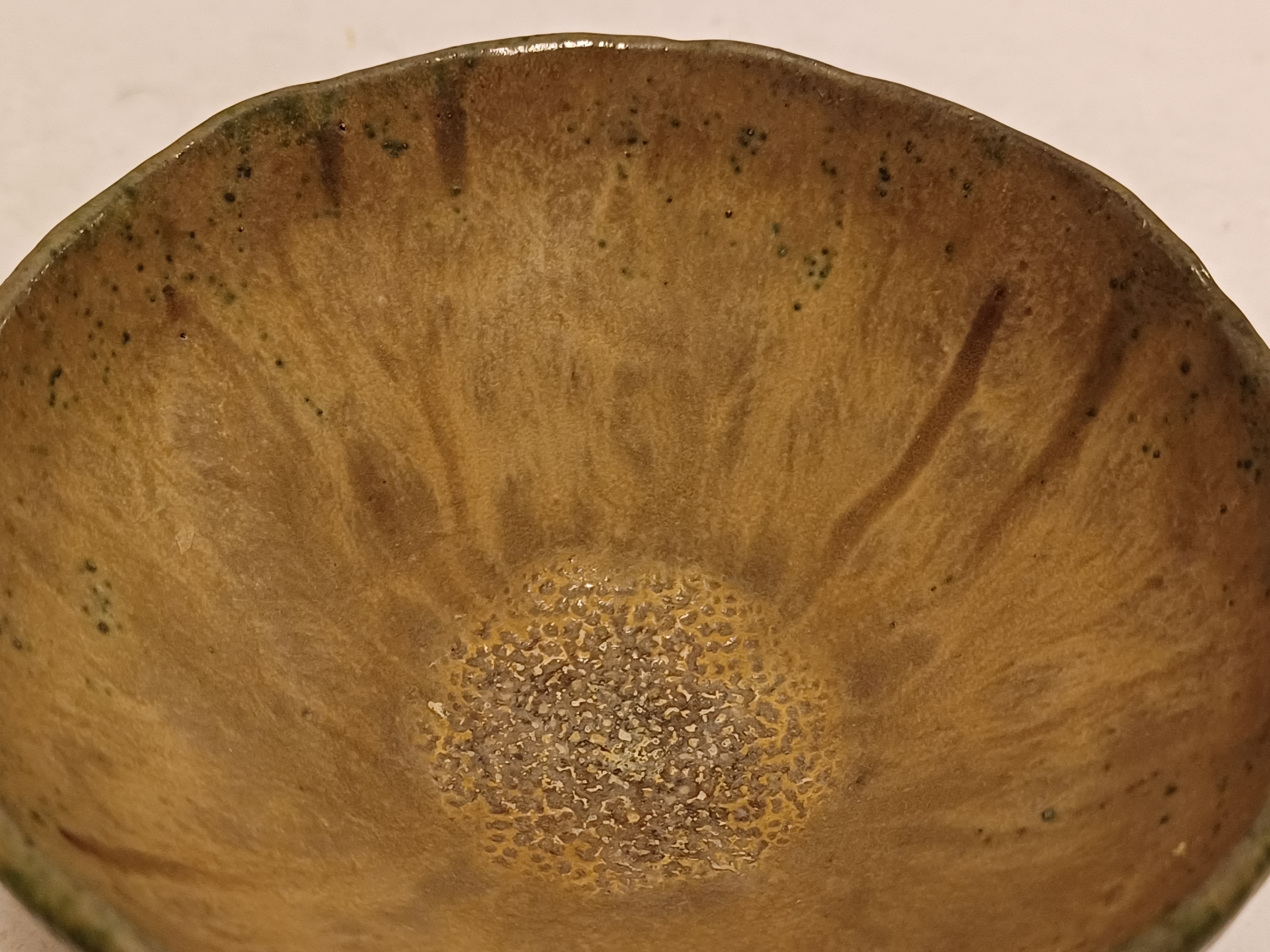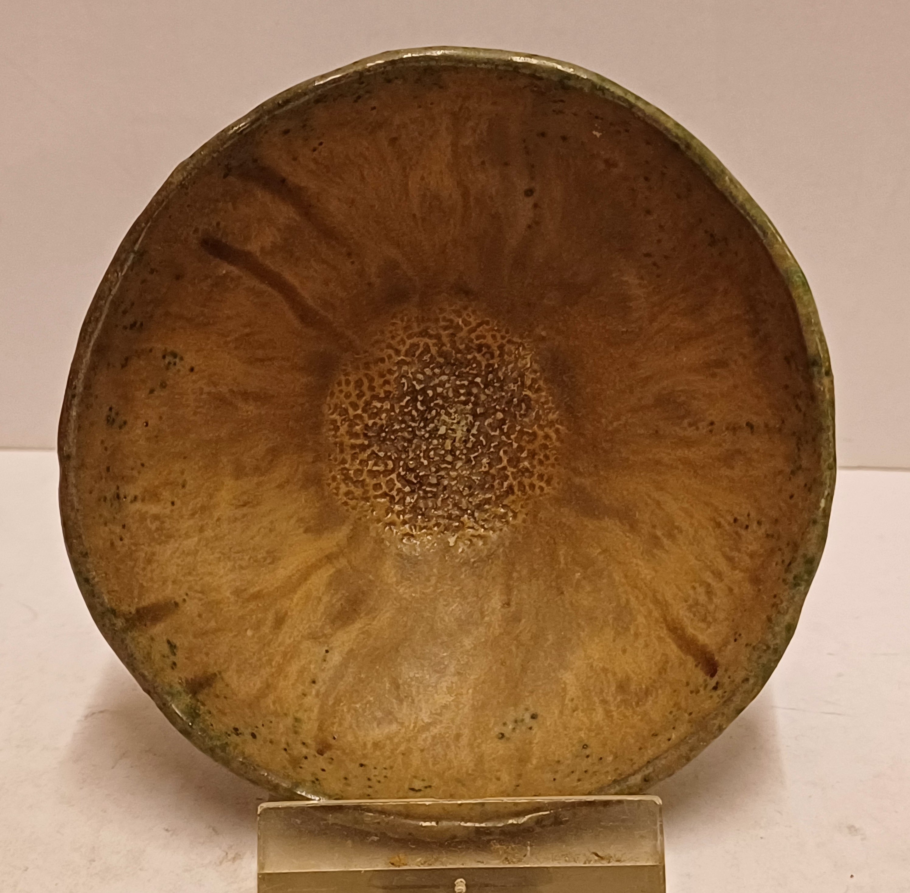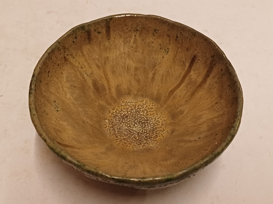Klein schaaltje met donker groene glazuur met kleine stipjes. Met aan de binnenzijde mat bruine glazuur en op de bodem met licht relief. Onderzijde met label en signatuur.