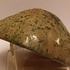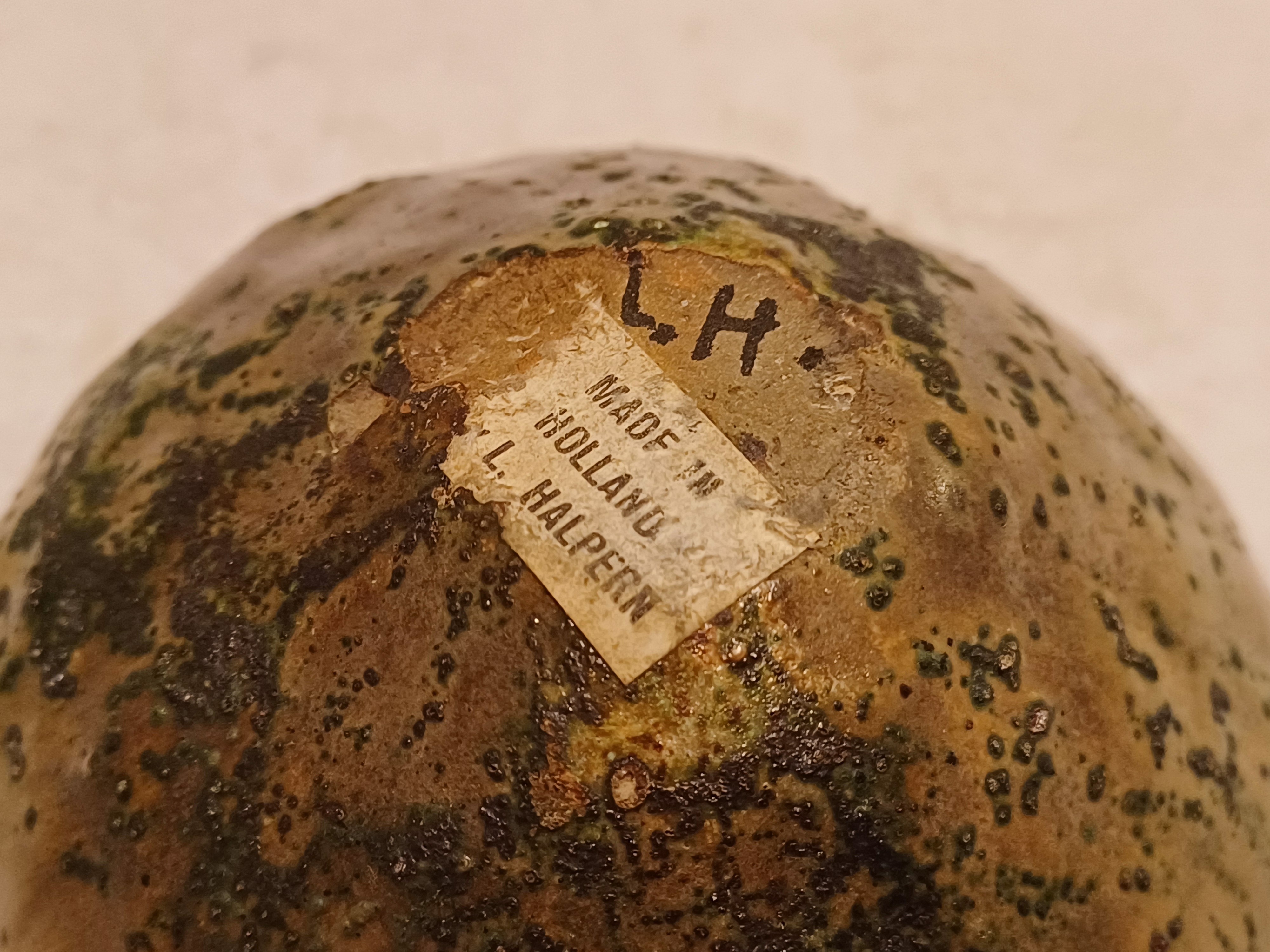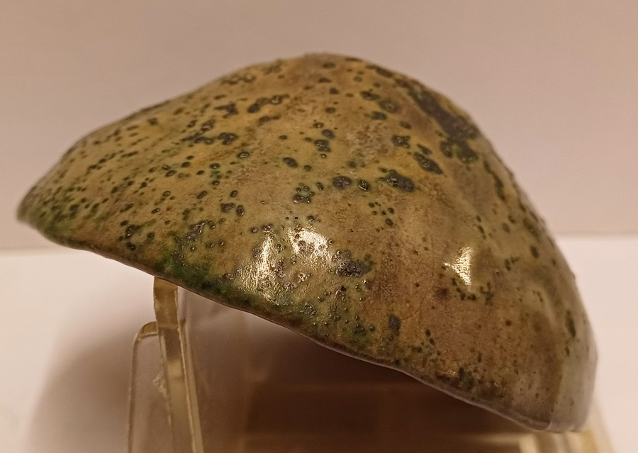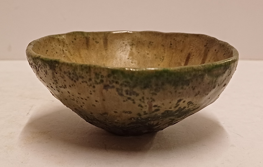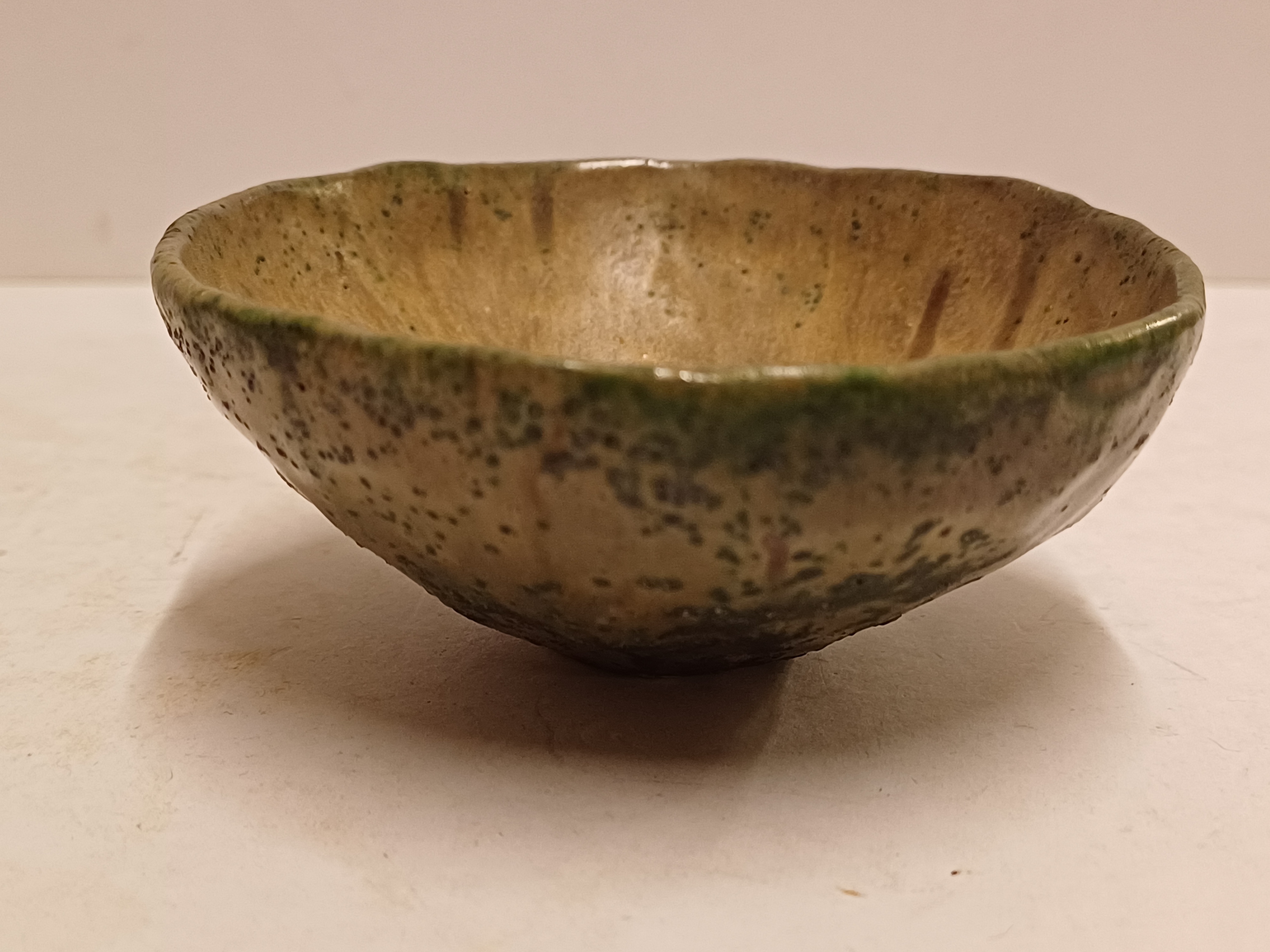 Klein schaaltje met donker groene glazuur met kleine stipjes. Met aan de binnenzijde mat bruine glazuur en op de bodem met licht relief. Onderzijde met label en signatuur.