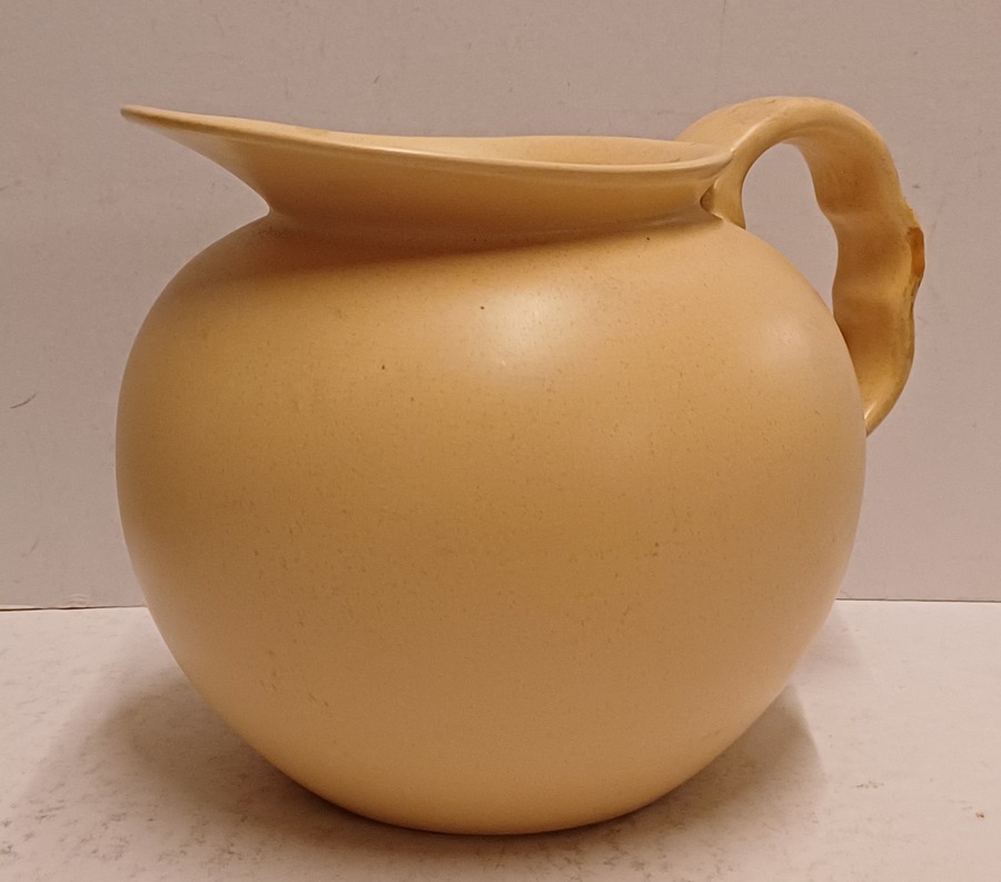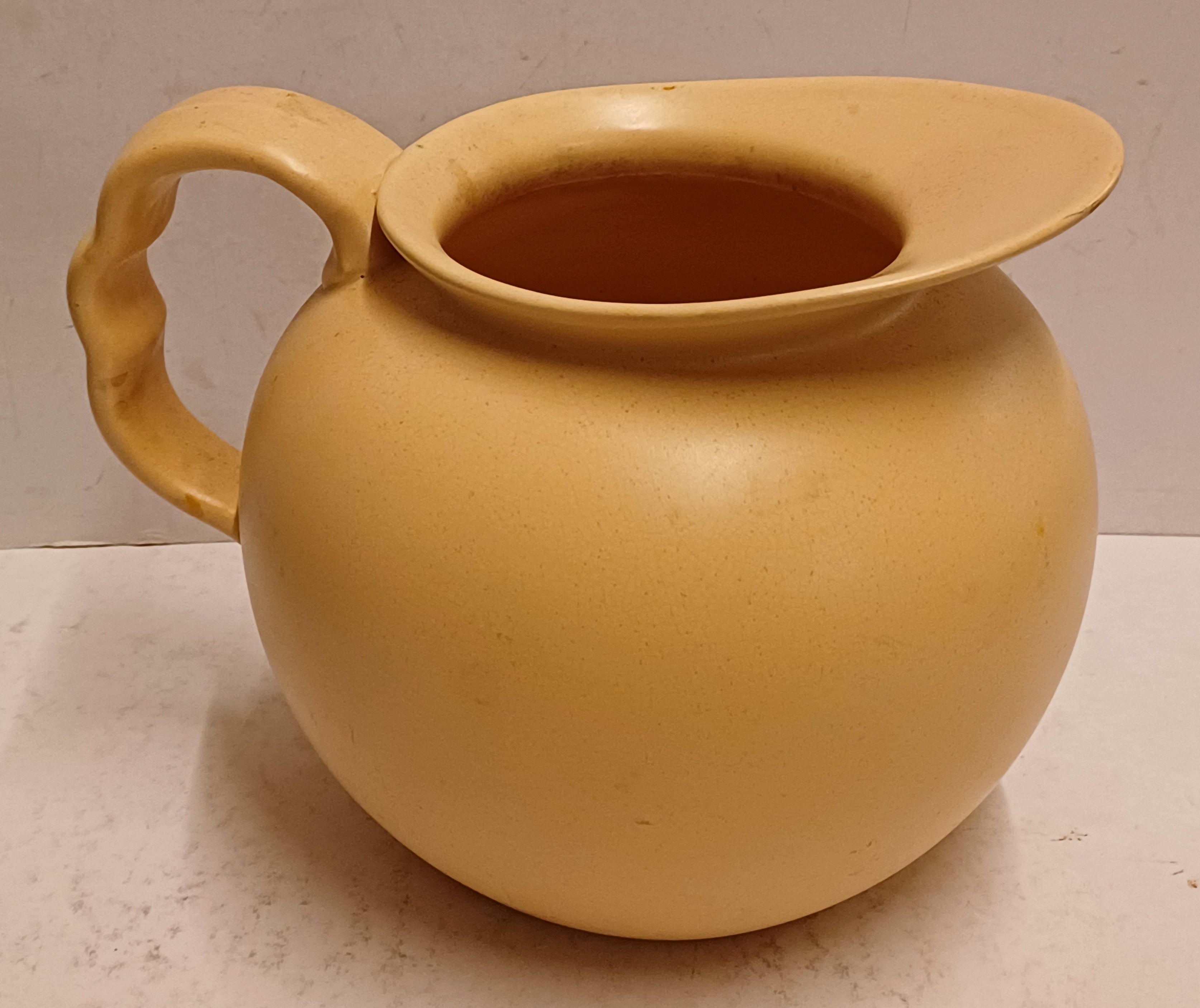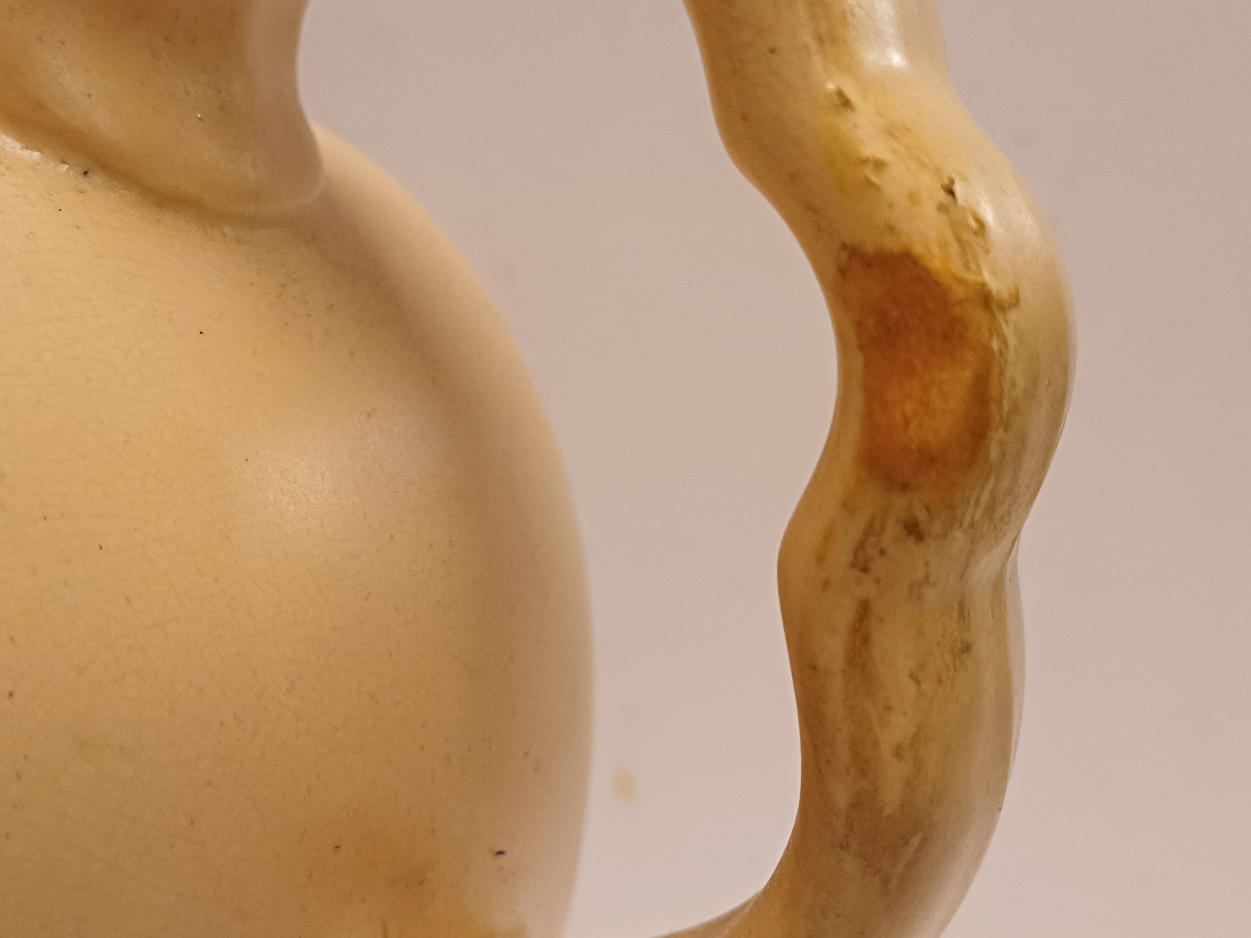 Aardewerken schenkkan met creme glazuur. Onderzijde onduidelijk gestempeld.