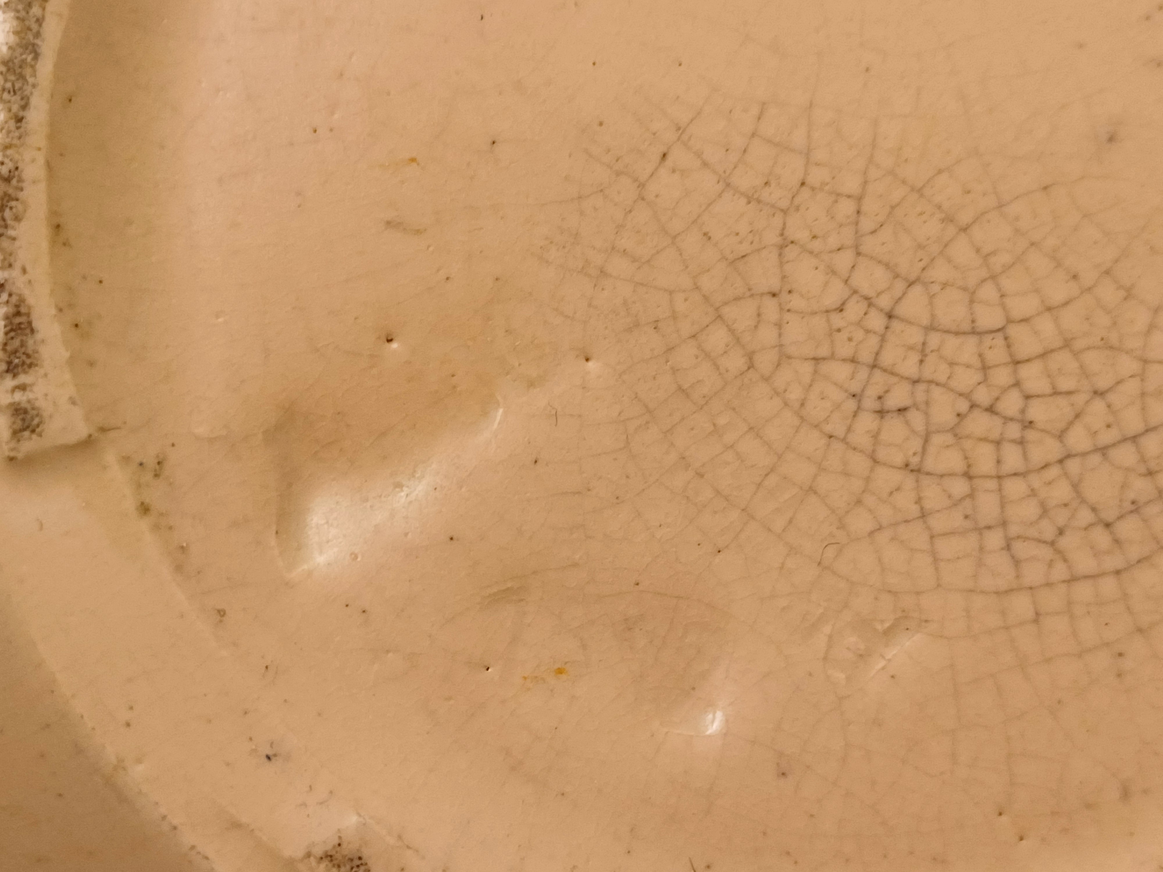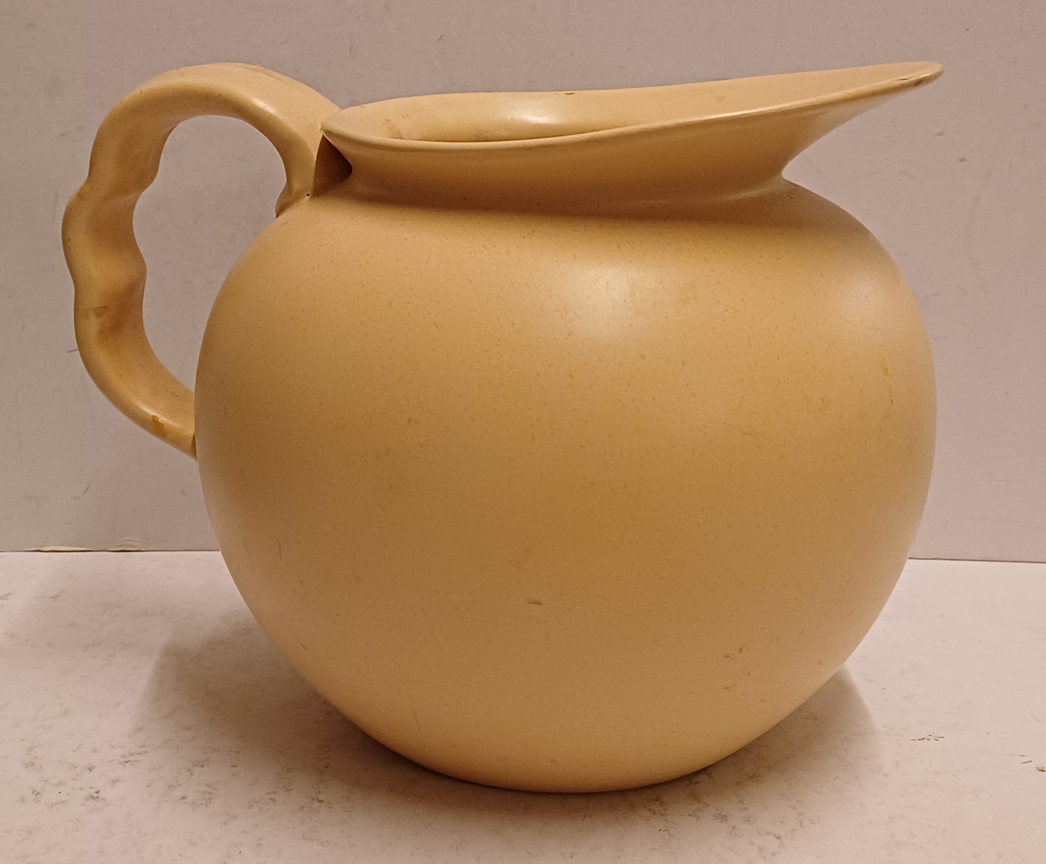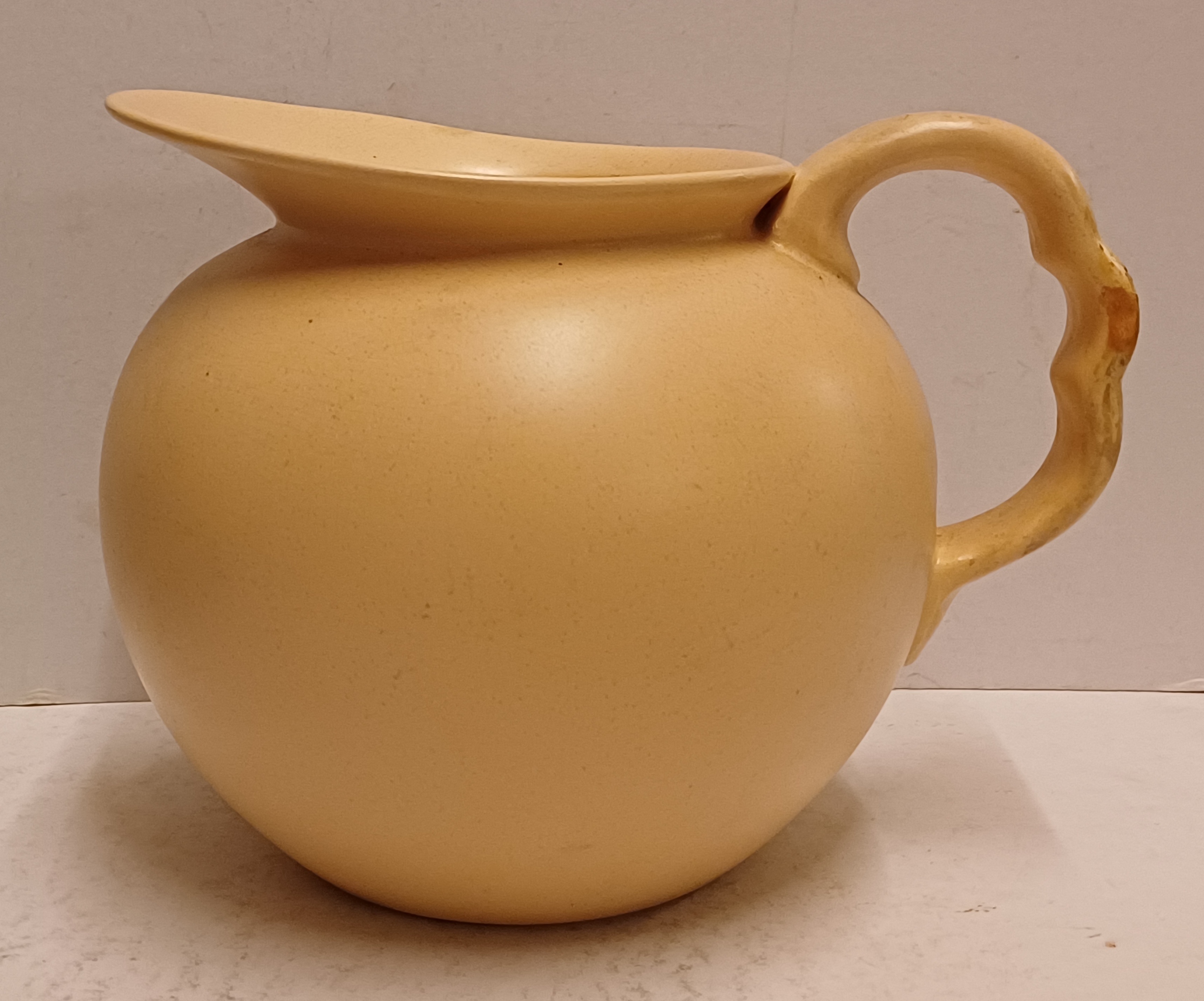 Aardewerken schenkkan met creme glazuur. Onderzijde onduidelijk gestempeld.
