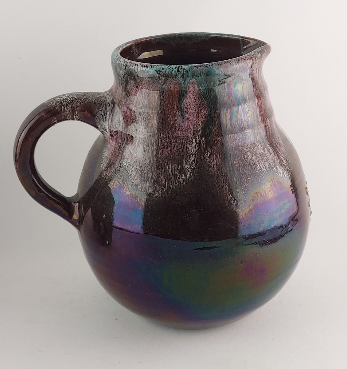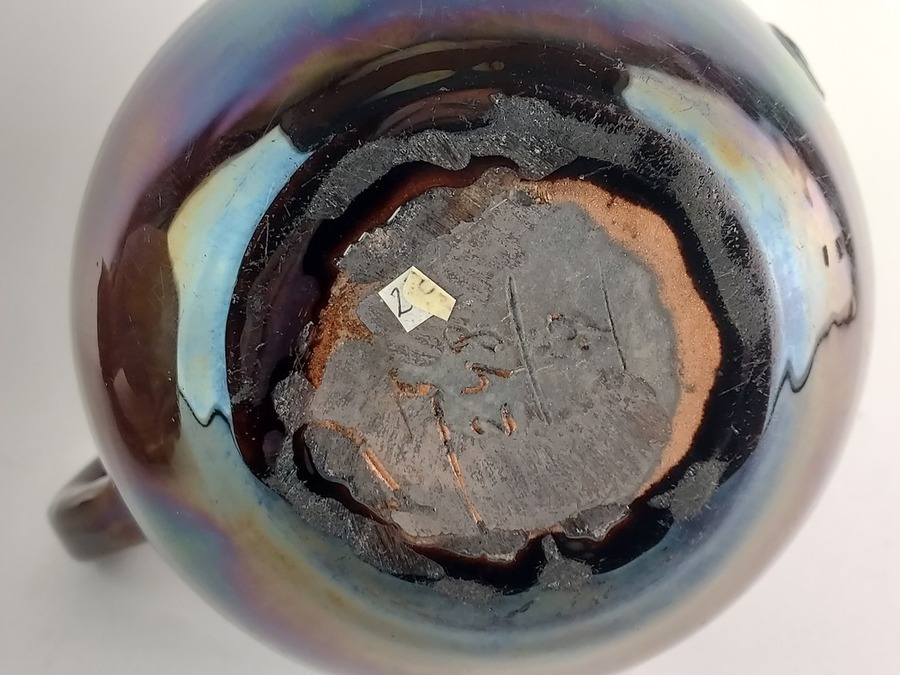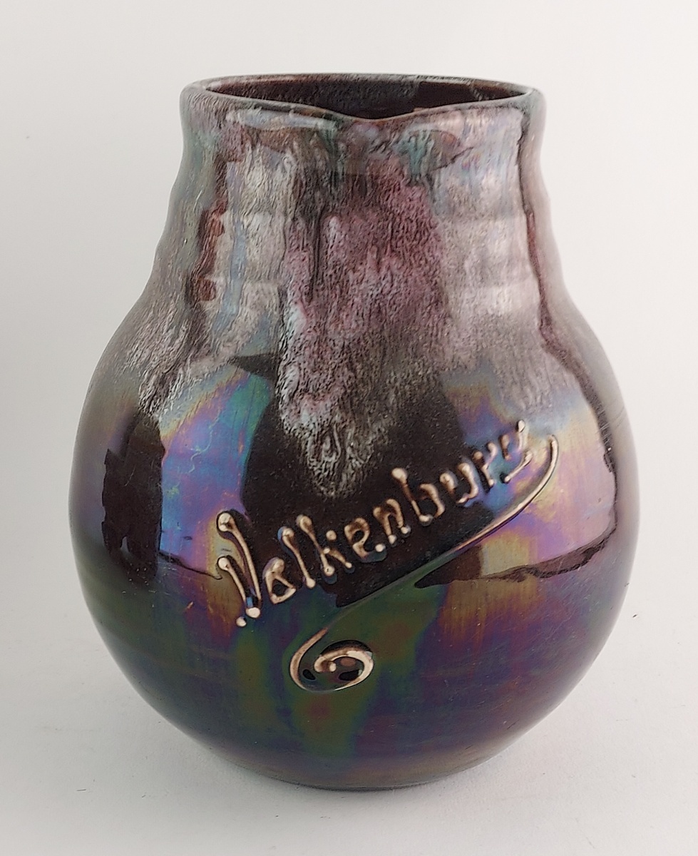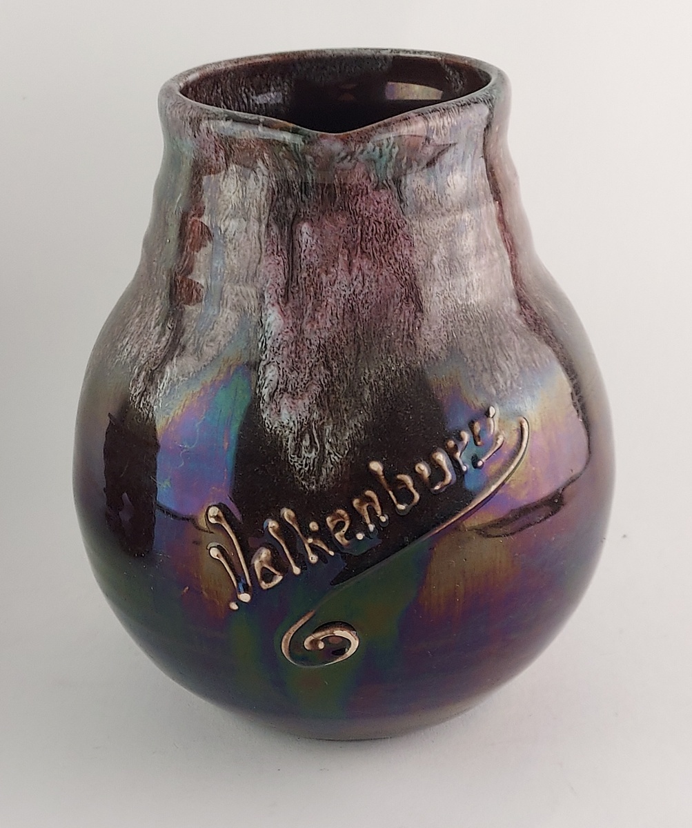 Groot formaat souvenir schenkkan met metallic glazuur, en de tekst Valkenburg op de buik. Gemerkt met fabrieksmerk en modelnummer.