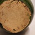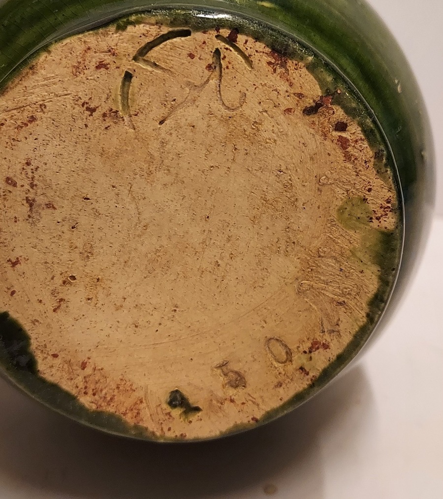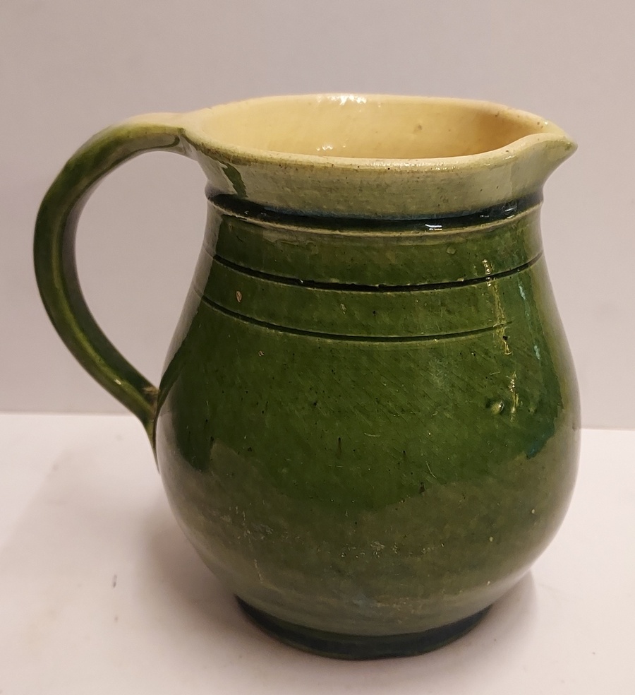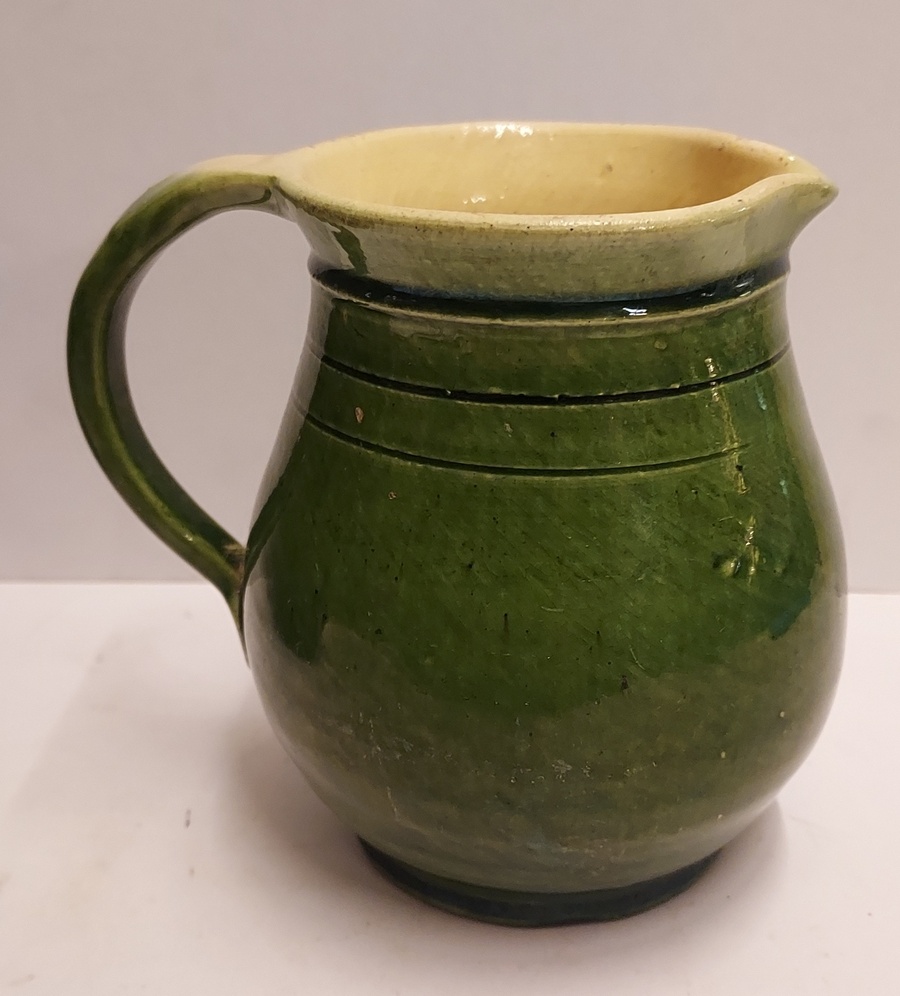 Boerengroen geglazuurde schenkkan, met licht gele binnenzijde. Onderzijde met fabrieksmerk en modelnummer 150.