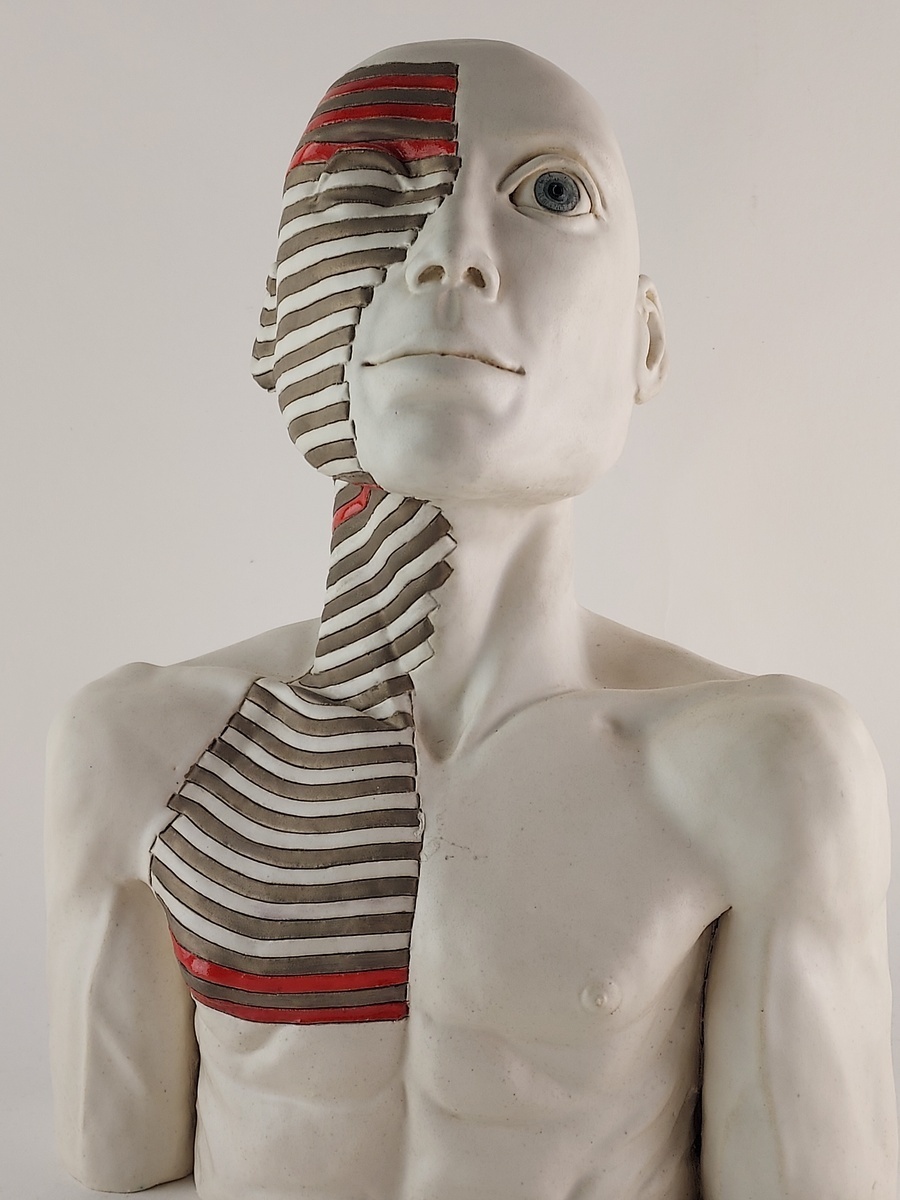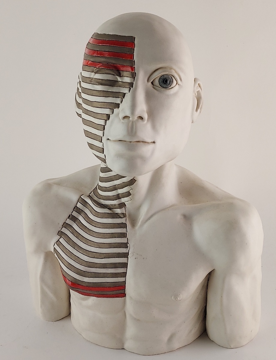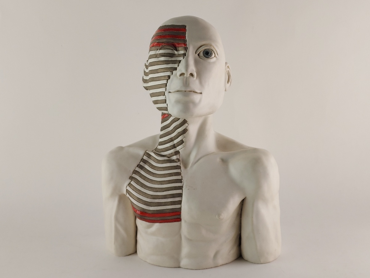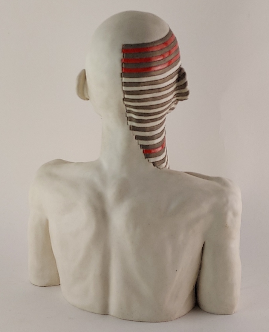Keramische sculptuur van een buste met rood wit lijnenspel. Onderzijde gesigneerd en verzamelaars etiket. Ex Collectie J.W.N. van Agterbergh.